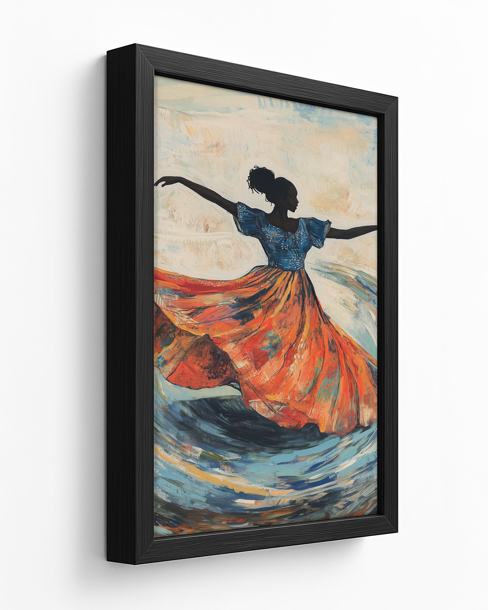 Celebrate the elegance of African dance with this artwork of a dancer mid-spin. Flowing fabric trails blend seamlessly into tribal patterns, set against a muted, earthy background to emphasise the grace of movement.