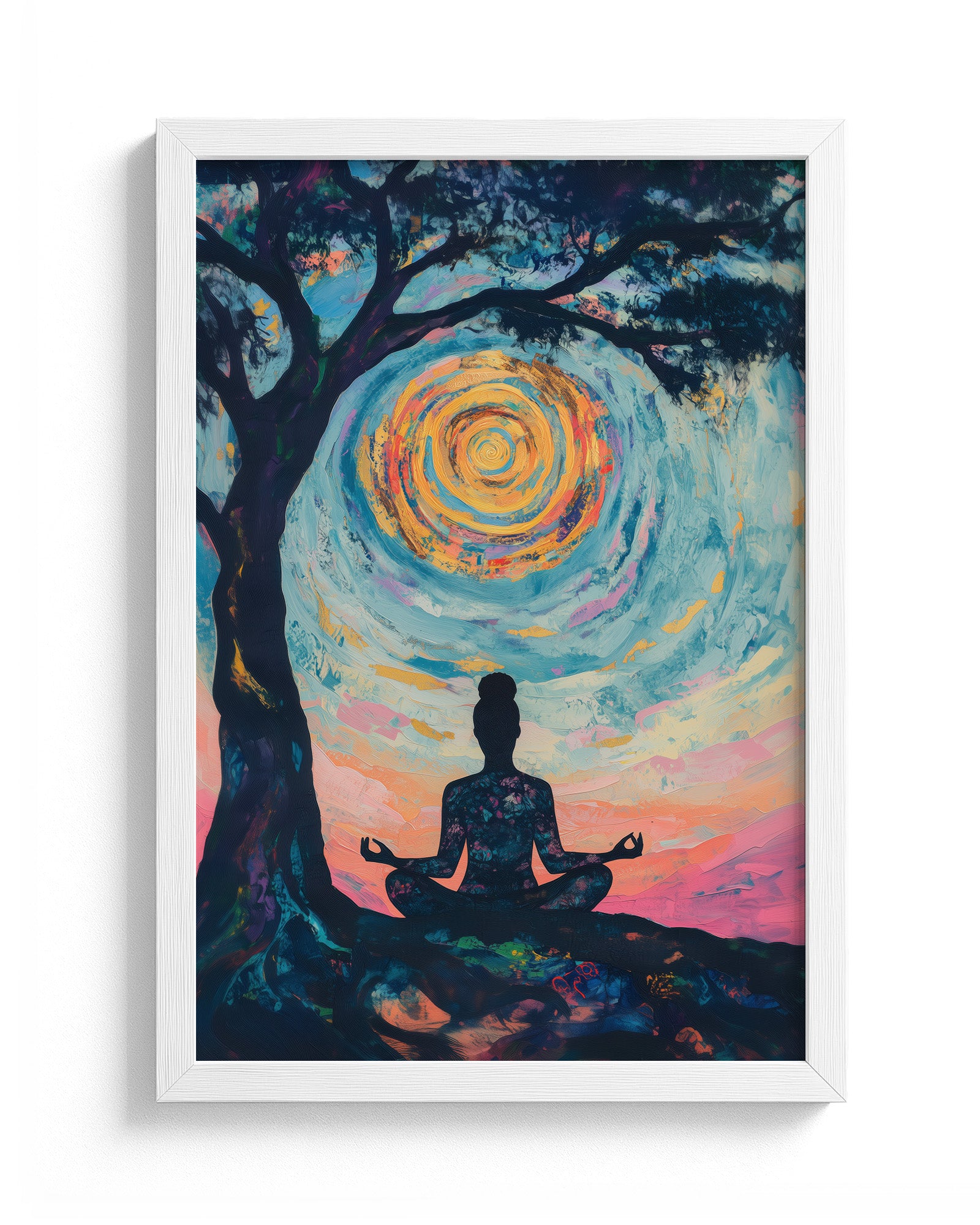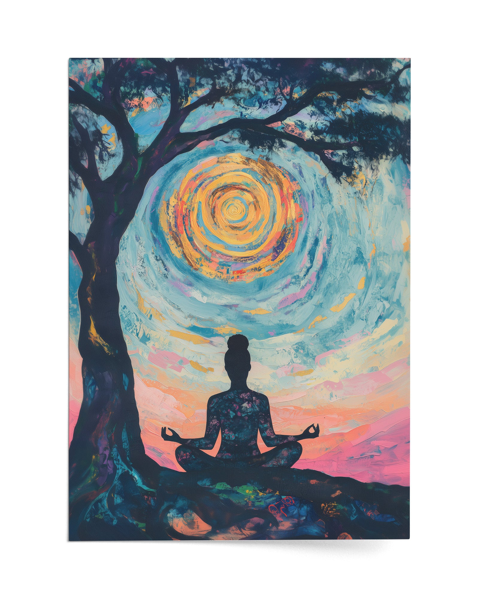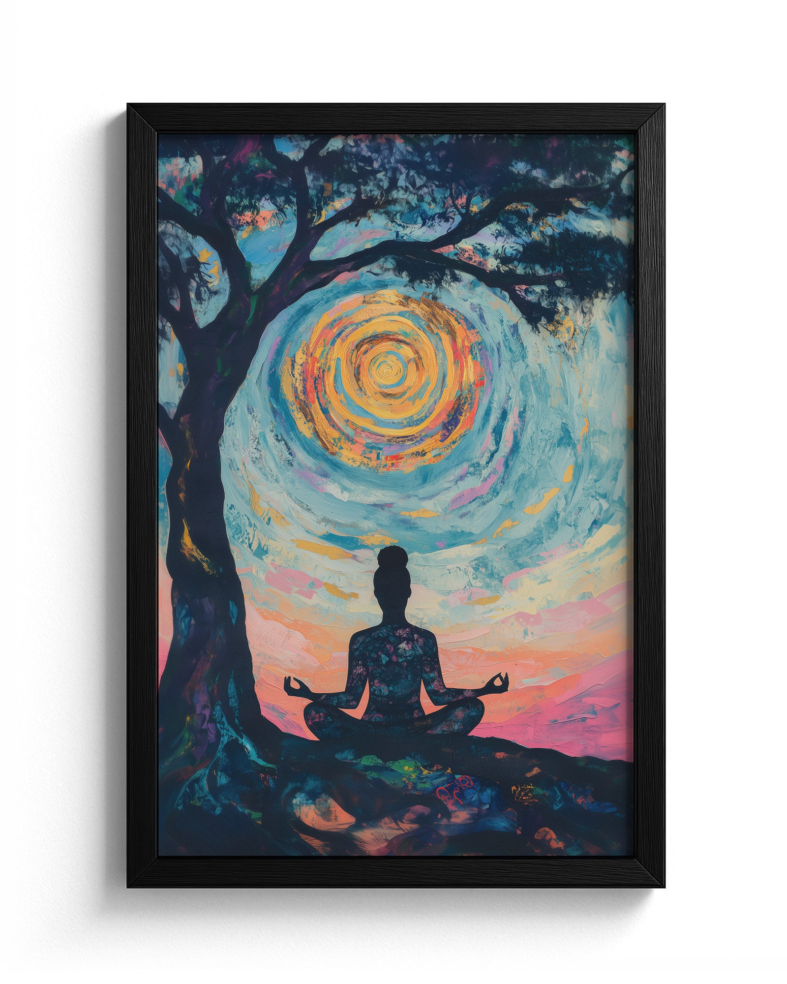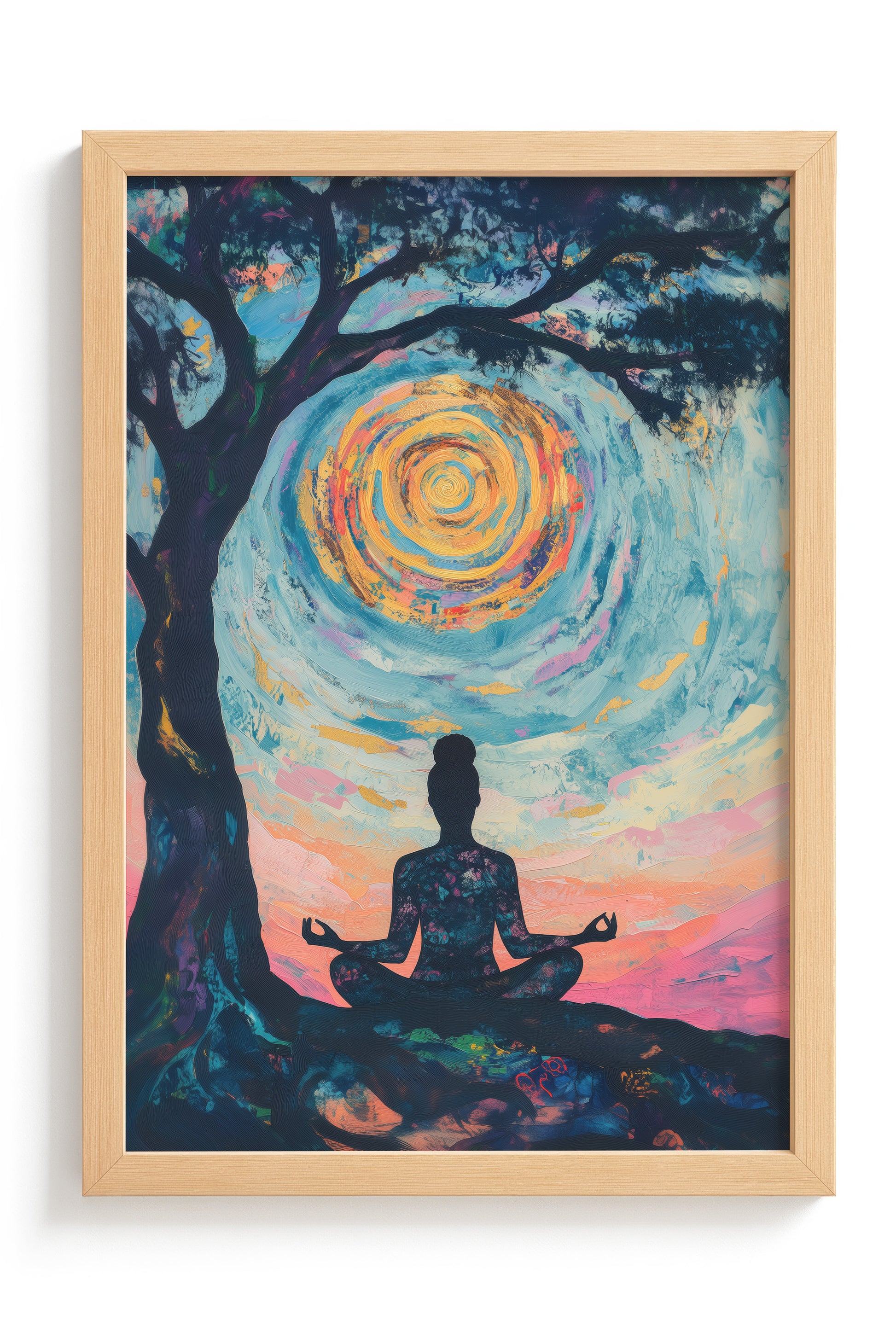 Experience the serene meditation of an African woman beneath a glowing baobab tree, her aura blending seamlessly with vibrant tribal patterns that spiral into the cosmos.
