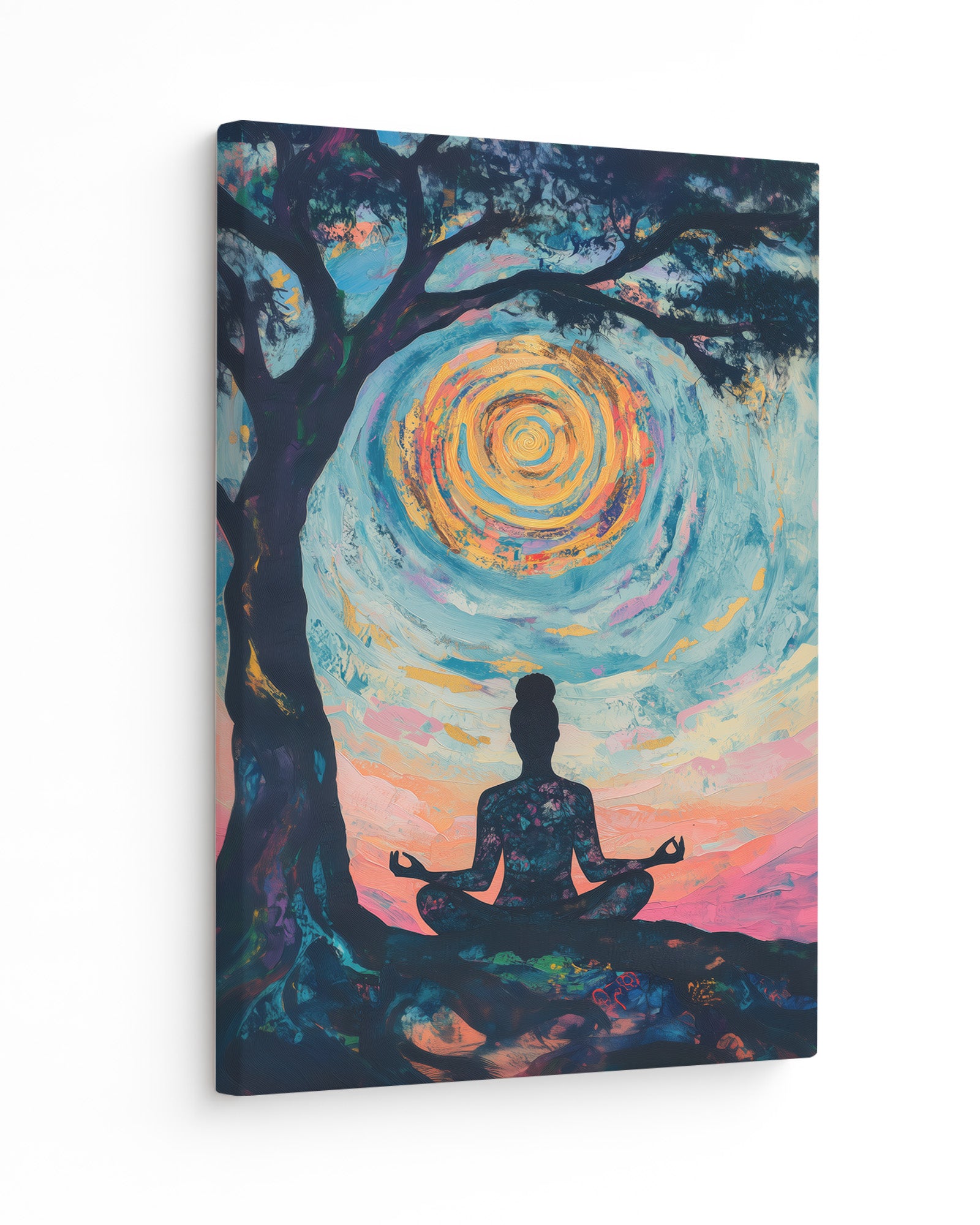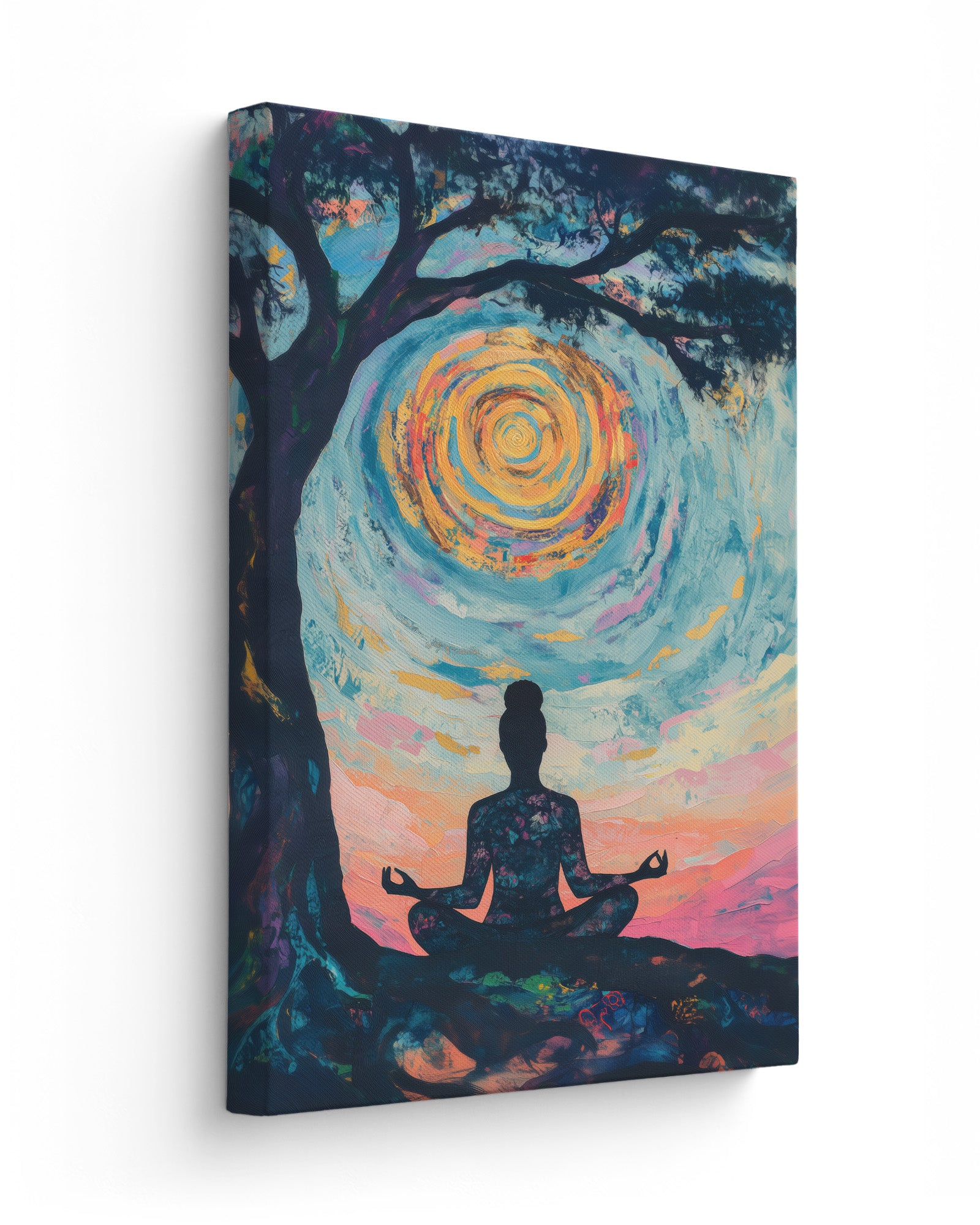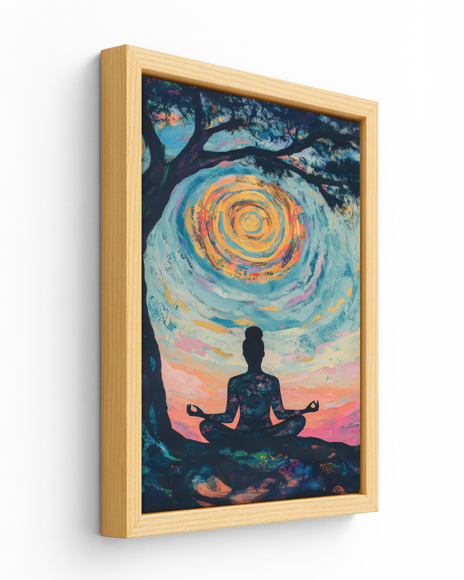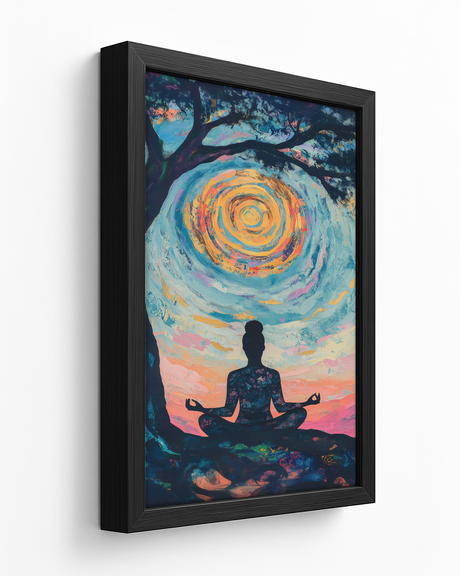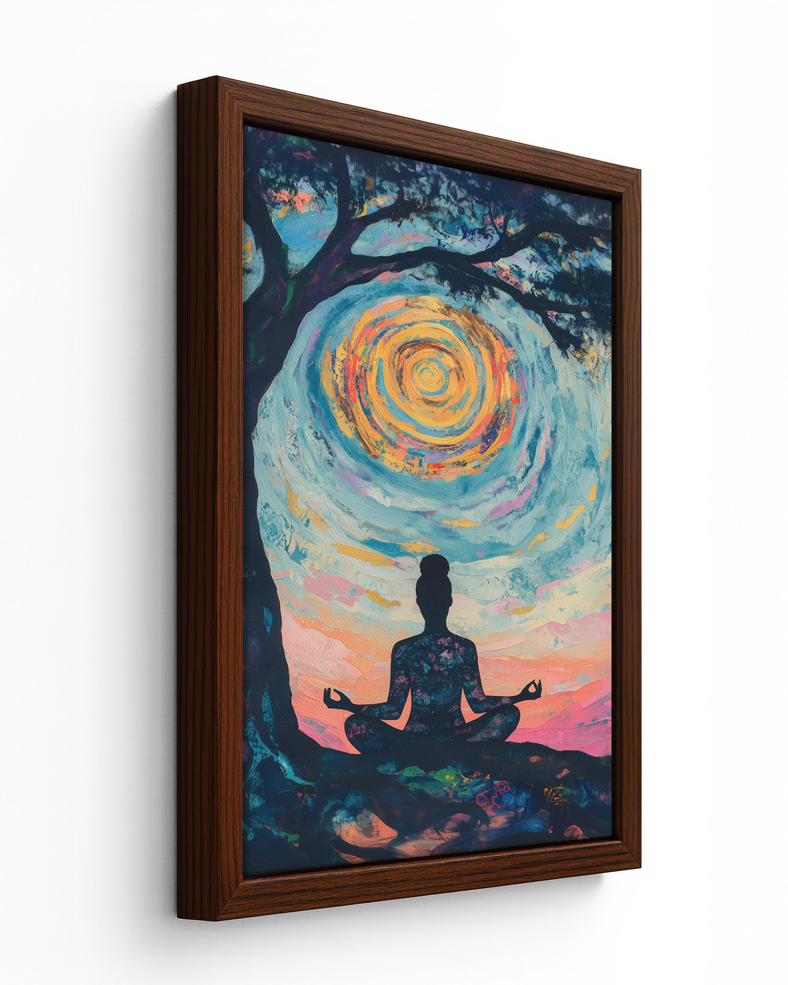 Experience the serene meditation of an African woman beneath a glowing baobab tree, her aura blending seamlessly with vibrant tribal patterns that spiral into the cosmos.
