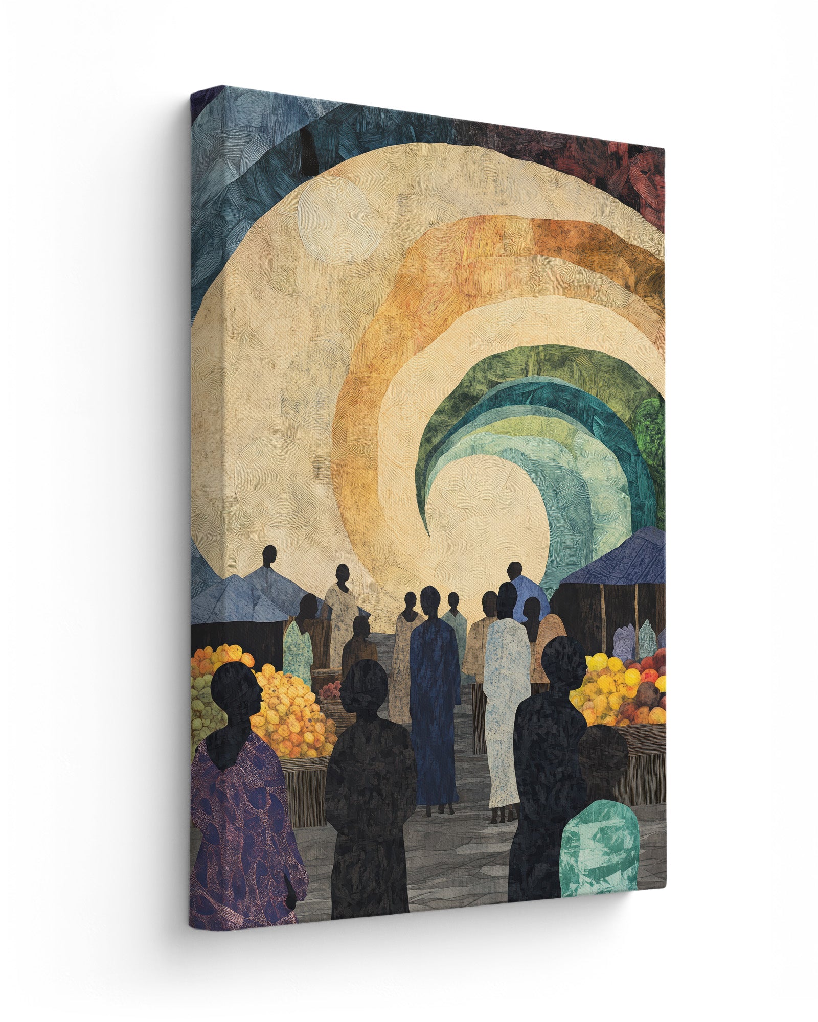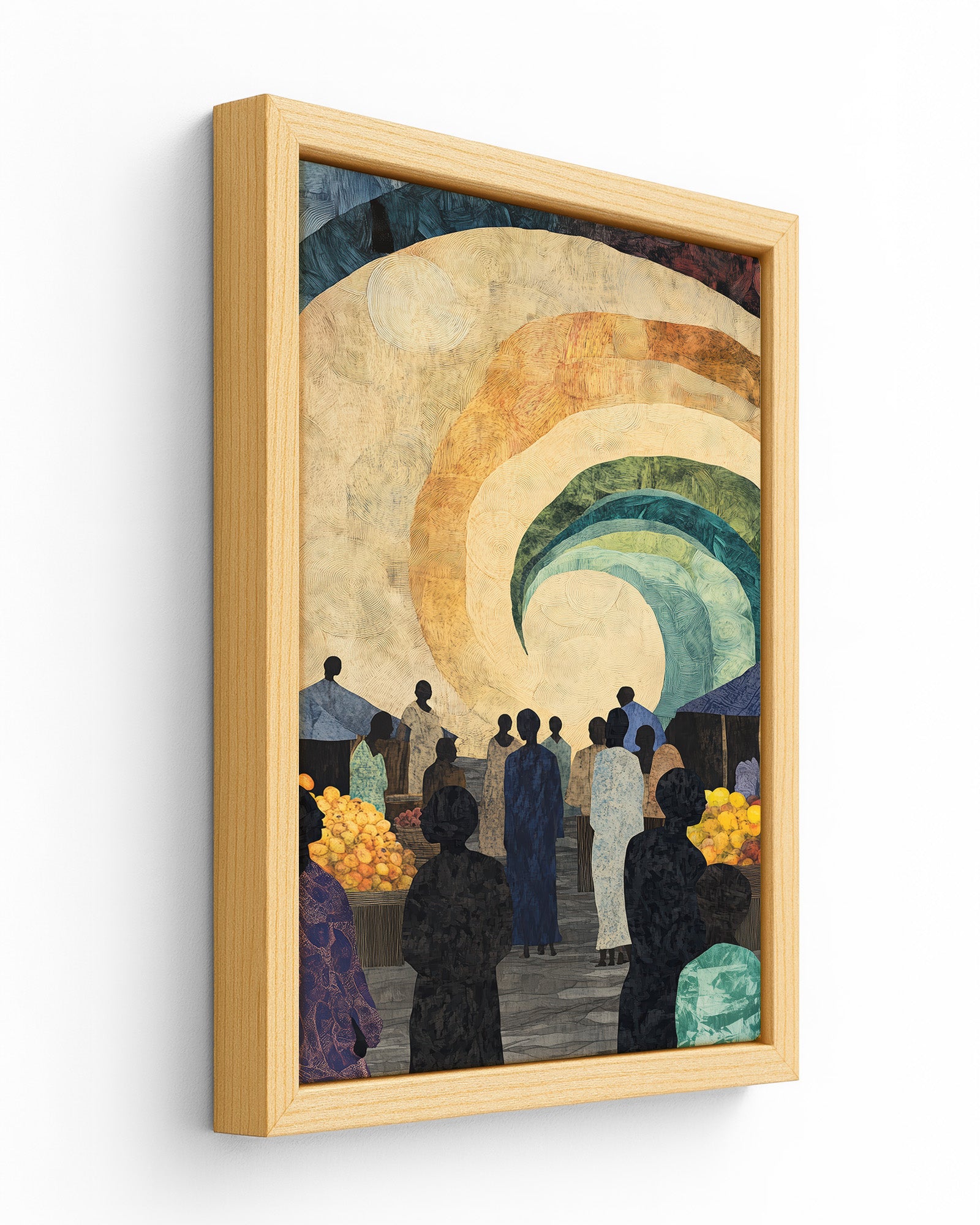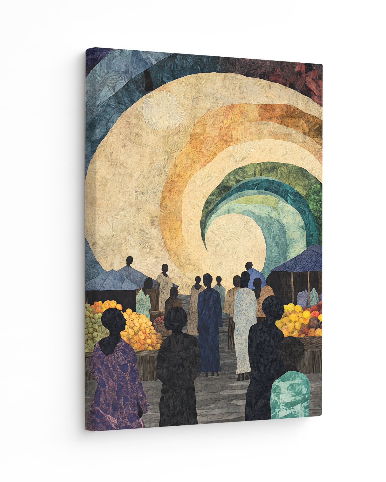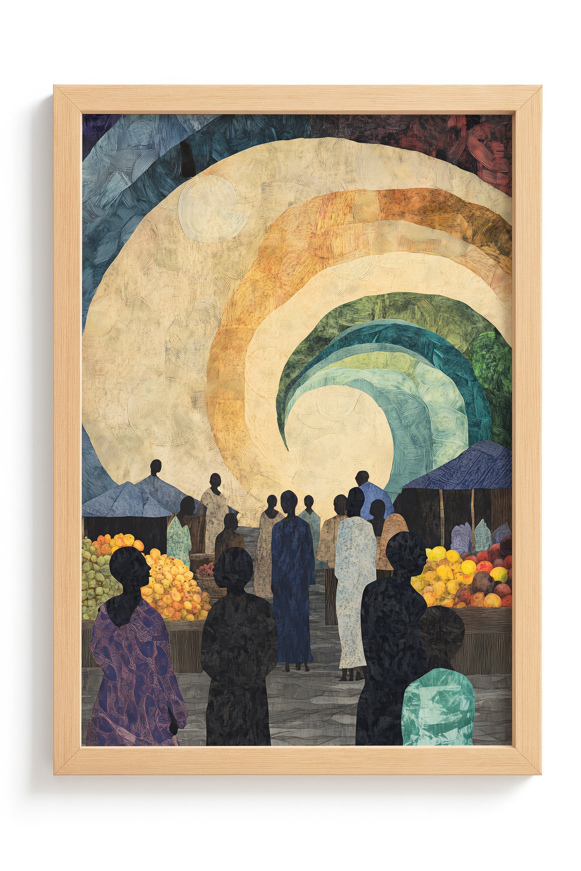 Immerse yourself in the vibrant energy of an African market, where stalls overflow with fruits, fabrics, and pottery. Traditional attire and warm golden tones bring the bustling scene to life.