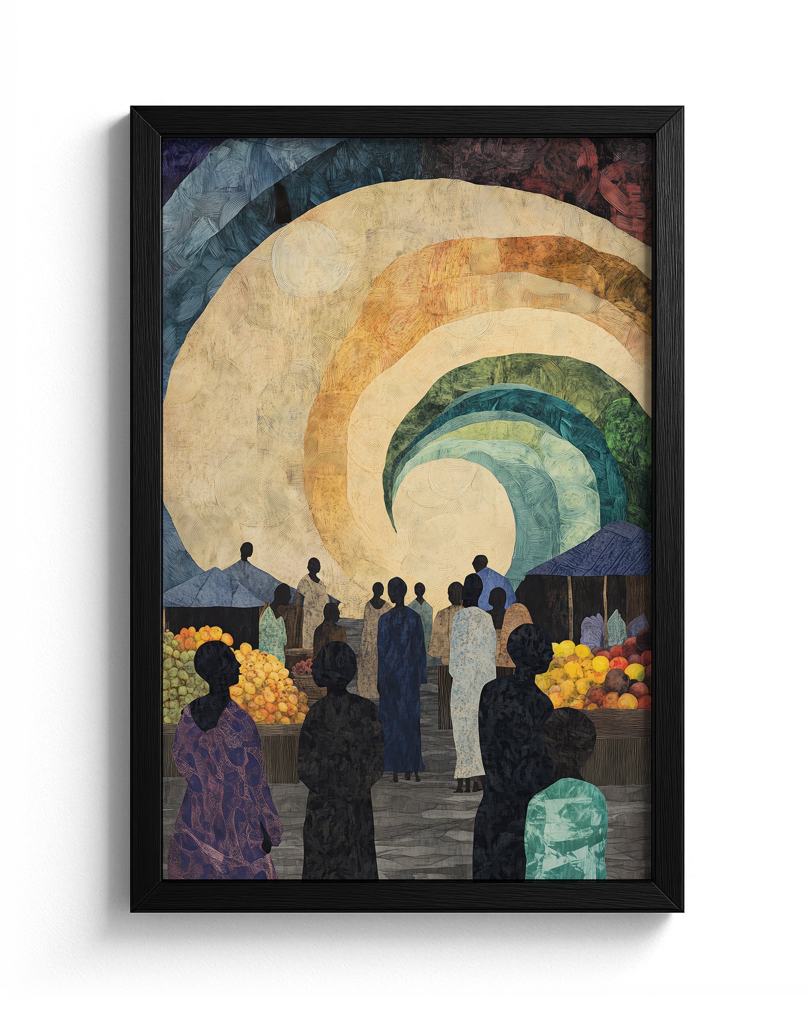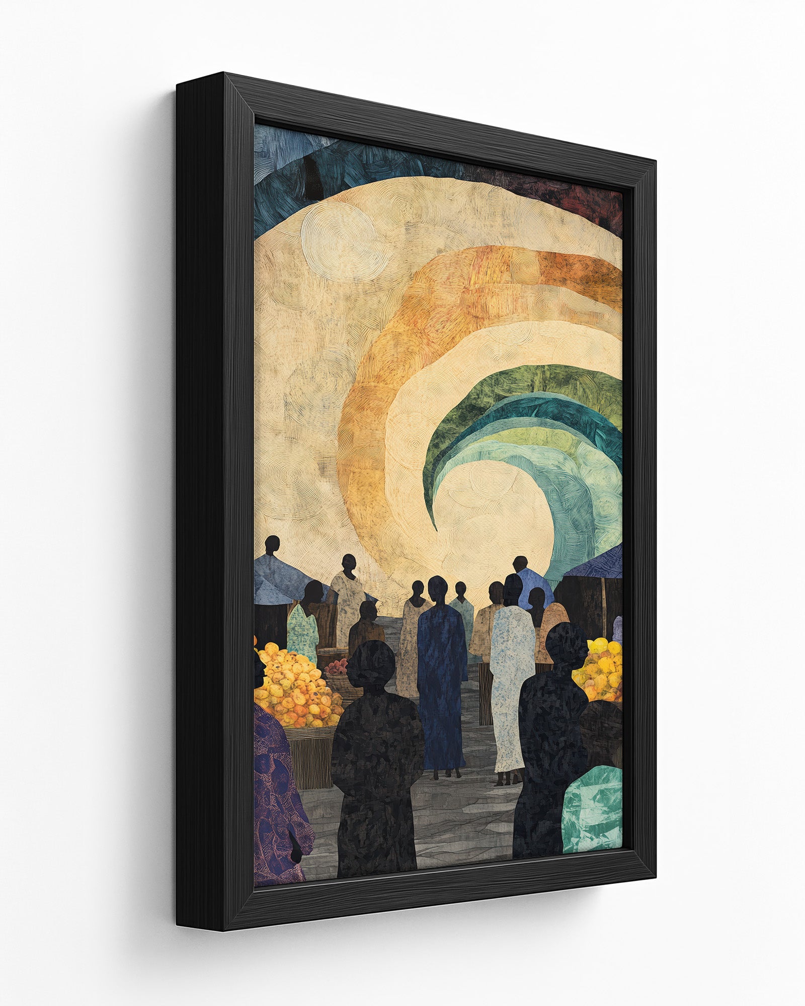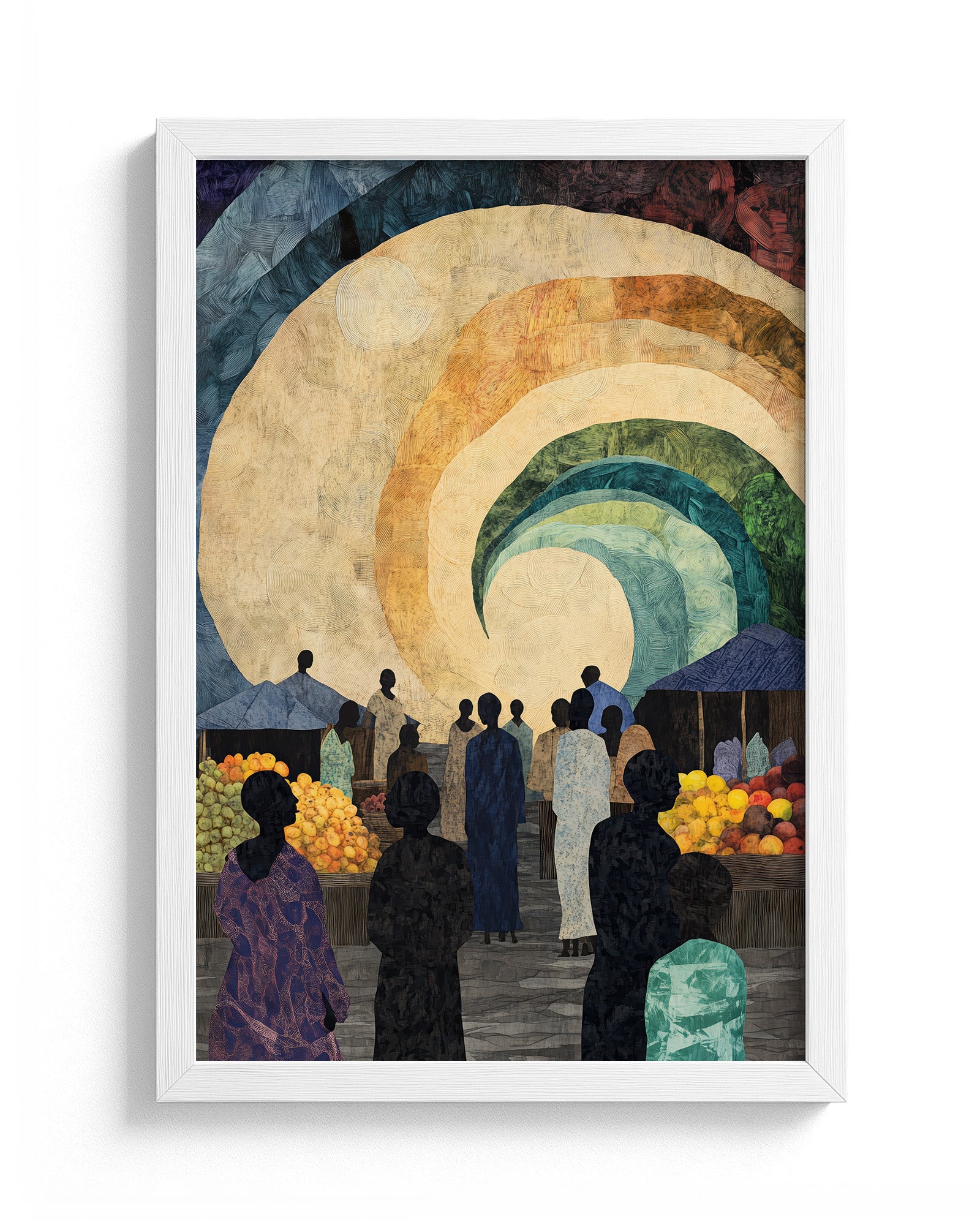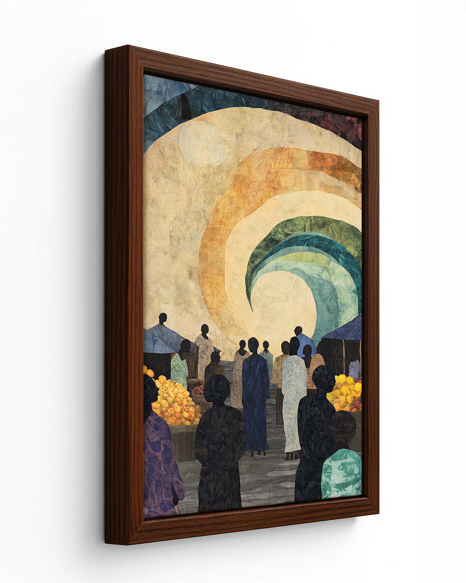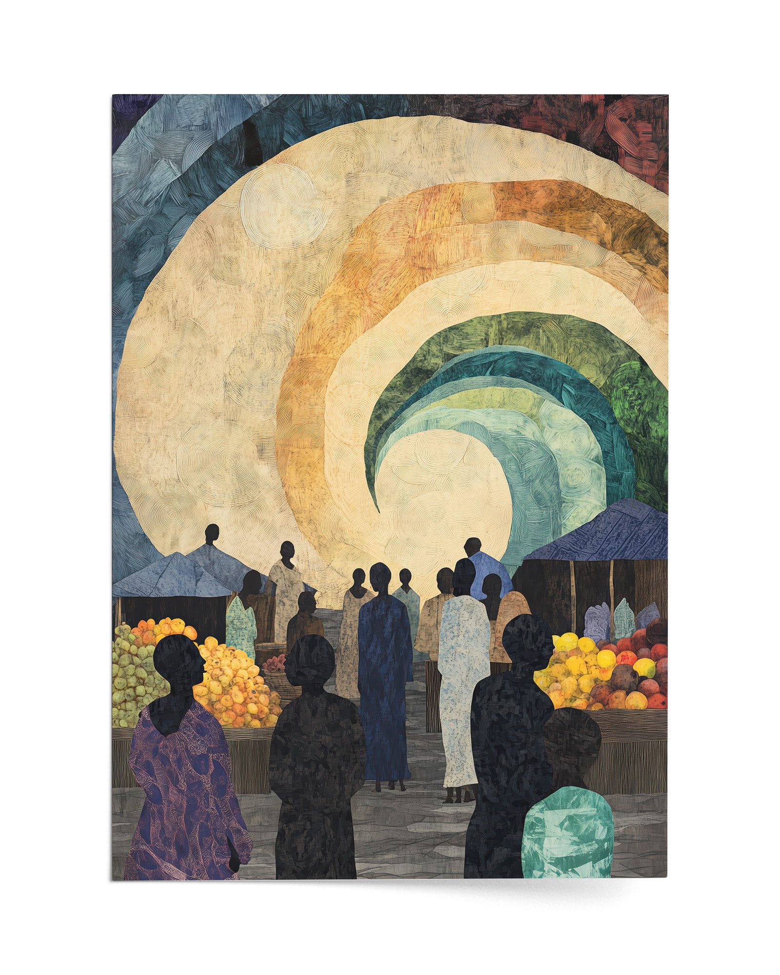 Immerse yourself in the vibrant energy of an African market, where stalls overflow with fruits, fabrics, and pottery. Traditional attire and warm golden tones bring the bustling scene to life.
