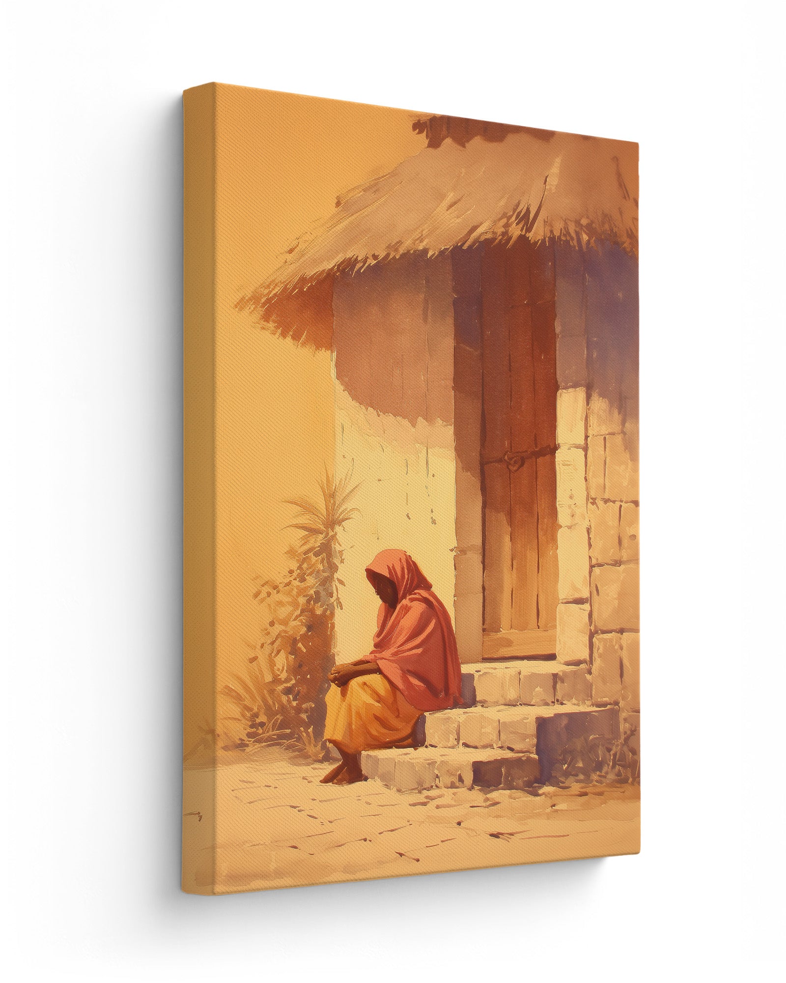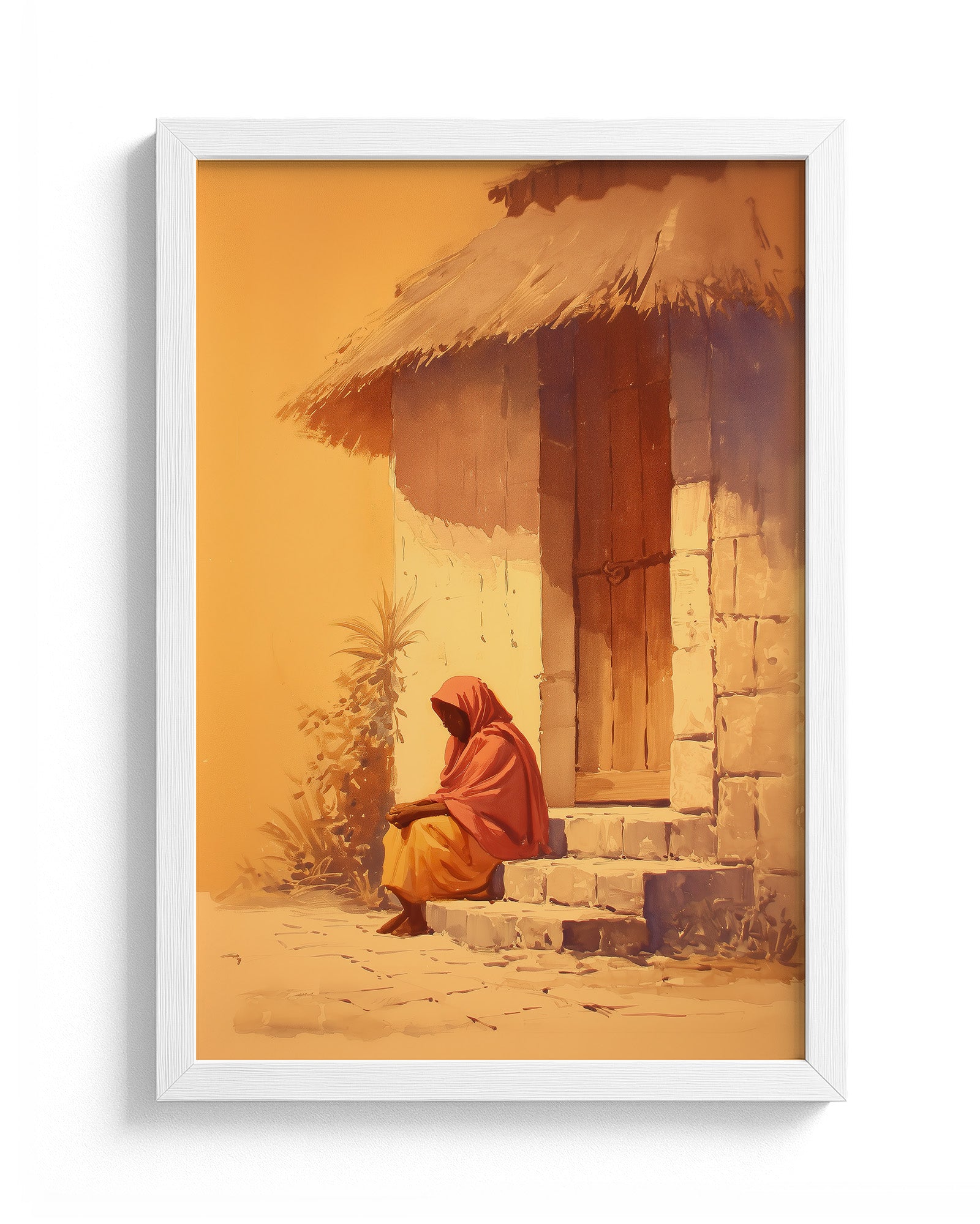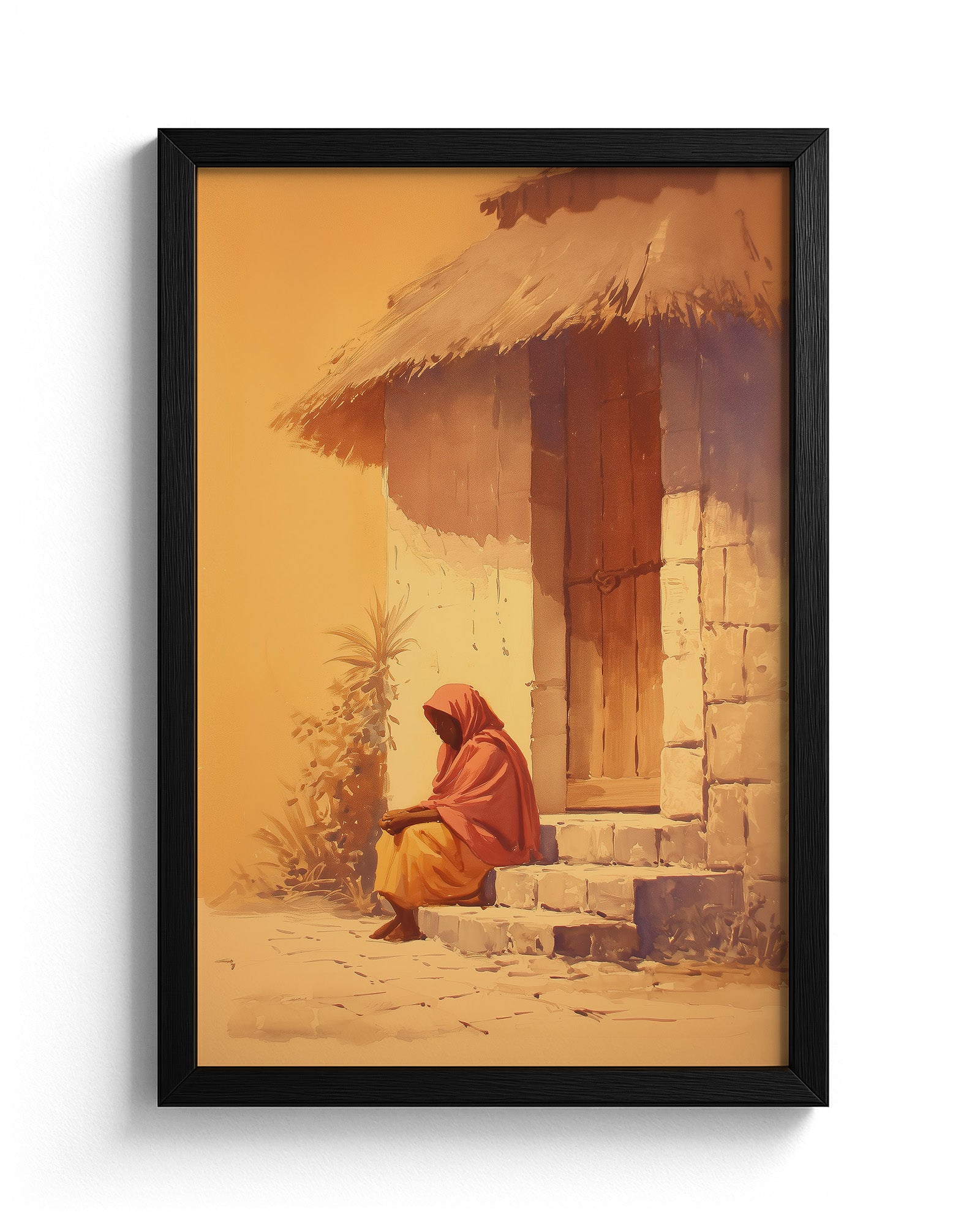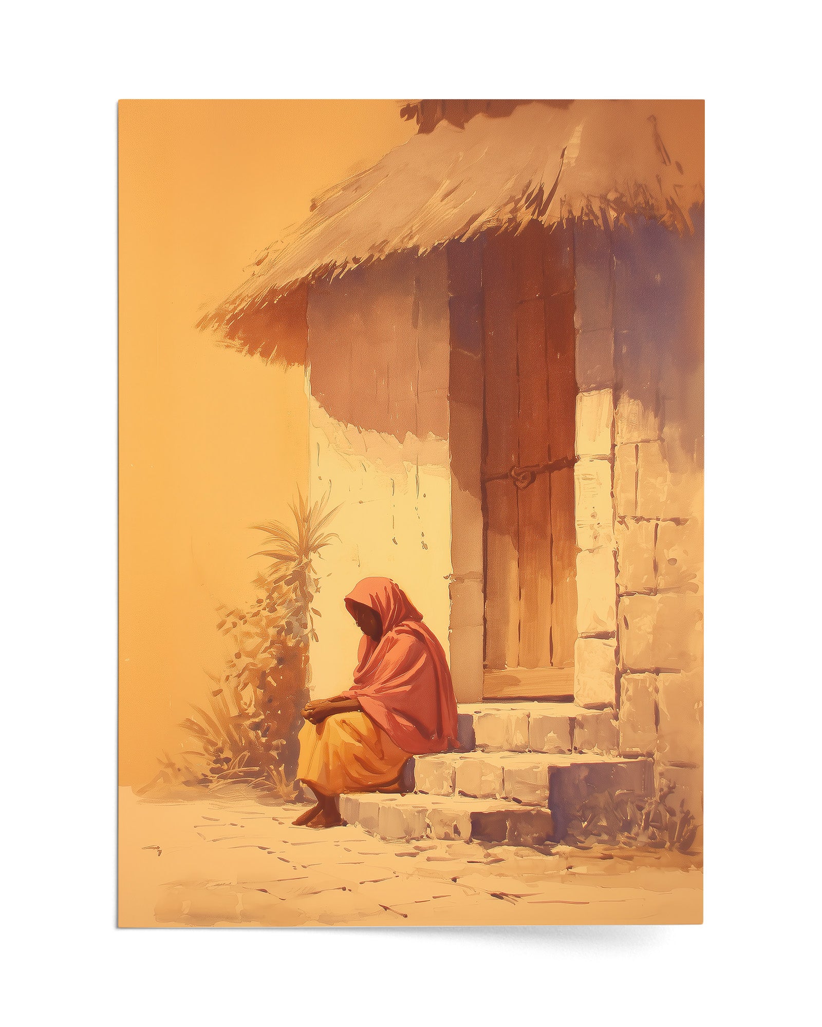 A woman sits quietly on the stone steps of a small home, wrapped in warm sunlight and stillness. The soft brushstrokes and earthy tones capture a moment of reflection — a pause in the rhythm of everyday life. With its gentle composition and minimal form, the piece evokes themes of patience, home, and quiet strength found in simple moments.