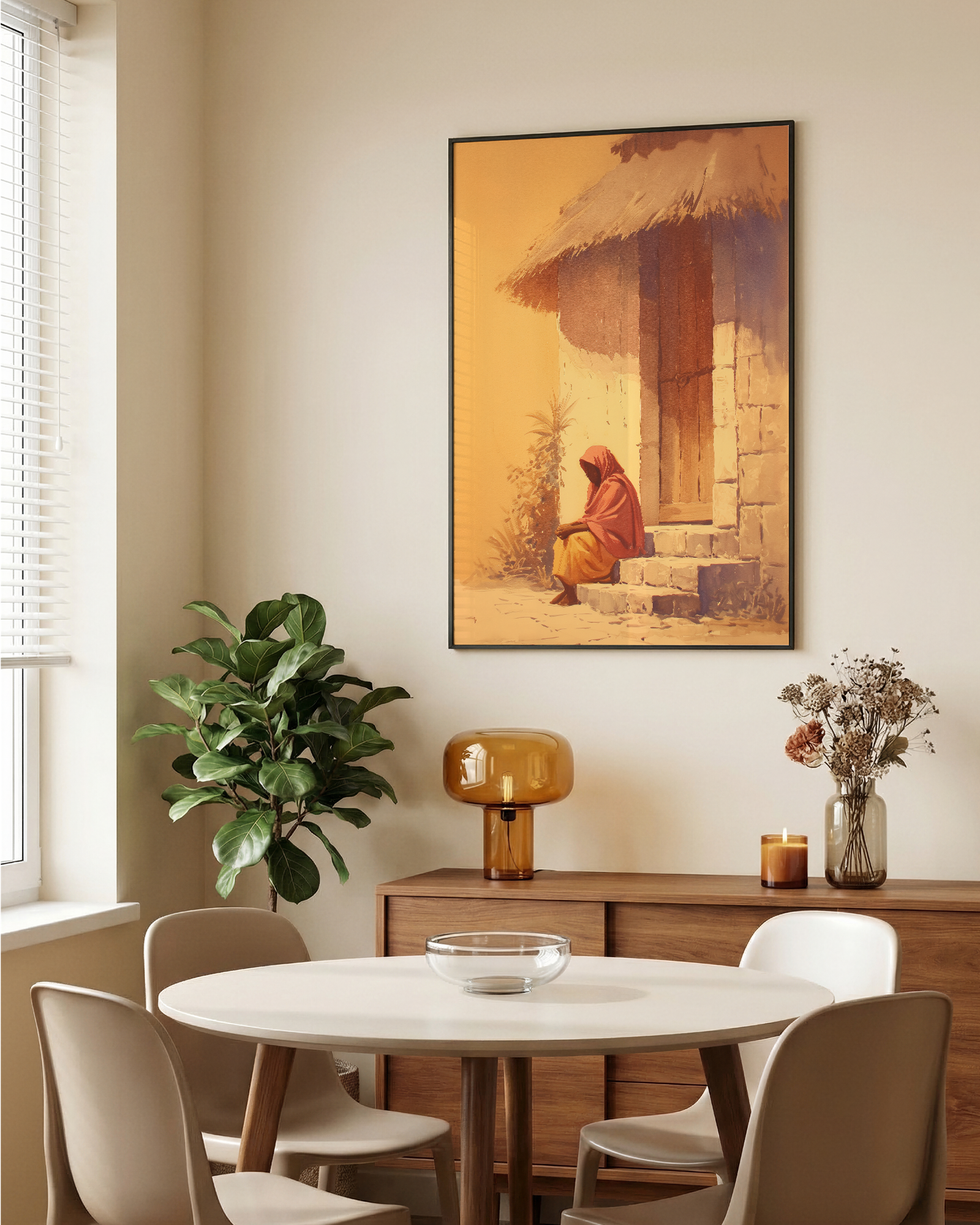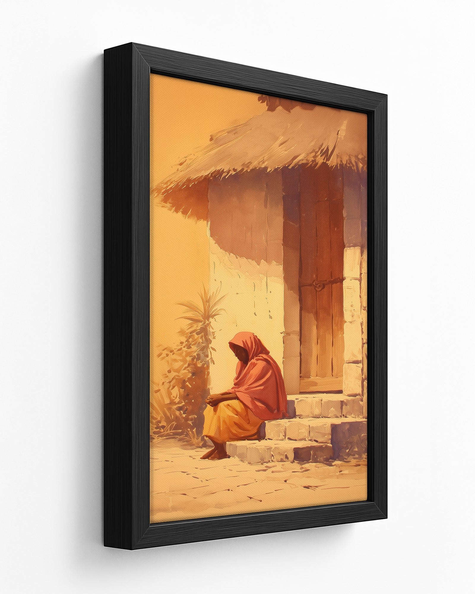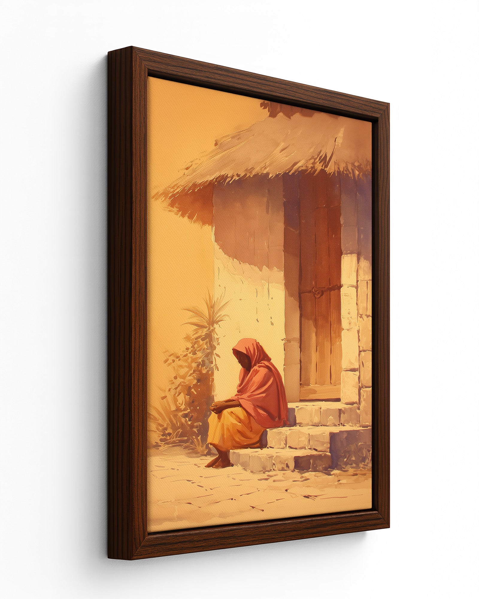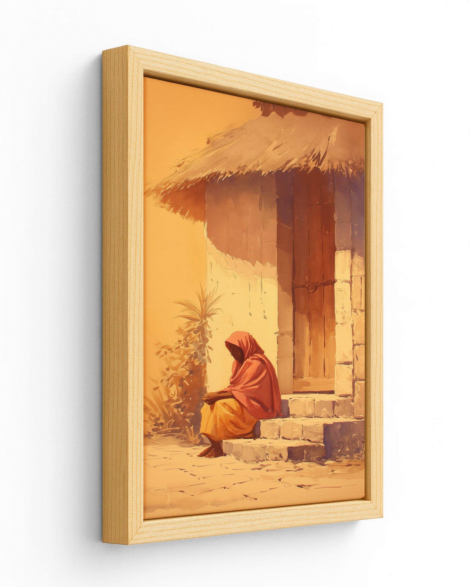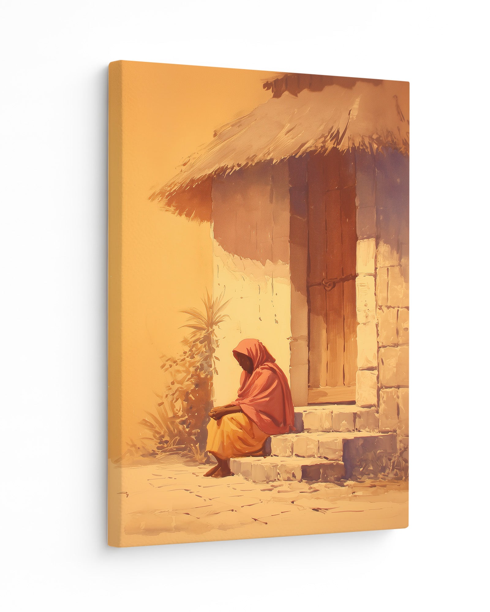 A woman sits quietly on the stone steps of a small home, wrapped in warm sunlight and stillness. The soft brushstrokes and earthy tones capture a moment of reflection — a pause in the rhythm of everyday life. With its gentle composition and minimal form, the piece evokes themes of patience, home, and quiet strength found in simple moments.