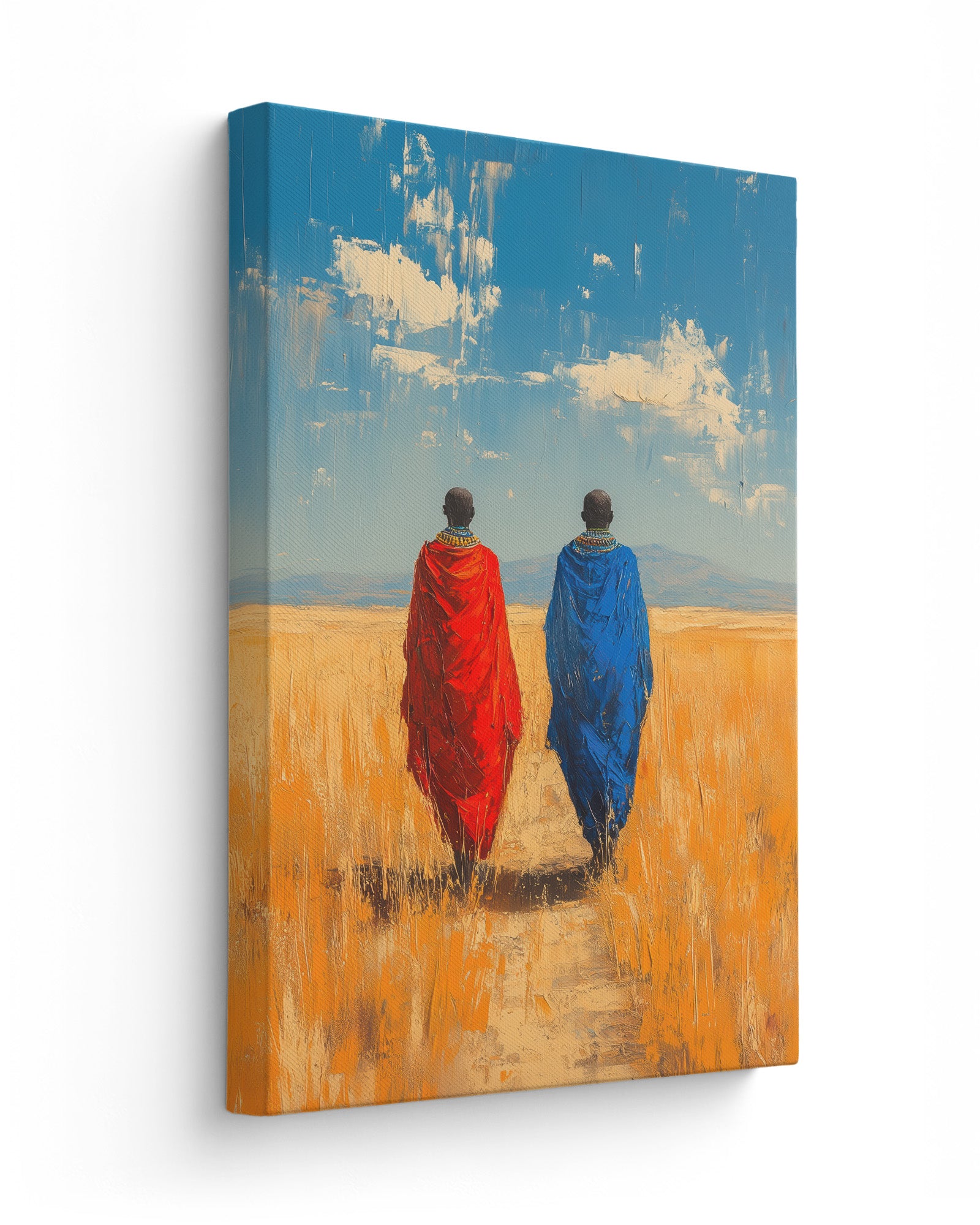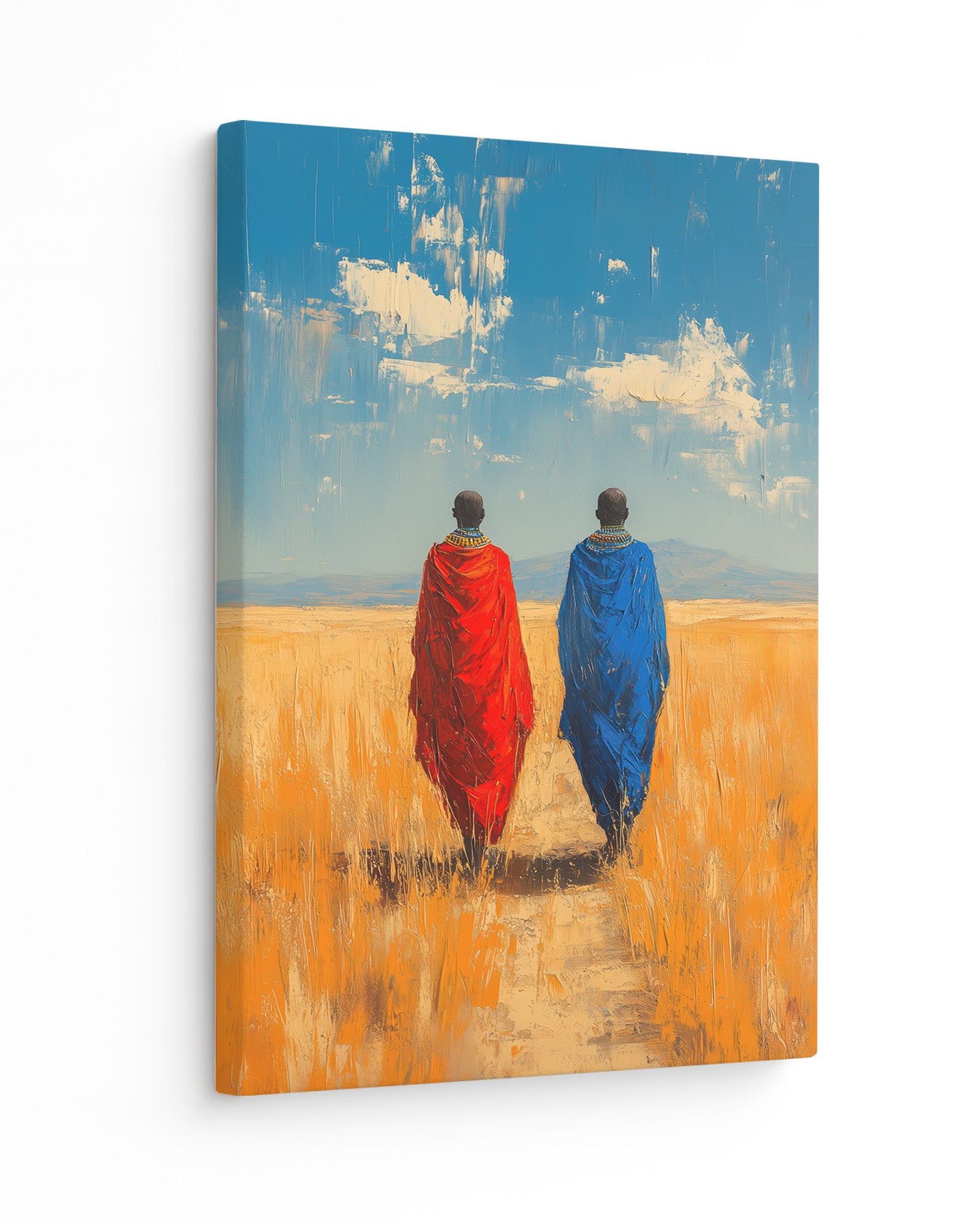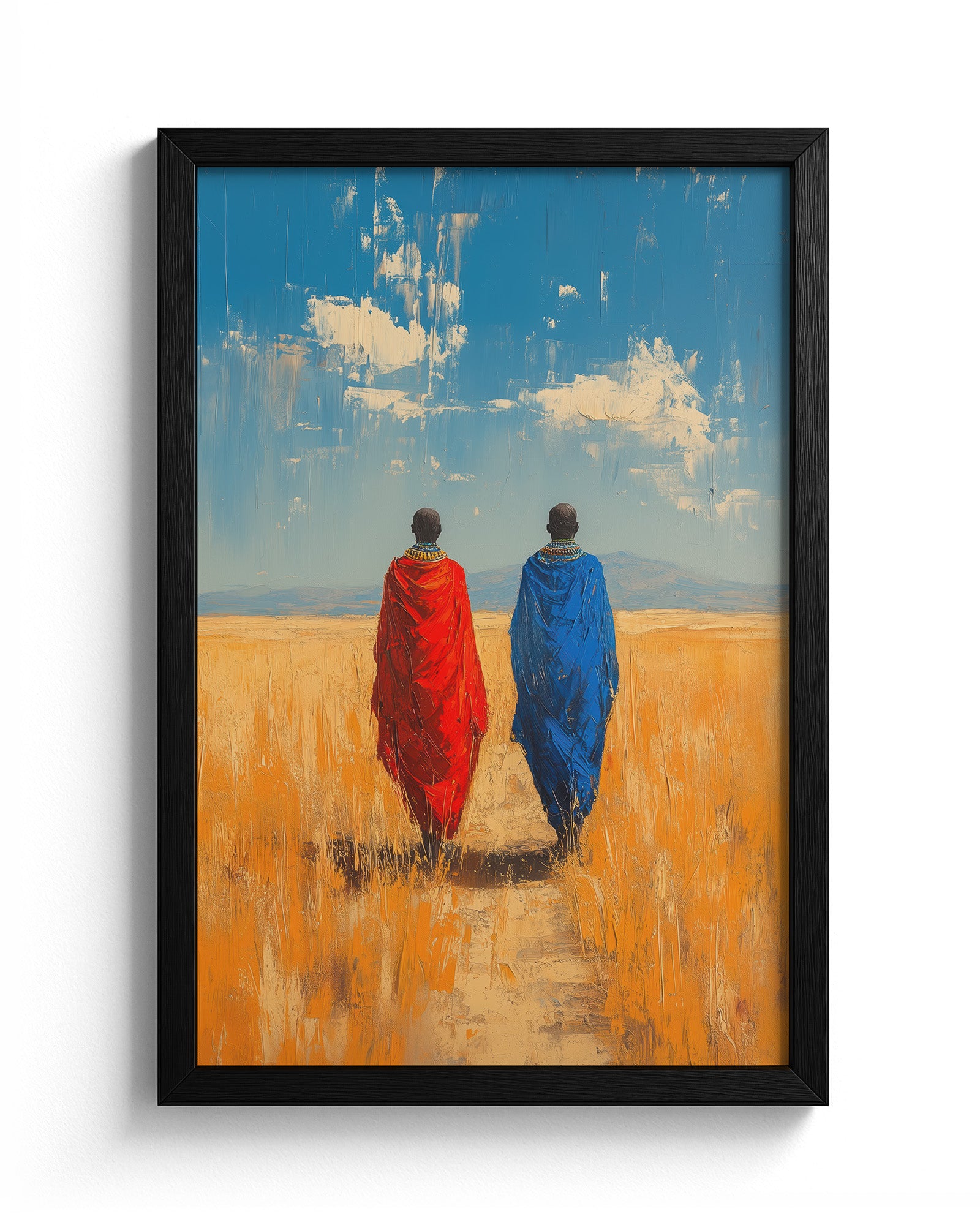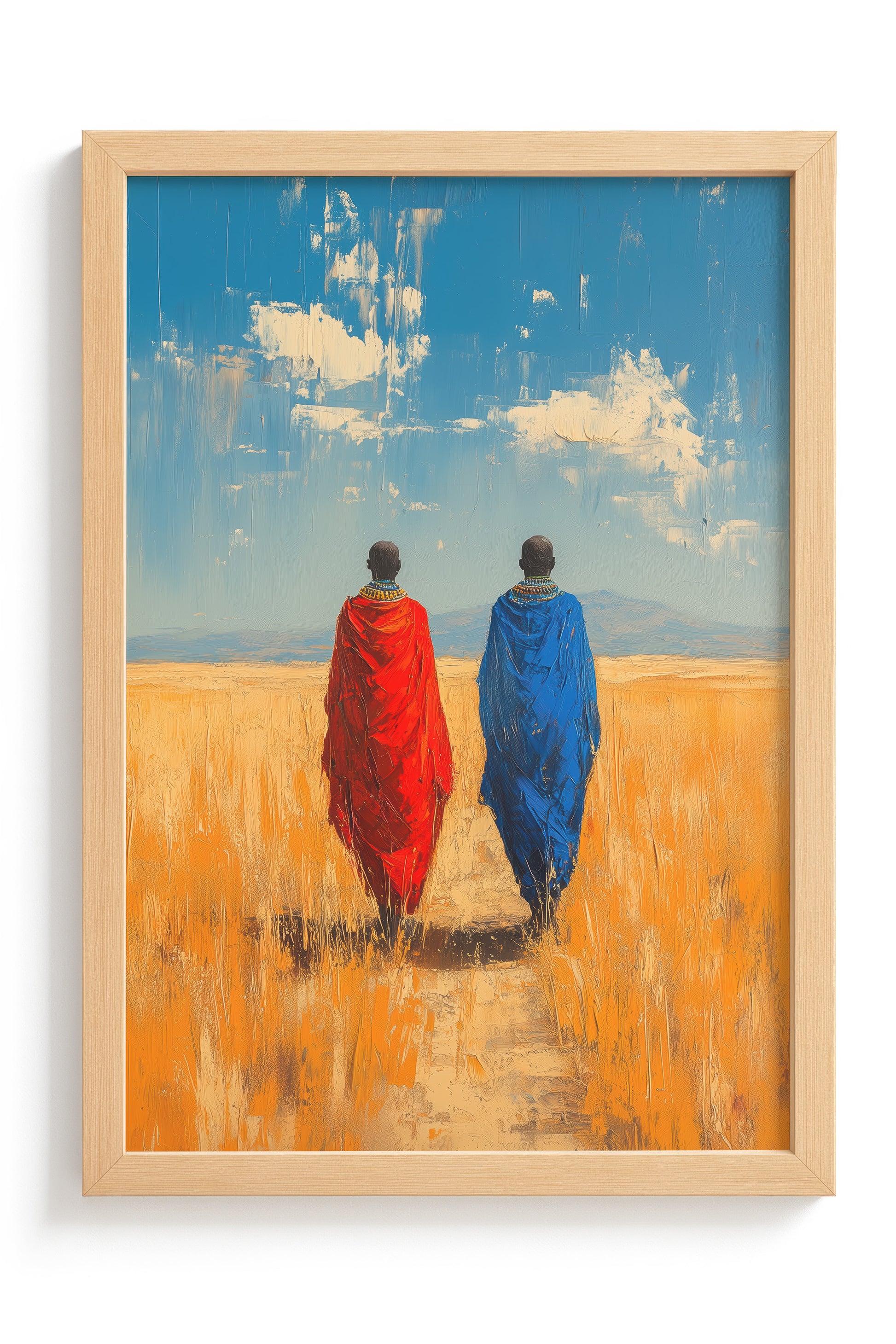 This enchanting oil painting showcases two Maasai warriors standing side by side, their backs to the viewer as they embark on a journey into the horizon. One warrior is adorned in vibrant blue, while the other wears striking red, symbolizing the rich cultural heritage of the Maasai people.