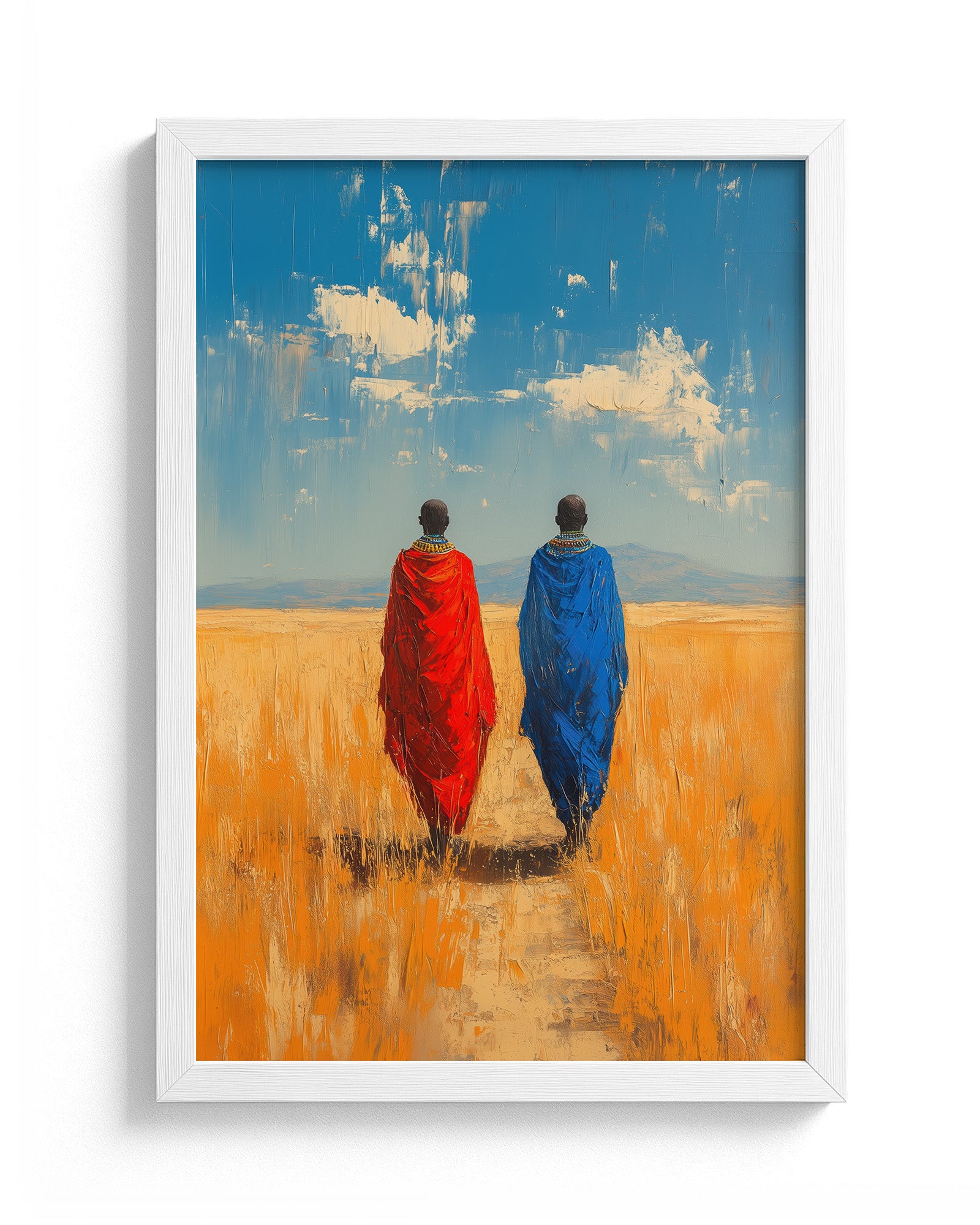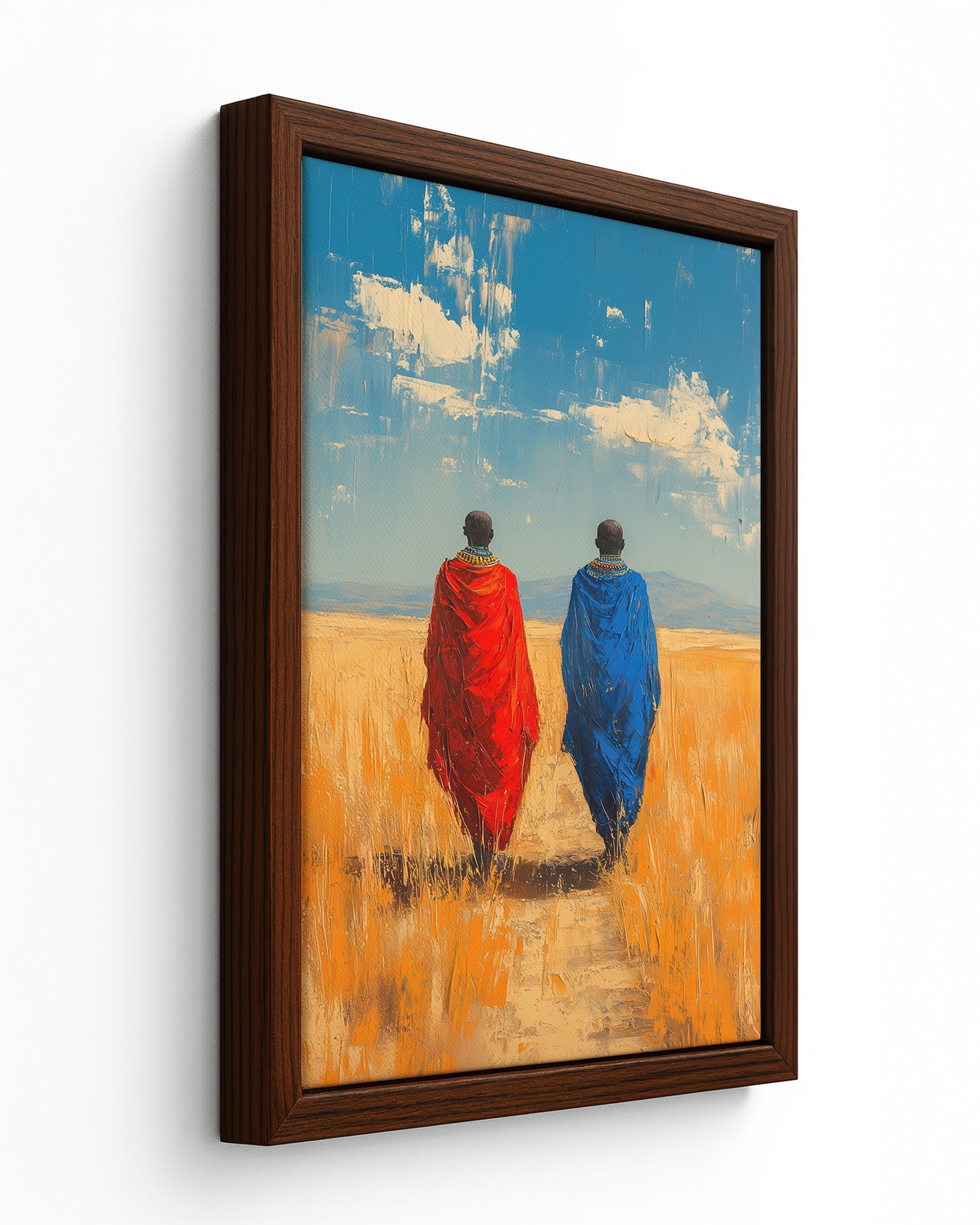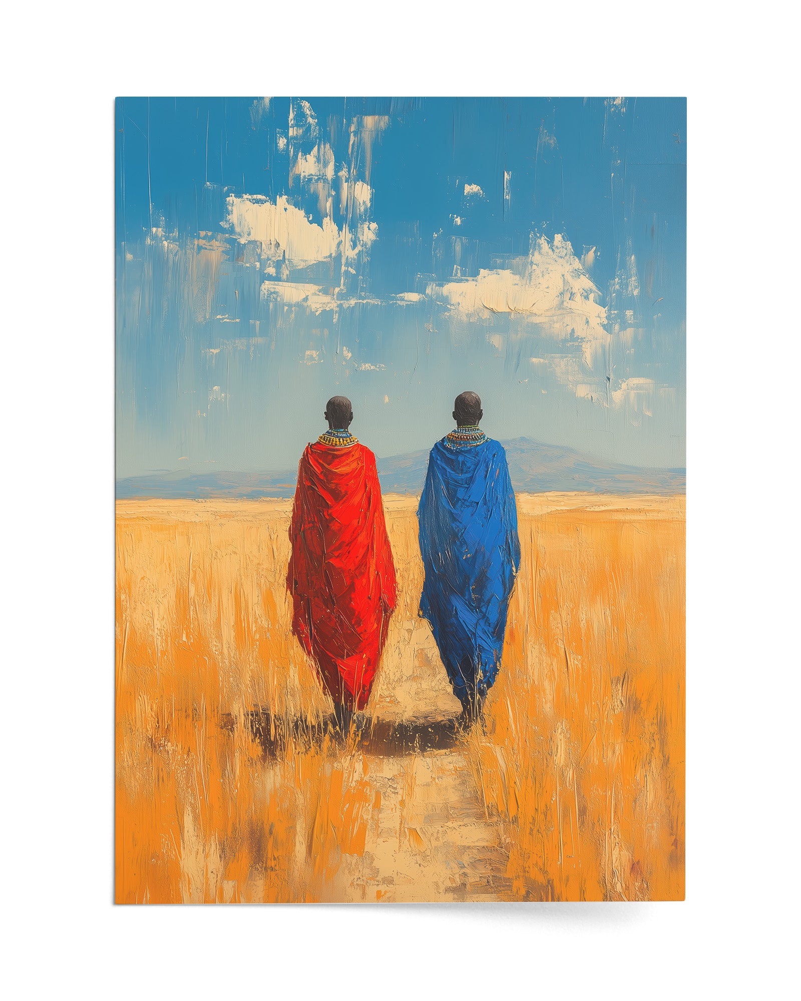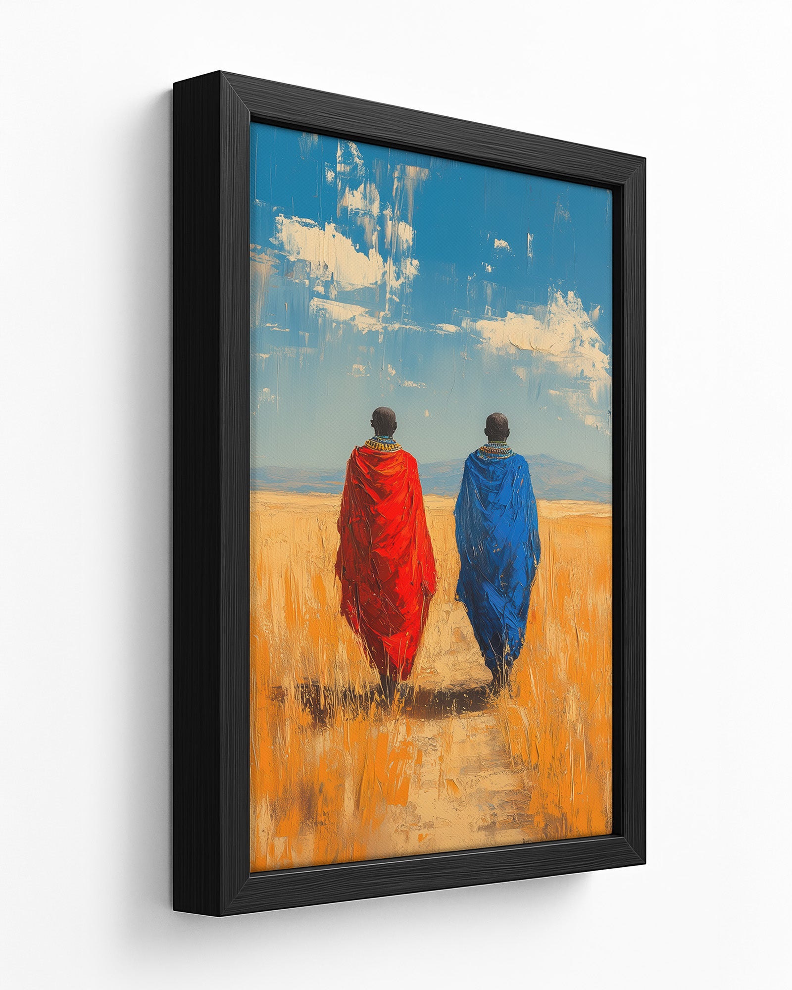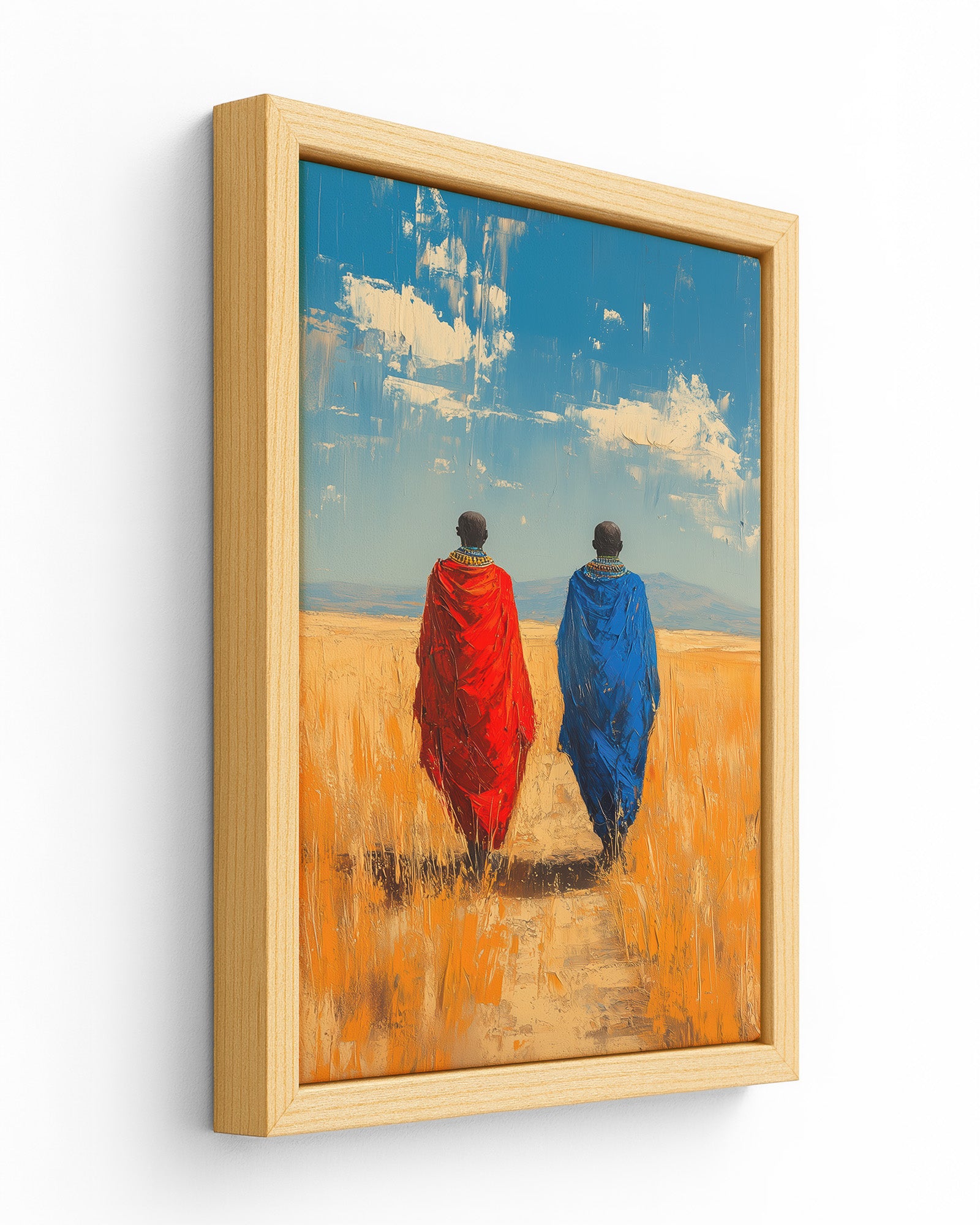 This enchanting oil painting showcases two Maasai warriors standing side by side, their backs to the viewer as they embark on a journey into the horizon. One warrior is adorned in vibrant blue, while the other wears striking red, symbolizing the rich cultural heritage of the Maasai people.