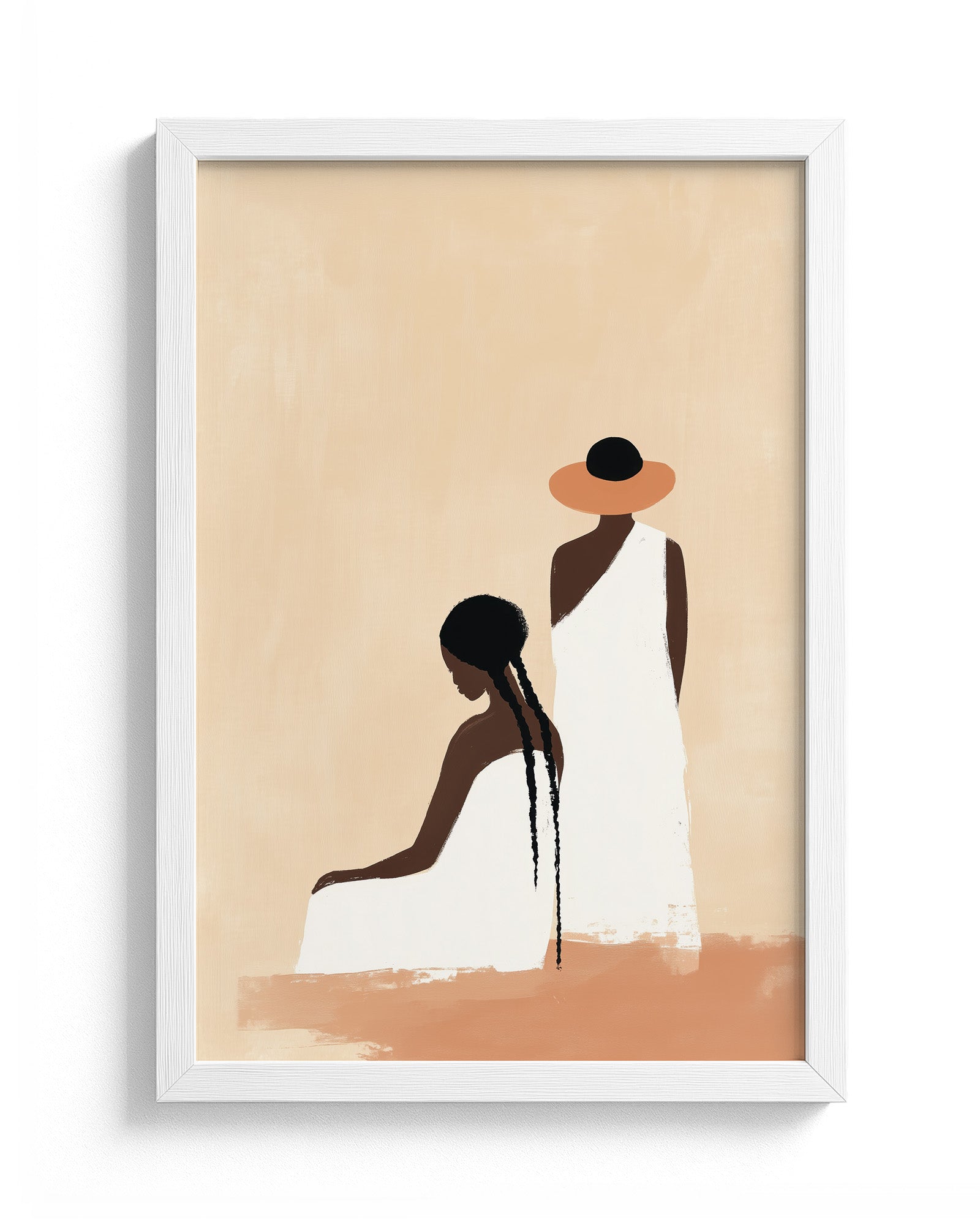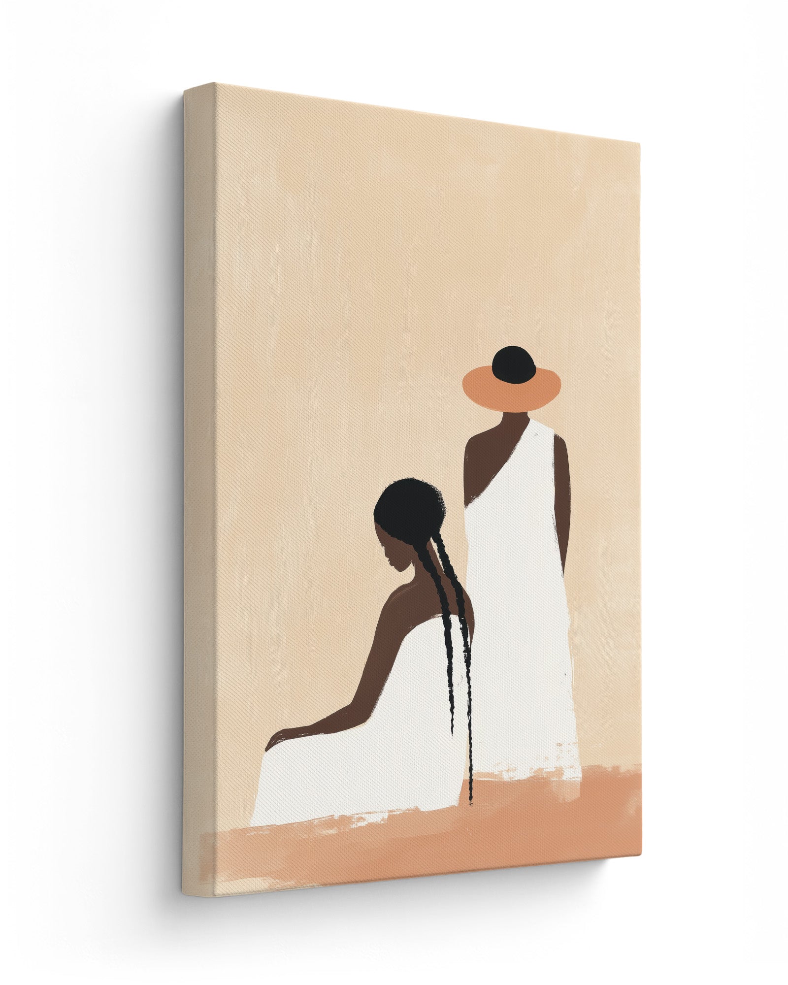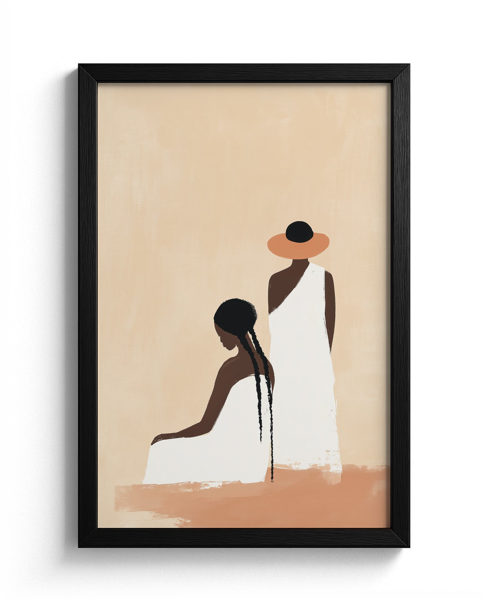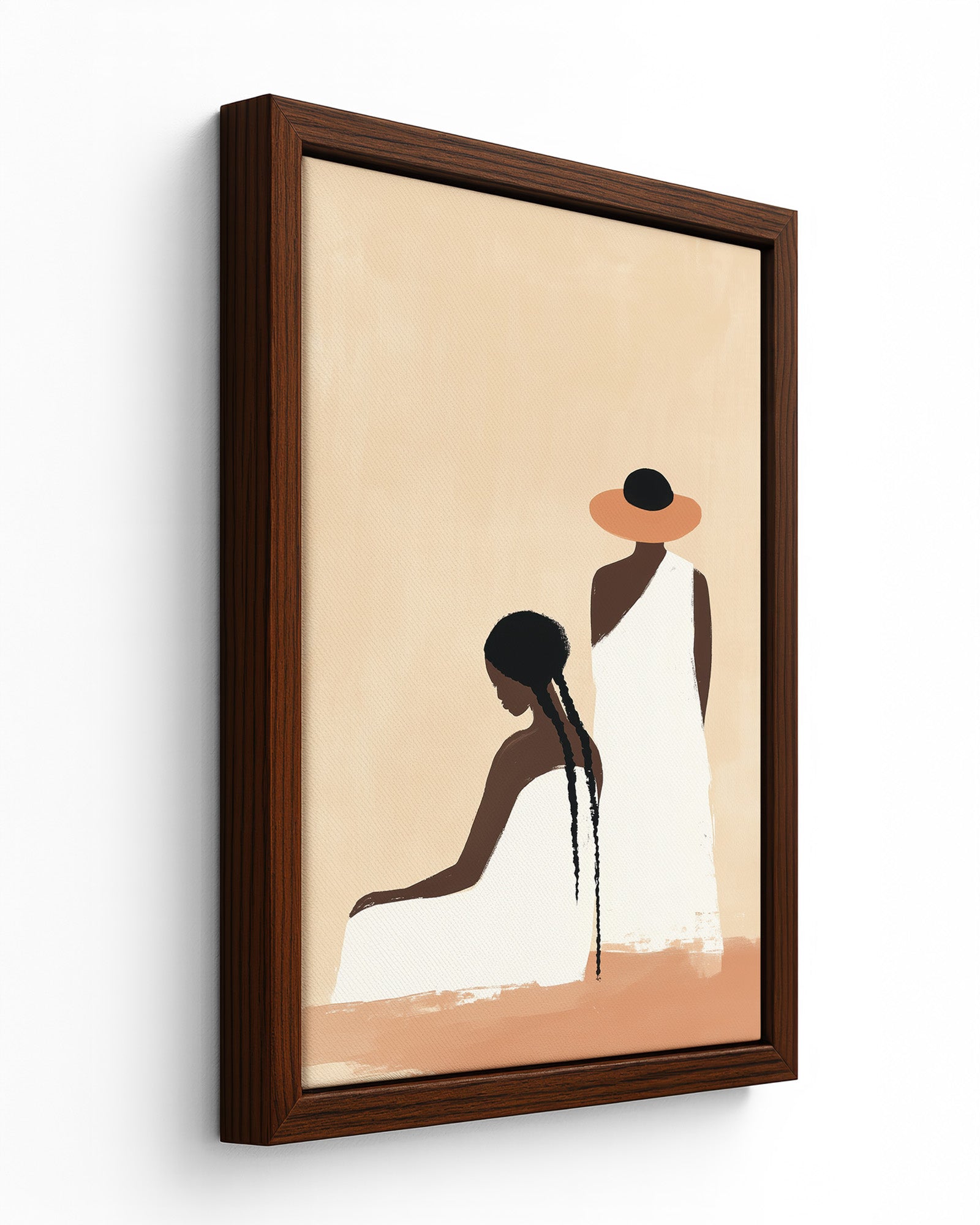 This minimalist wall art captures a quiet moment between two women—one seated in contemplation, the other standing in serene stillness. Rendered in warm, earthy tones with soft white garments and abstract brush textures, the piece evokes sisterhood, reflection, and quiet grace.