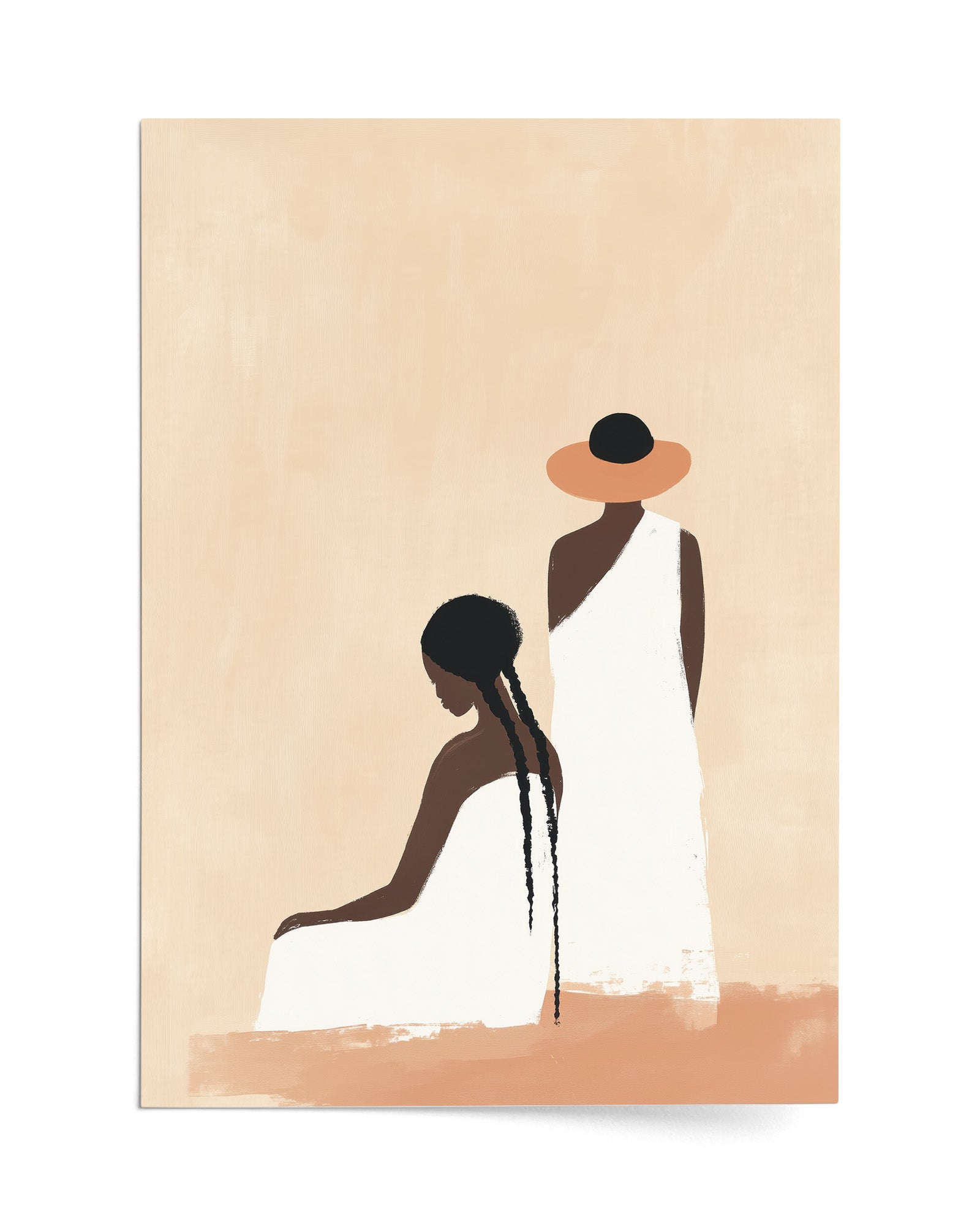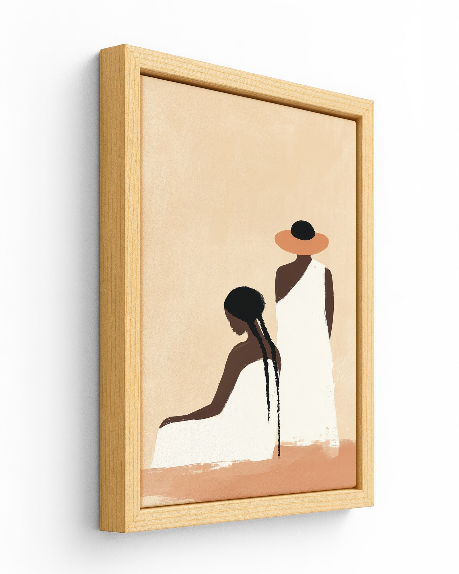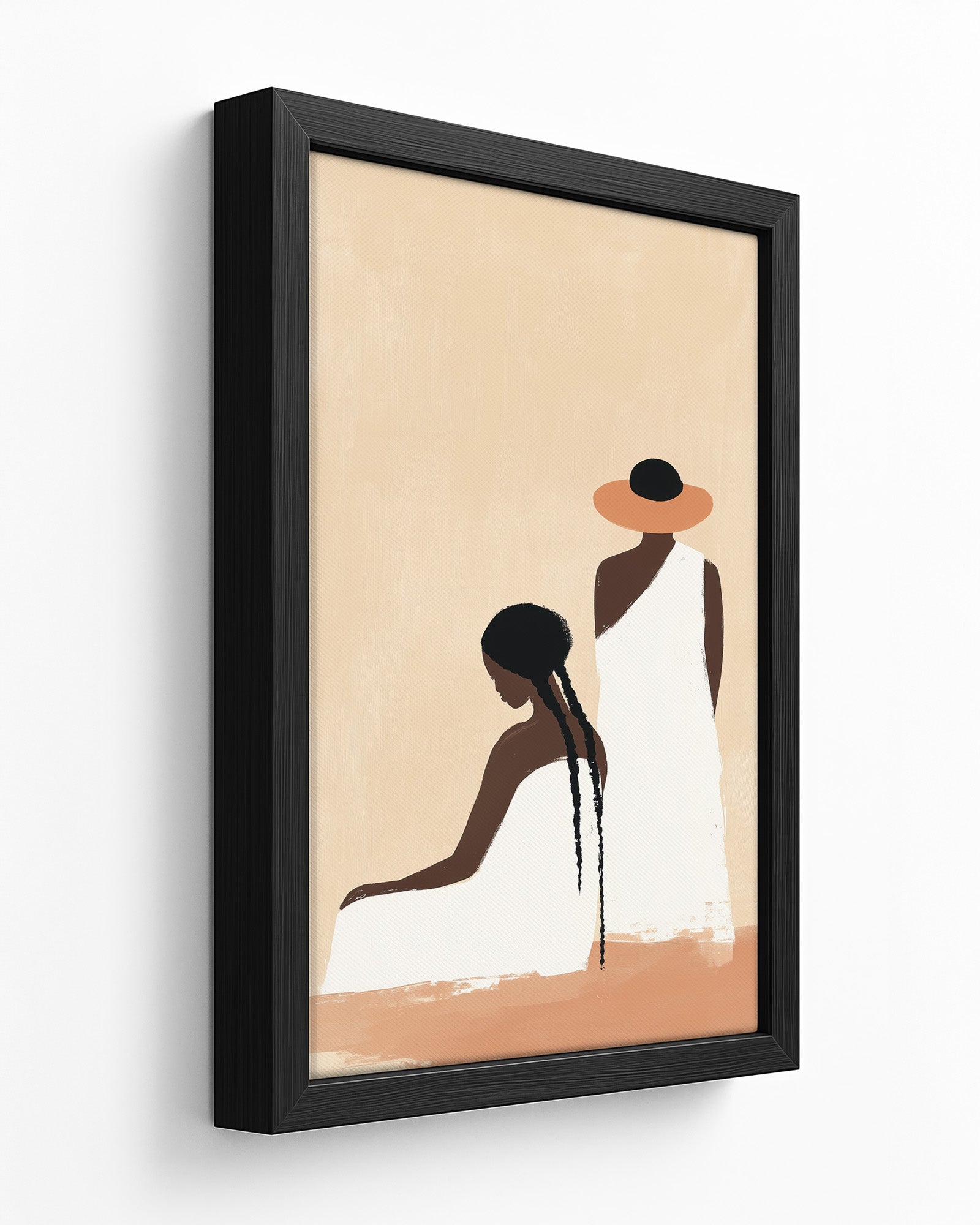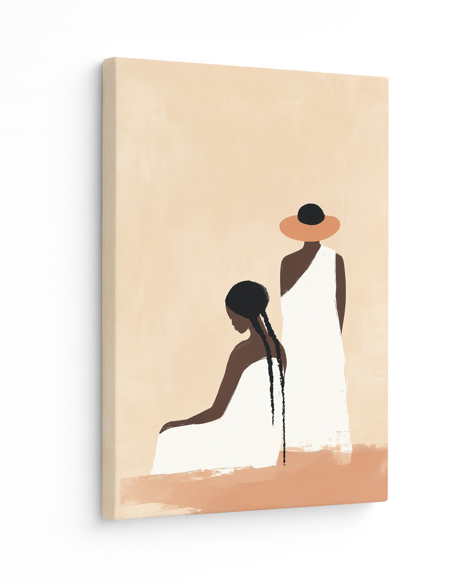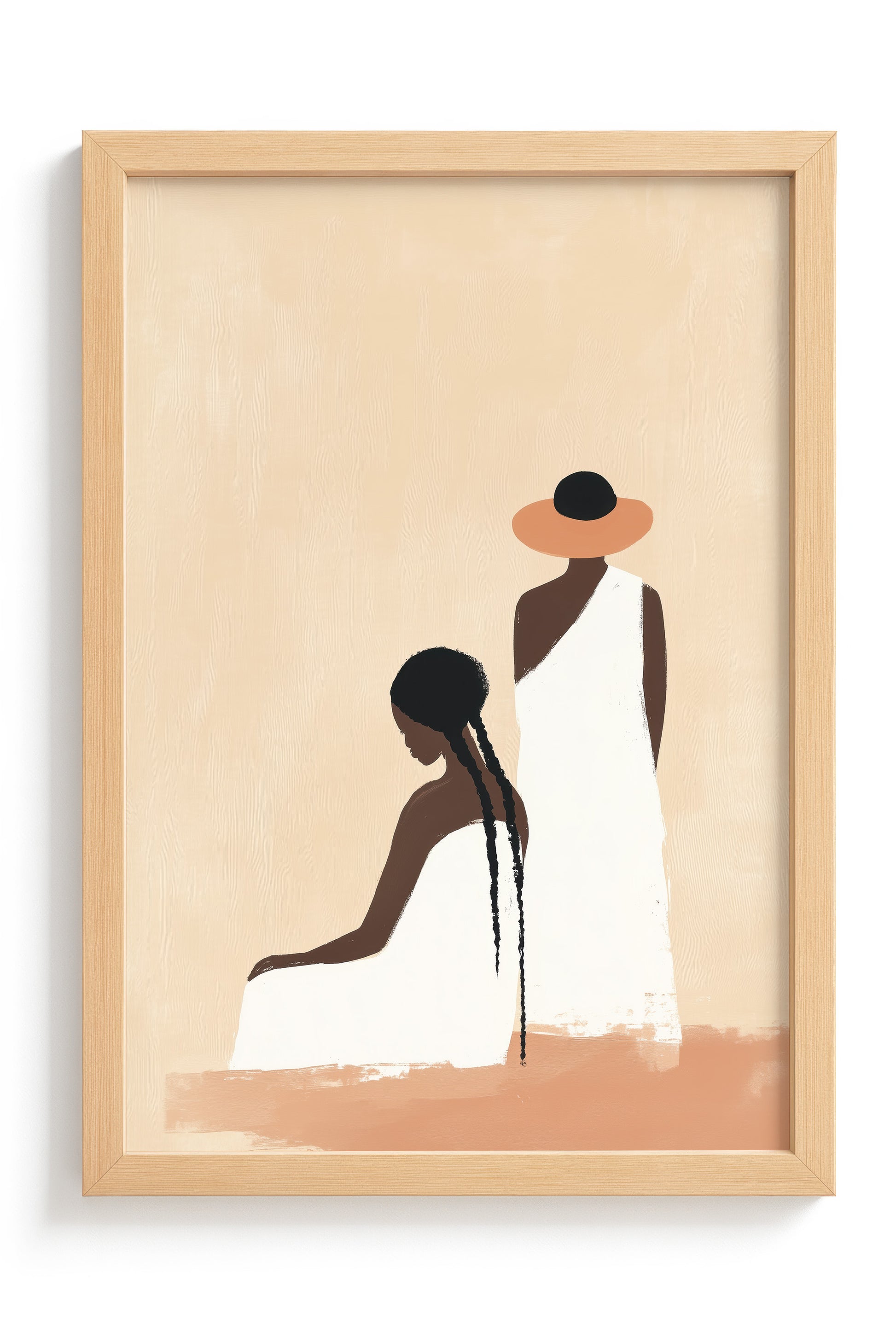 This minimalist wall art captures a quiet moment between two women—one seated in contemplation, the other standing in serene stillness. Rendered in warm, earthy tones with soft white garments and abstract brush textures, the piece evokes sisterhood, reflection, and quiet grace.