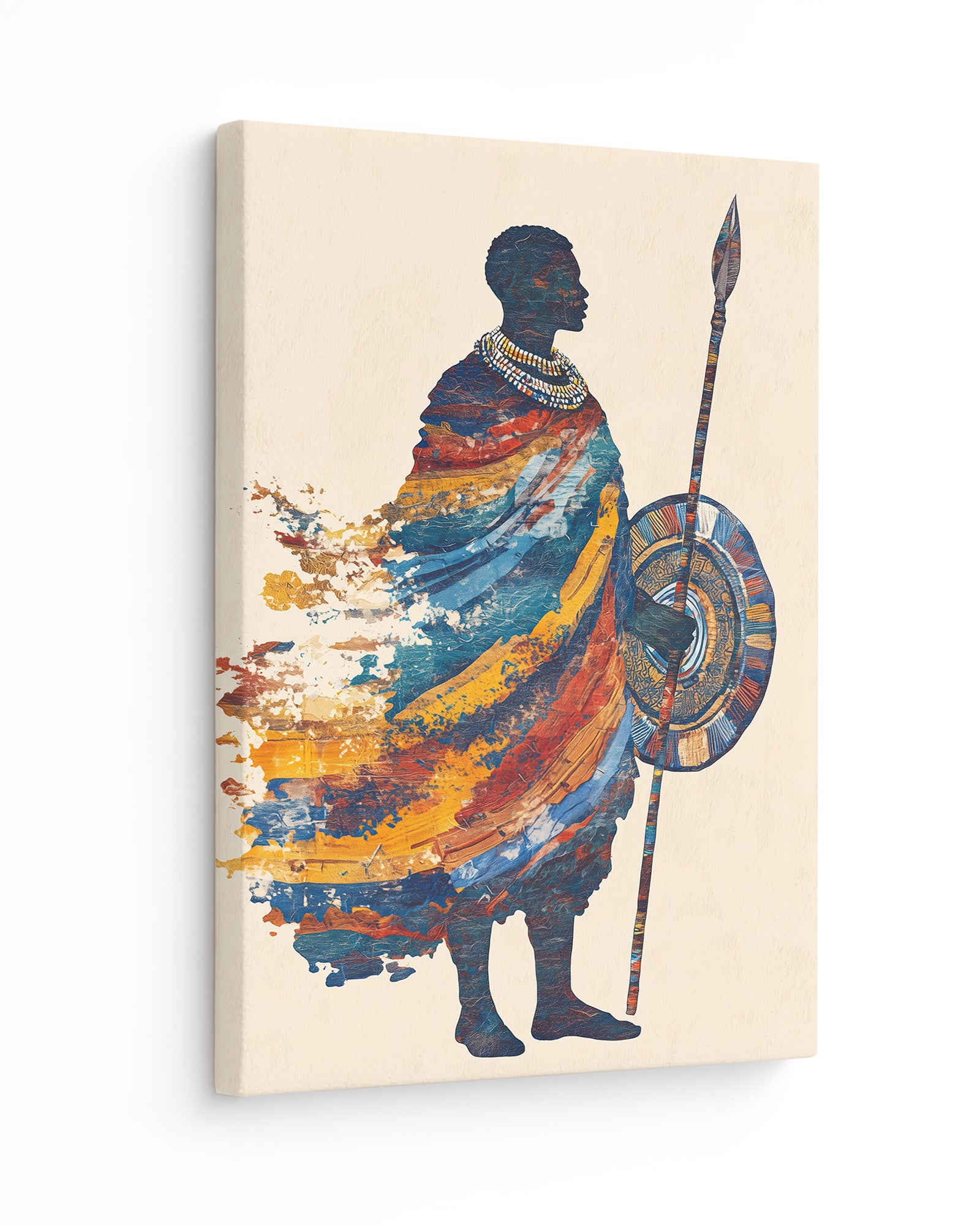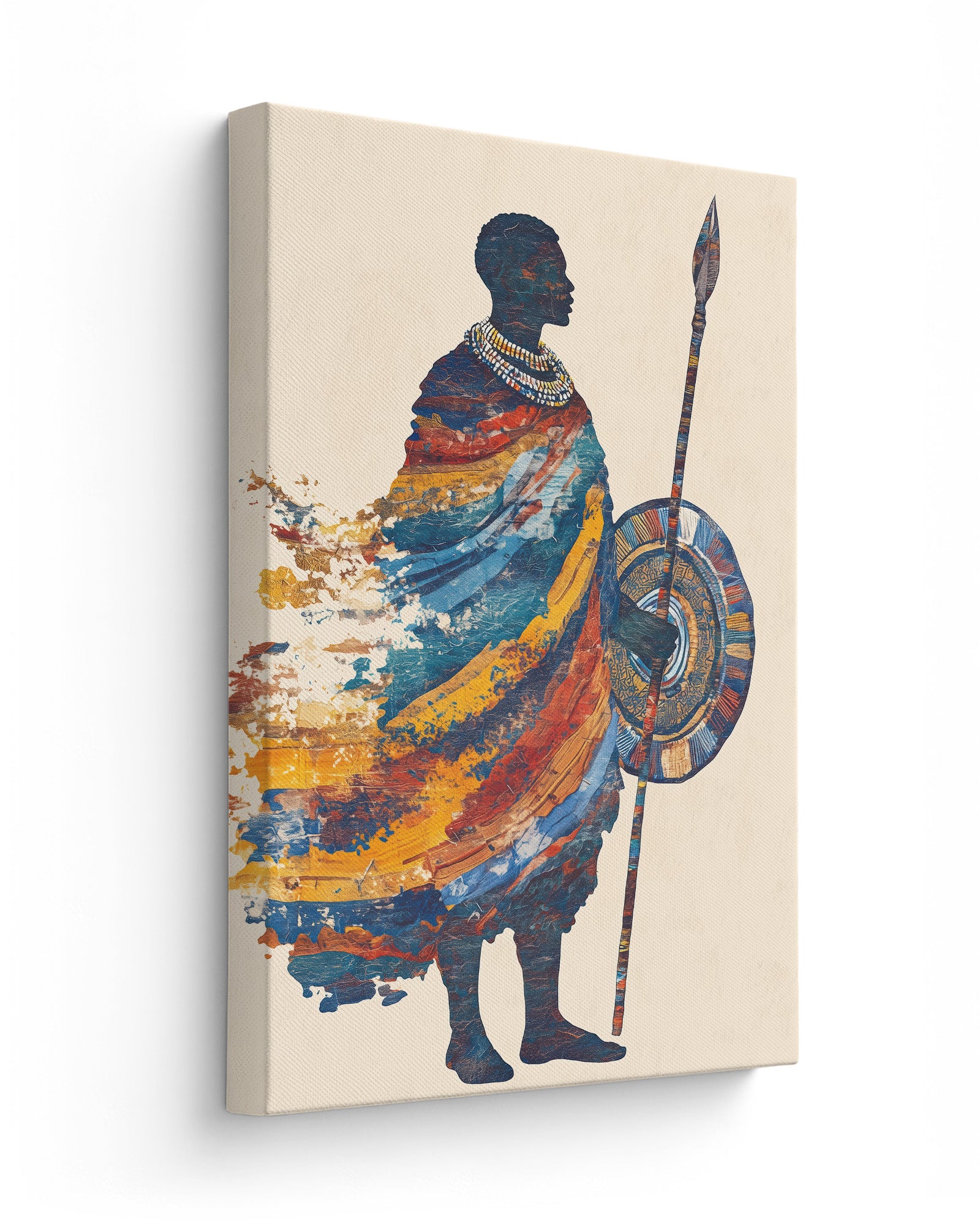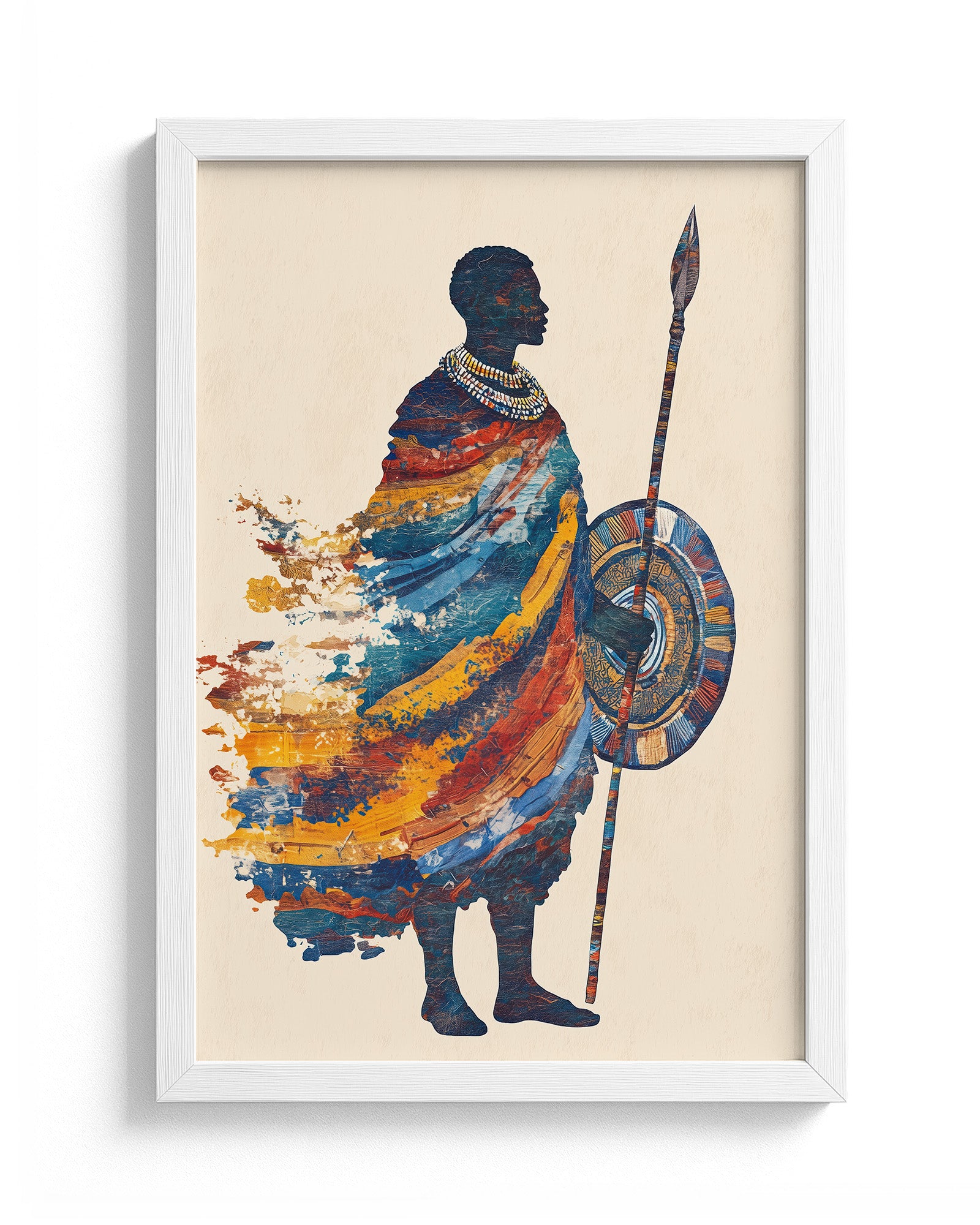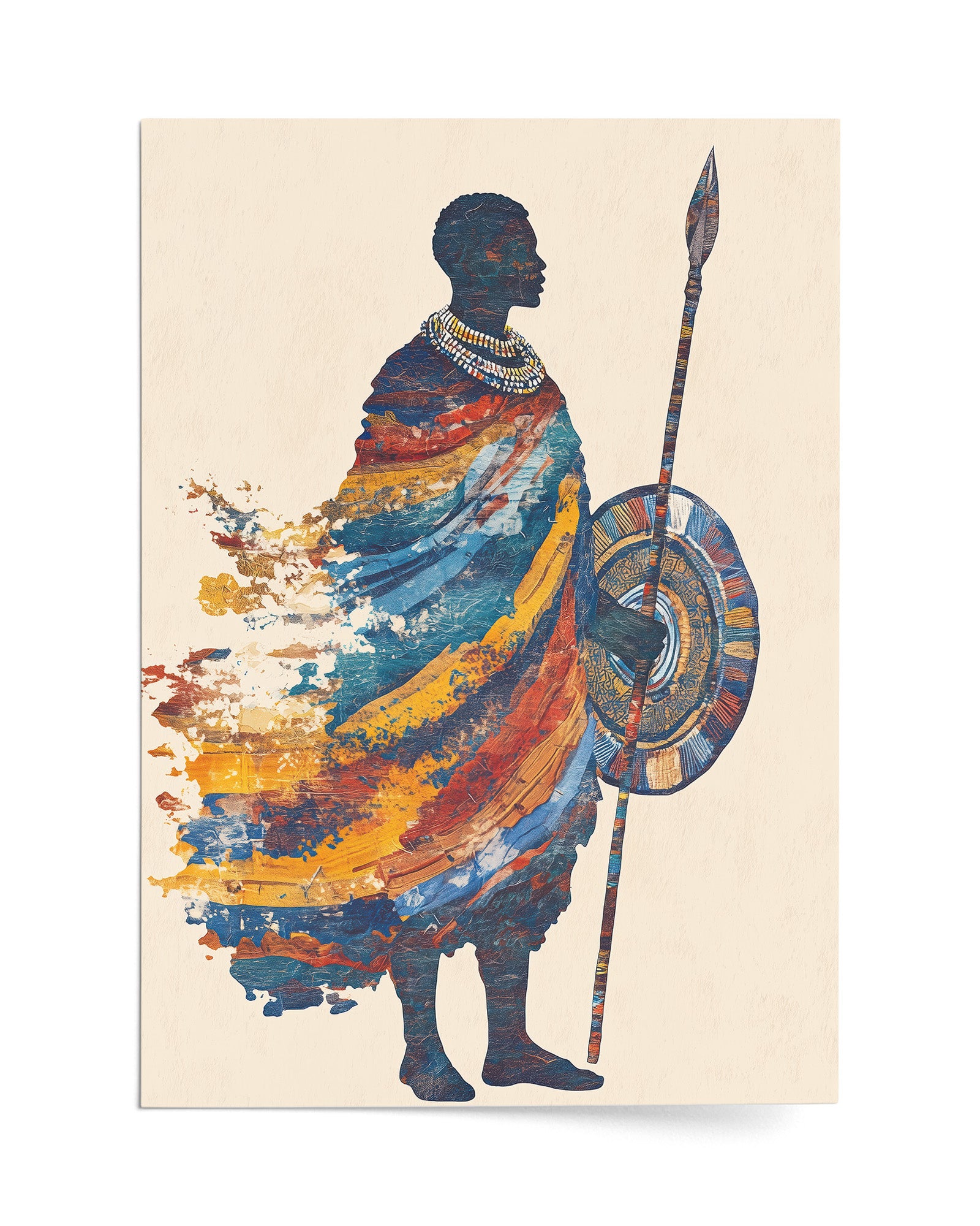 Experience the captivating fusion of culture and cosmos in this stunning artwork. A Zulu warrior, adorned in traditional tribal attire, wields a spear and shield intricately detailed with tribal patterns. Surrounding him are dynamic, abstract swirls of colour symbolising earth, wind, and fire.