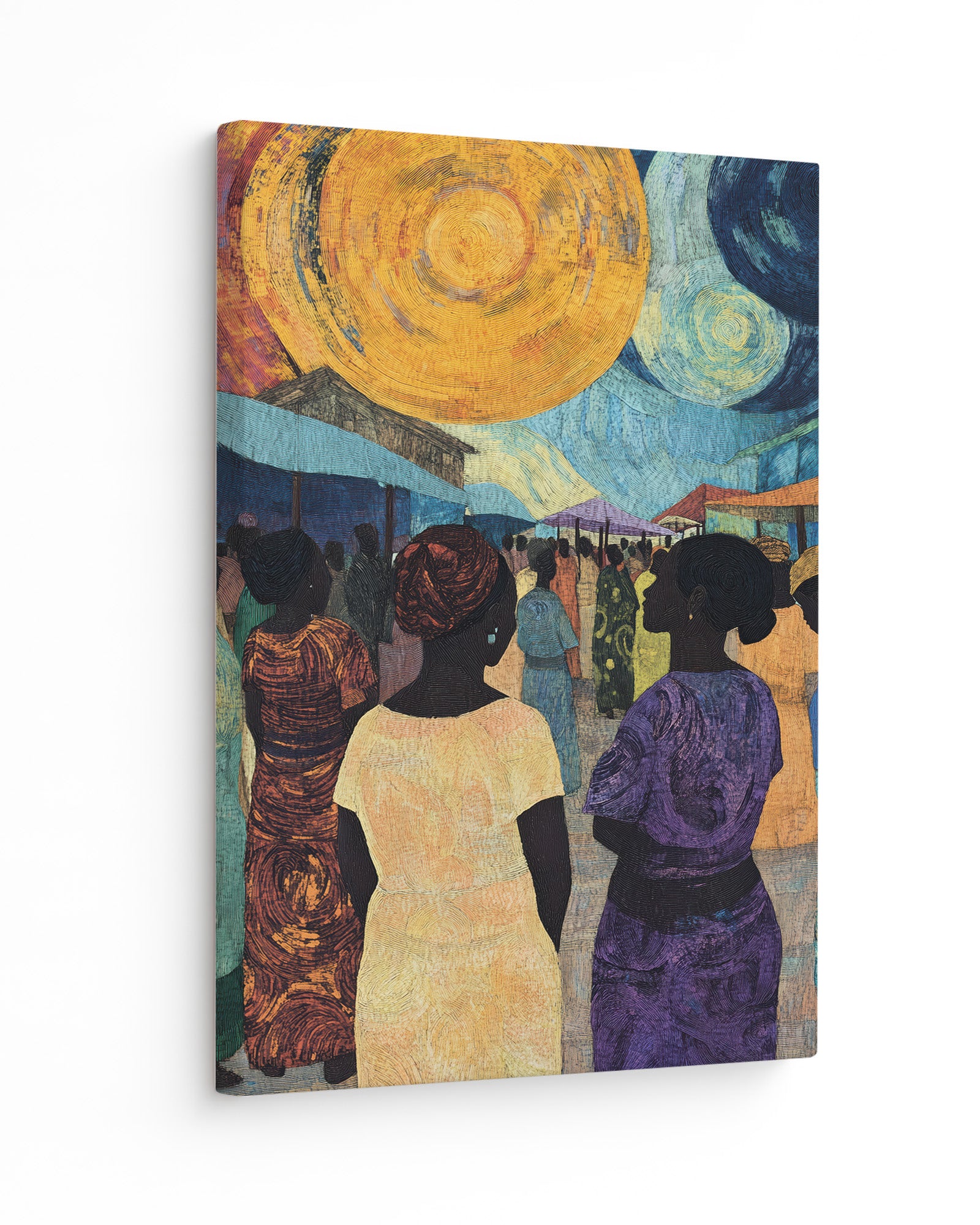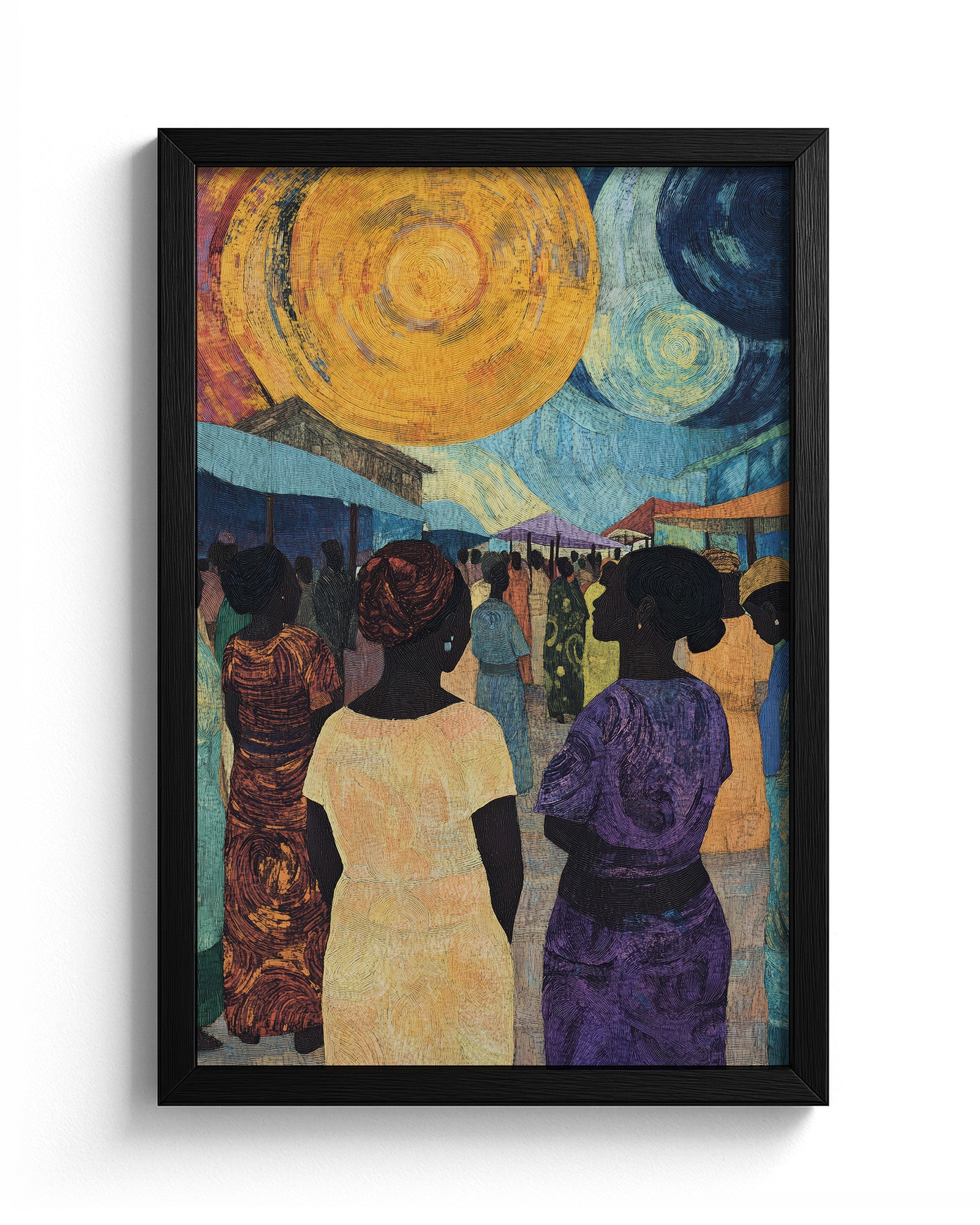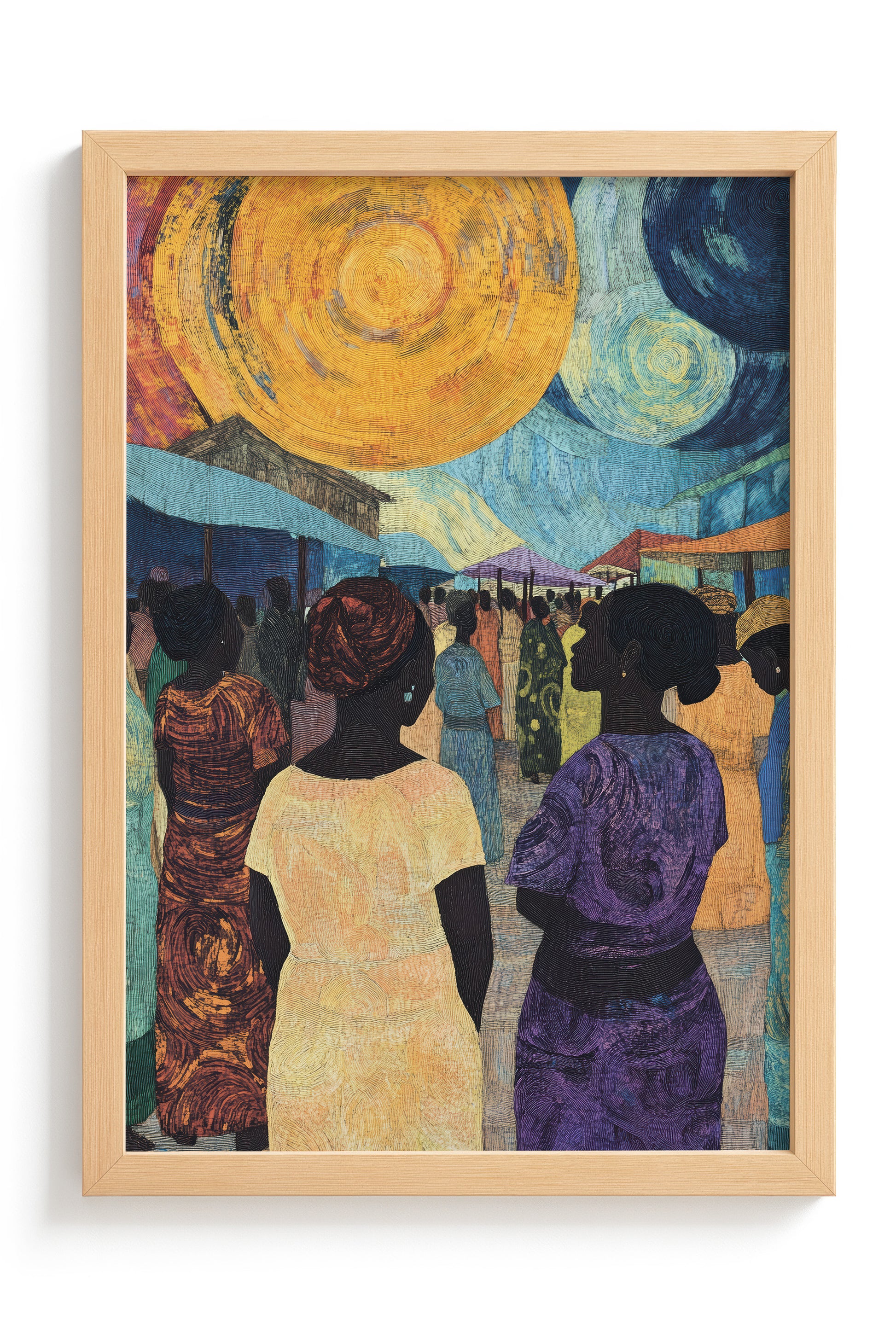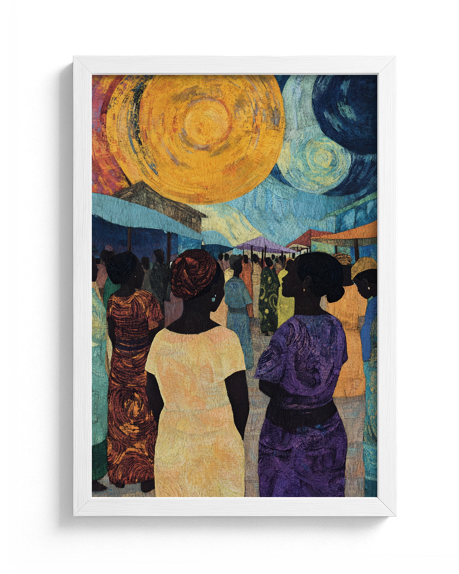 Step into the vibrant energy of an African market scene. Stalls brimming with fruits, fabrics, and pottery come alive under warm golden tones.