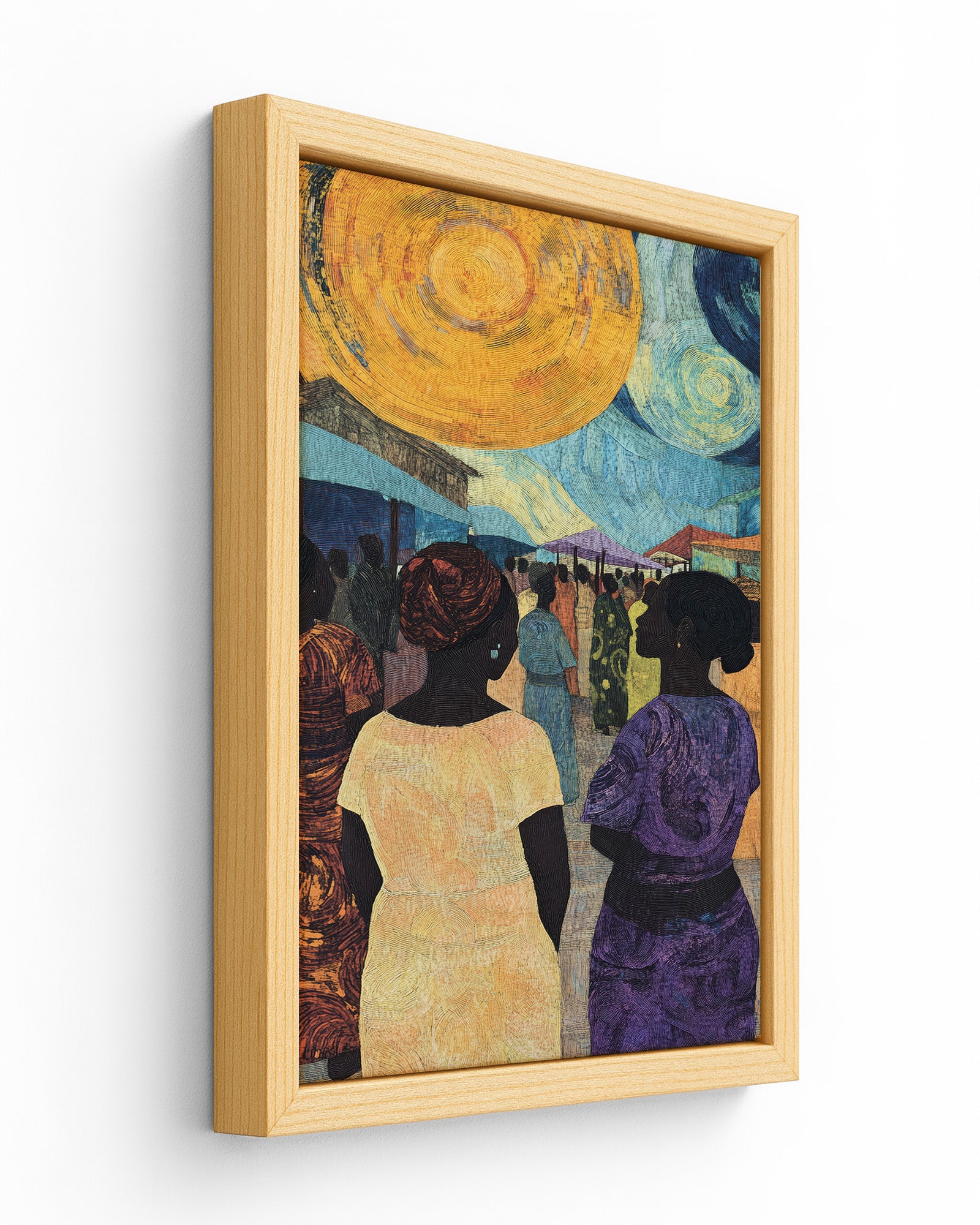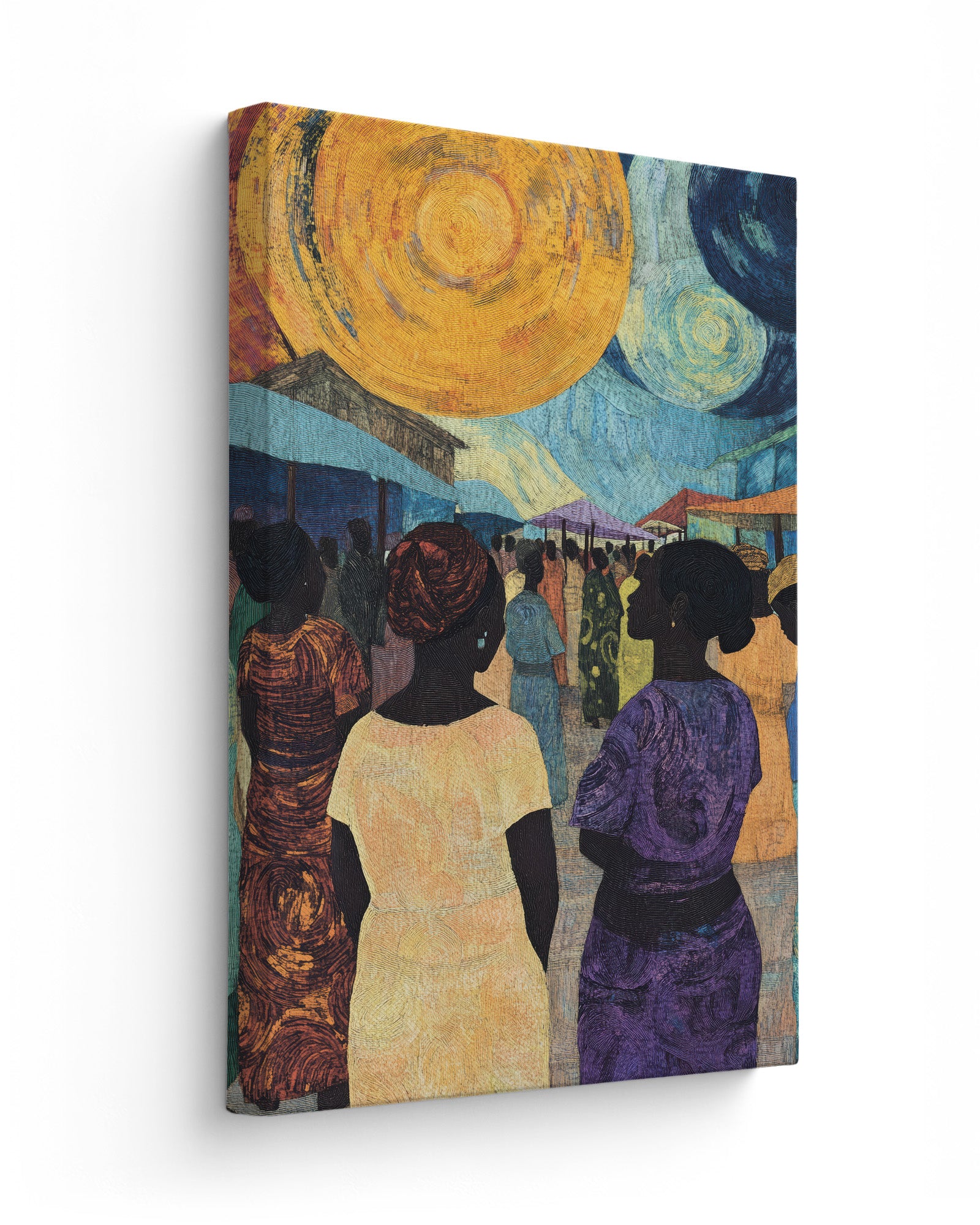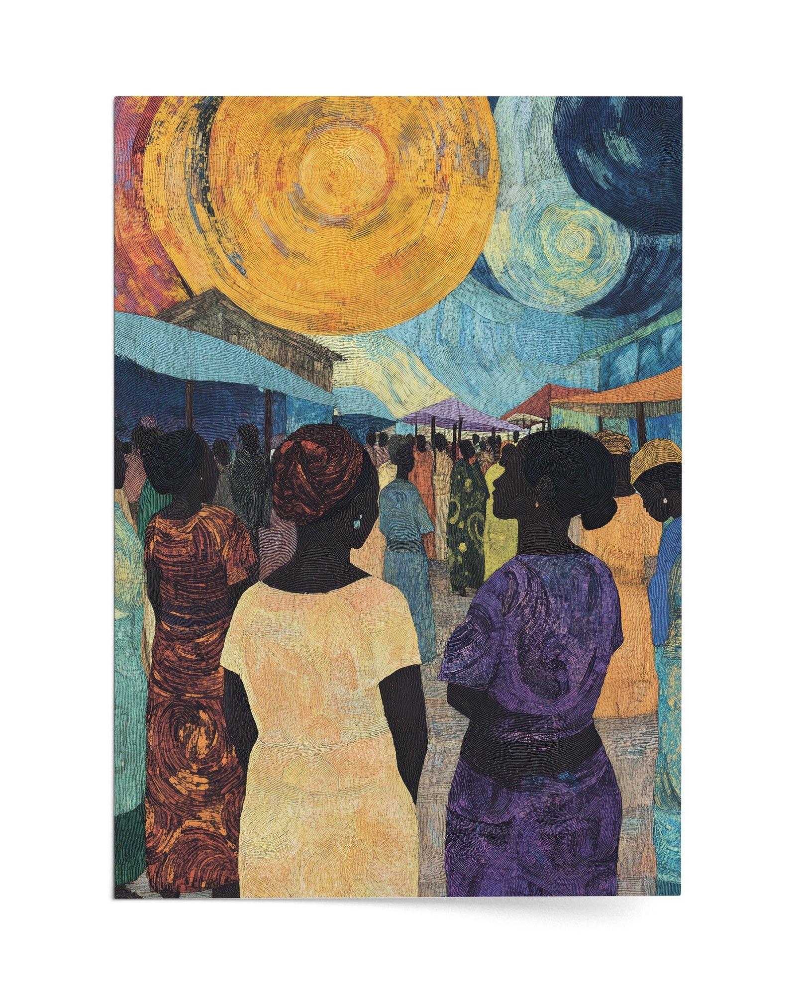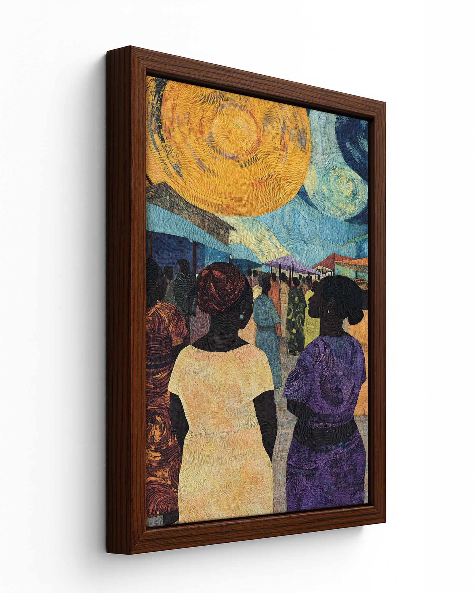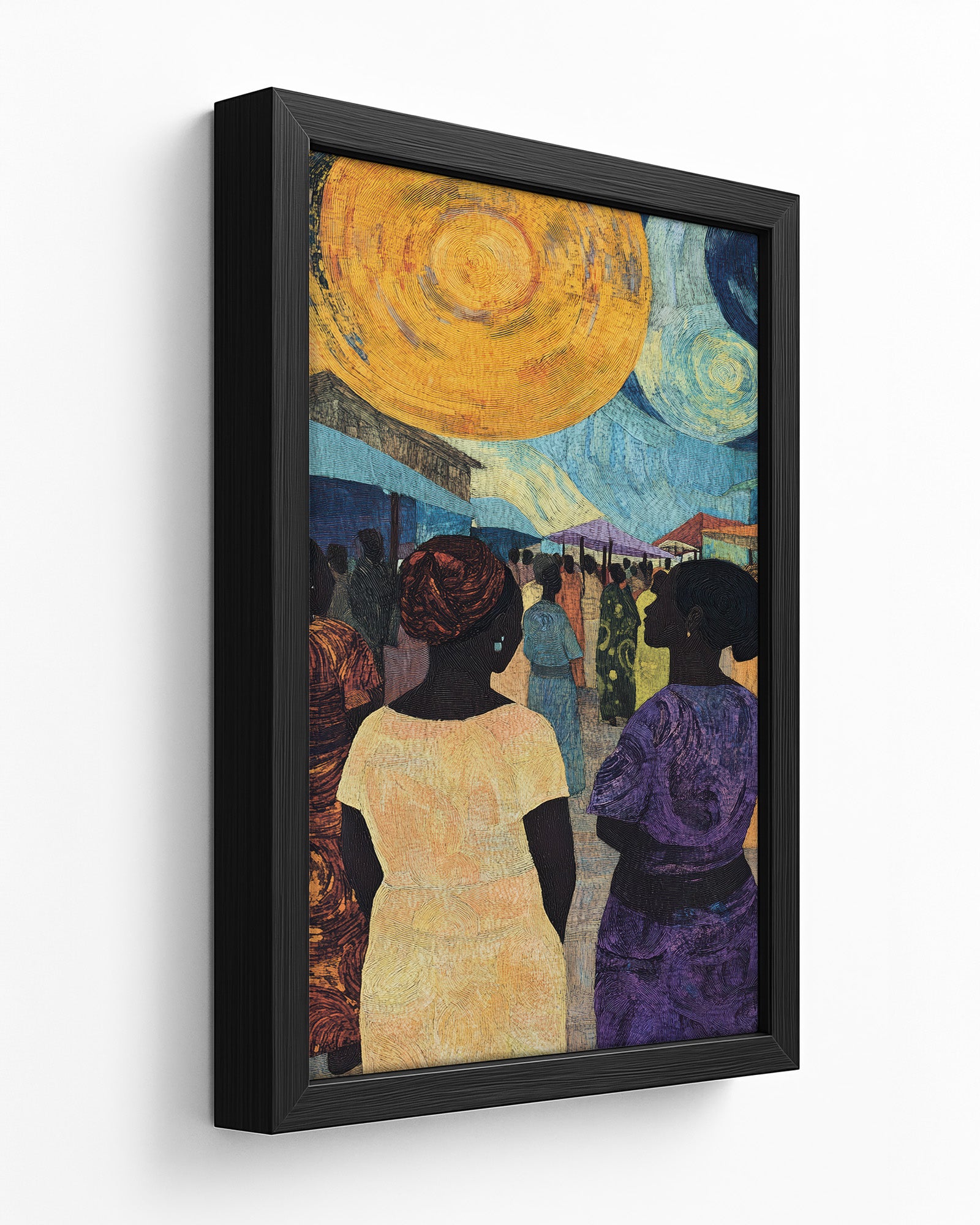 Step into the vibrant energy of an African market scene. Stalls brimming with fruits, fabrics, and pottery come alive under warm golden tones.