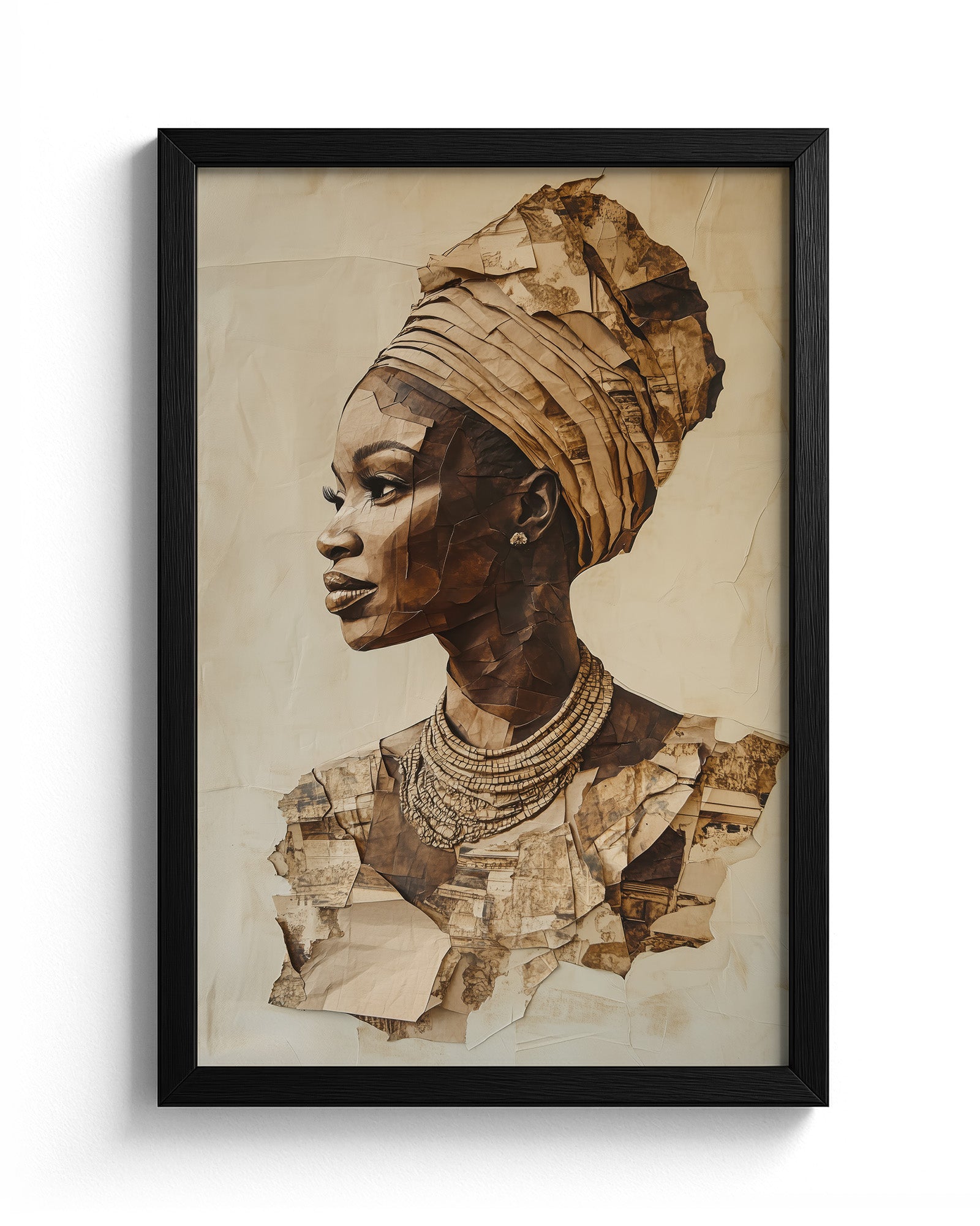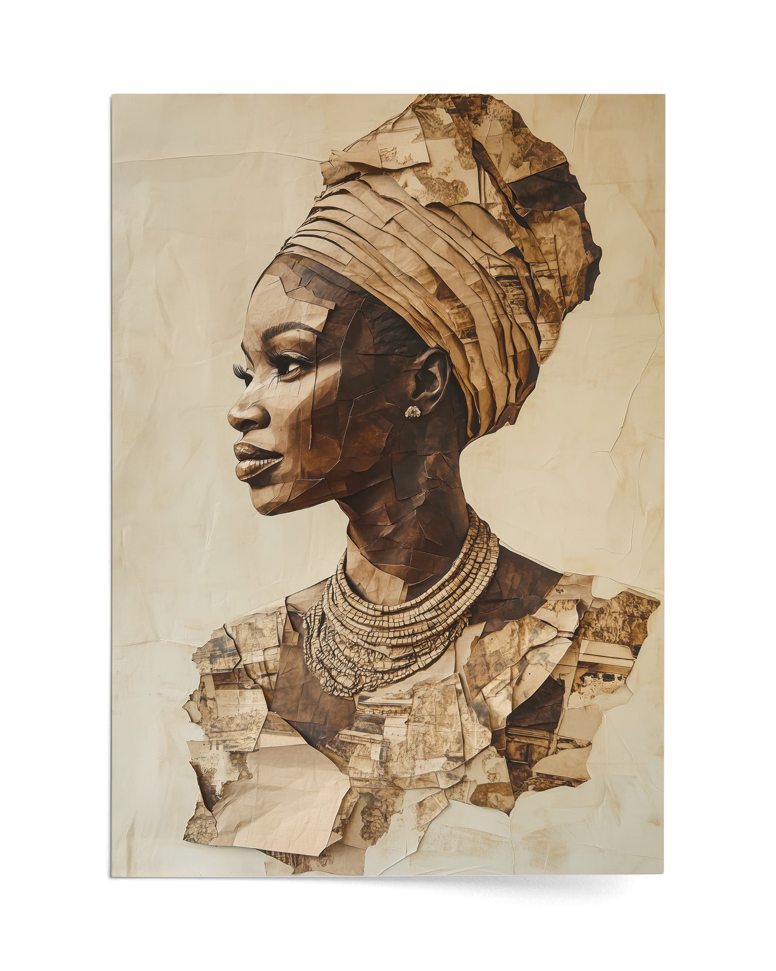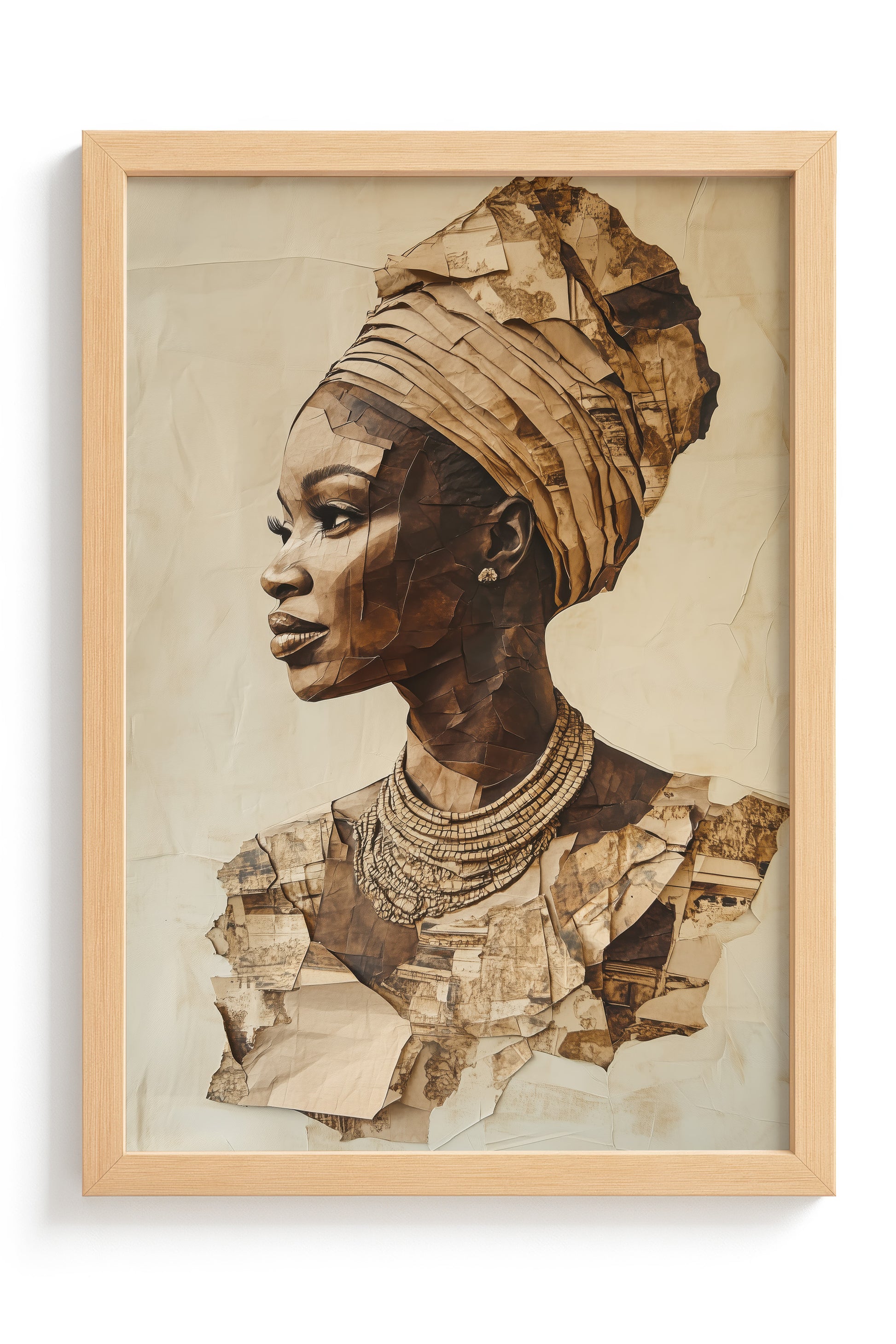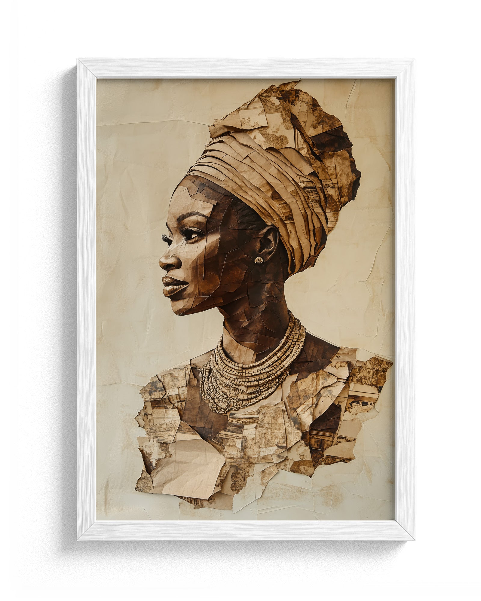 A breathtaking mixed-media portrait of an African woman, her traditional attire and jewellery crafted entirely from layered, torn papers—each fragment a whisper of heritage. Against a warm beige canvas, her dark skin and elegantly coiled hair radiate quiet power, transforming scraps into a masterpiece of cultural reverence.