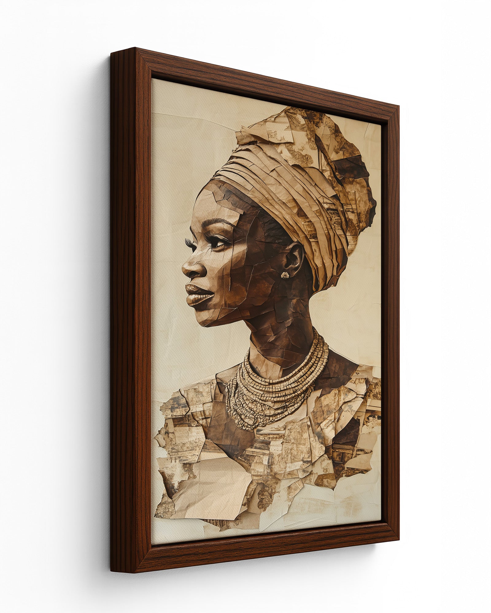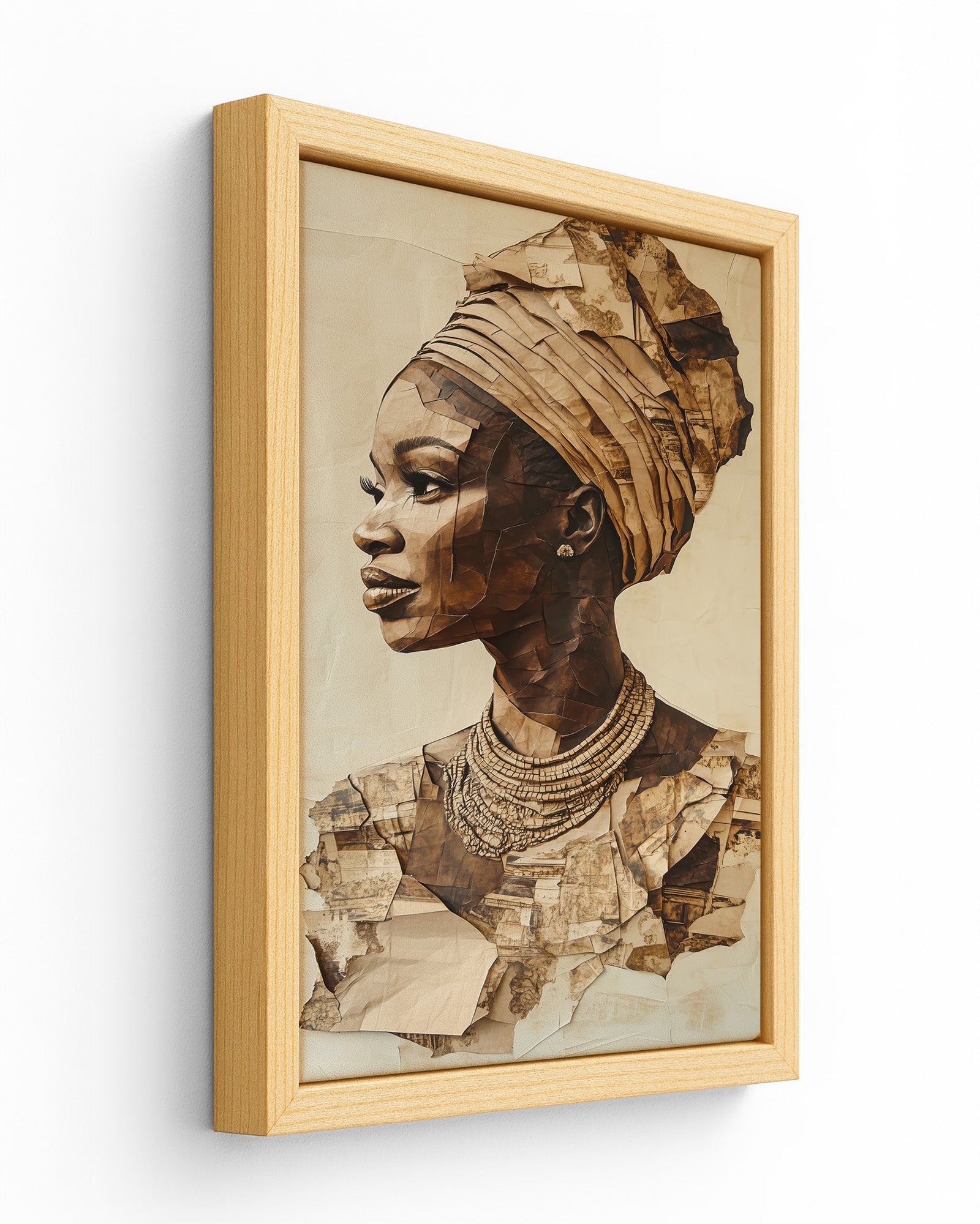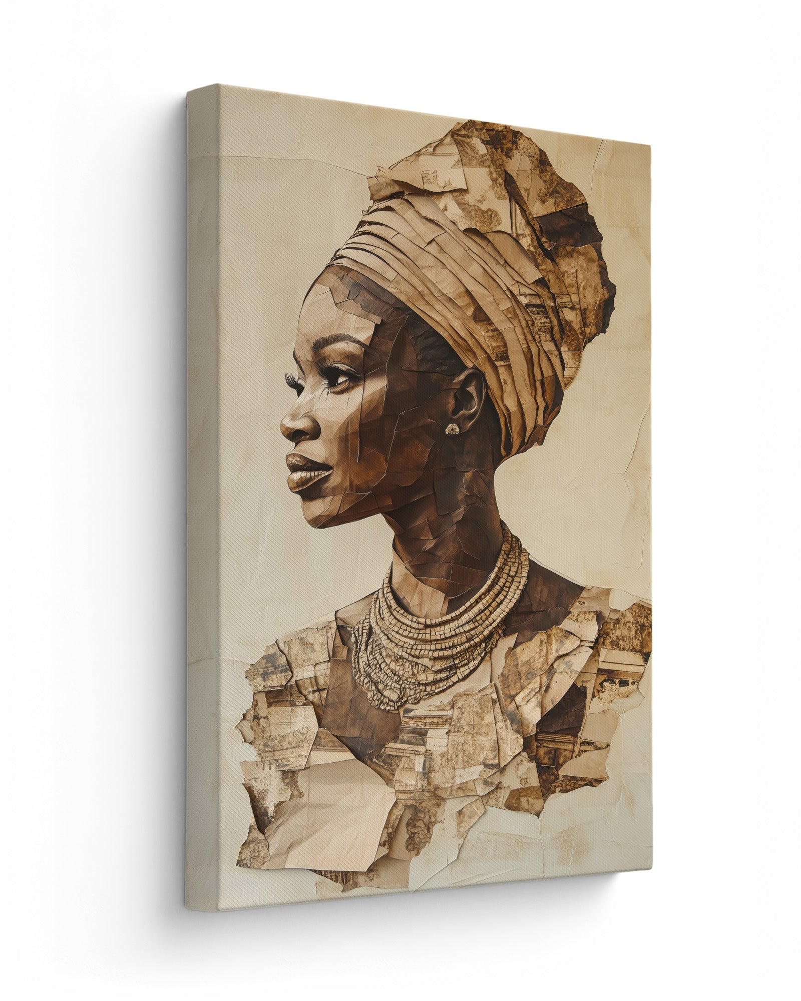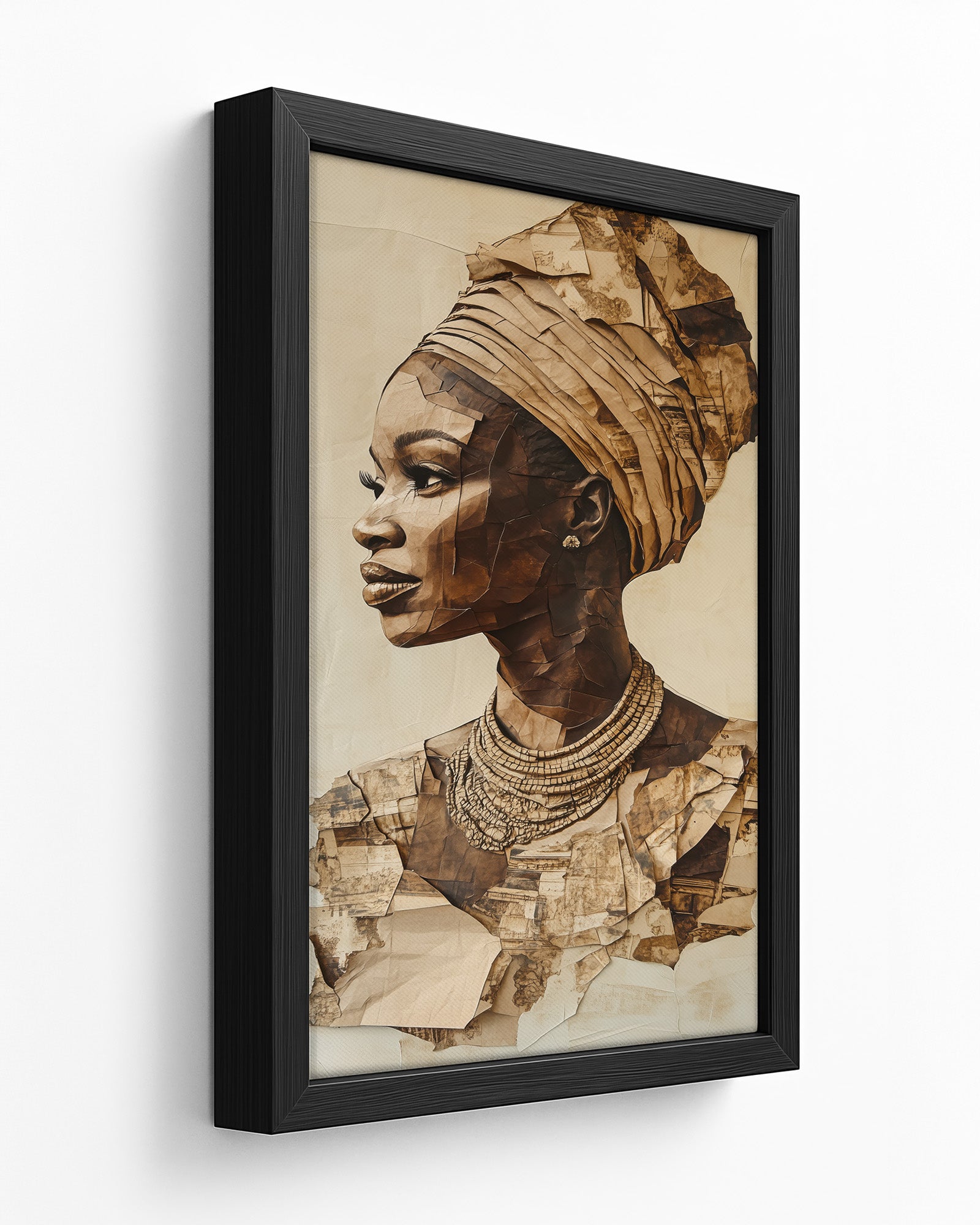 A breathtaking mixed-media portrait of an African woman, her traditional attire and jewellery crafted entirely from layered, torn papers—each fragment a whisper of heritage. Against a warm beige canvas, her dark skin and elegantly coiled hair radiate quiet power, transforming scraps into a masterpiece of cultural reverence.