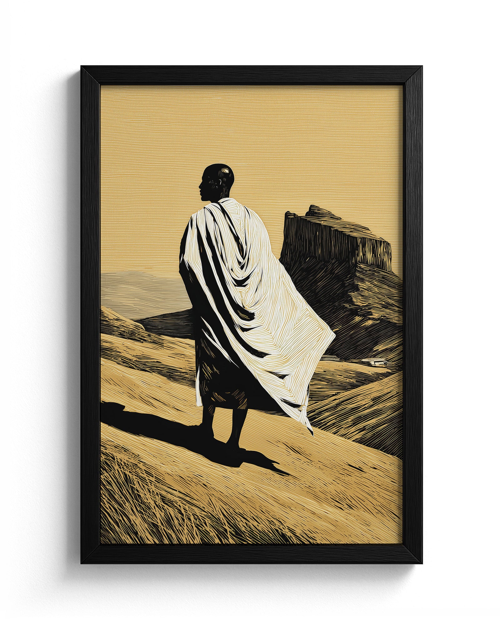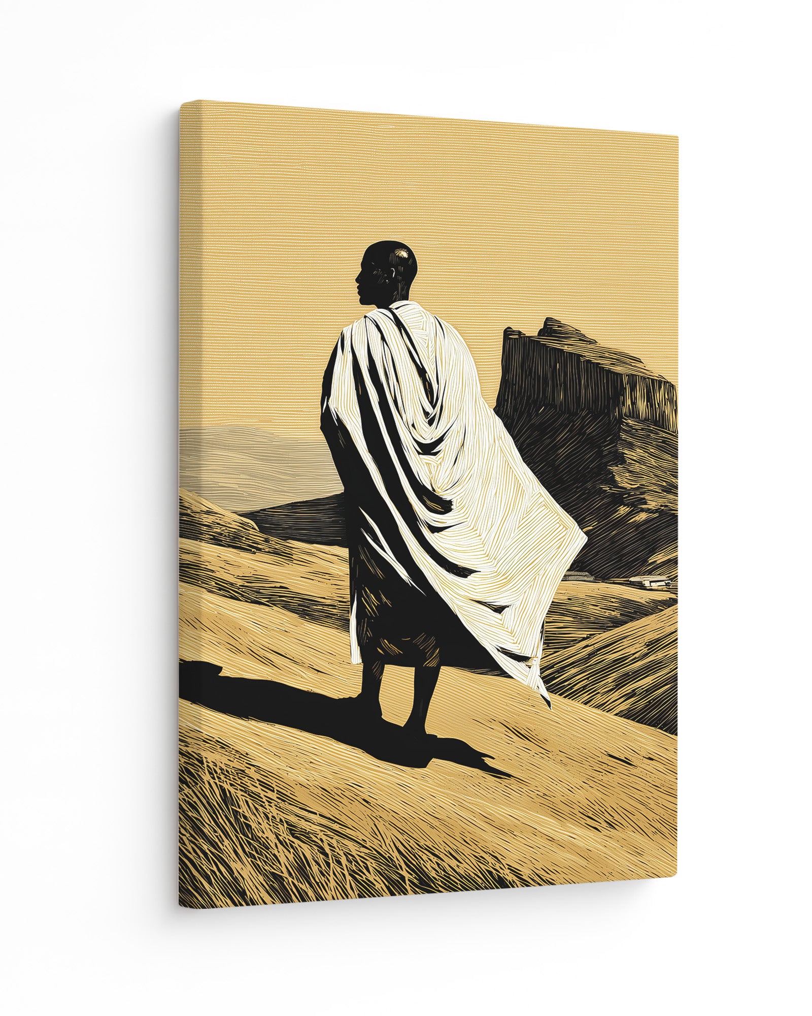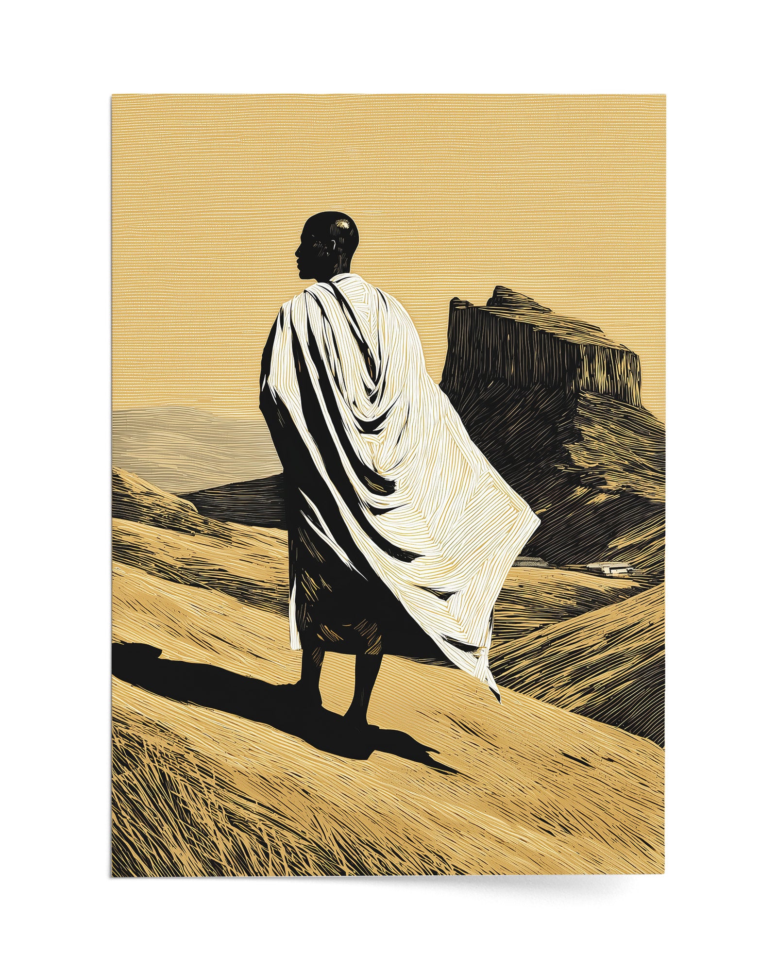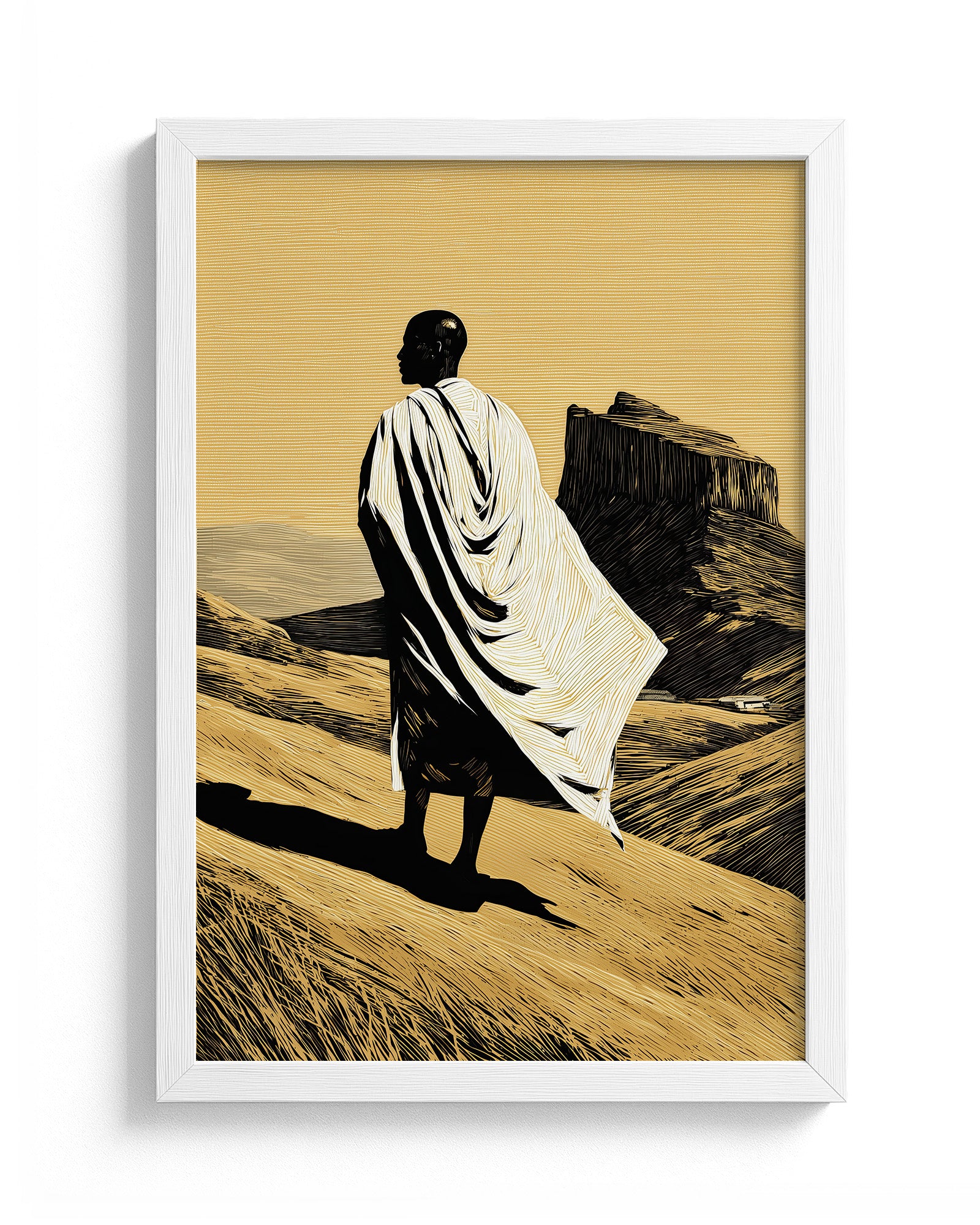 This artwork portrays a solitary figure standing within the vast Ethiopian highlands, draped in traditional white cloth that echoes the garments commonly worn during pilgrimage and prayer within Ethiopia’s Orthodox Christian tradition. The landscape evokes the rugged beauty of northern Ethiopia, where dramatic plateaus and ancient rock-hewn formations have shaped both the geography and the spiritual identity of the region.