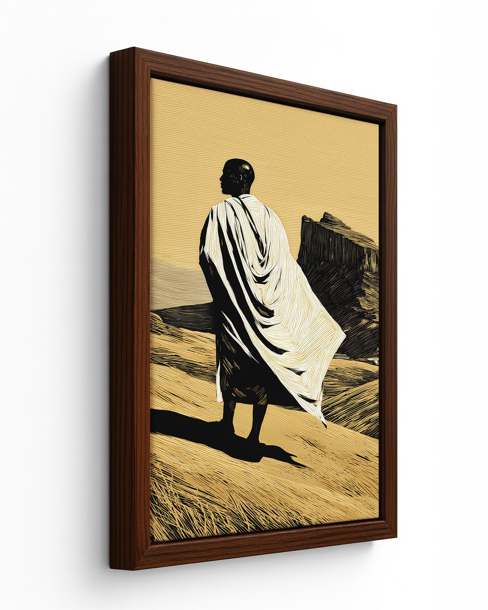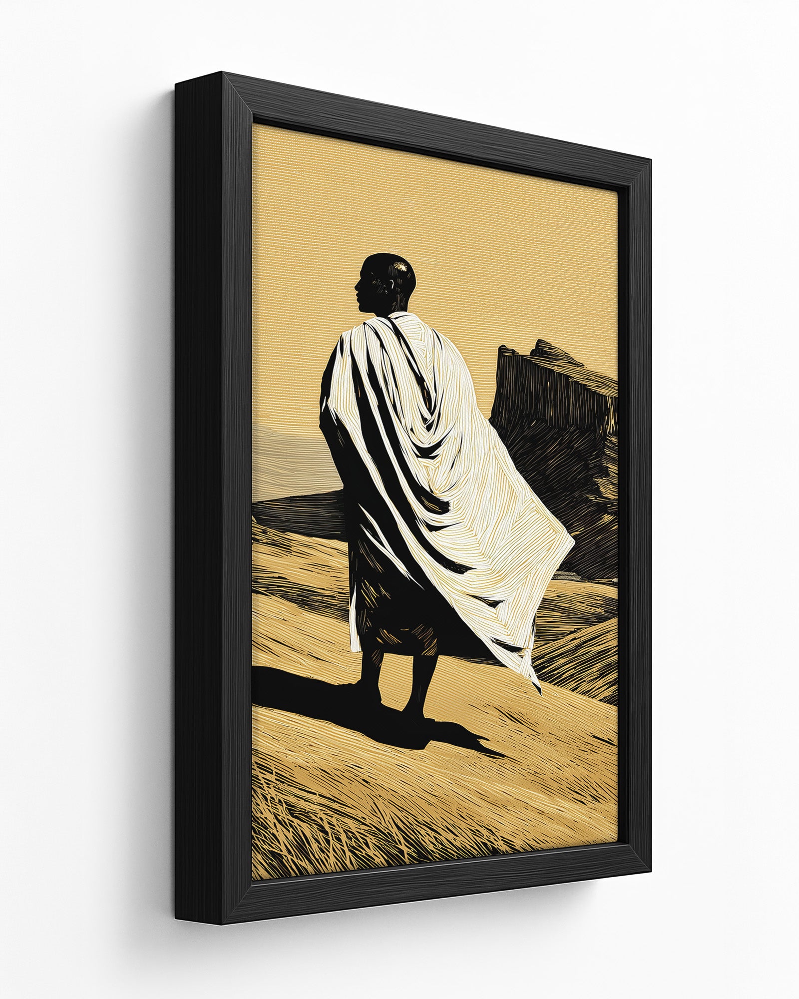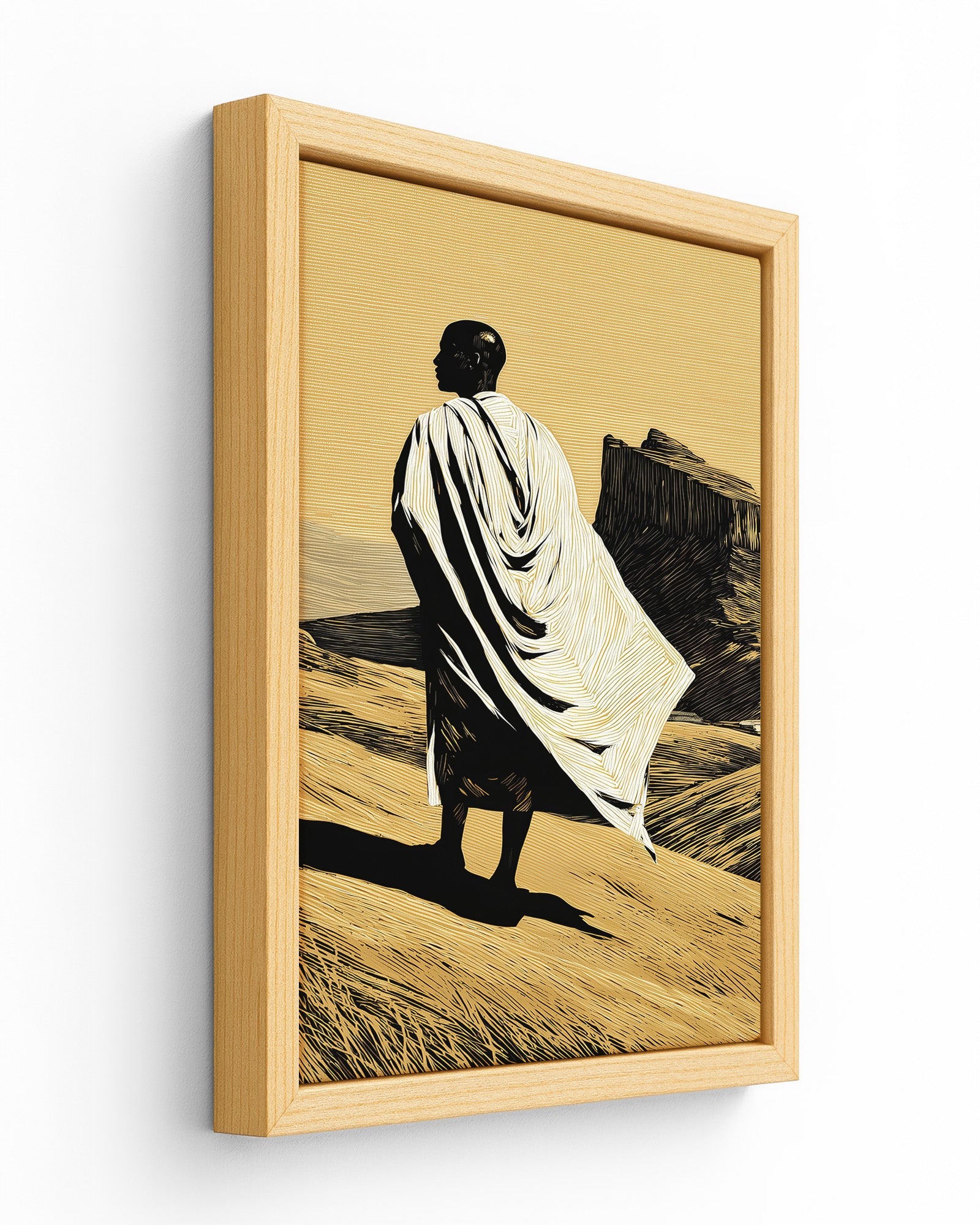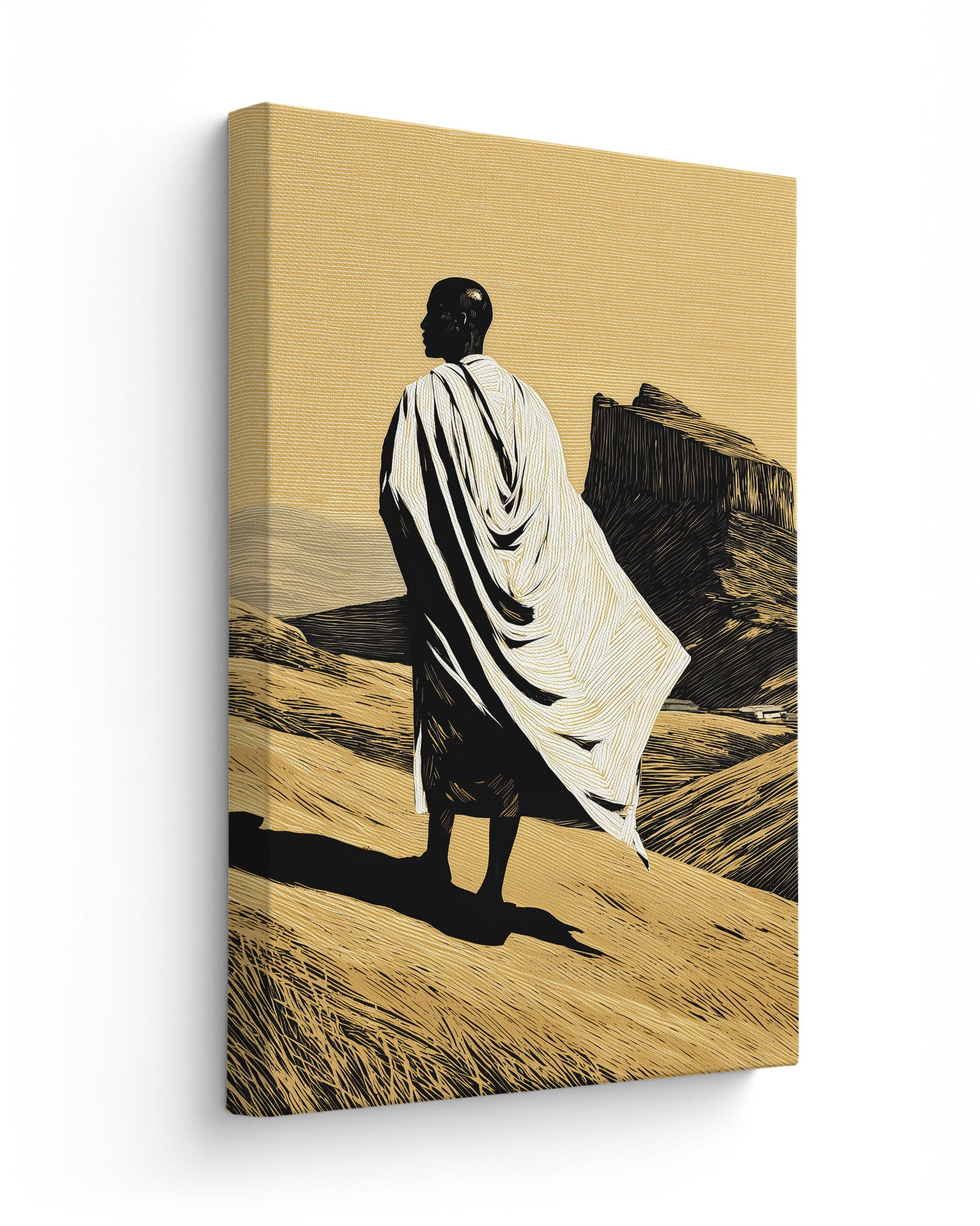 This artwork portrays a solitary figure standing within the vast Ethiopian highlands, draped in traditional white cloth that echoes the garments commonly worn during pilgrimage and prayer within Ethiopia’s Orthodox Christian tradition. The landscape evokes the rugged beauty of northern Ethiopia, where dramatic plateaus and ancient rock-hewn formations have shaped both the geography and the spiritual identity of the region.