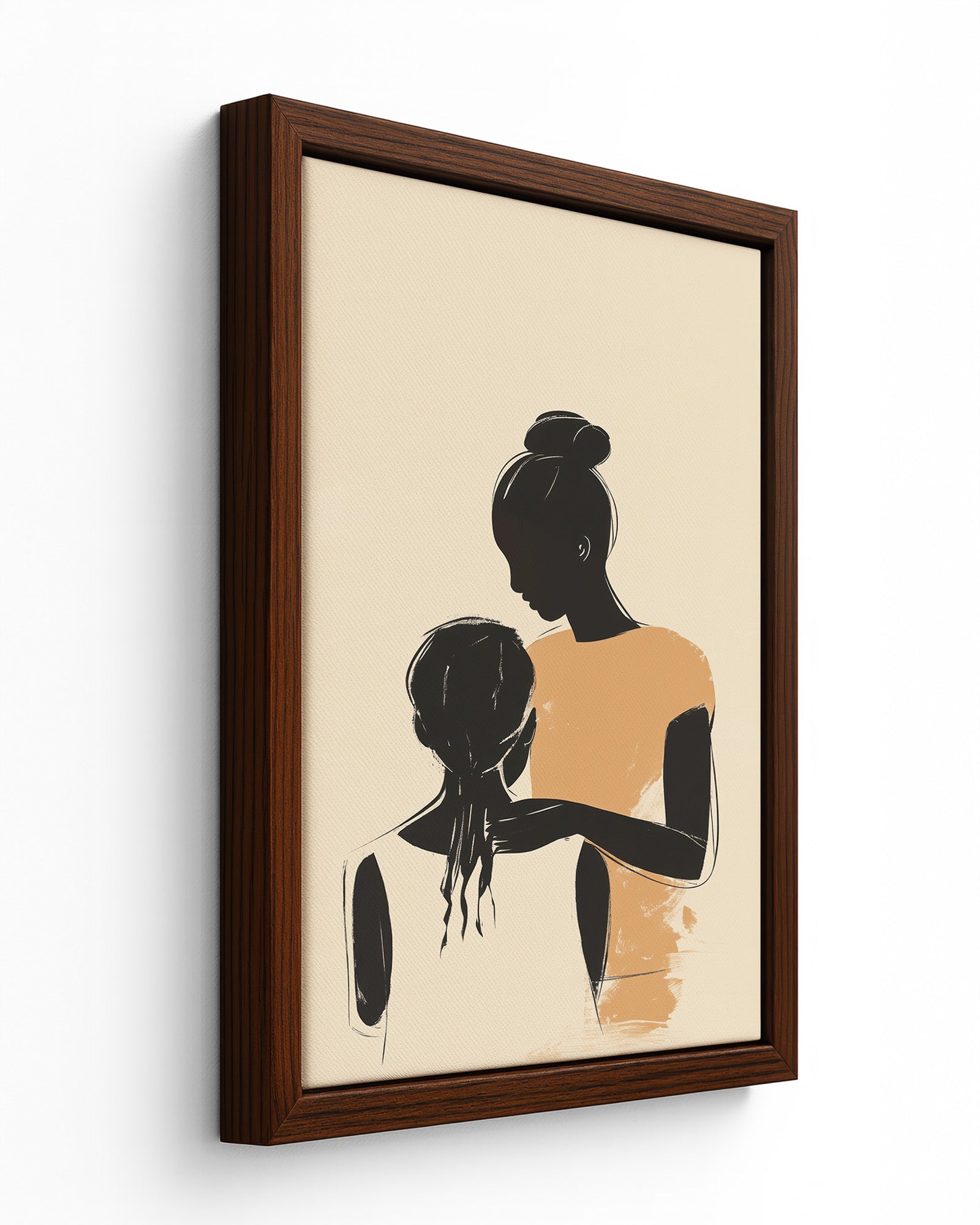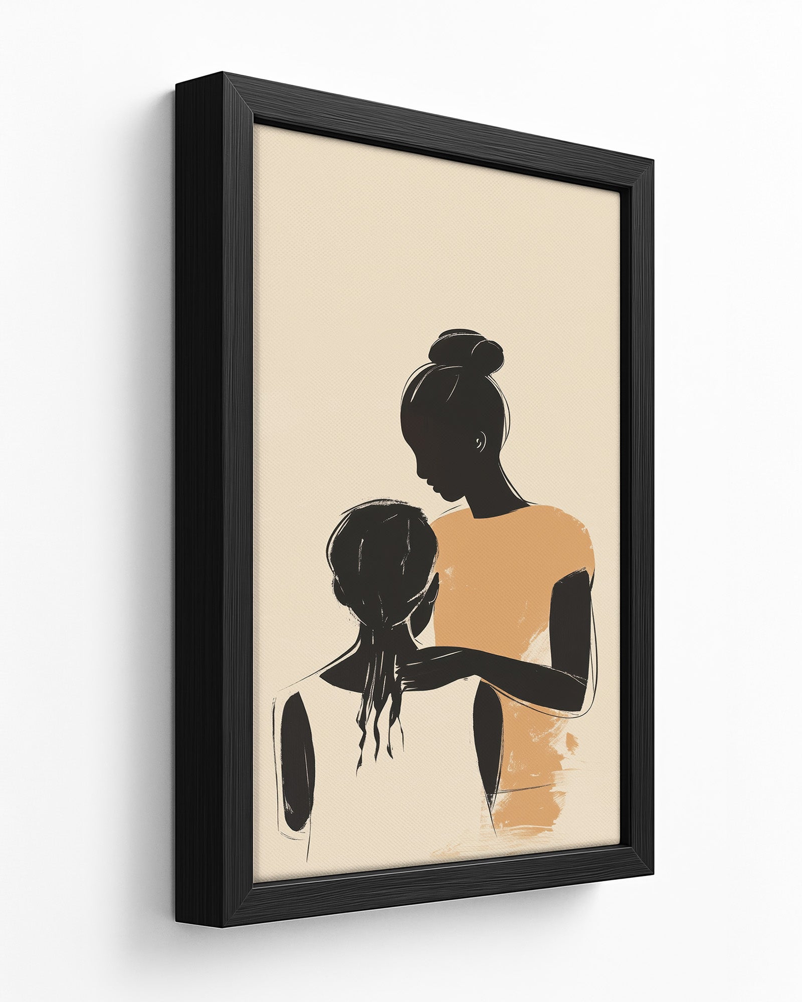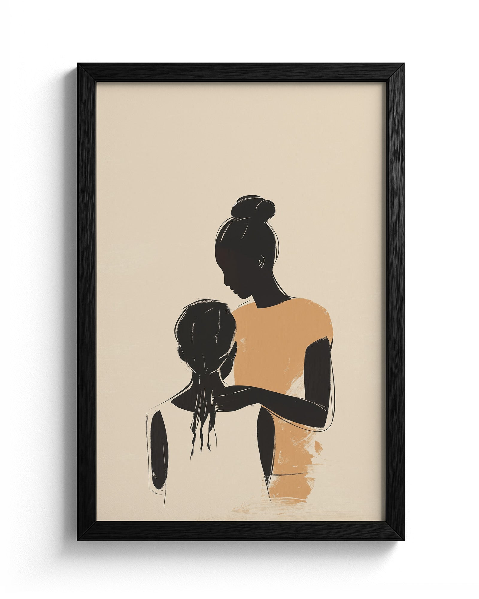 This minimalist artwork captures a quiet, cherished tradition—one woman gently braiding another’s hair, a moment rooted in care, culture, and connection. Painted in soft, earthy tones with elegant linework, the piece reflects generational rituals, patience, and the beauty of nurturing bonds.