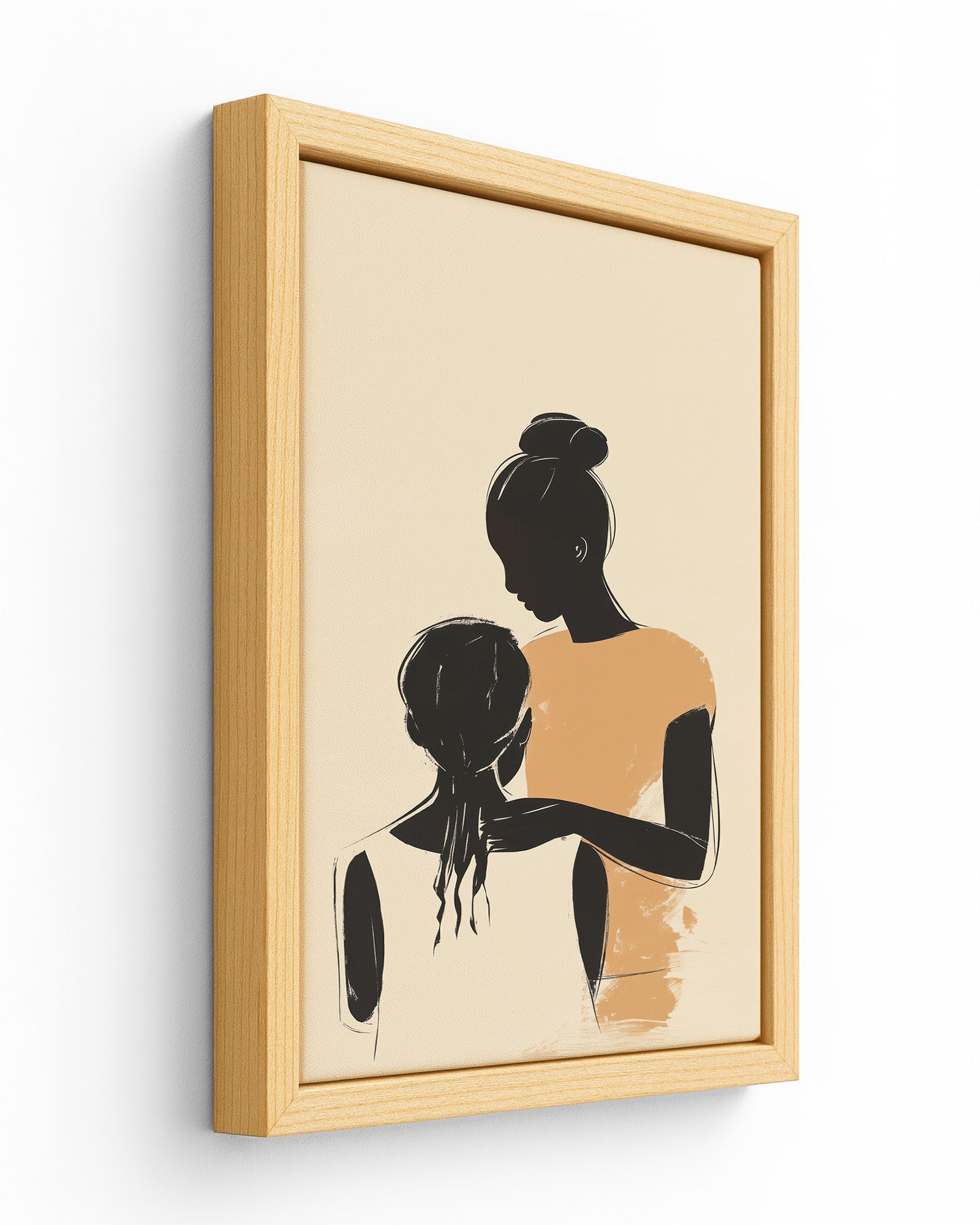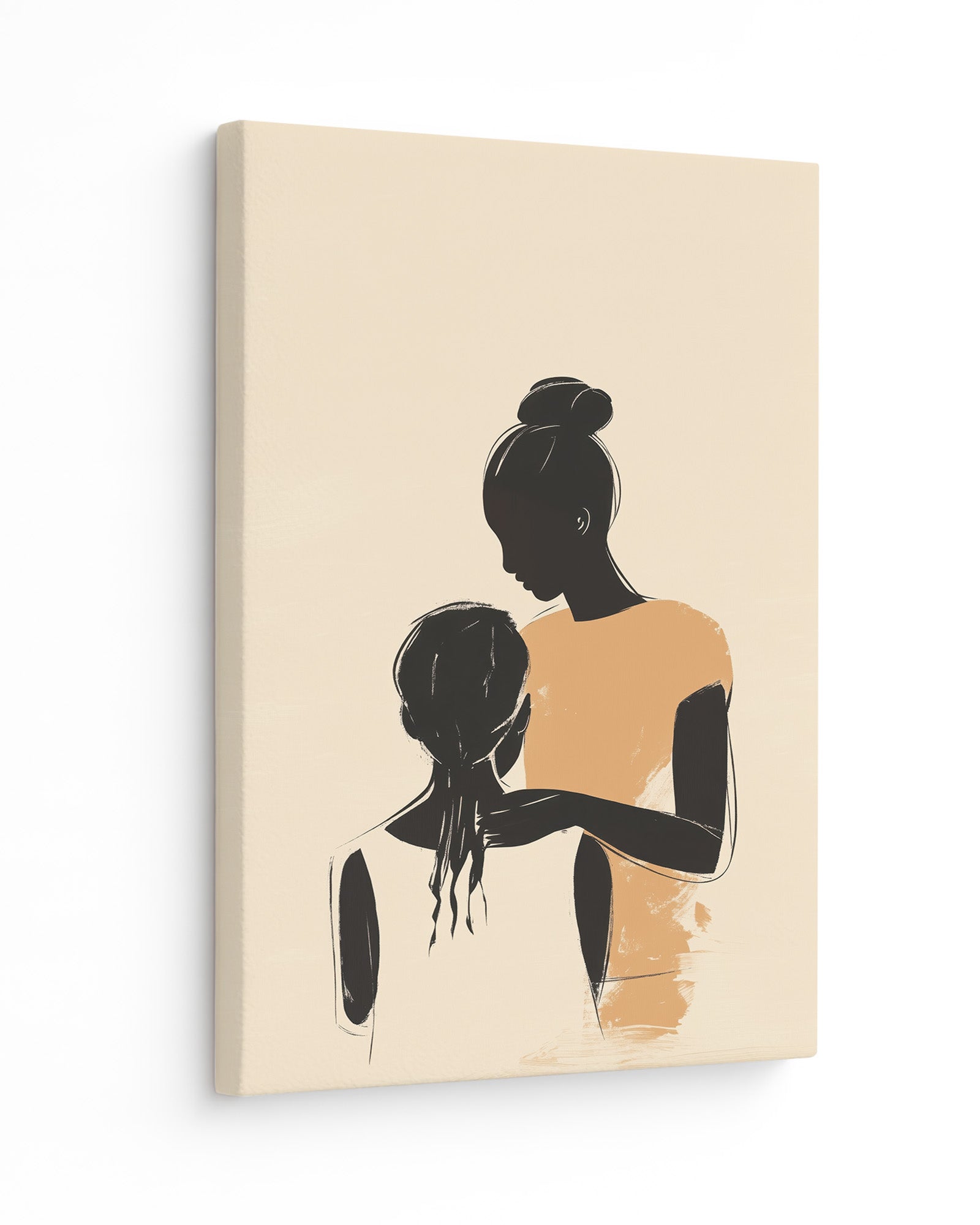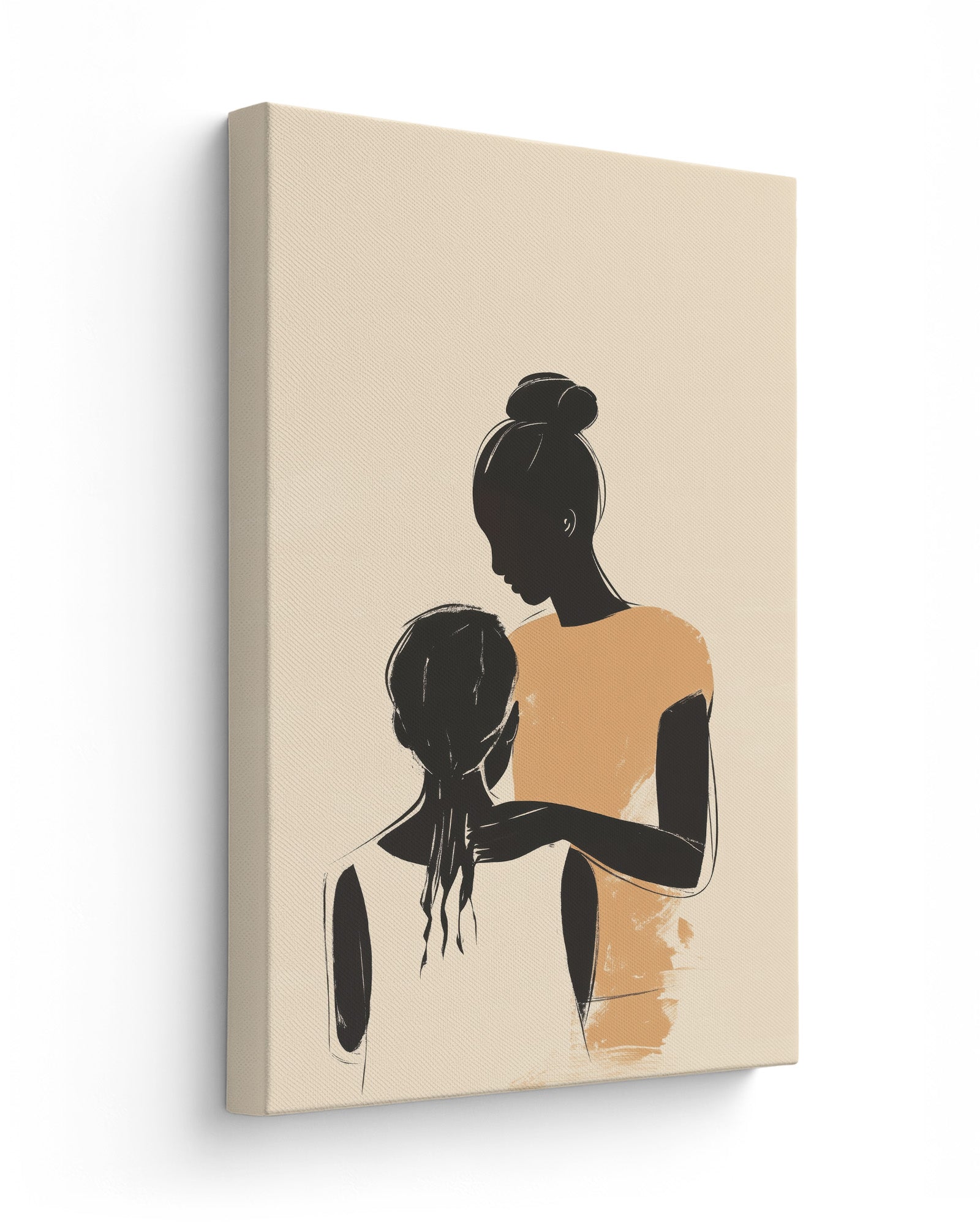 This minimalist artwork captures a quiet, cherished tradition—one woman gently braiding another’s hair, a moment rooted in care, culture, and connection. Painted in soft, earthy tones with elegant linework, the piece reflects generational rituals, patience, and the beauty of nurturing bonds.