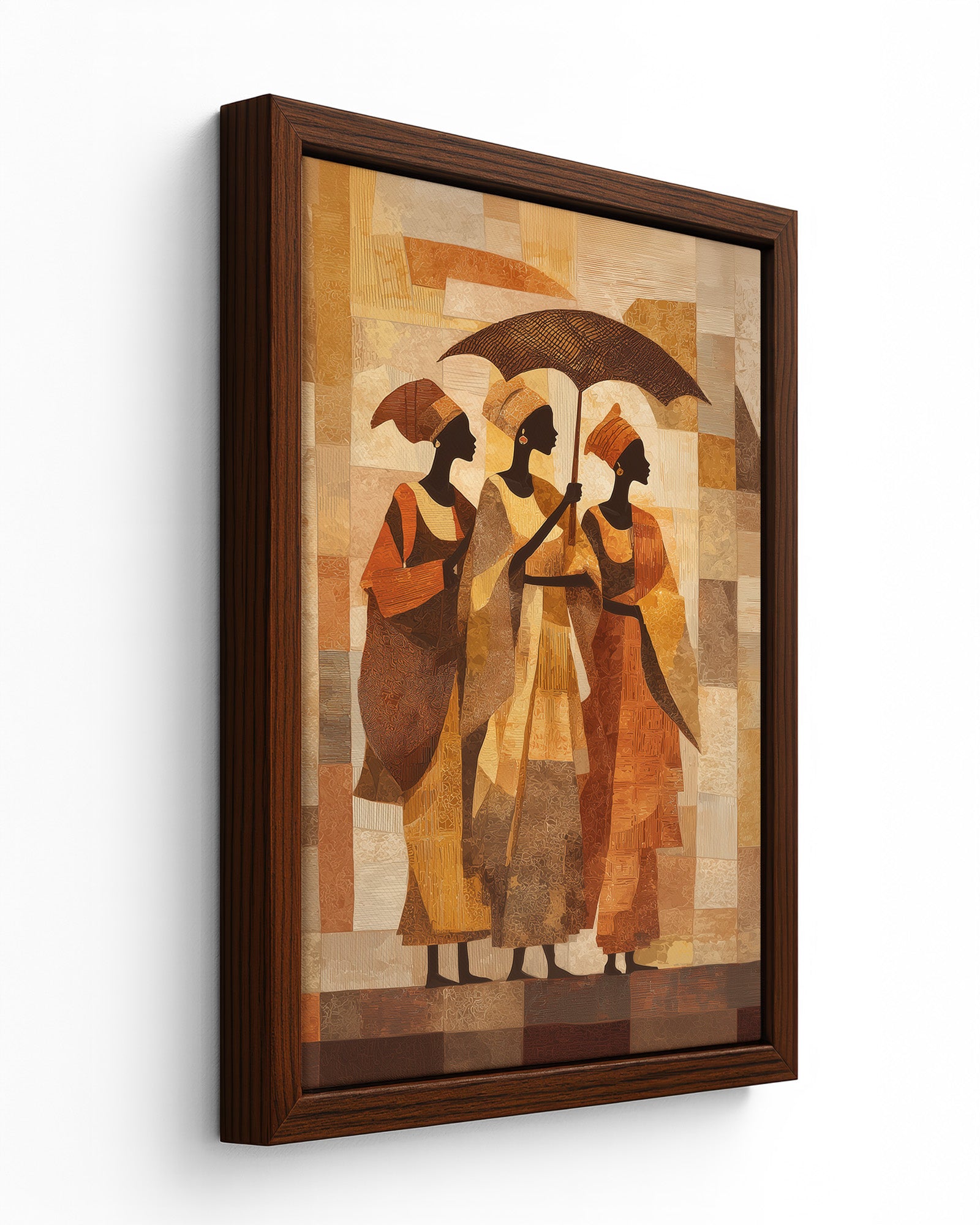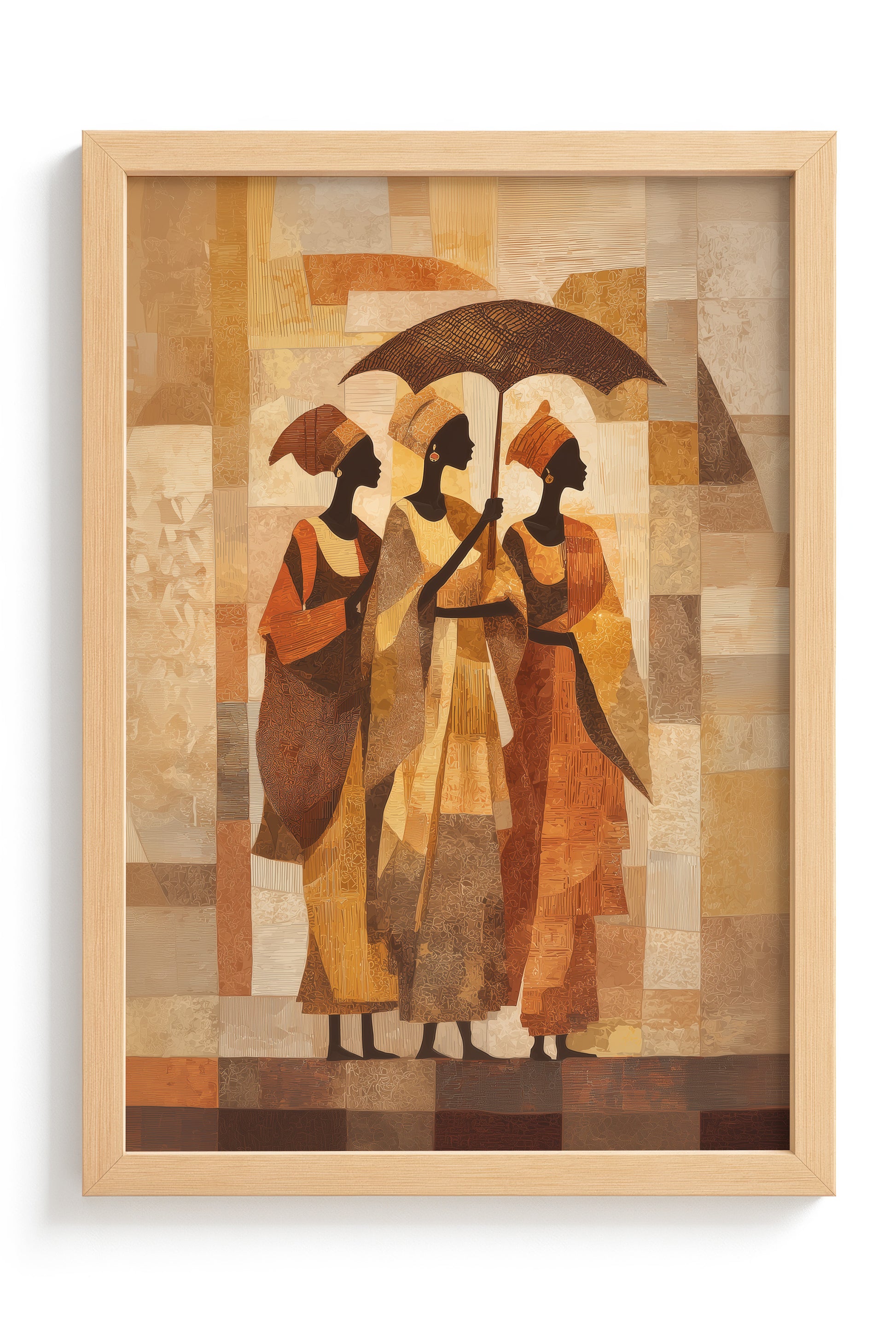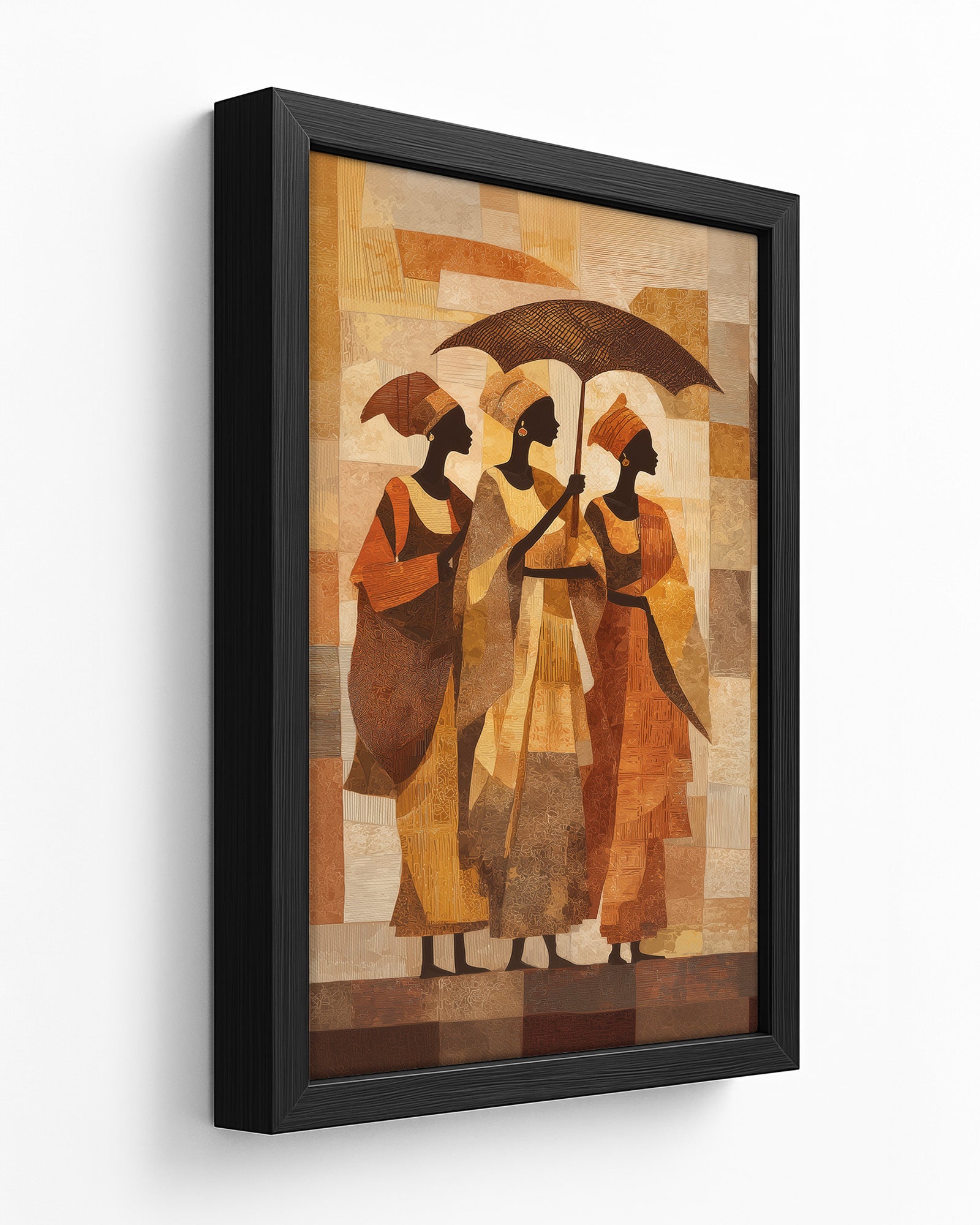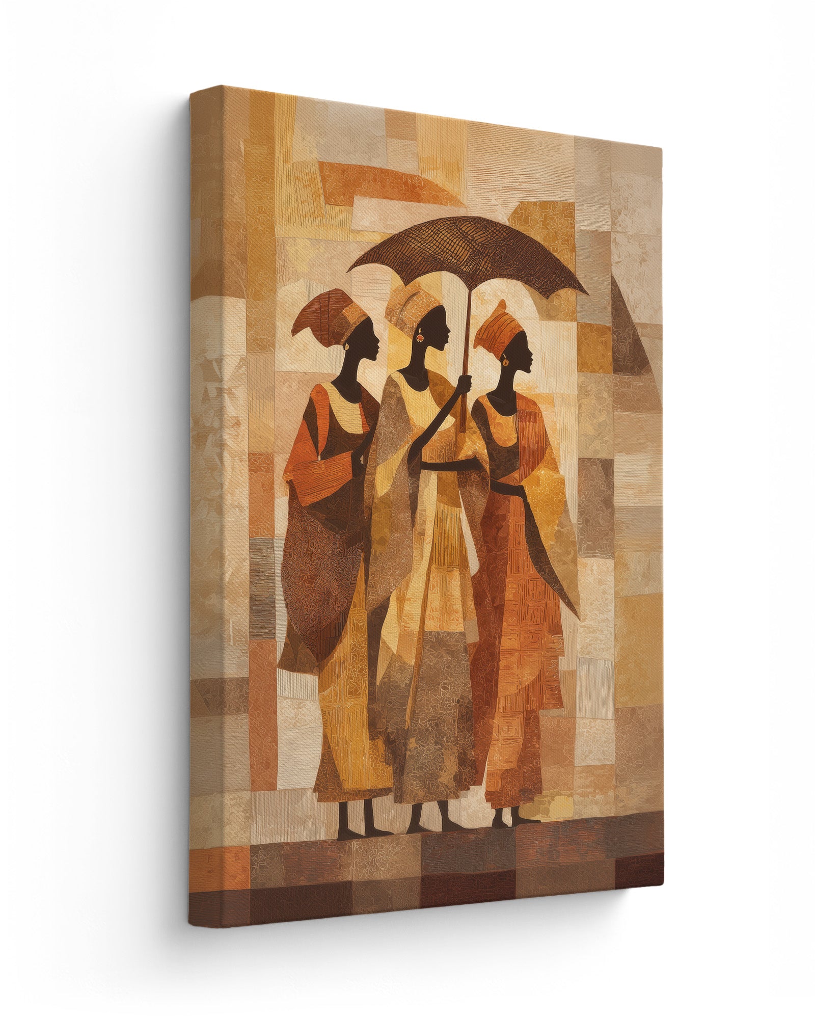 Minimalist African art depicting three women in traditional attire beneath a woven umbrella, painted in a striking palette of amber orange and deep navy blue. Their elegant silhouettes and geometric garments echo cultural motifs, while the bold contrast of colors highlights strength, femininity, and unity. A refined modern piece blending African heritage with abstract minimalism.
