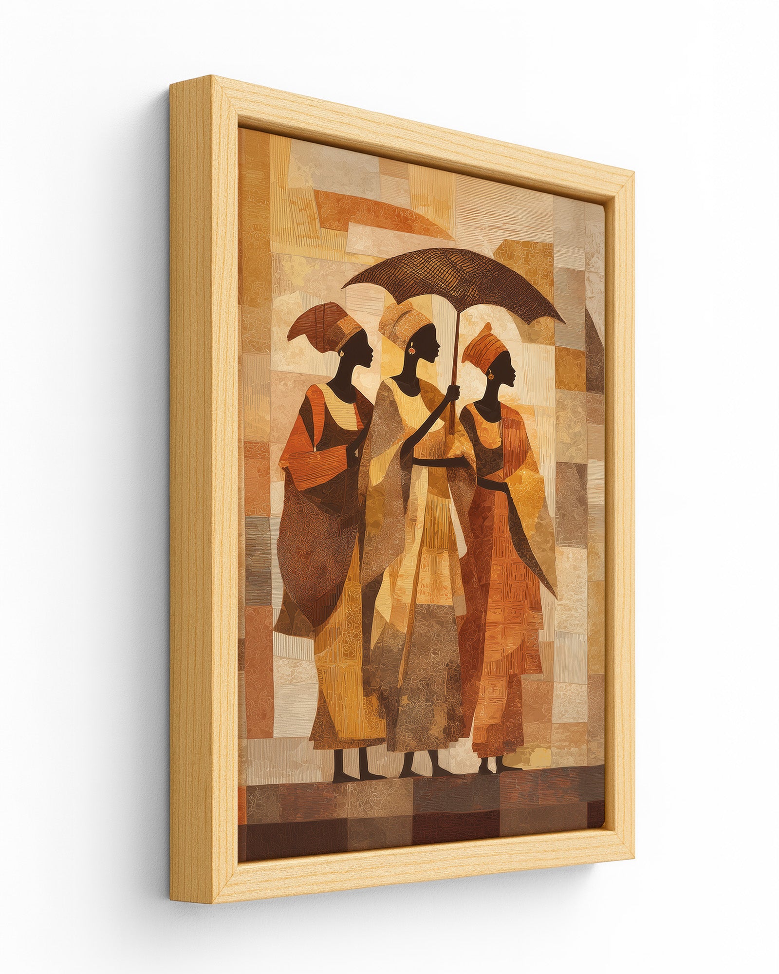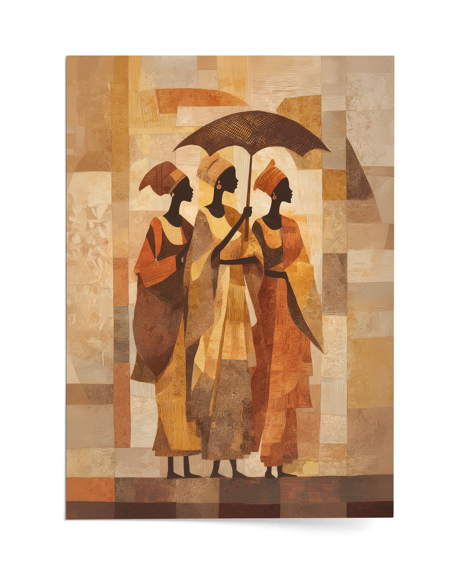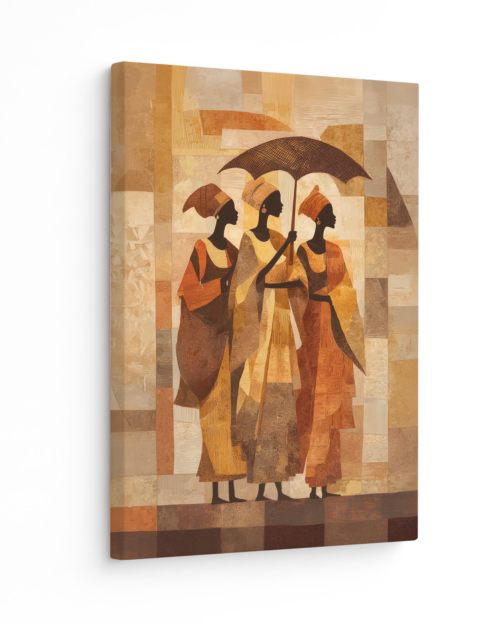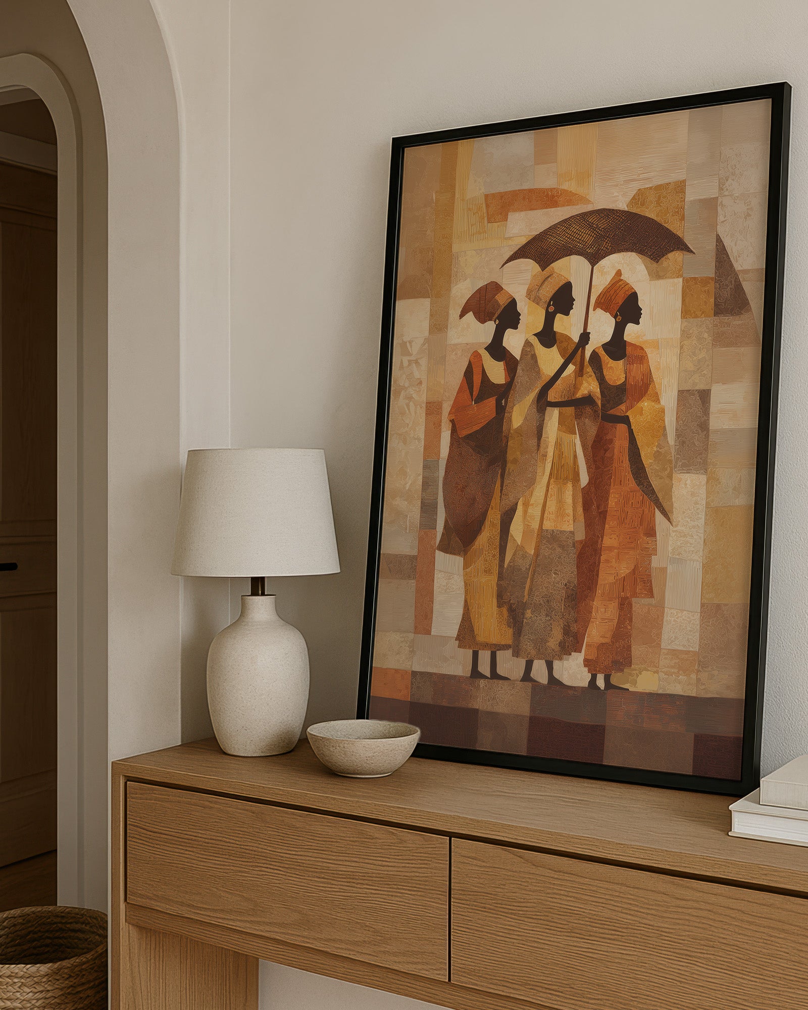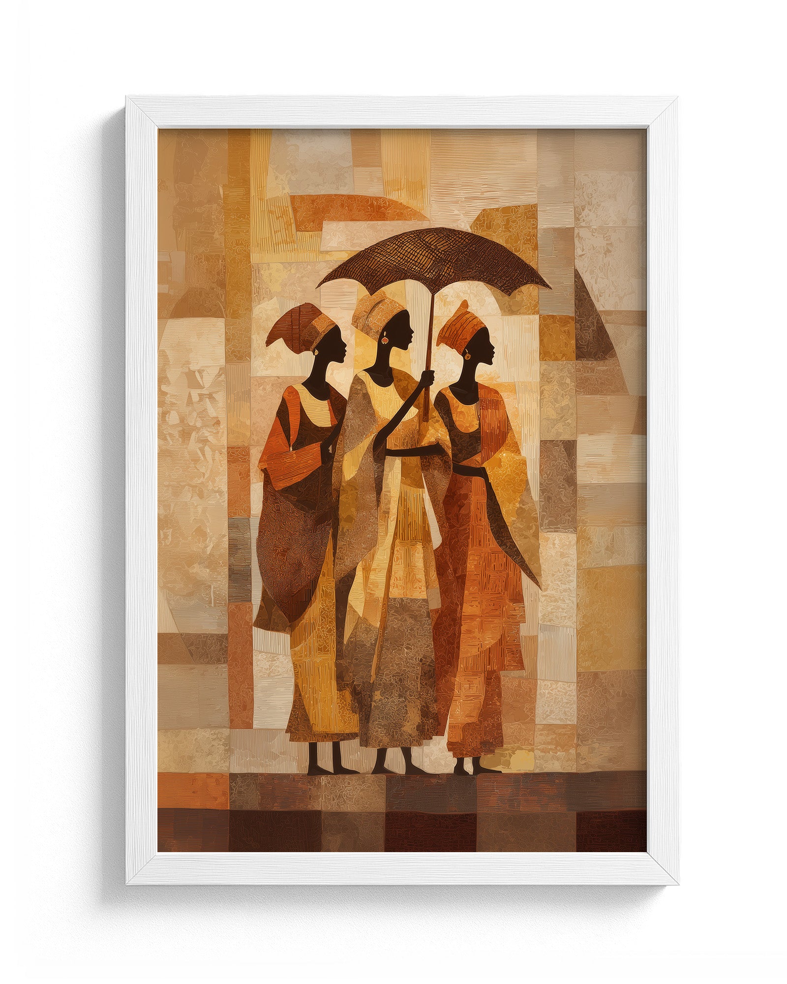 Minimalist African art depicting three women in traditional attire beneath a woven umbrella, painted in a striking palette of amber orange and deep navy blue. Their elegant silhouettes and geometric garments echo cultural motifs, while the bold contrast of colors highlights strength, femininity, and unity. A refined modern piece blending African heritage with abstract minimalism.