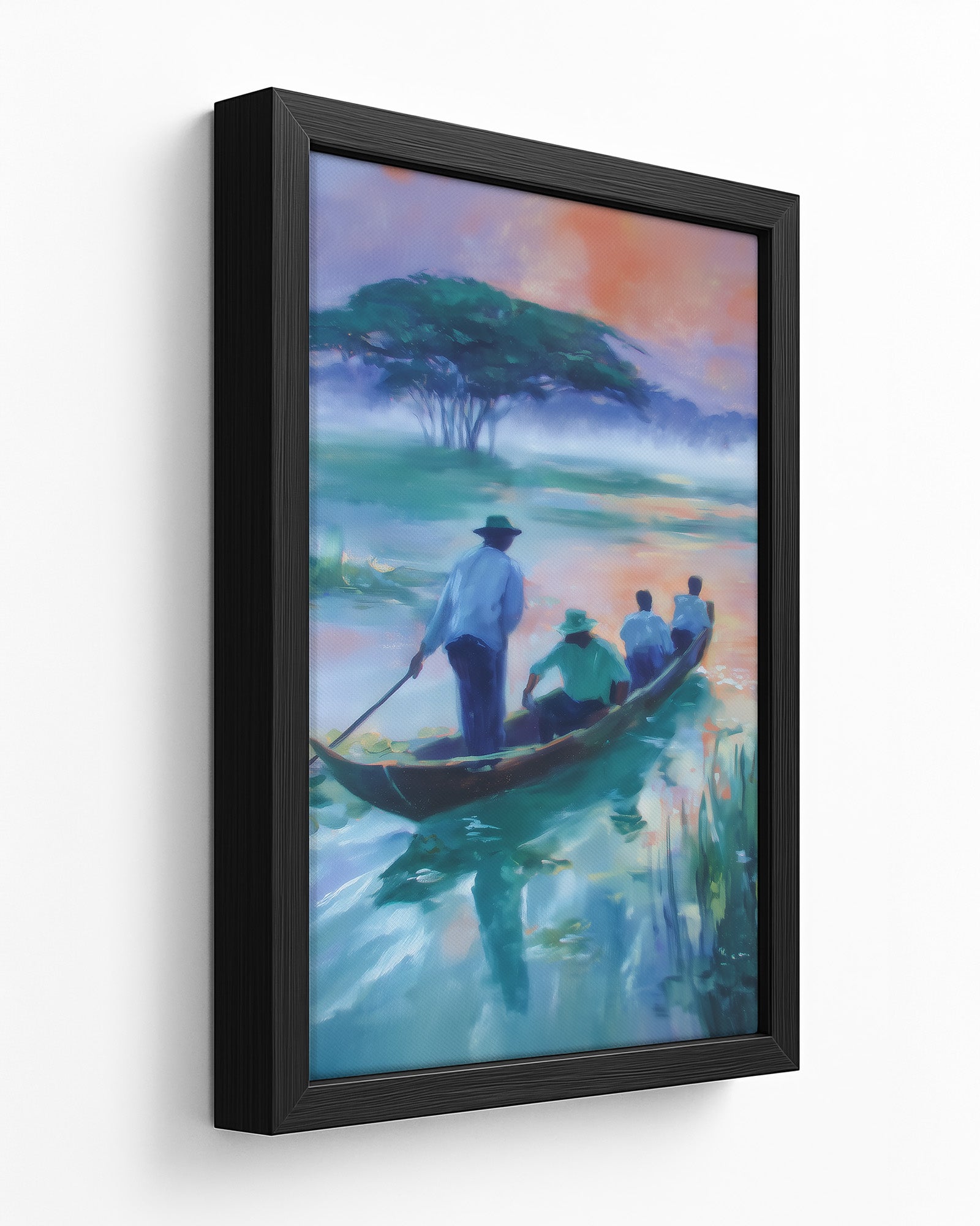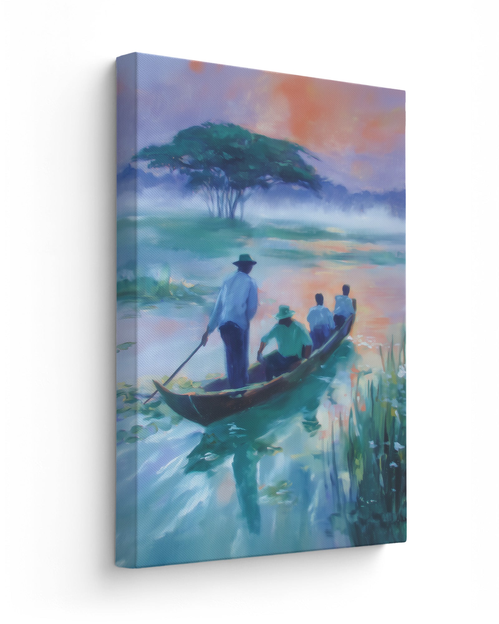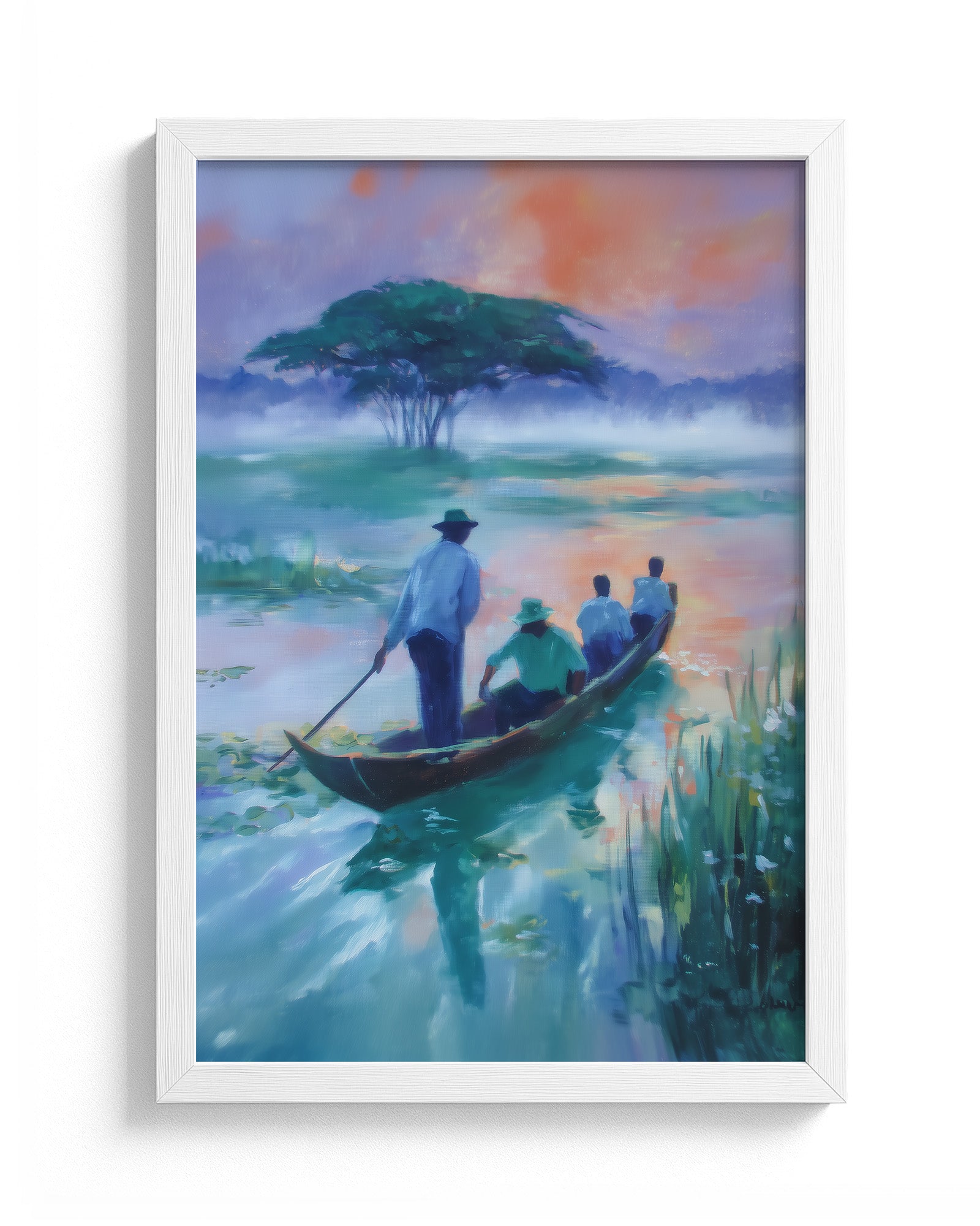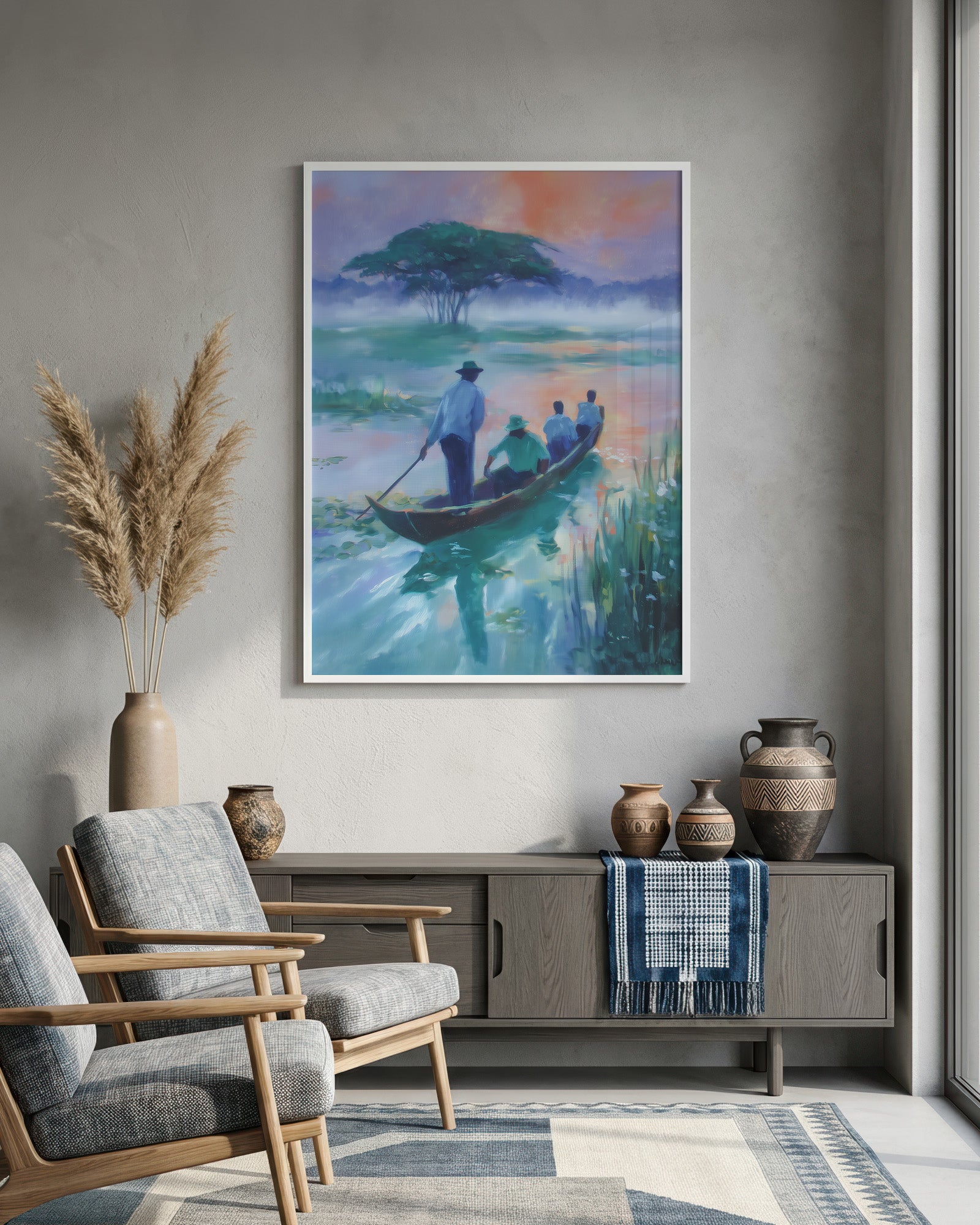 Carried by the Congo: Art on Congo's Sacred Provision, Communal Mastery, and the Knowledge of Receiving Congo's Endless Gifts. This moving composition honors Congo fishermen engaged in the essential work of lifting their net toward the luminous Congo sky, revealing how fishing becomes ritual of gratitude and participation in the Congo's endless cycle of giving.