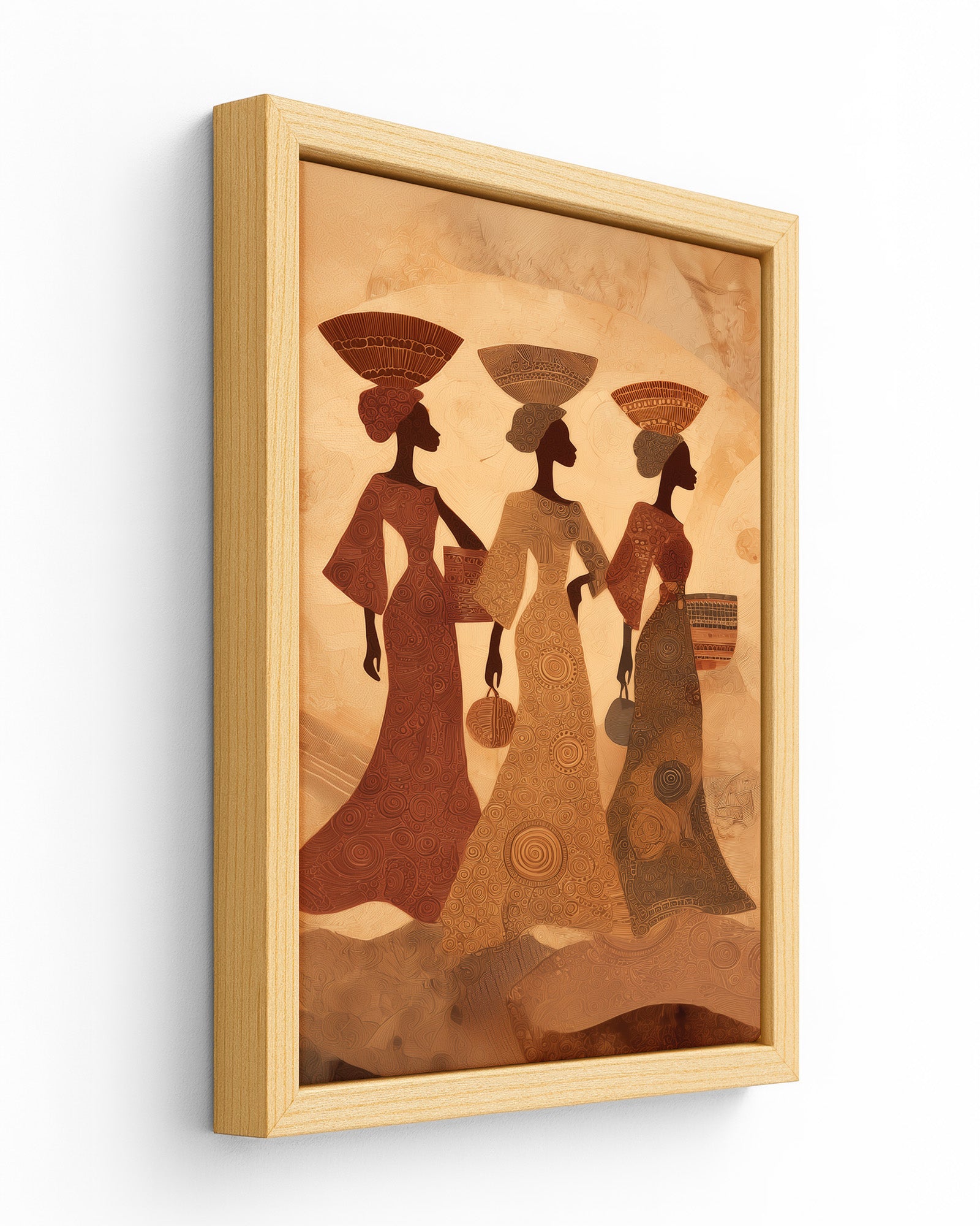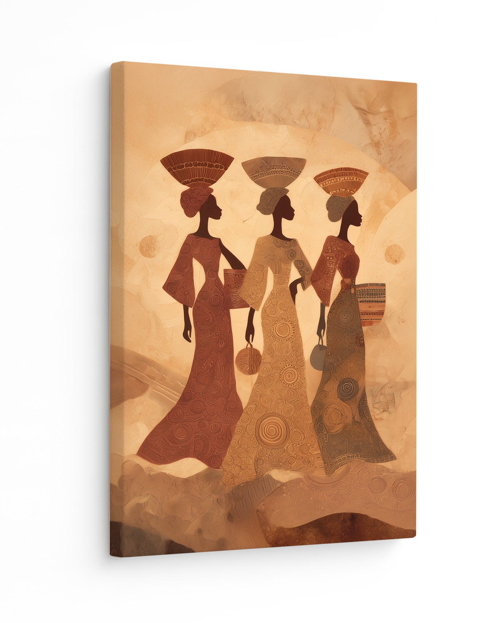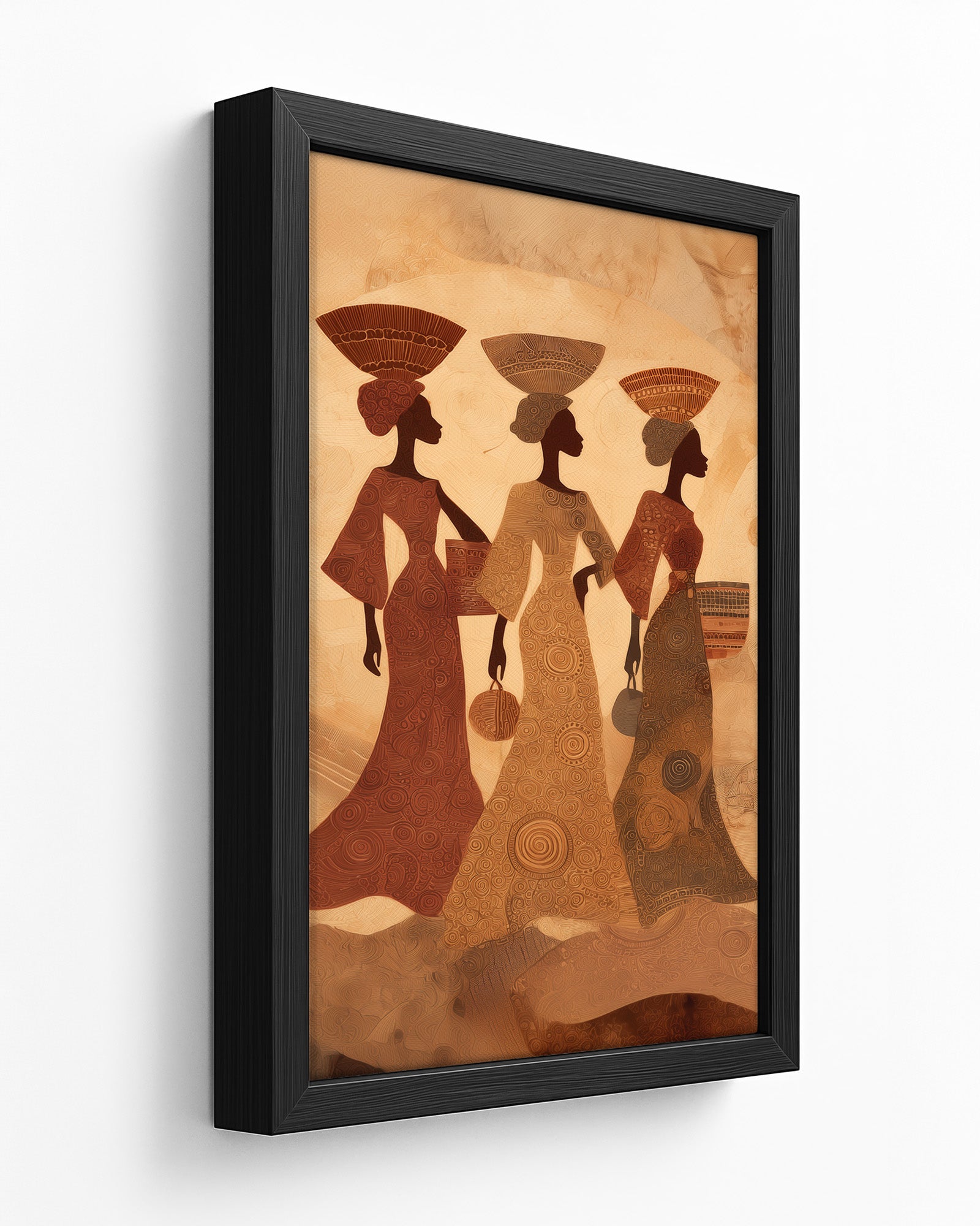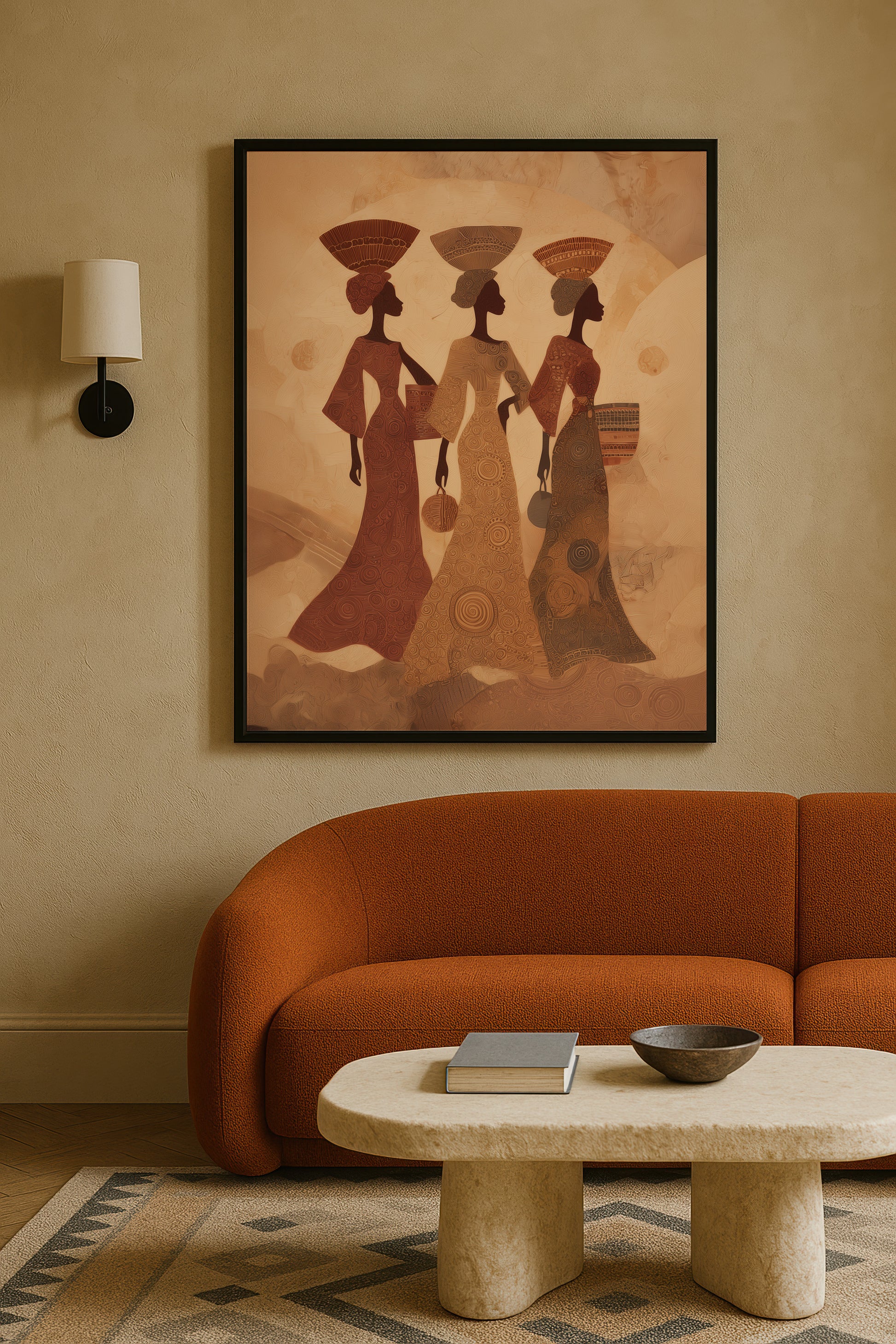 A warm, mural-inspired painting of three African women in flowing traditional attire, balancing patterned baskets atop their heads. Rendered in earthy ochre, bronze, and terracotta tones, the artwork reflects Yoruba cultural heritage, symbolizing grace, strength, and the timeless rhythm of daily life.