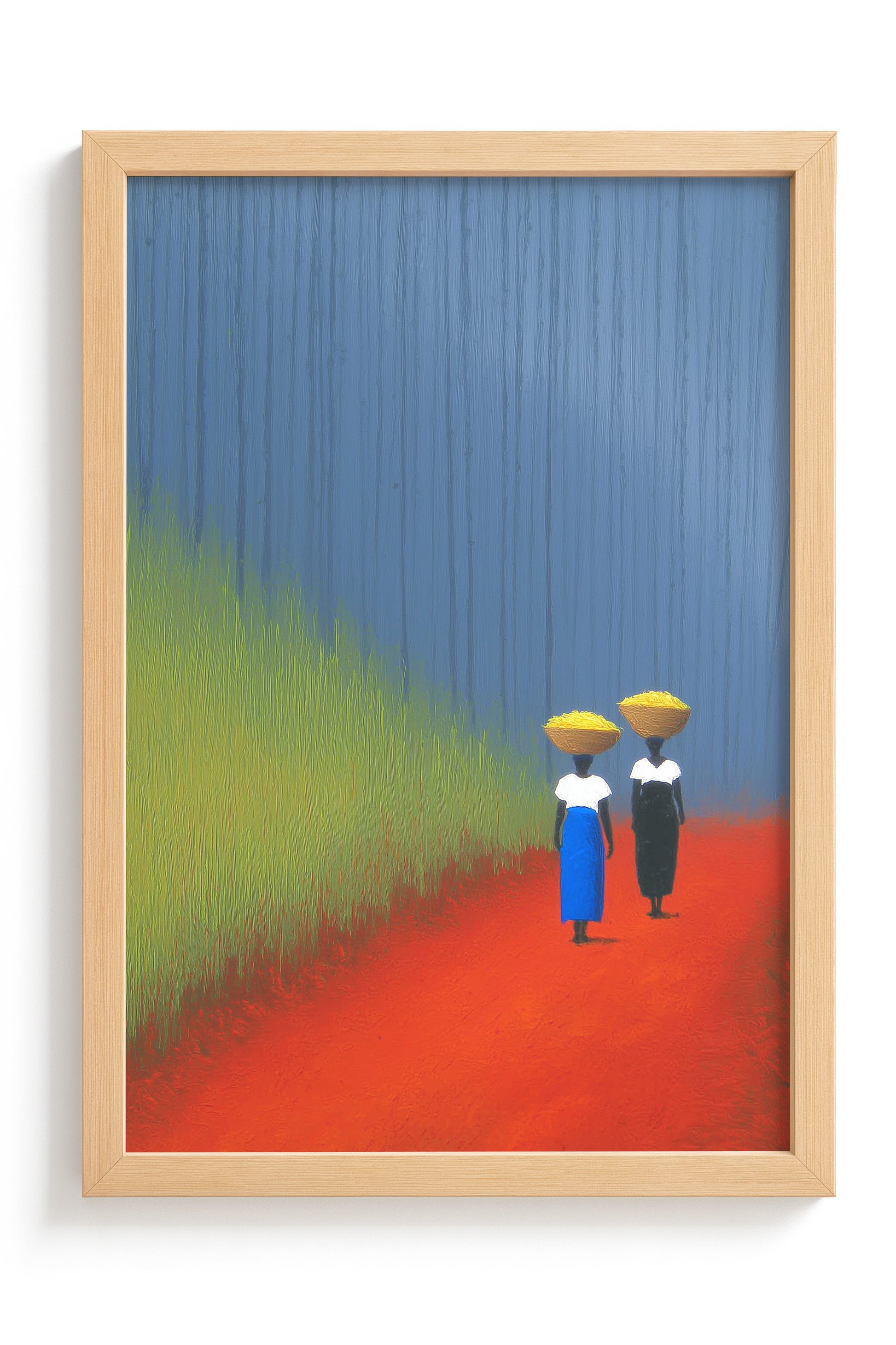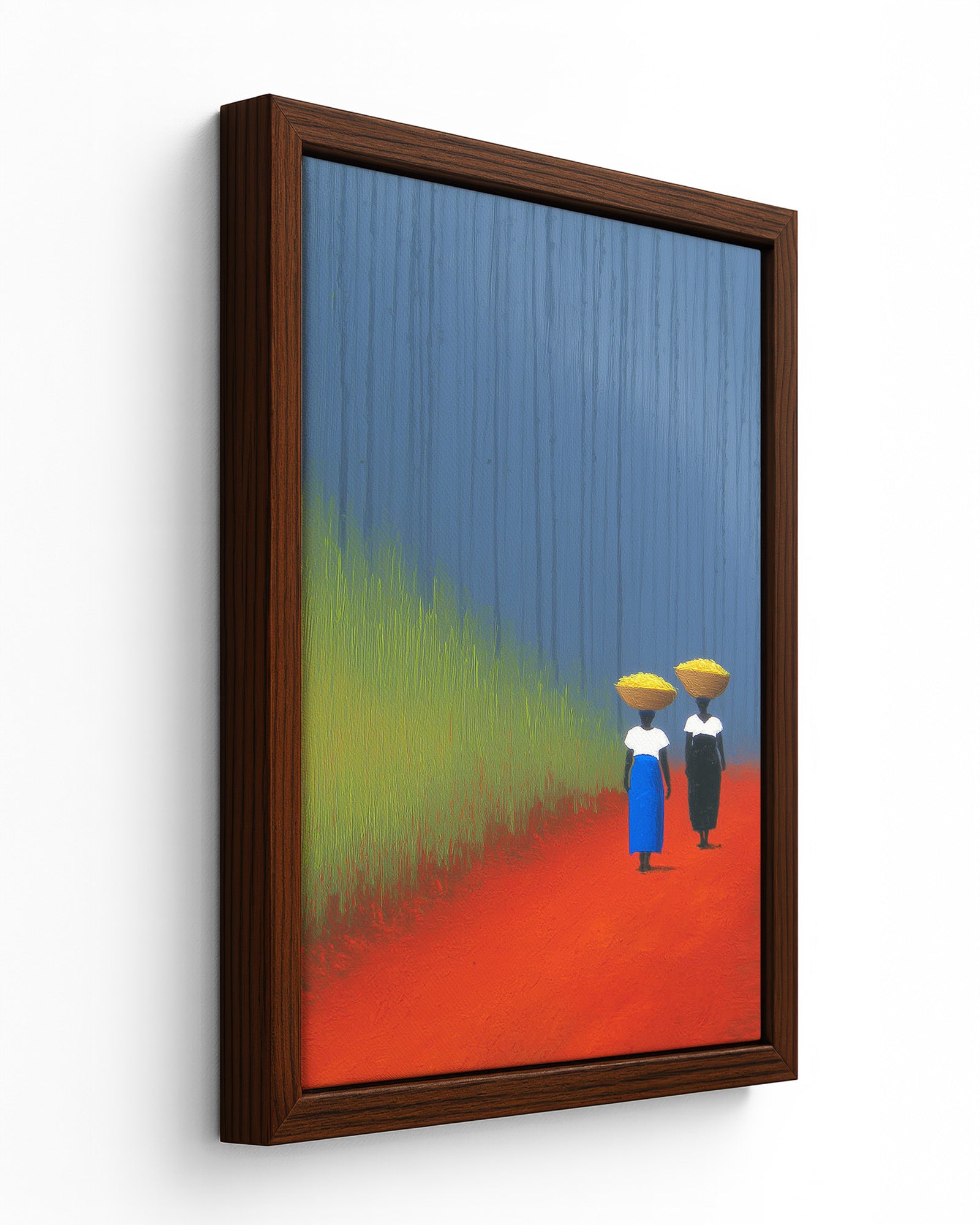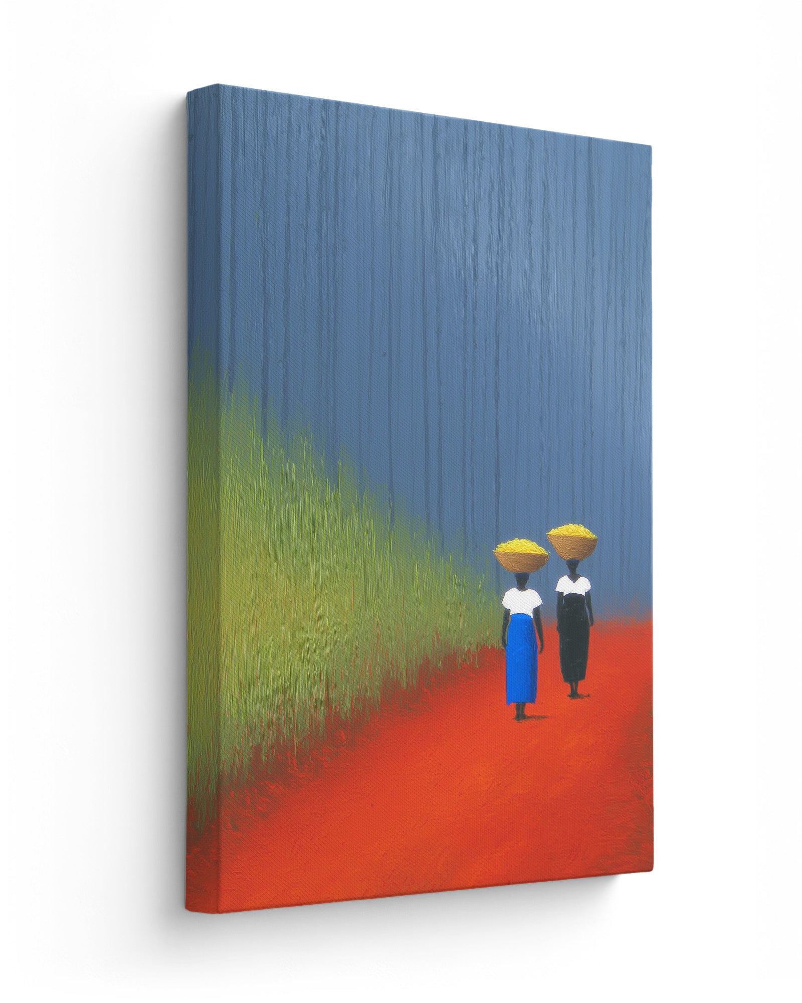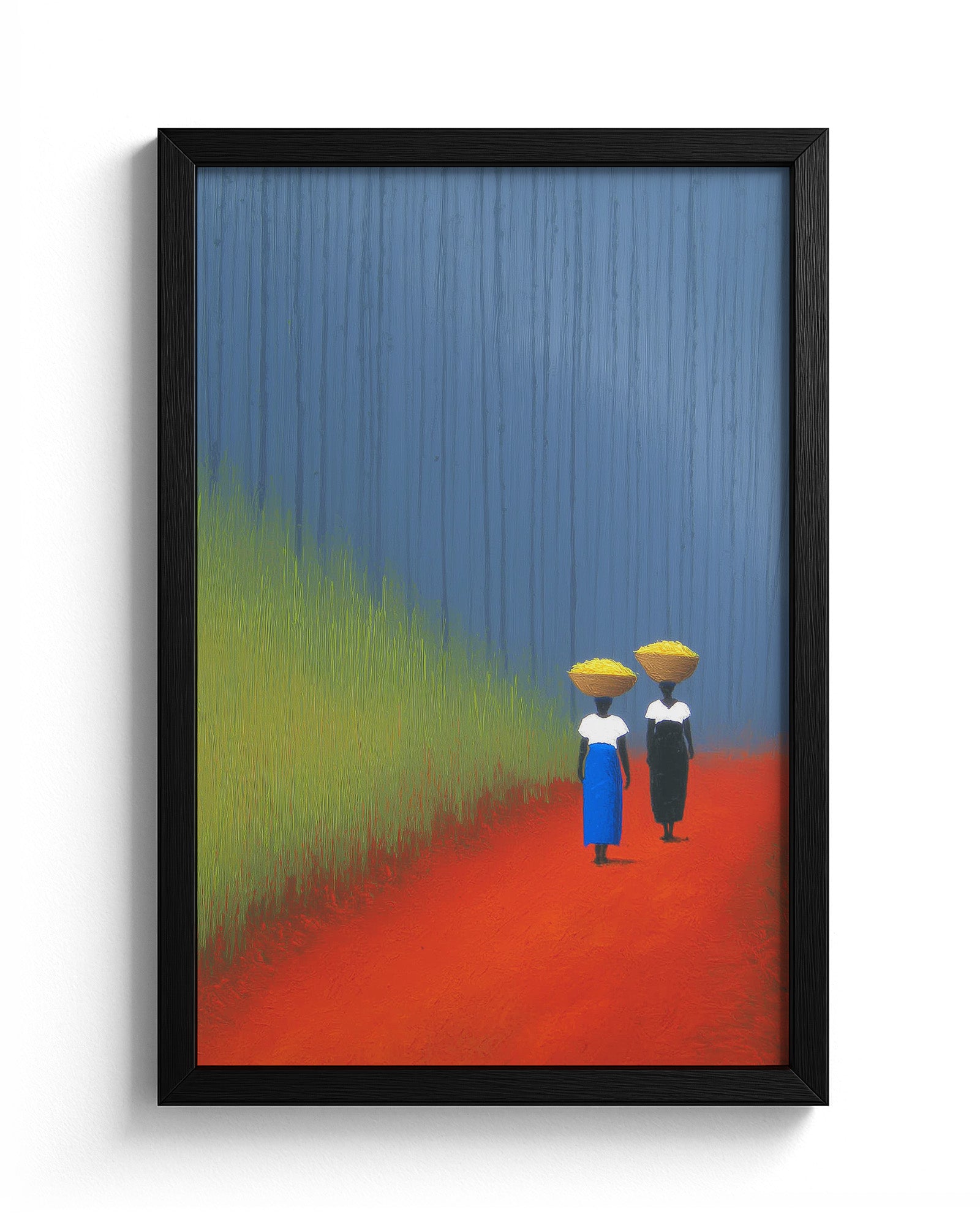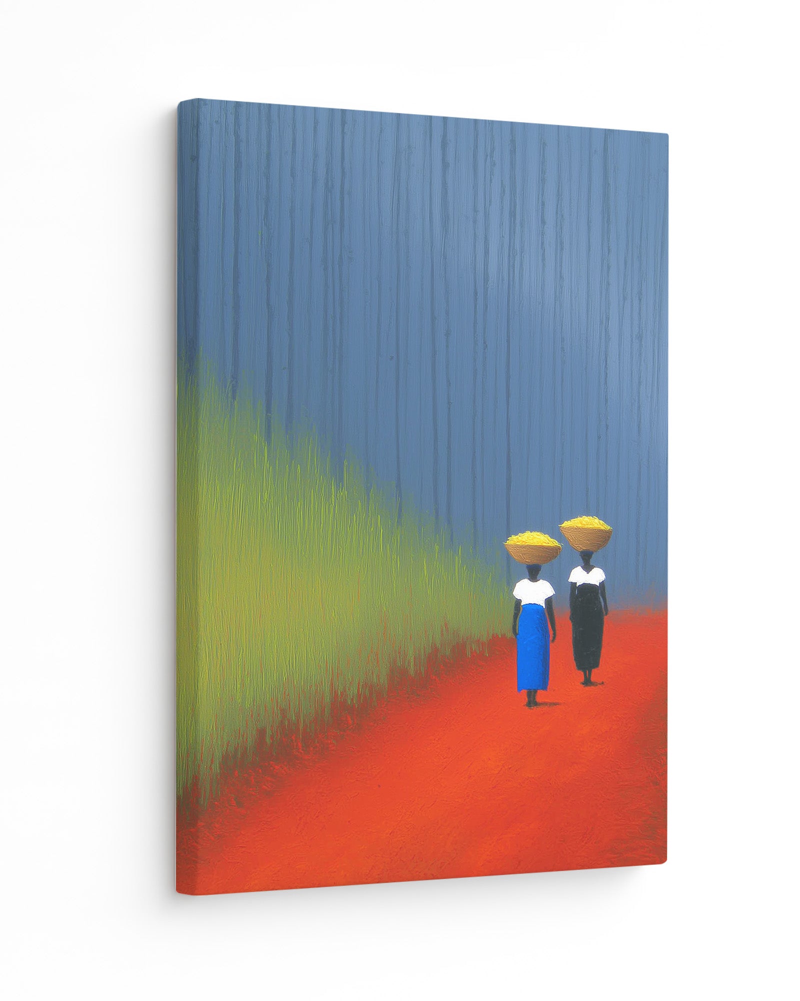 Cassava Road: Art on Congo's Food Security, Women's Agricultural Labor, and the Sacred Work of Cassava Cultivation in Congo Villages. This striking composition captures Congolese women carrying baskets of cassava root on their heads along a red Congo earth path, revealing how women's agricultural labor remains invisible backbone sustaining Congo's food security and village economies.