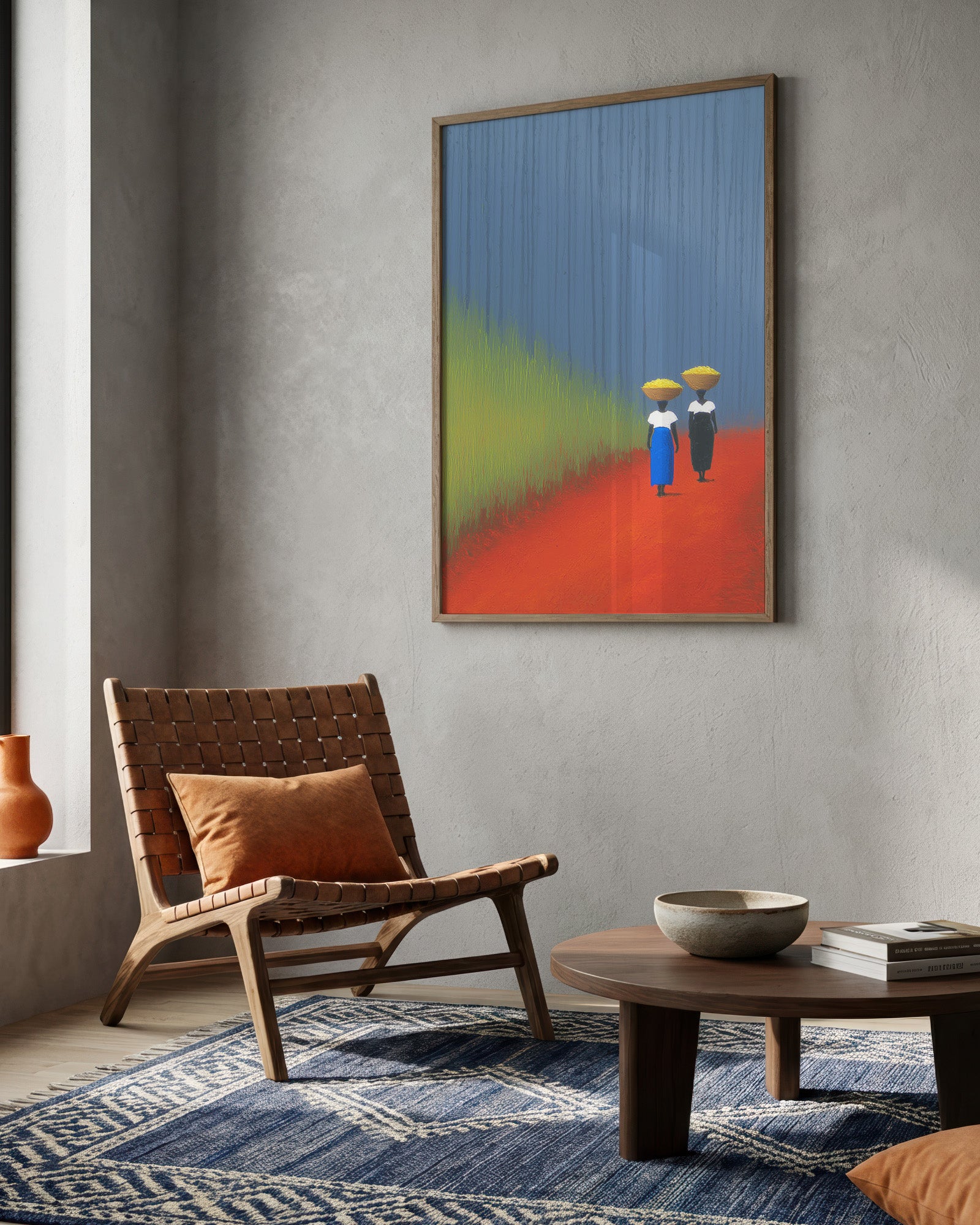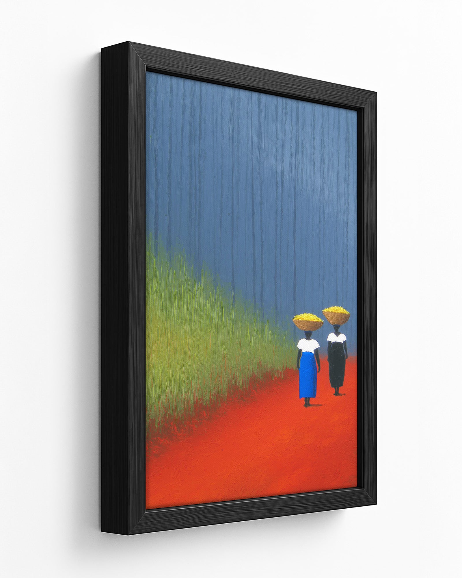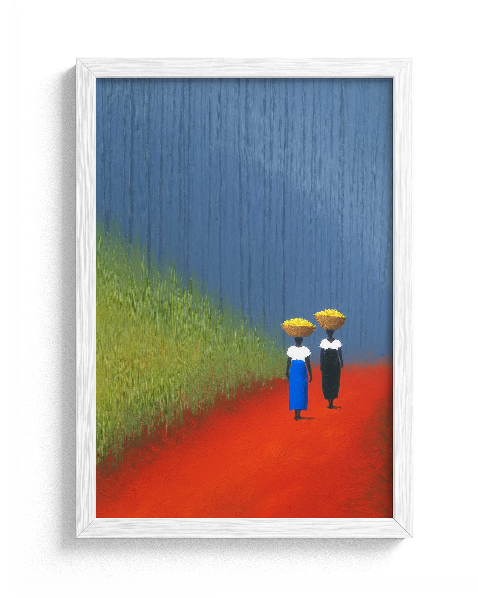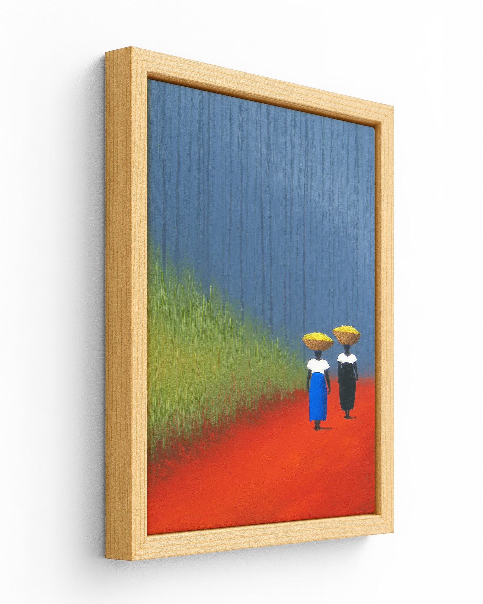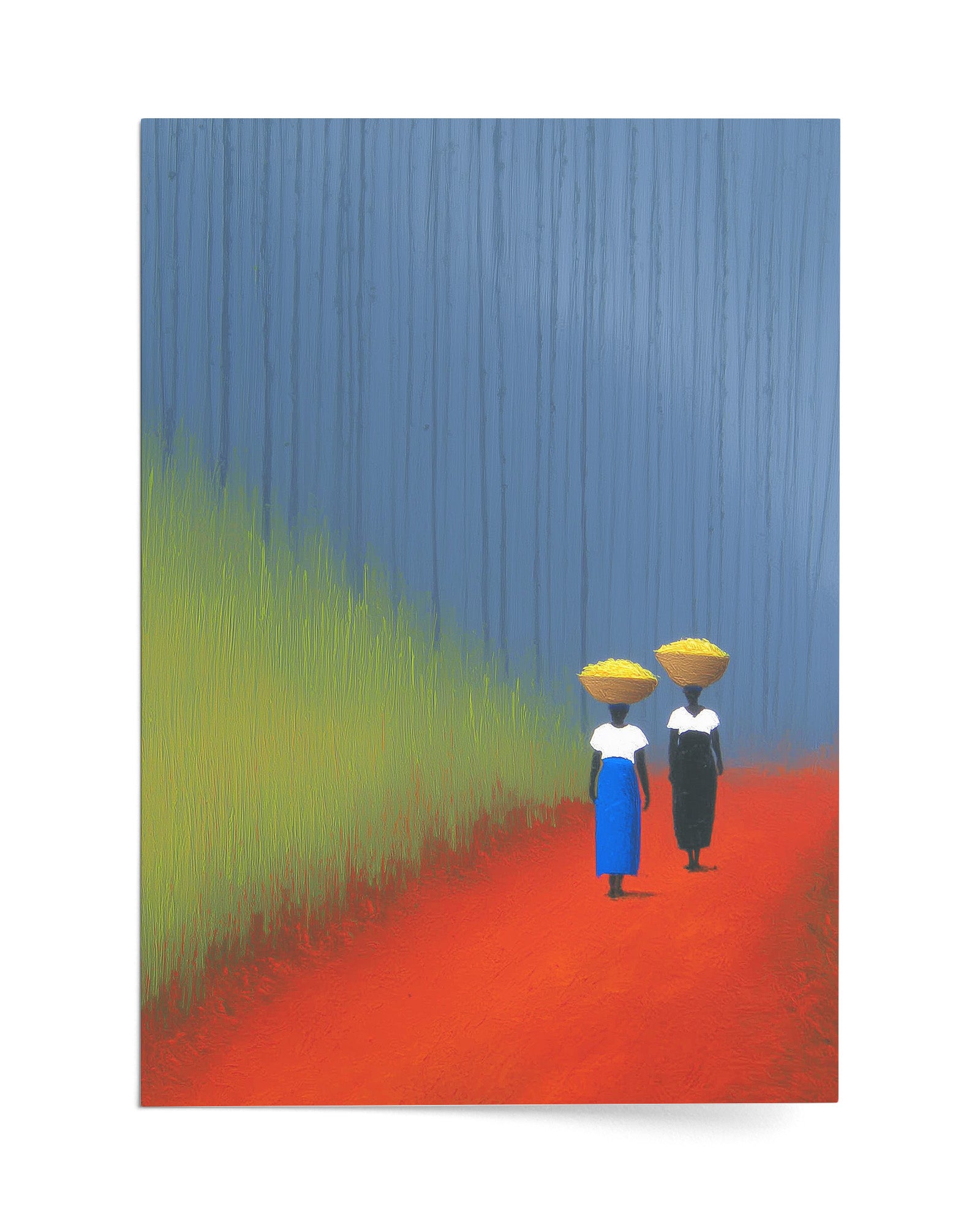 Cassava Road: Art on Congo's Food Security, Women's Agricultural Labor, and the Sacred Work of Cassava Cultivation in Congo Villages. This striking composition captures Congolese women carrying baskets of cassava root on their heads along a red Congo earth path, revealing how women's agricultural labor remains invisible backbone sustaining Congo's food security and village economies.