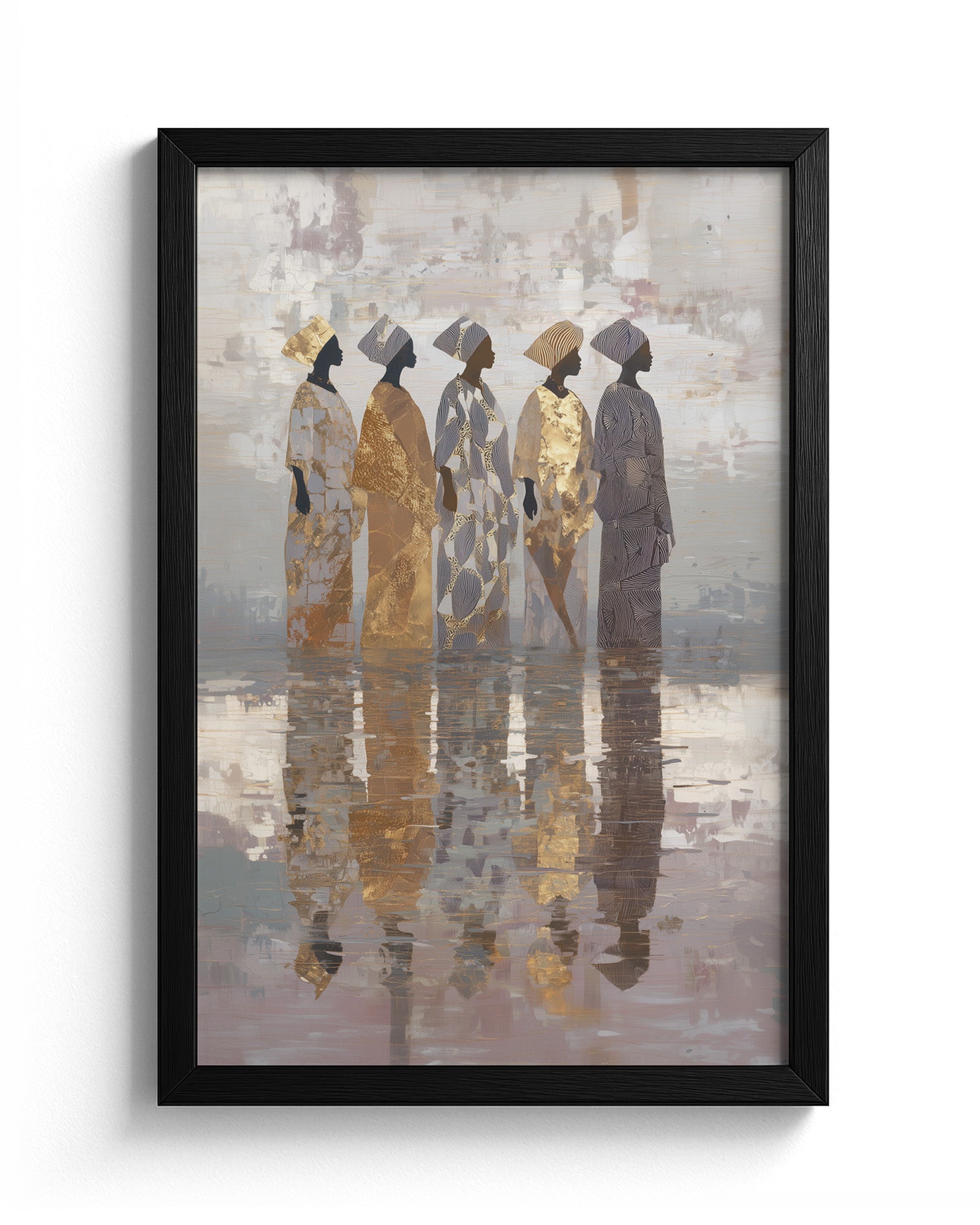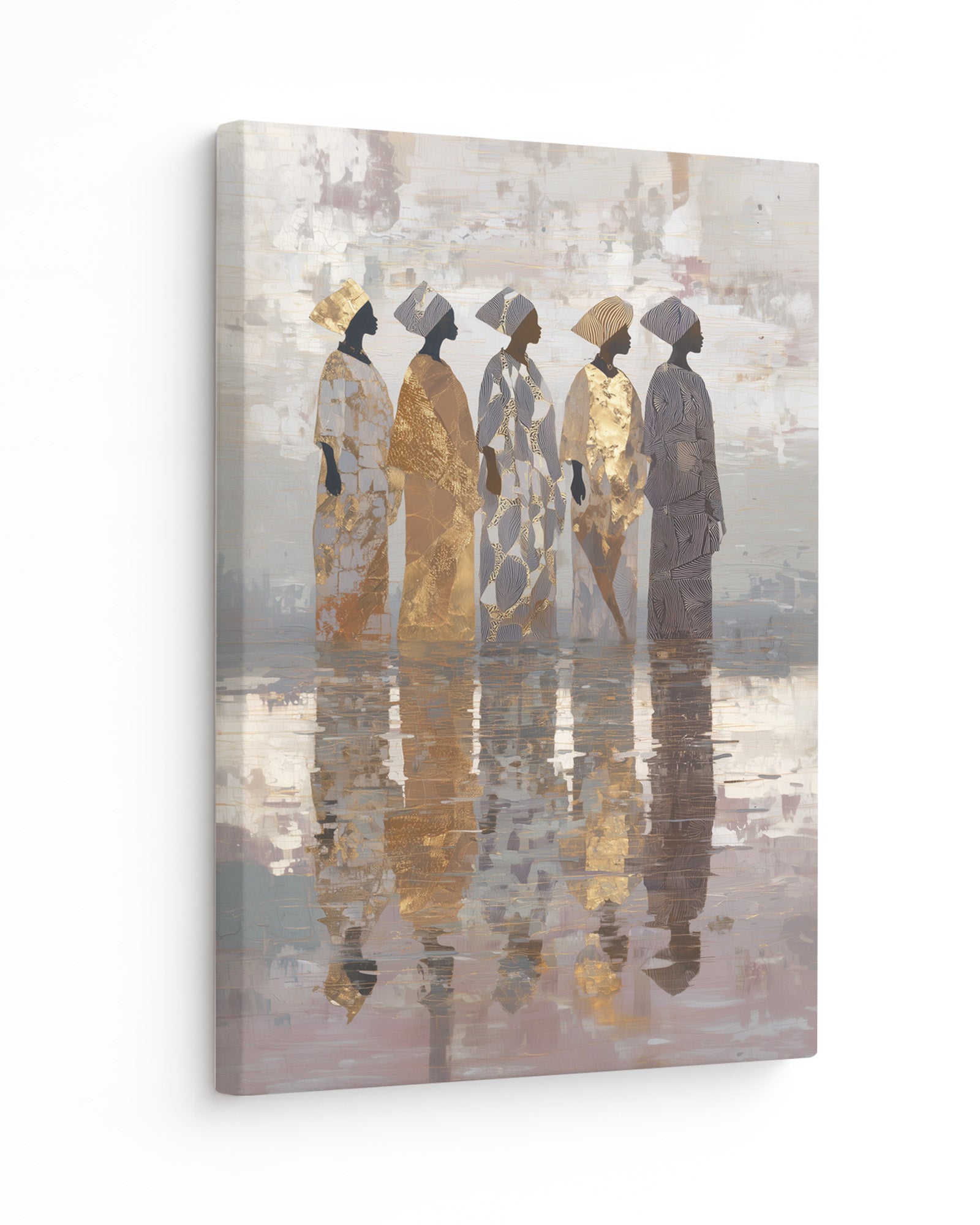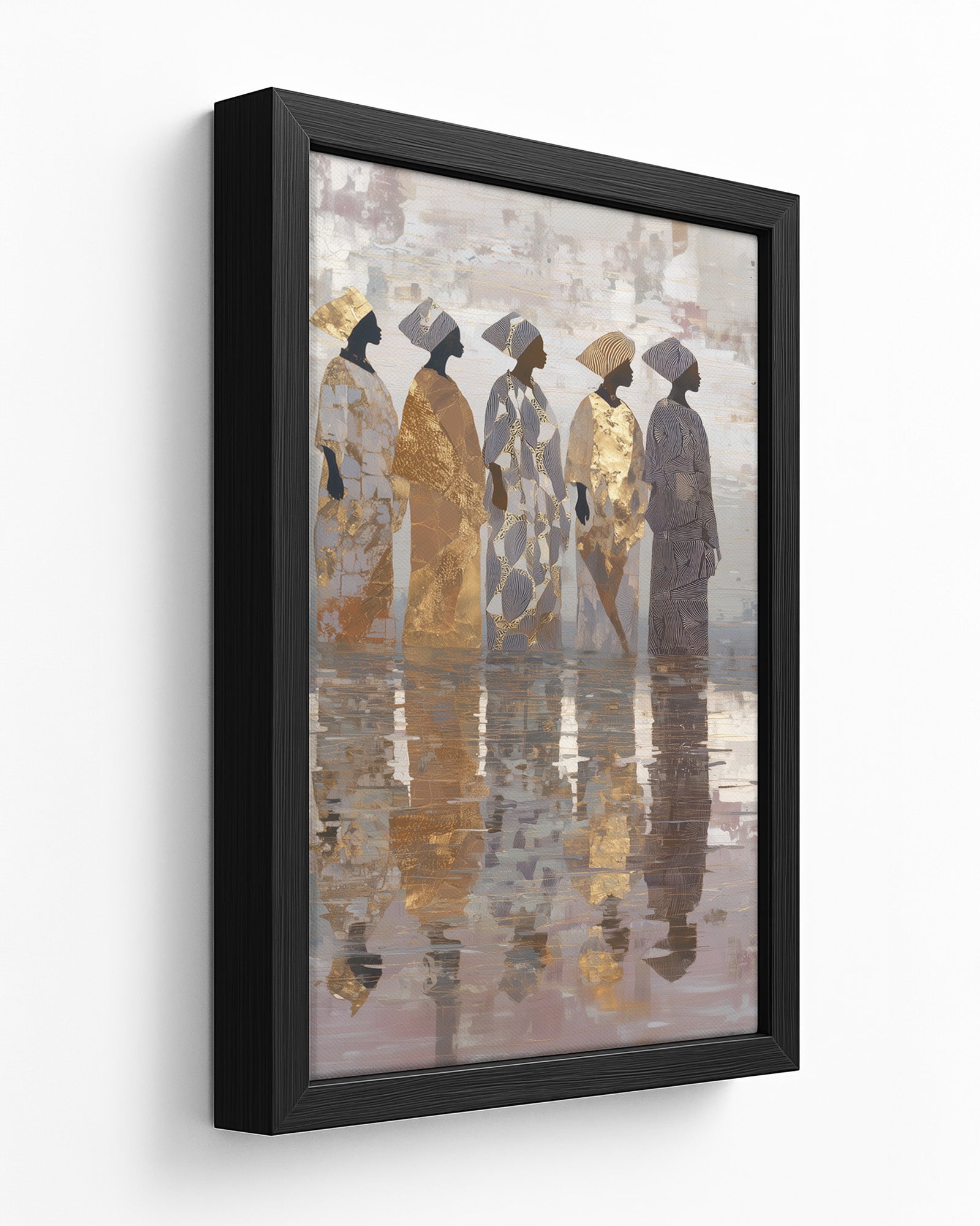 Abstract oil painting of Yoruba women at a sacred river, with flowing reflections that blend with Adire-inspired motifs. Soft golden accents and earthy hues create a spiritual atmosphere, capturing the essence of Yoruba culture, moonlight, and ancestral connection.