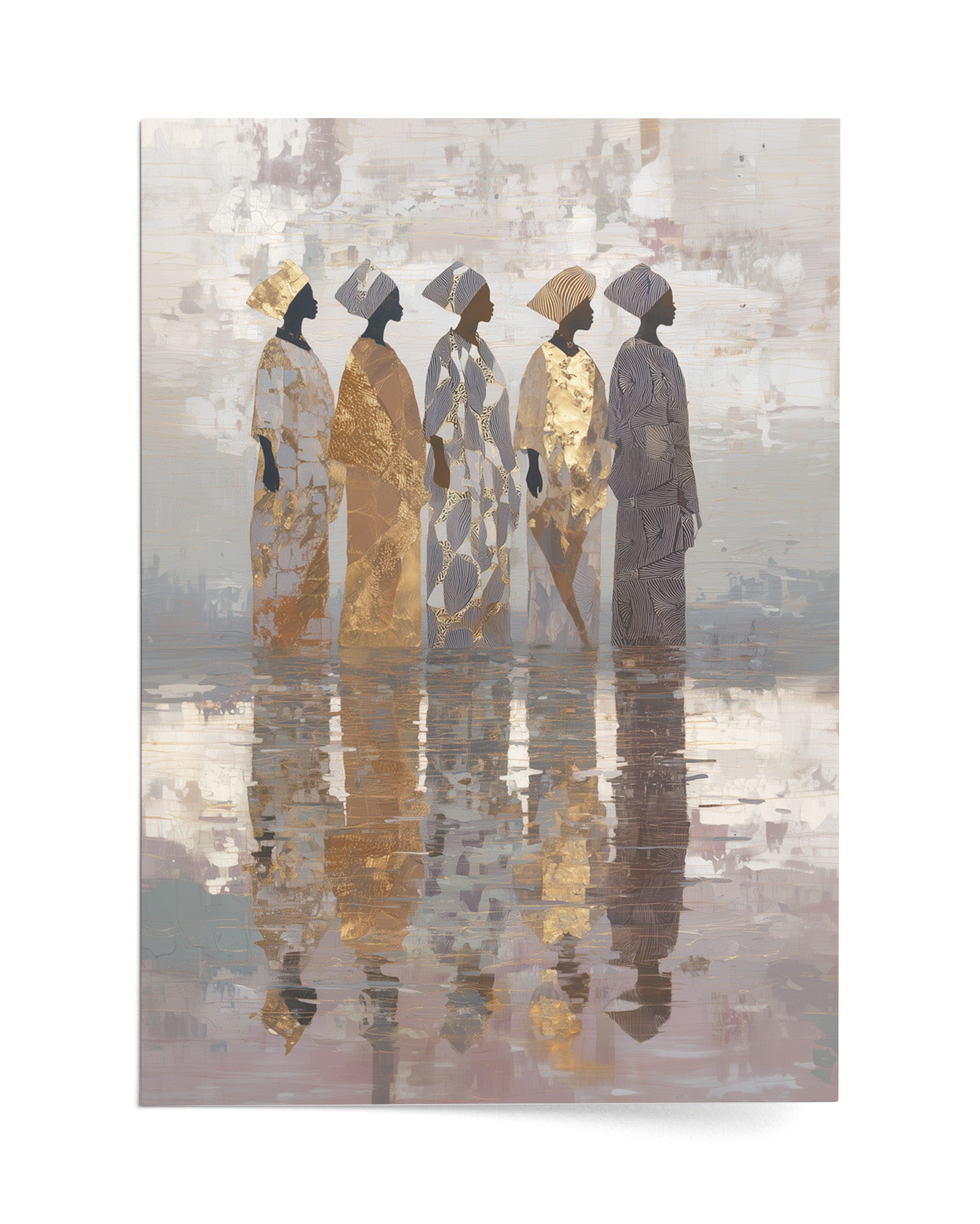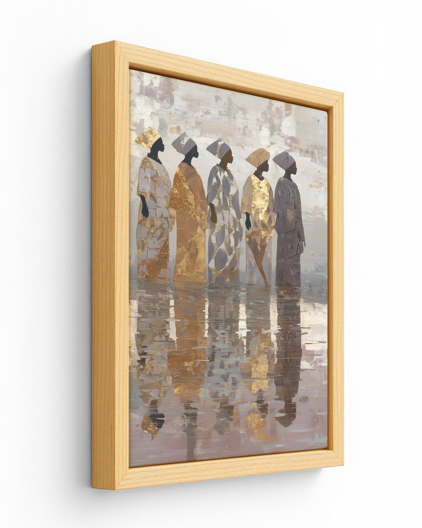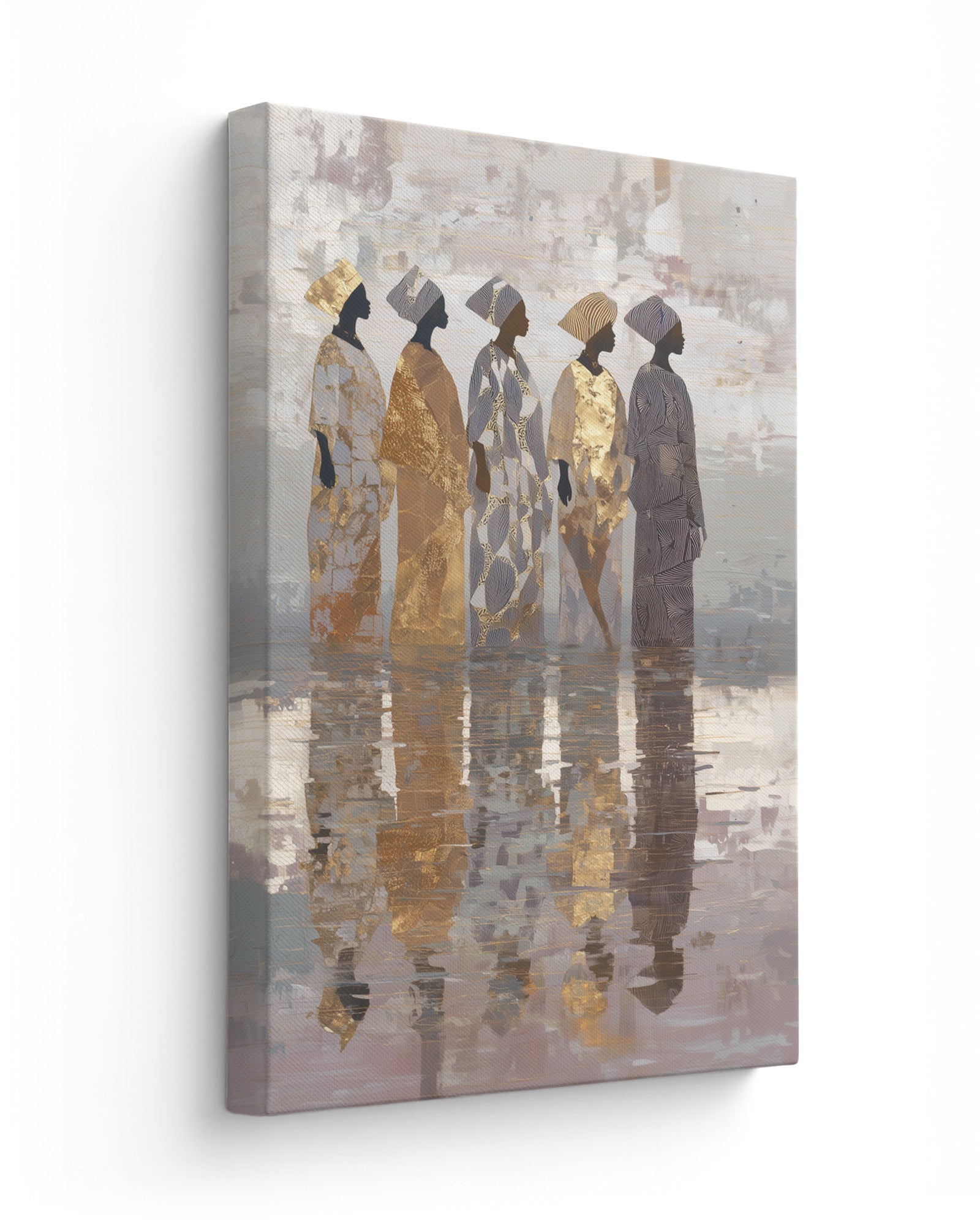 Abstract oil painting of Yoruba women at a sacred river, with flowing reflections that blend with Adire-inspired motifs. Soft golden accents and earthy hues create a spiritual atmosphere, capturing the essence of Yoruba culture, moonlight, and ancestral connection.