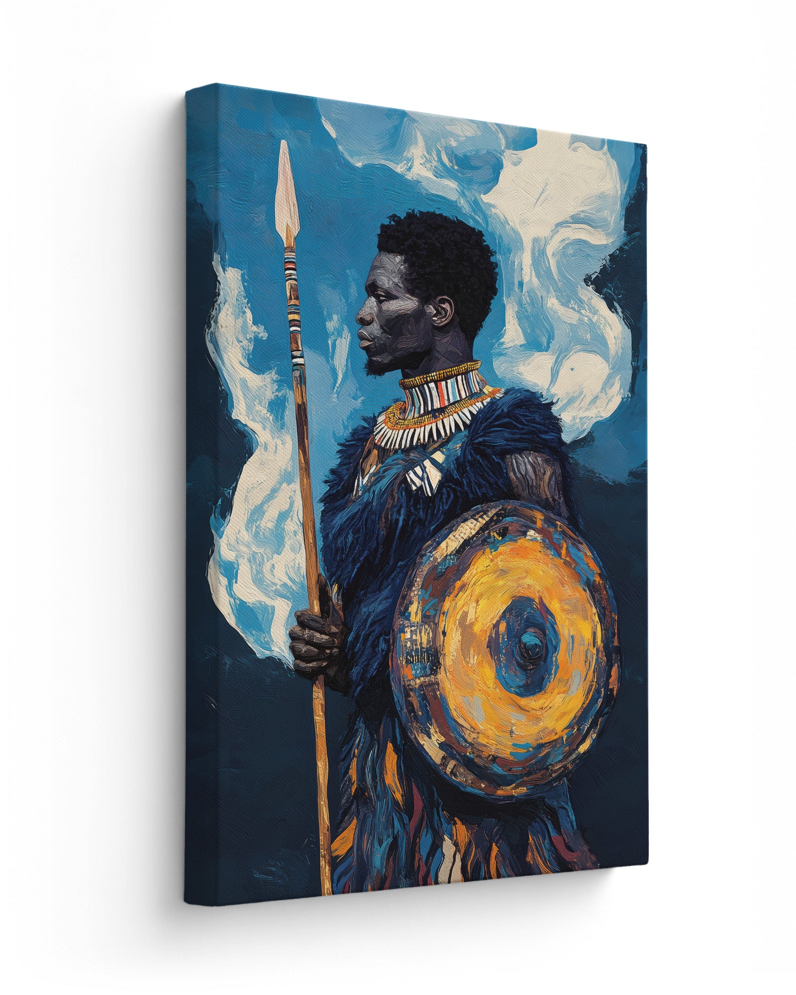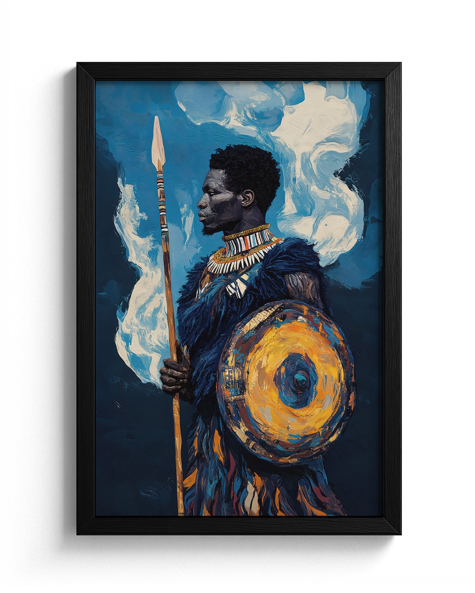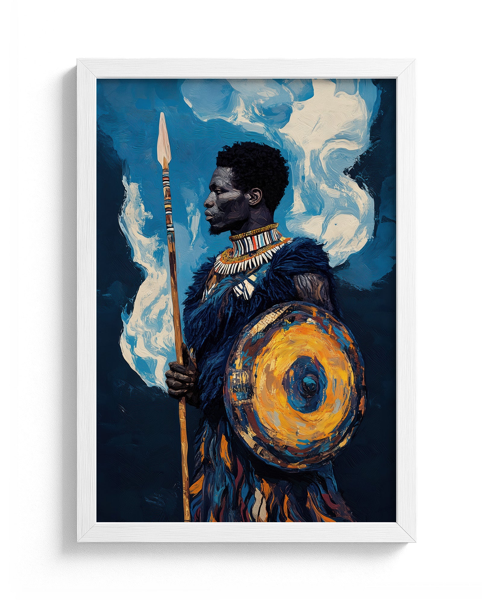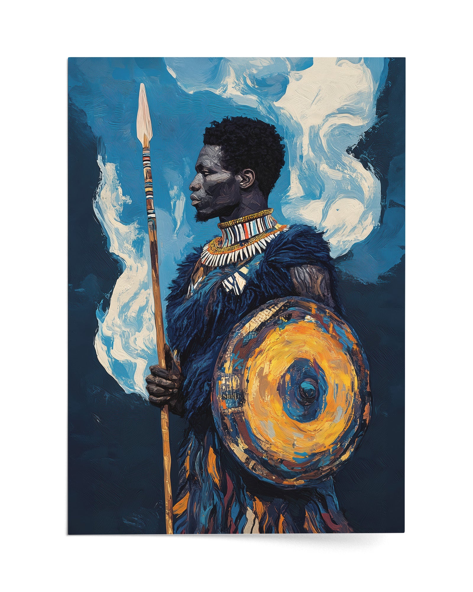 Experience the striking elegance of this artwork featuring a Zulu warrior adorned in traditional tribal attire, holding a spear with unwavering pride. His shield, beautifully overlaid with intricate tribal patterns, is set against a backdrop of swirling blue abstract designs.
