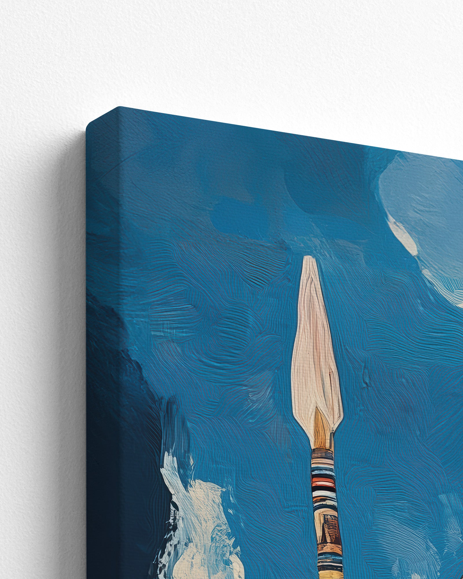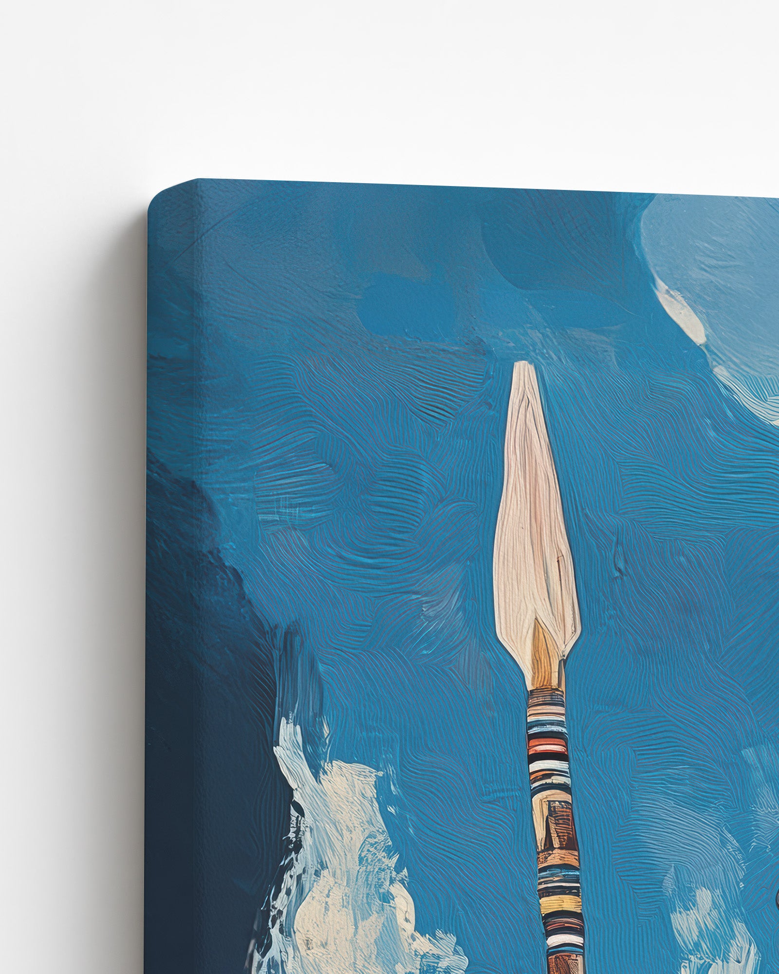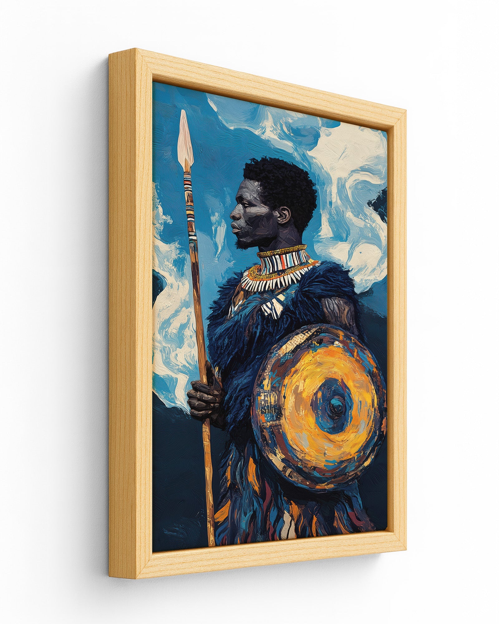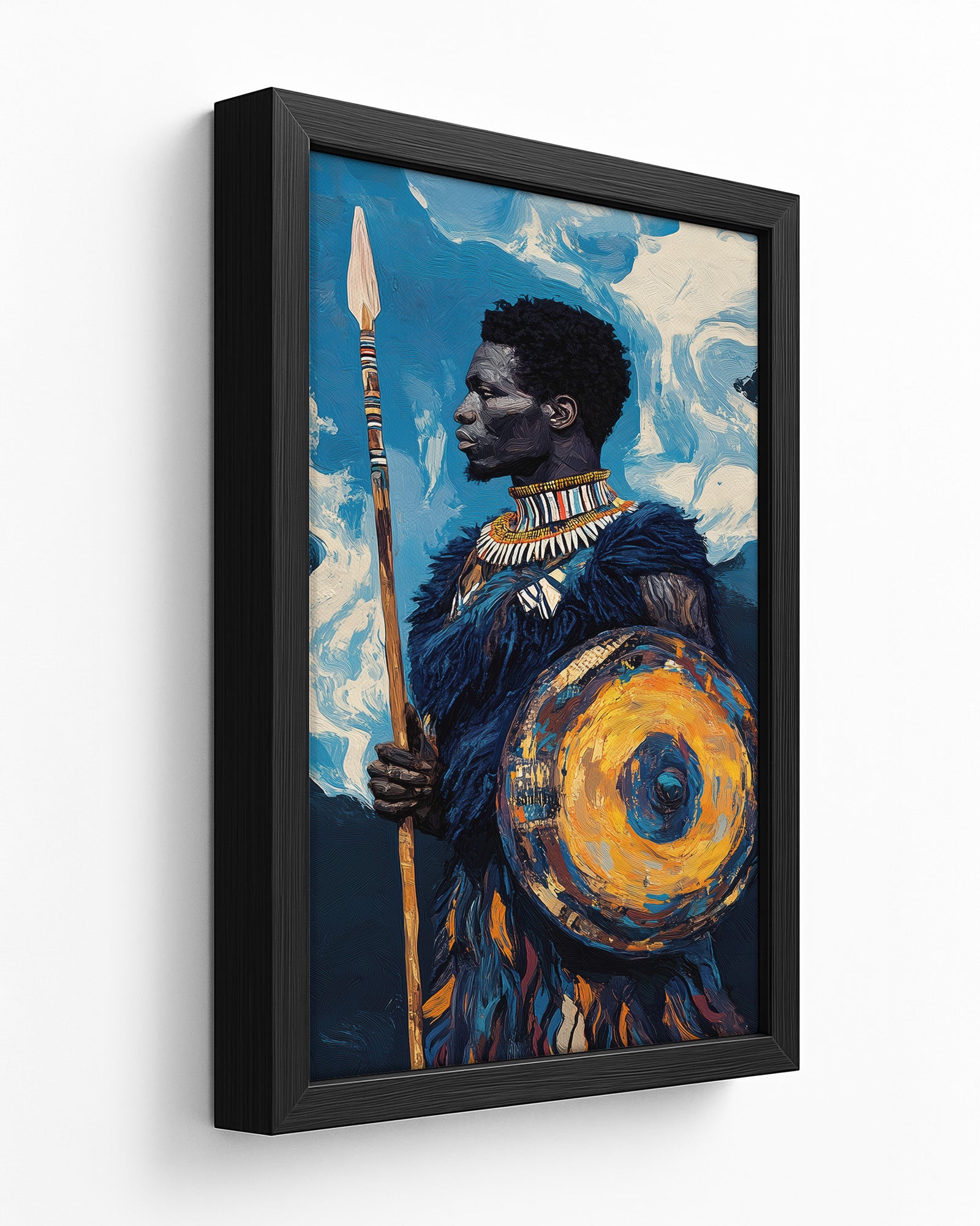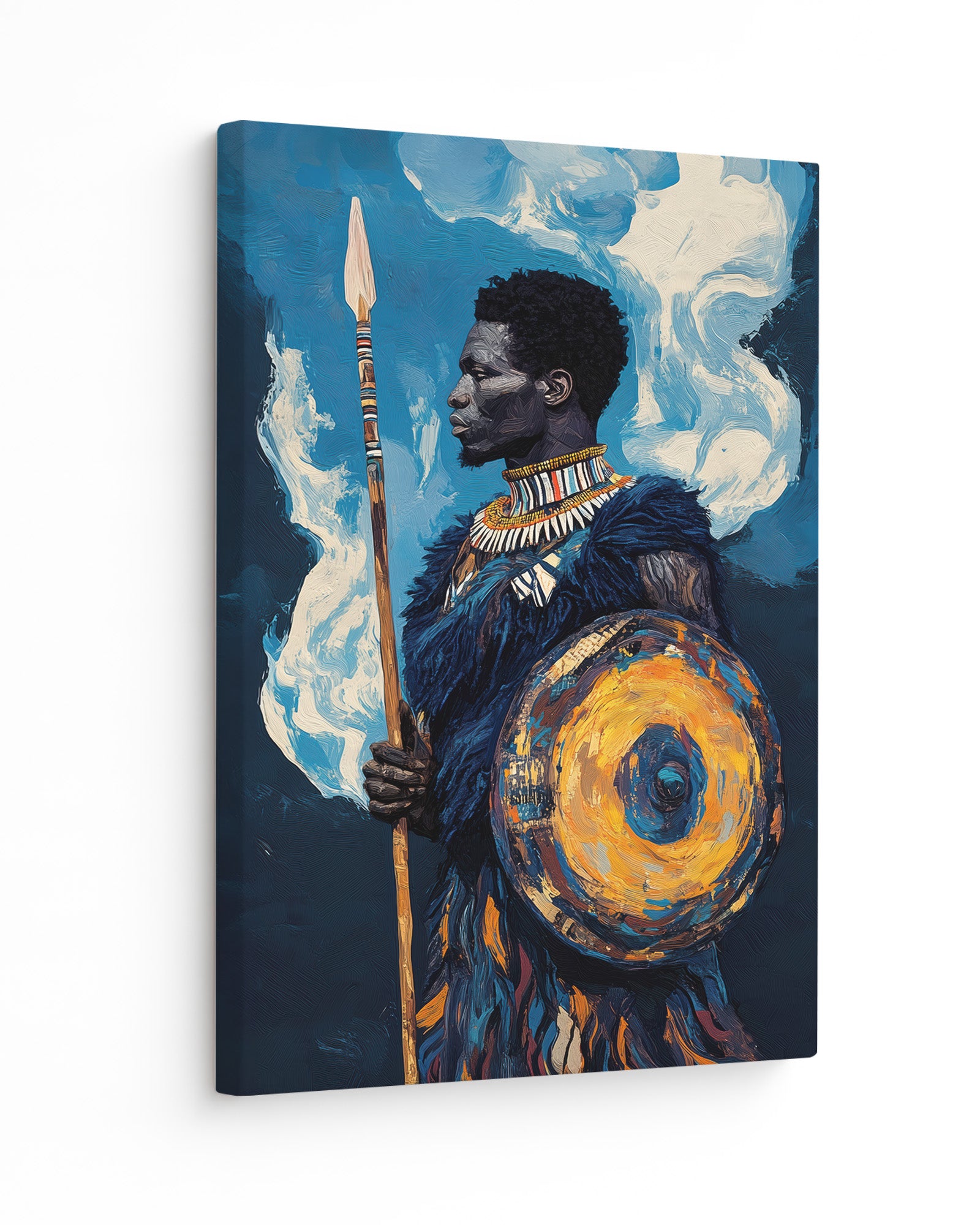 Experience the striking elegance of this artwork featuring a Zulu warrior adorned in traditional tribal attire, holding a spear with unwavering pride. His shield, beautifully overlaid with intricate tribal patterns, is set against a backdrop of swirling blue abstract designs.