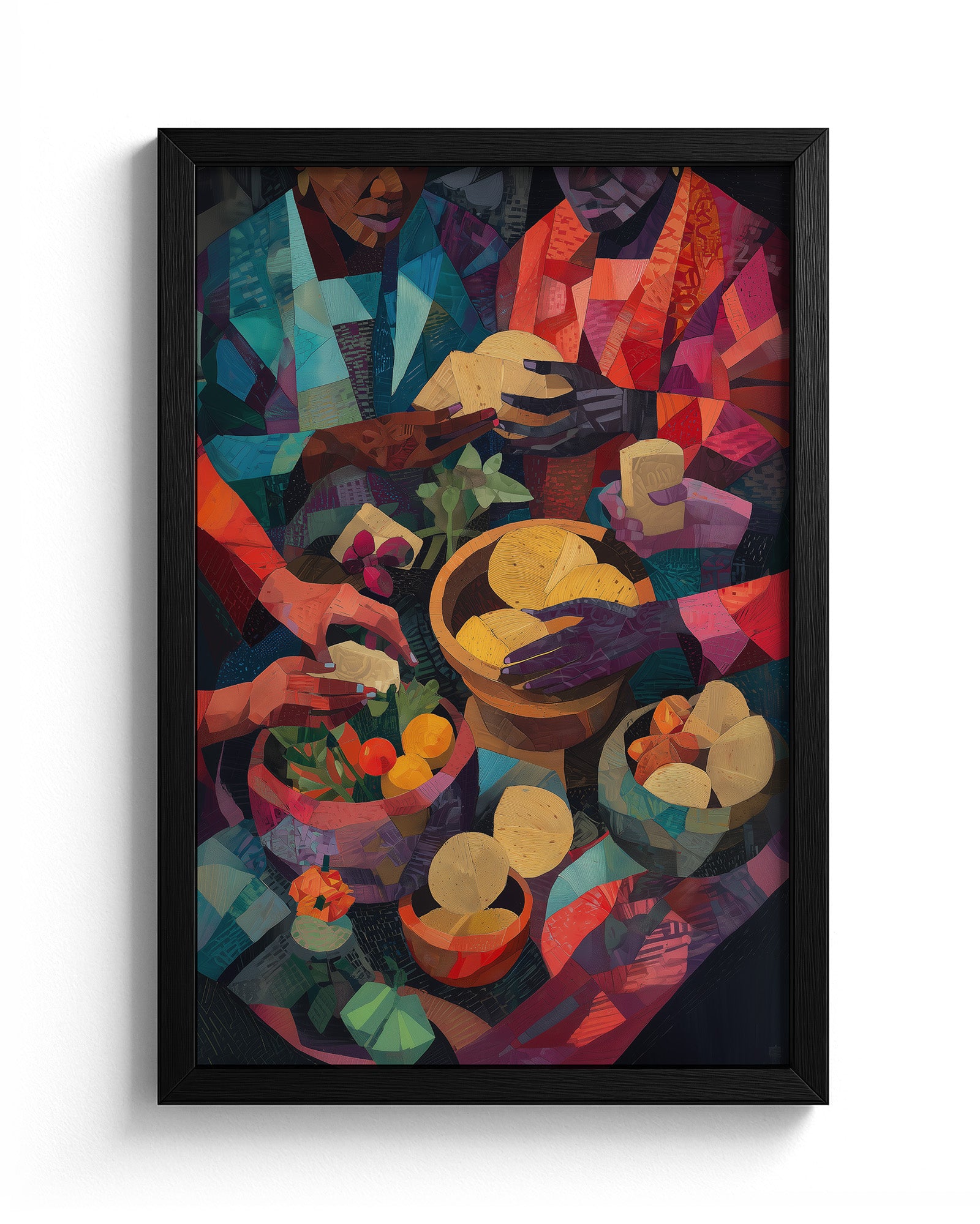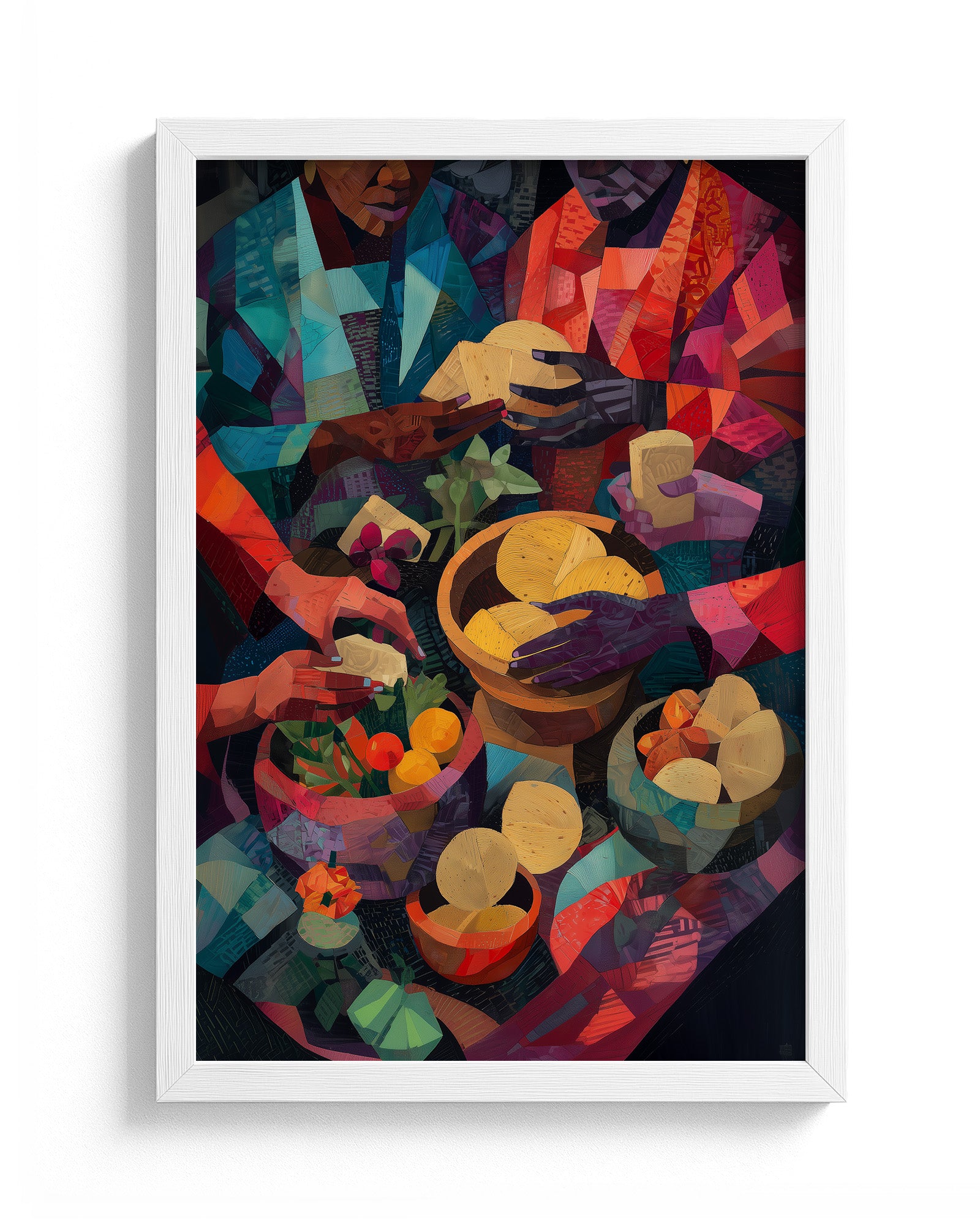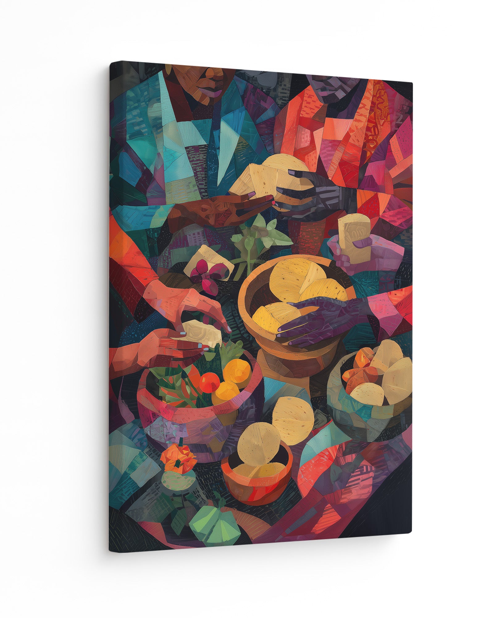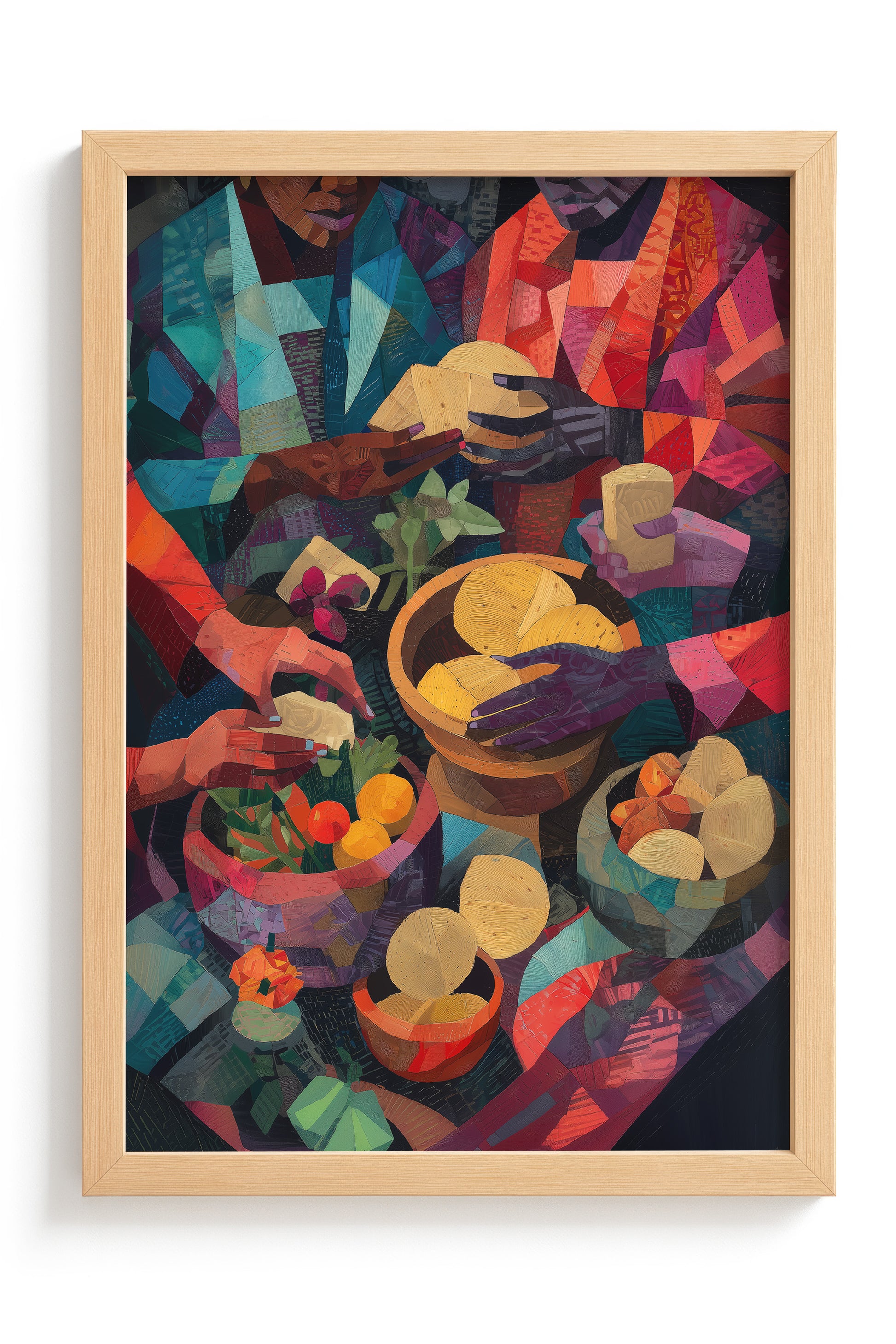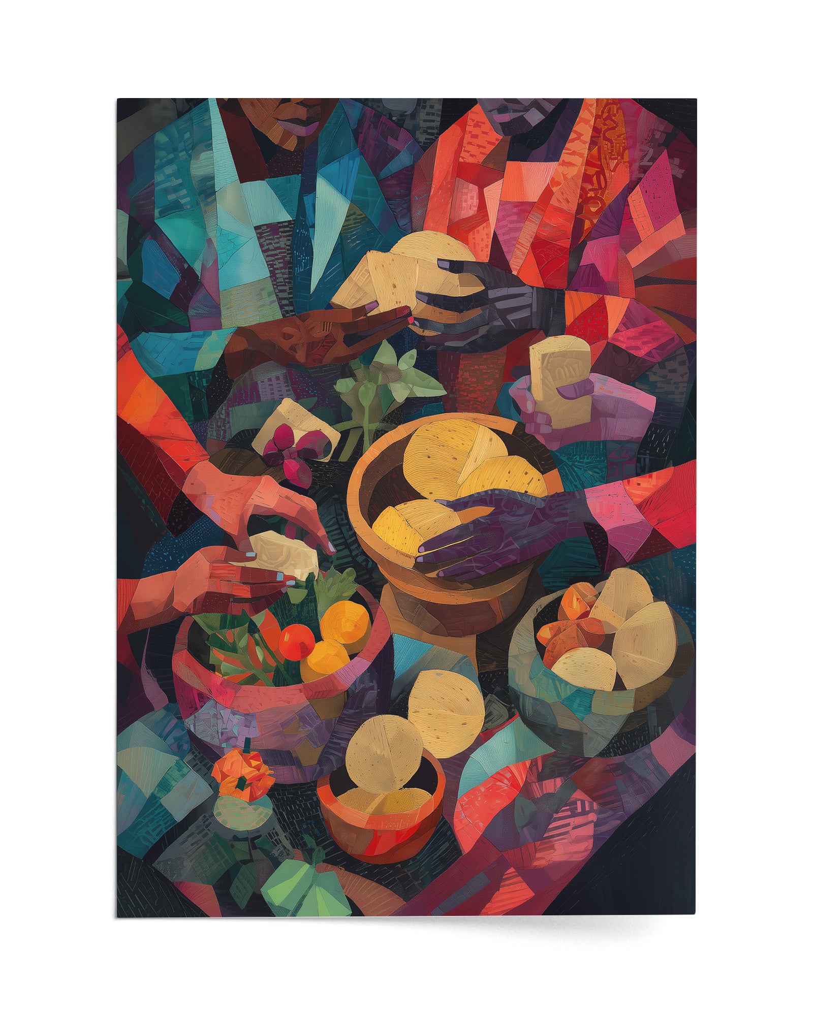 A vibrant cubist-inspired painting of African women preparing food, their hands working gracefully over bowls of fruits, vegetables, grains, and breads. Richly textured with warm tones of red, gold, green, and indigo, the artwork celebrates Yoruba culinary traditions, community, and the artistry of nourishment.