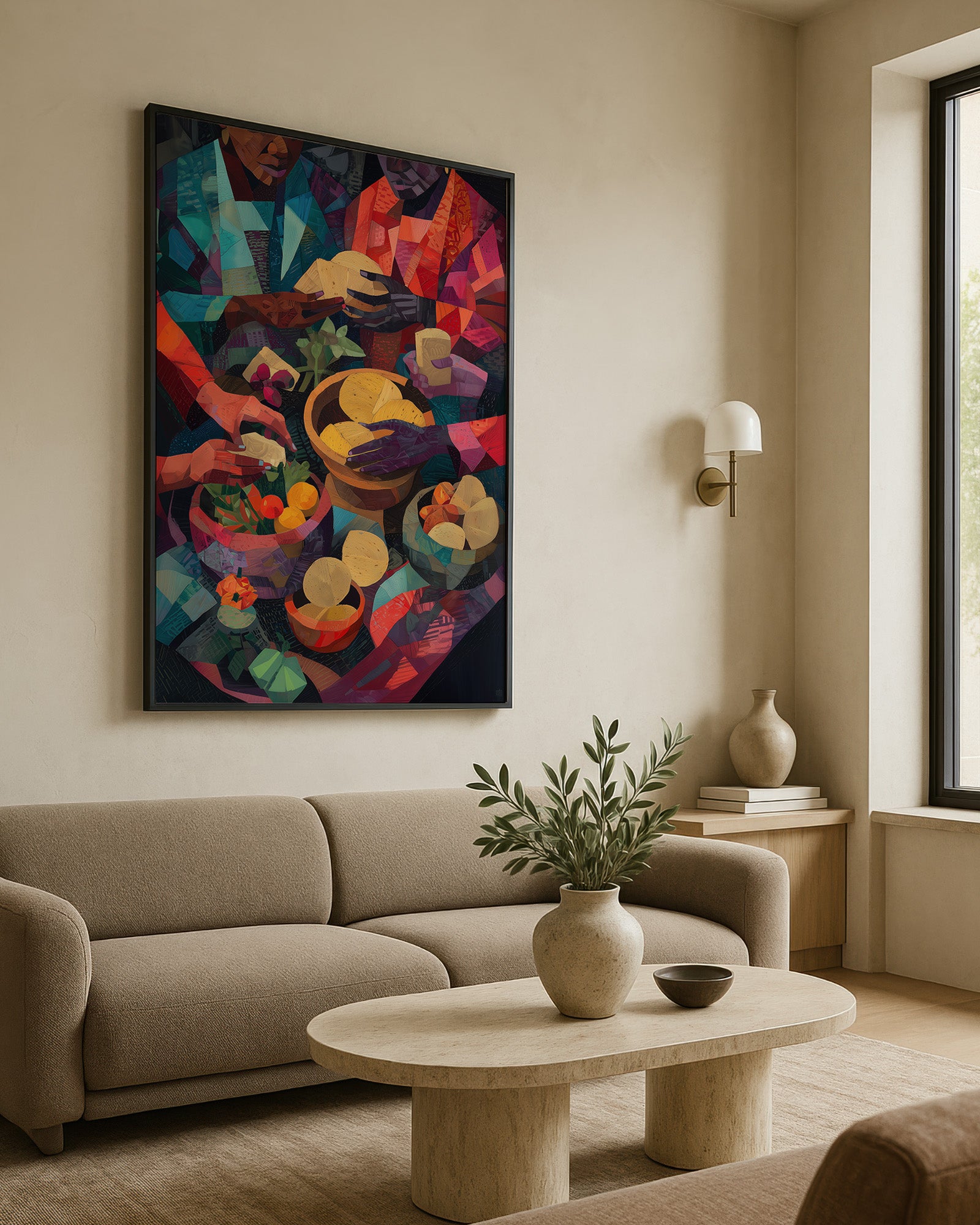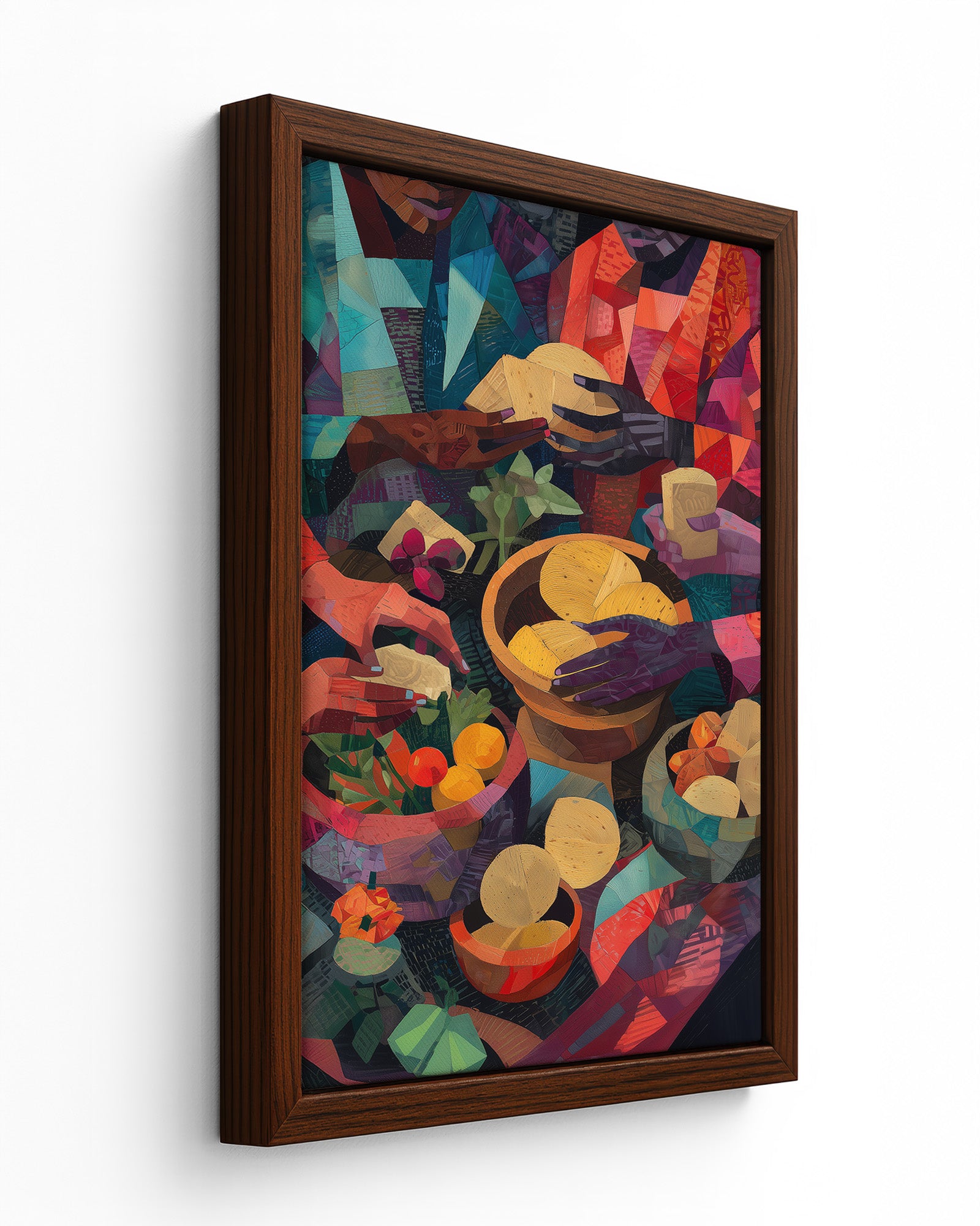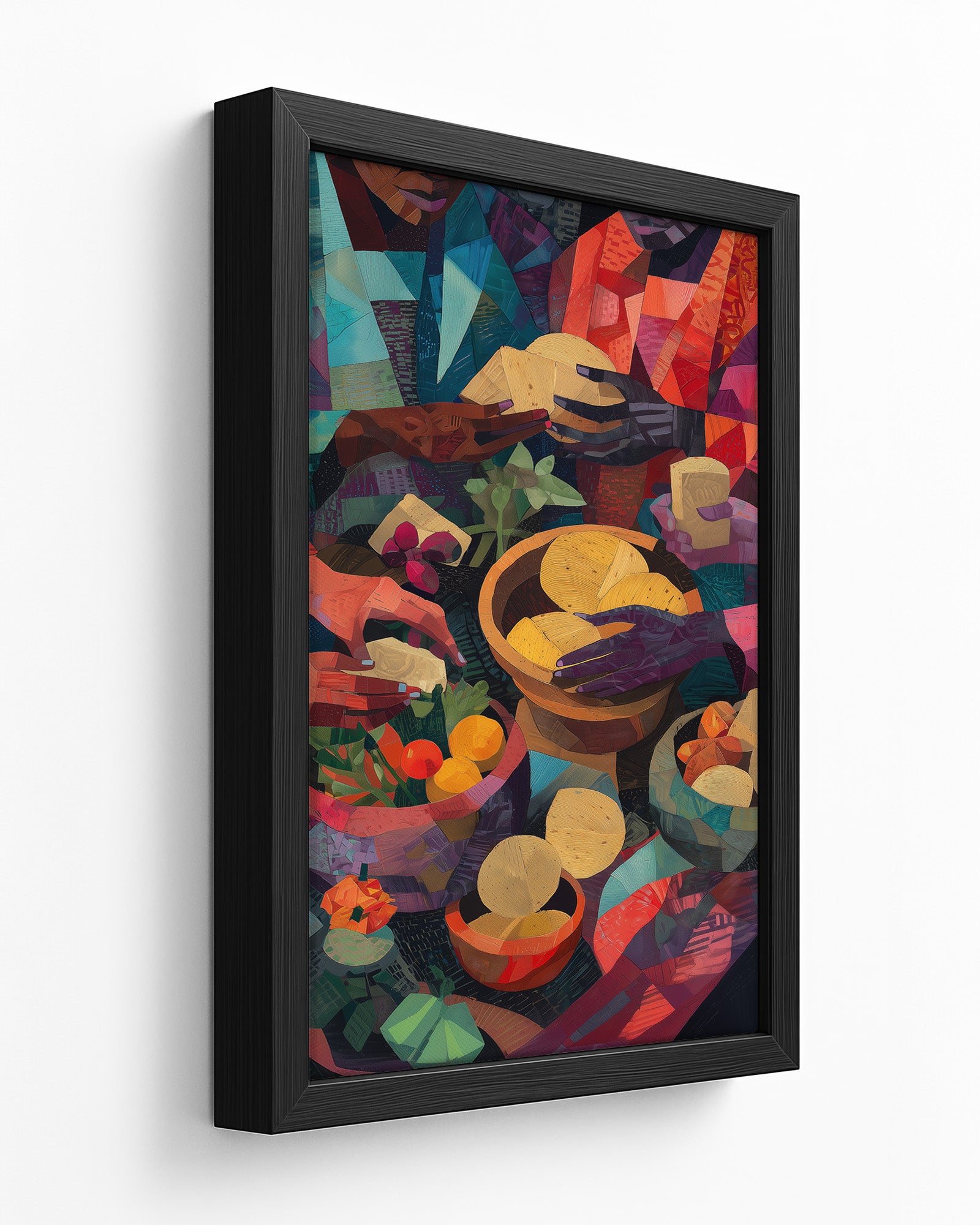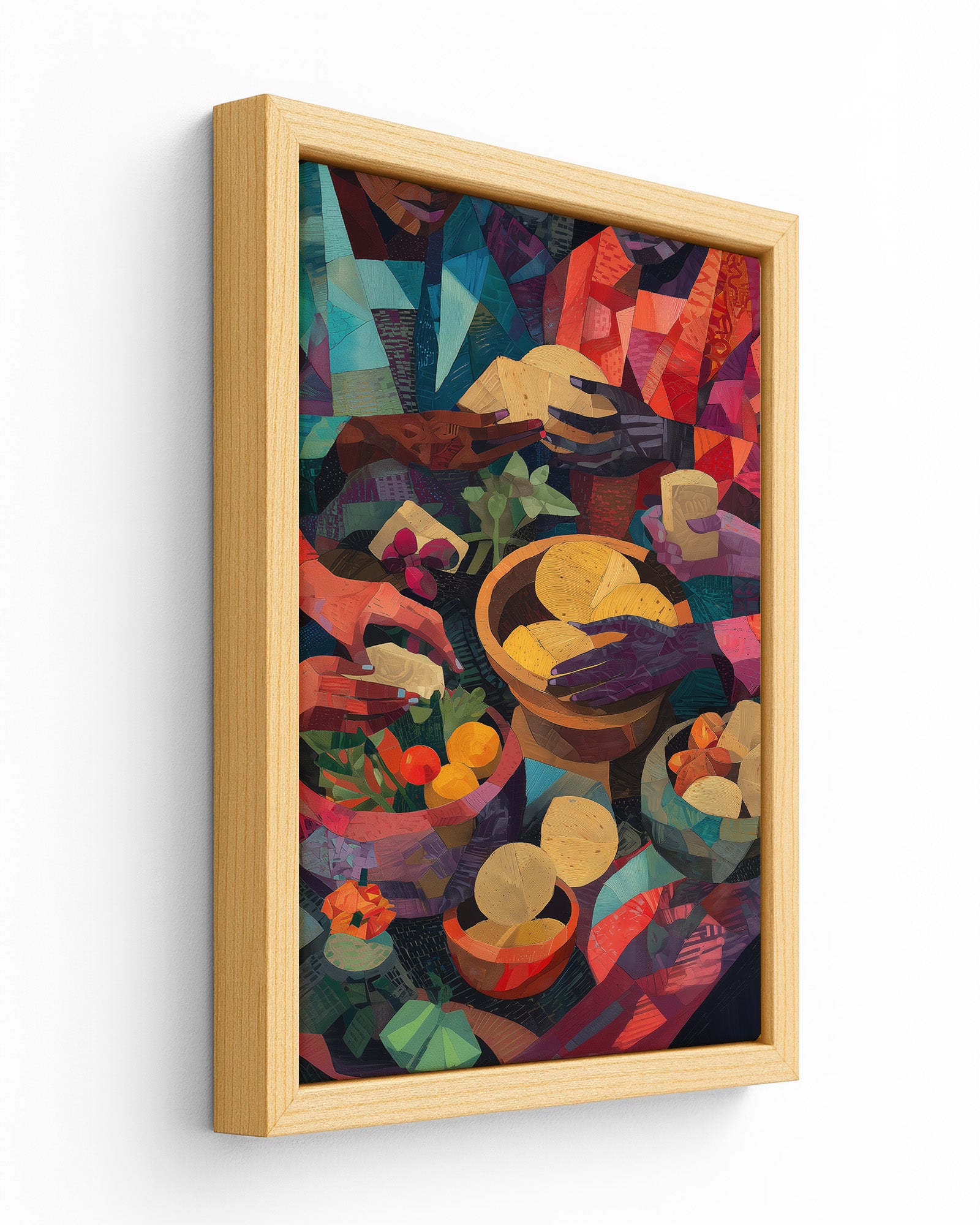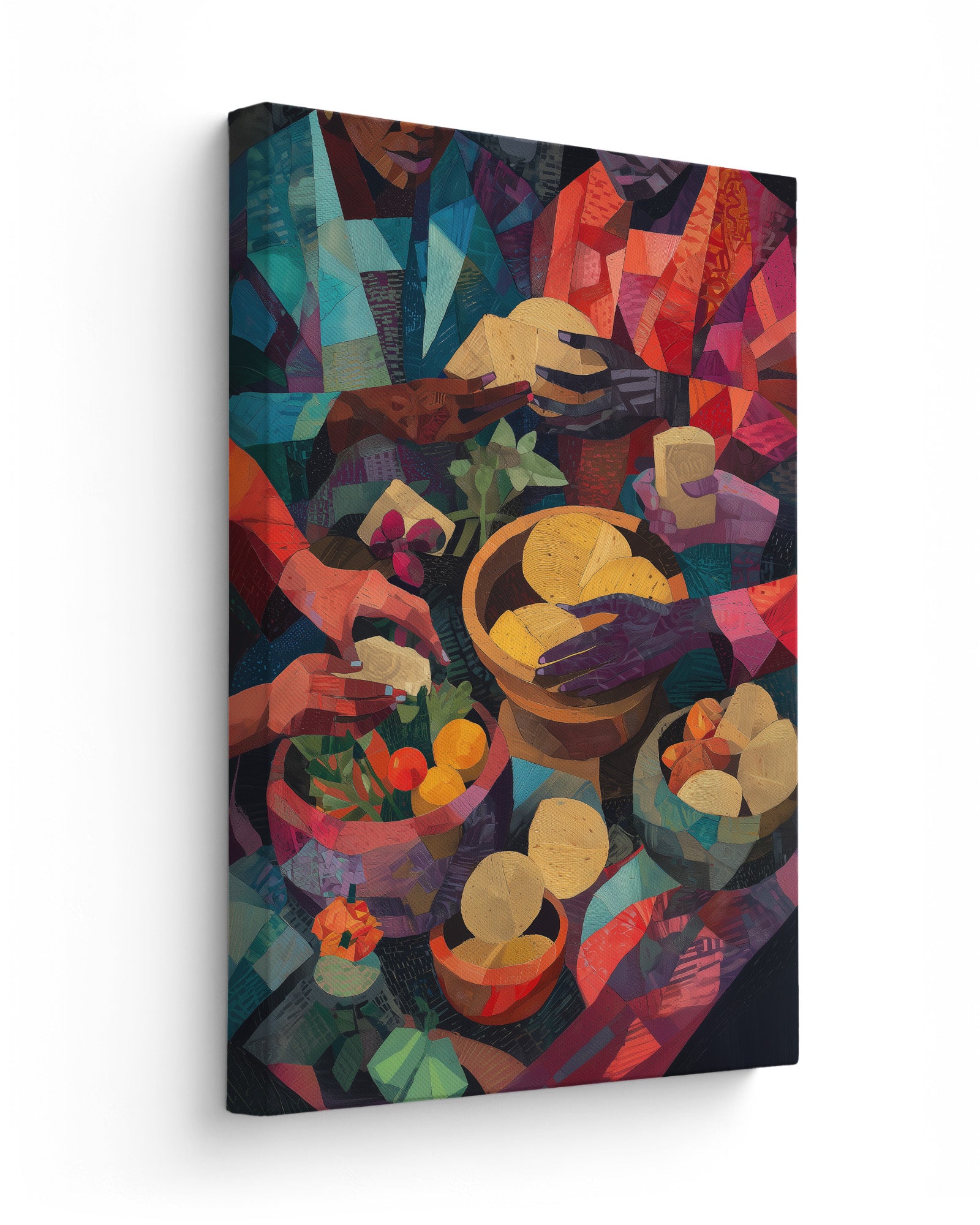 A vibrant cubist-inspired painting of African women preparing food, their hands working gracefully over bowls of fruits, vegetables, grains, and breads. Richly textured with warm tones of red, gold, green, and indigo, the artwork celebrates Yoruba culinary traditions, community, and the artistry of nourishment.