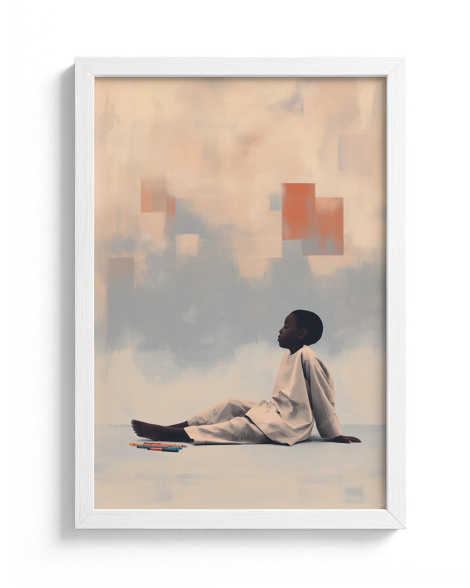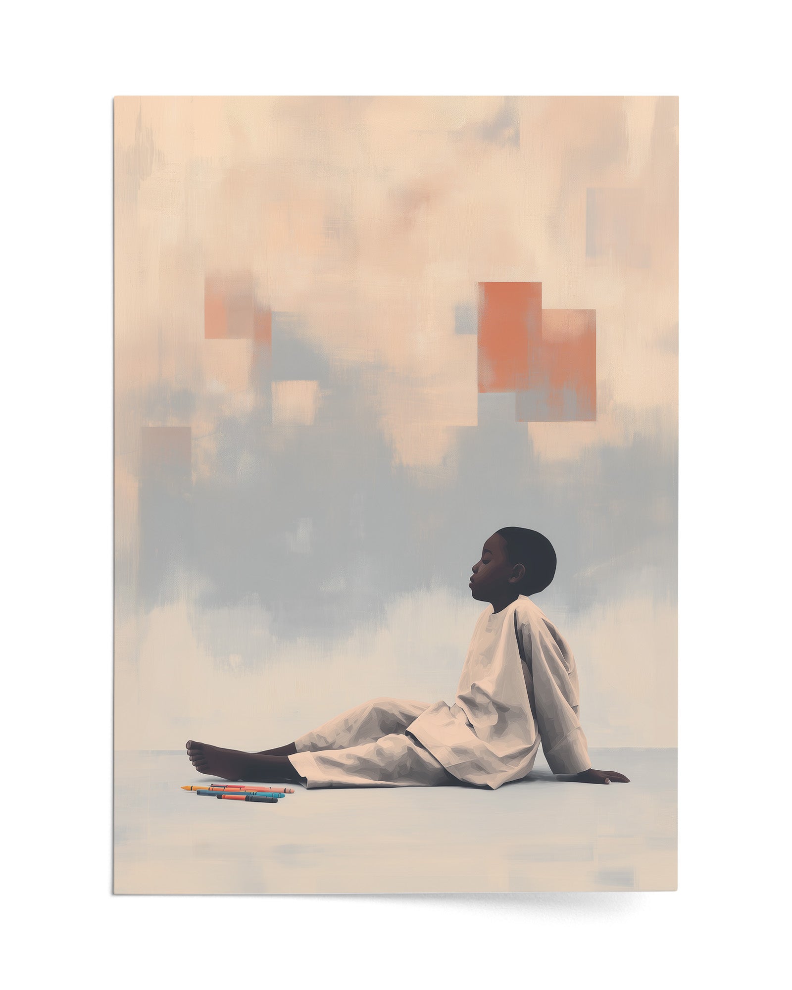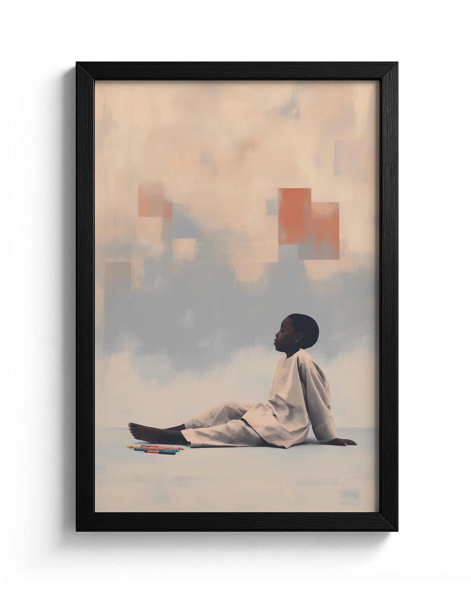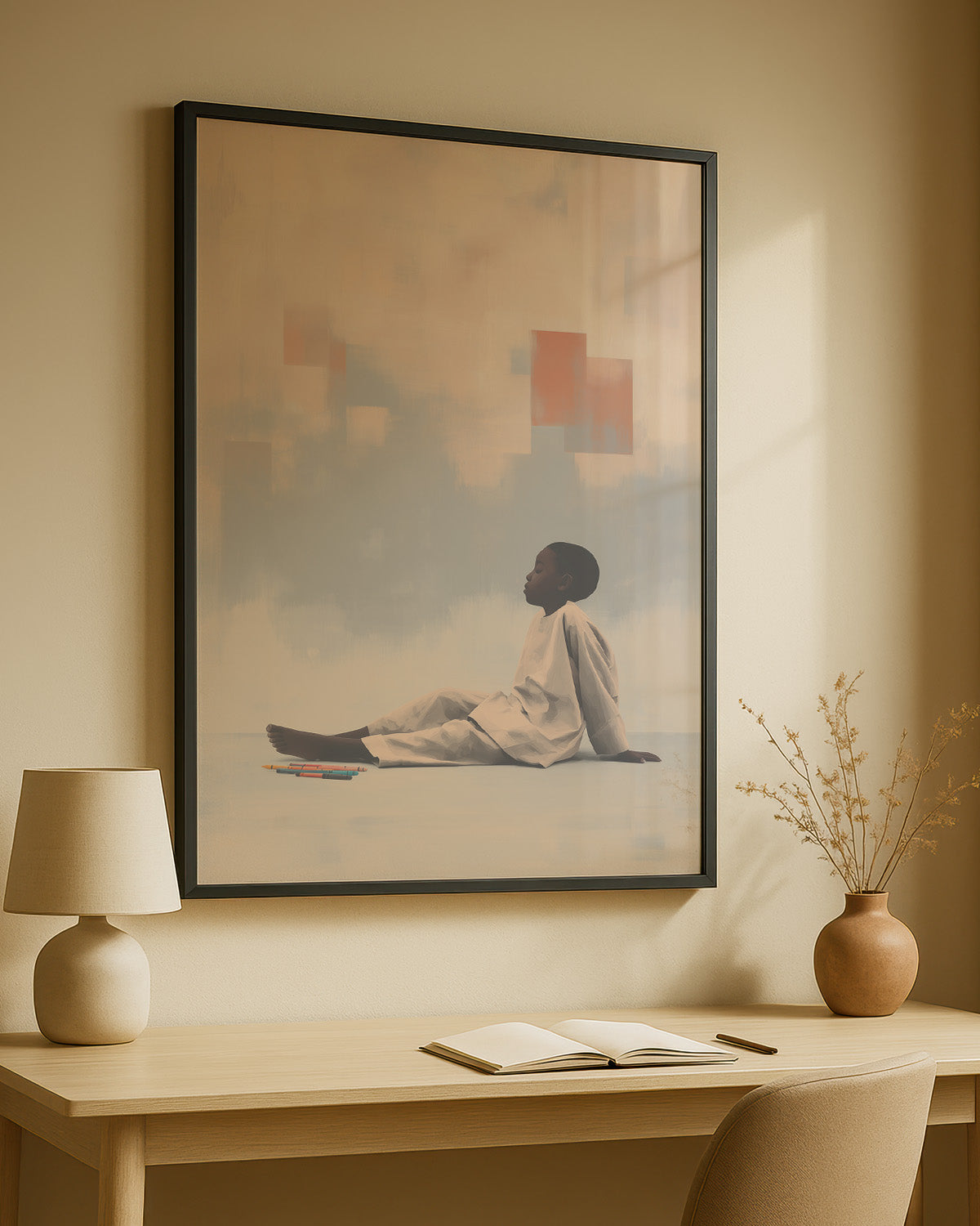 Quiet Creation: Contemporary Art Exploring Childhood Imagination, Domestic Sanctuary, and Creative Agency. This intimate composition merges the vulnerability of childhood with the boundless potential of artistic expression, transforming a simple moment of crayon and paper into profound meditation on how children shape their worlds through imagination.