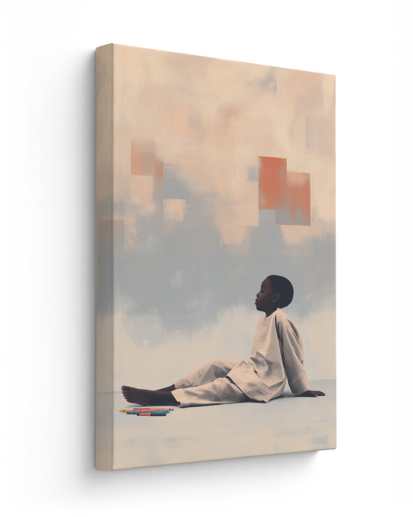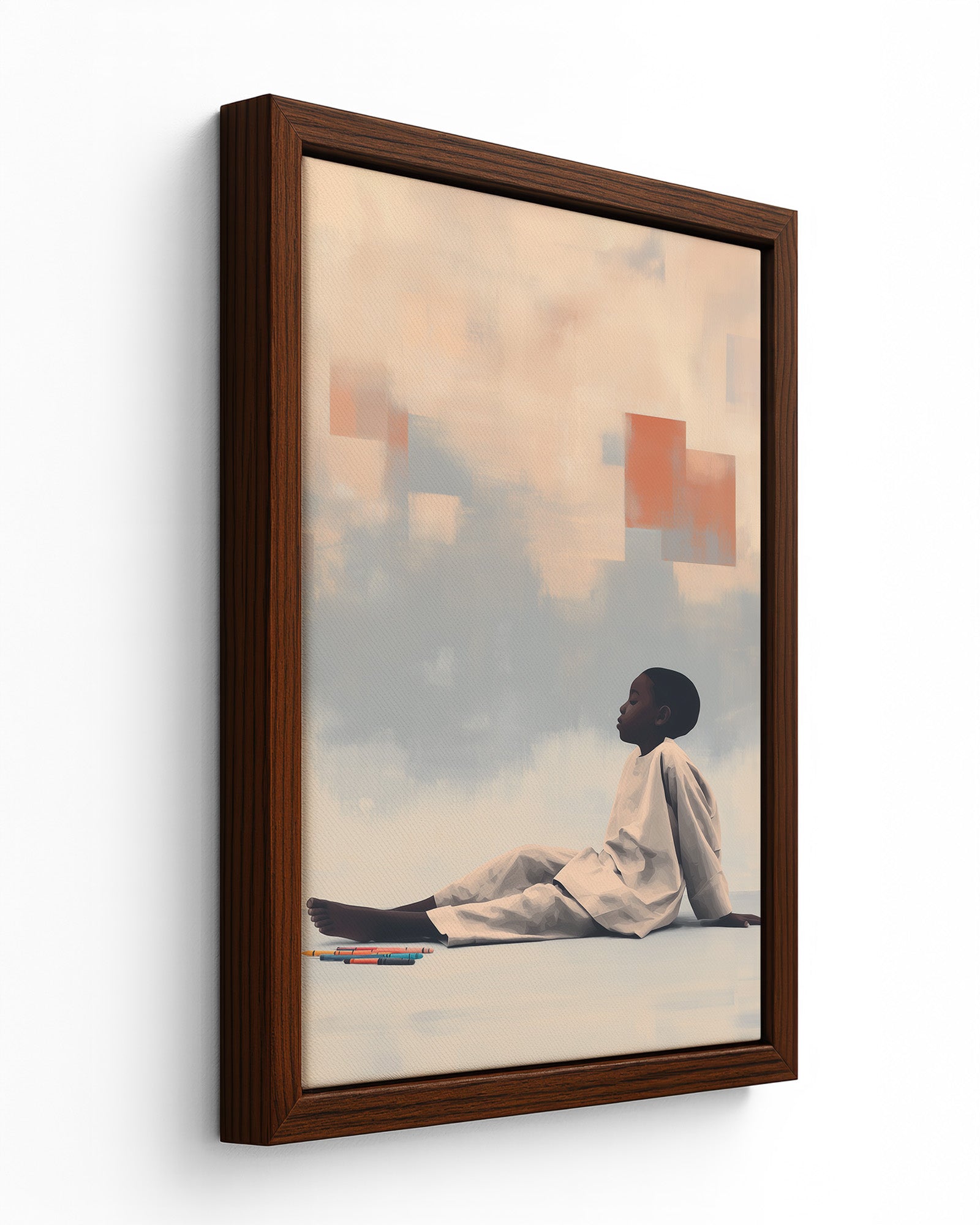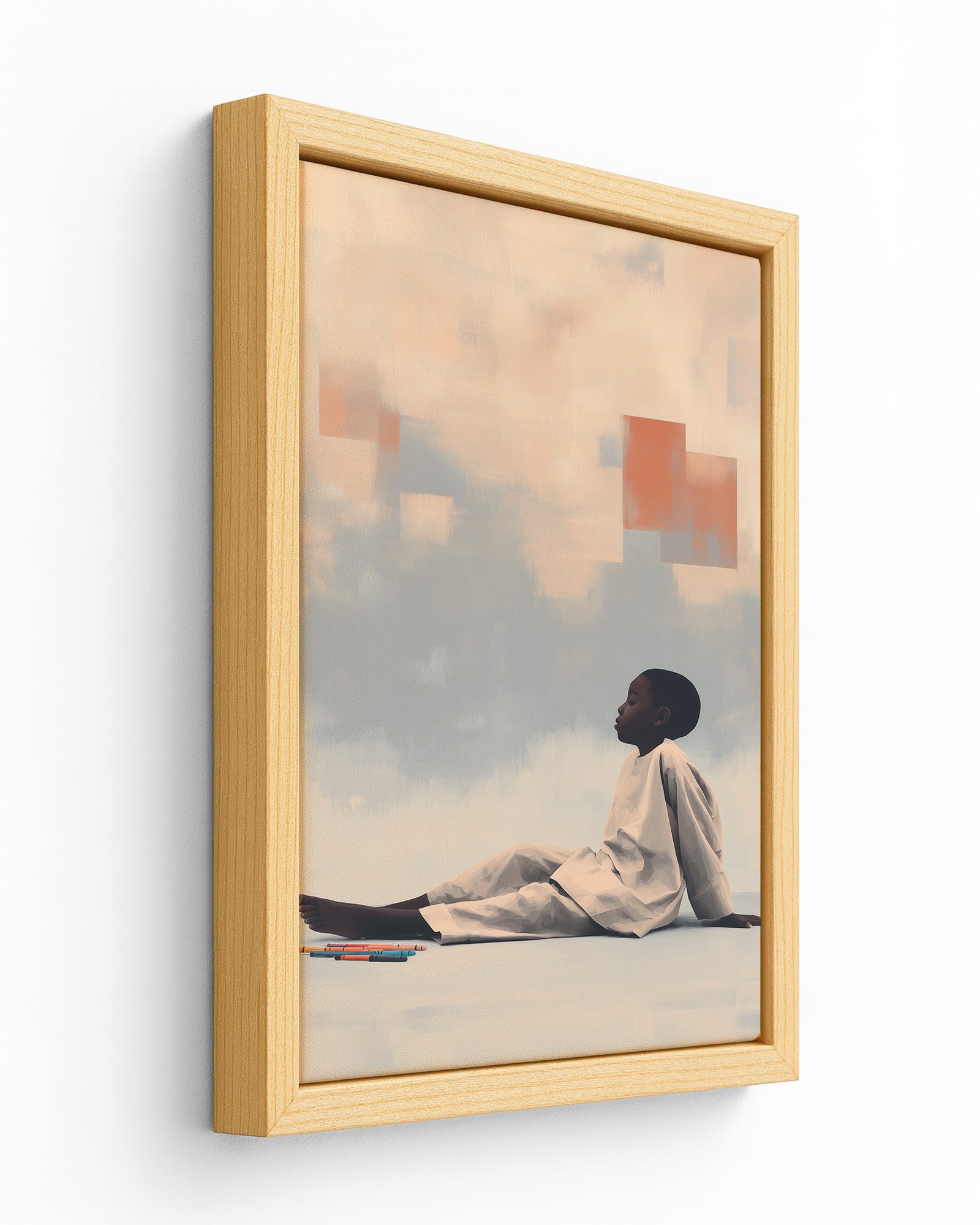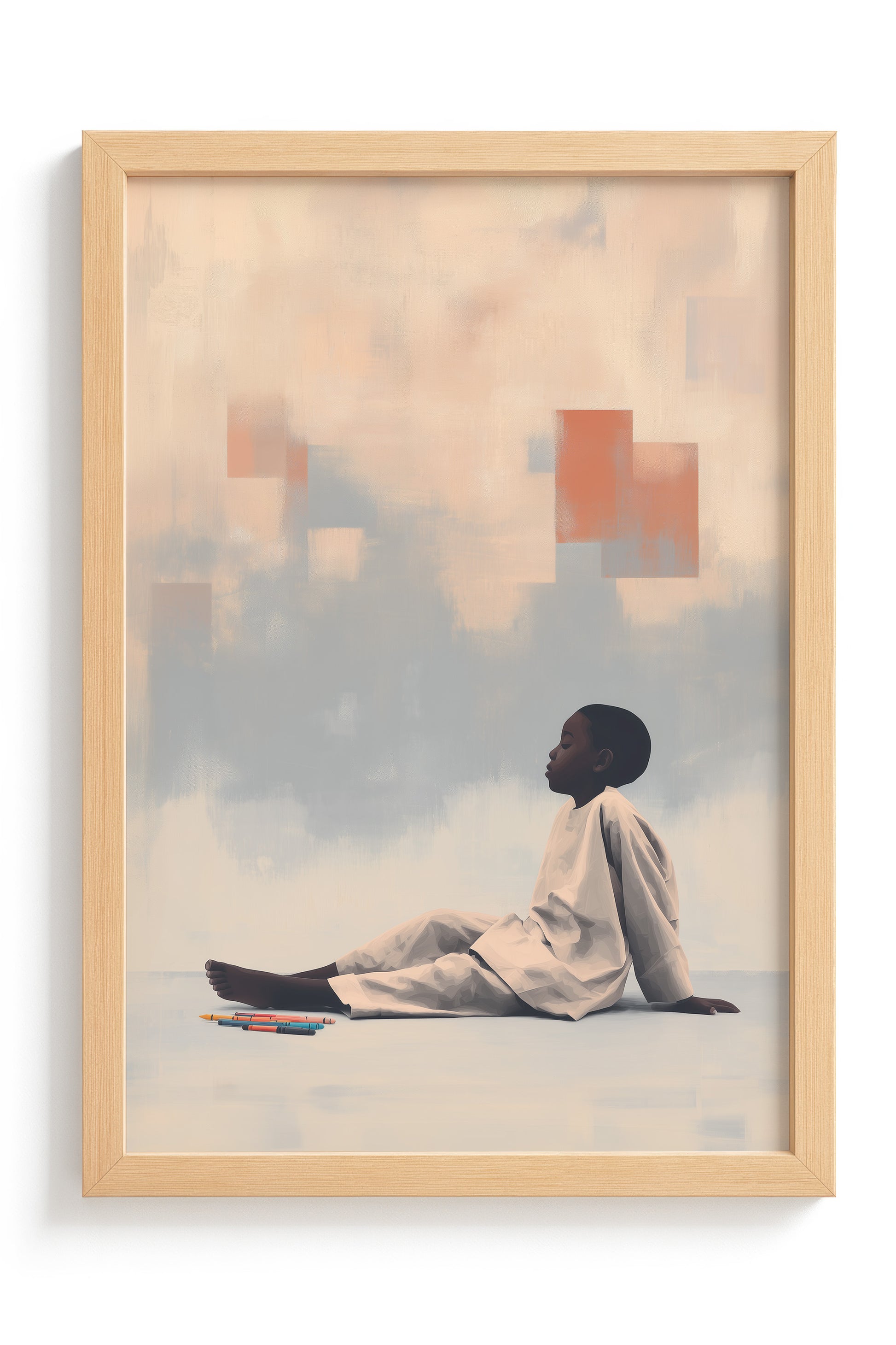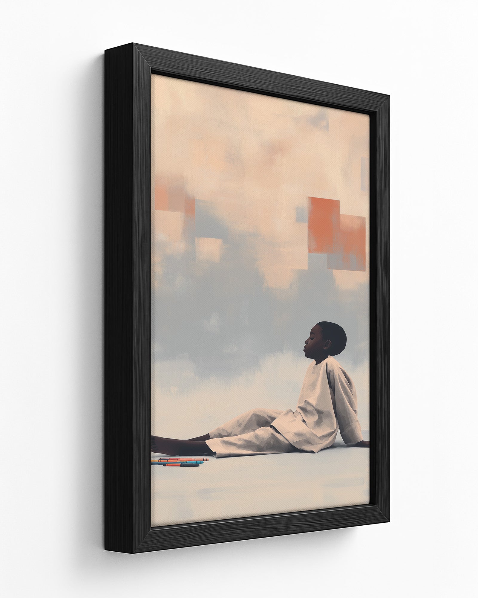 Quiet Creation: Contemporary Art Exploring Childhood Imagination, Domestic Sanctuary, and Creative Agency. This intimate composition merges the vulnerability of childhood with the boundless potential of artistic expression, transforming a simple moment of crayon and paper into profound meditation on how children shape their worlds through imagination.
