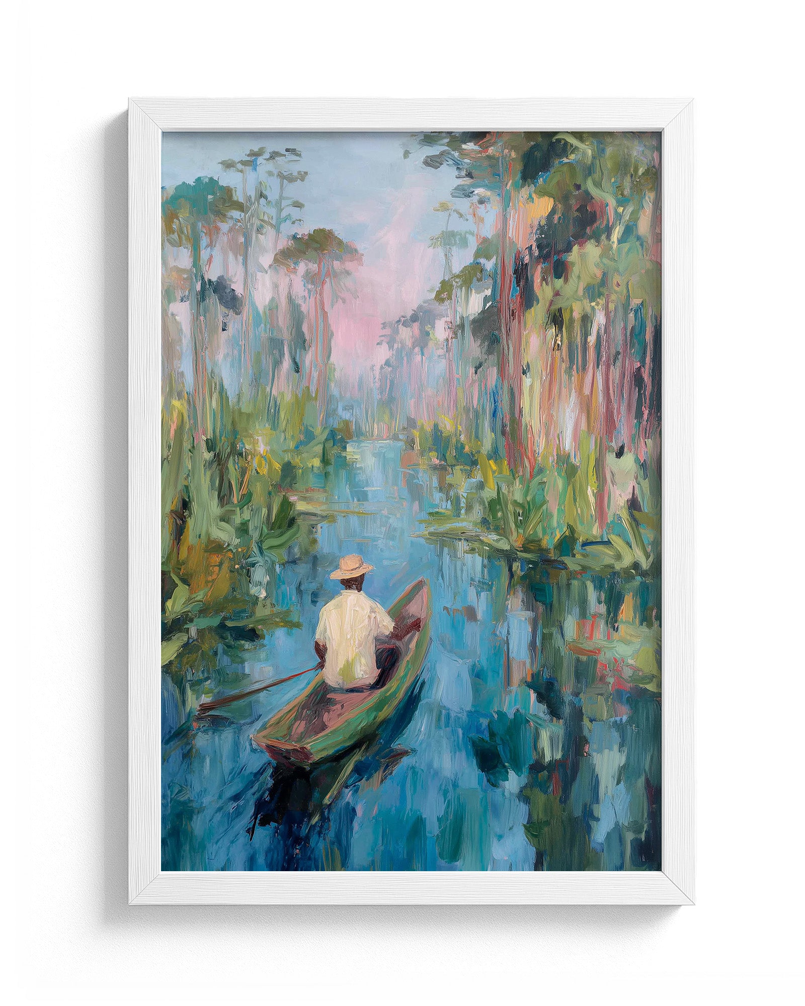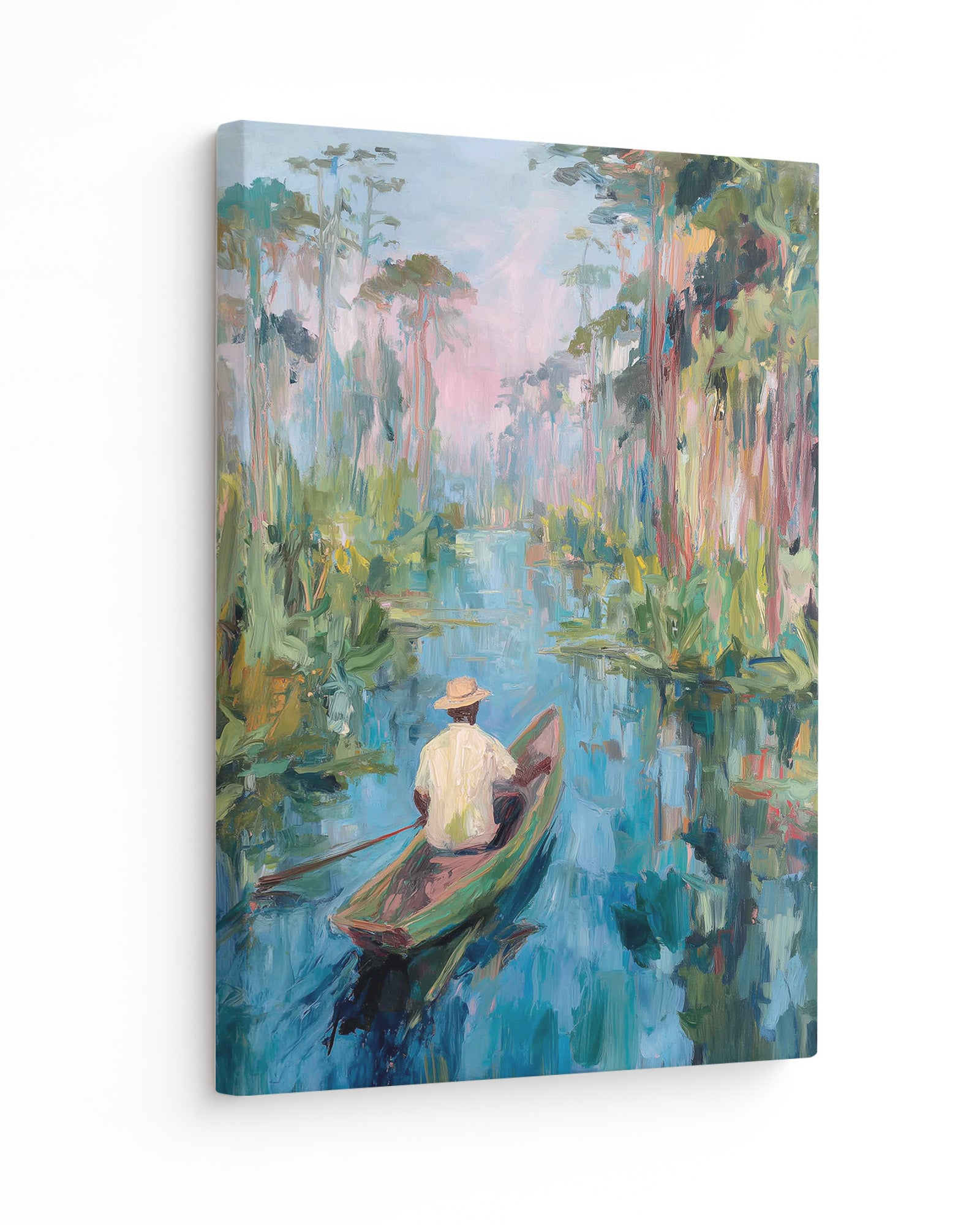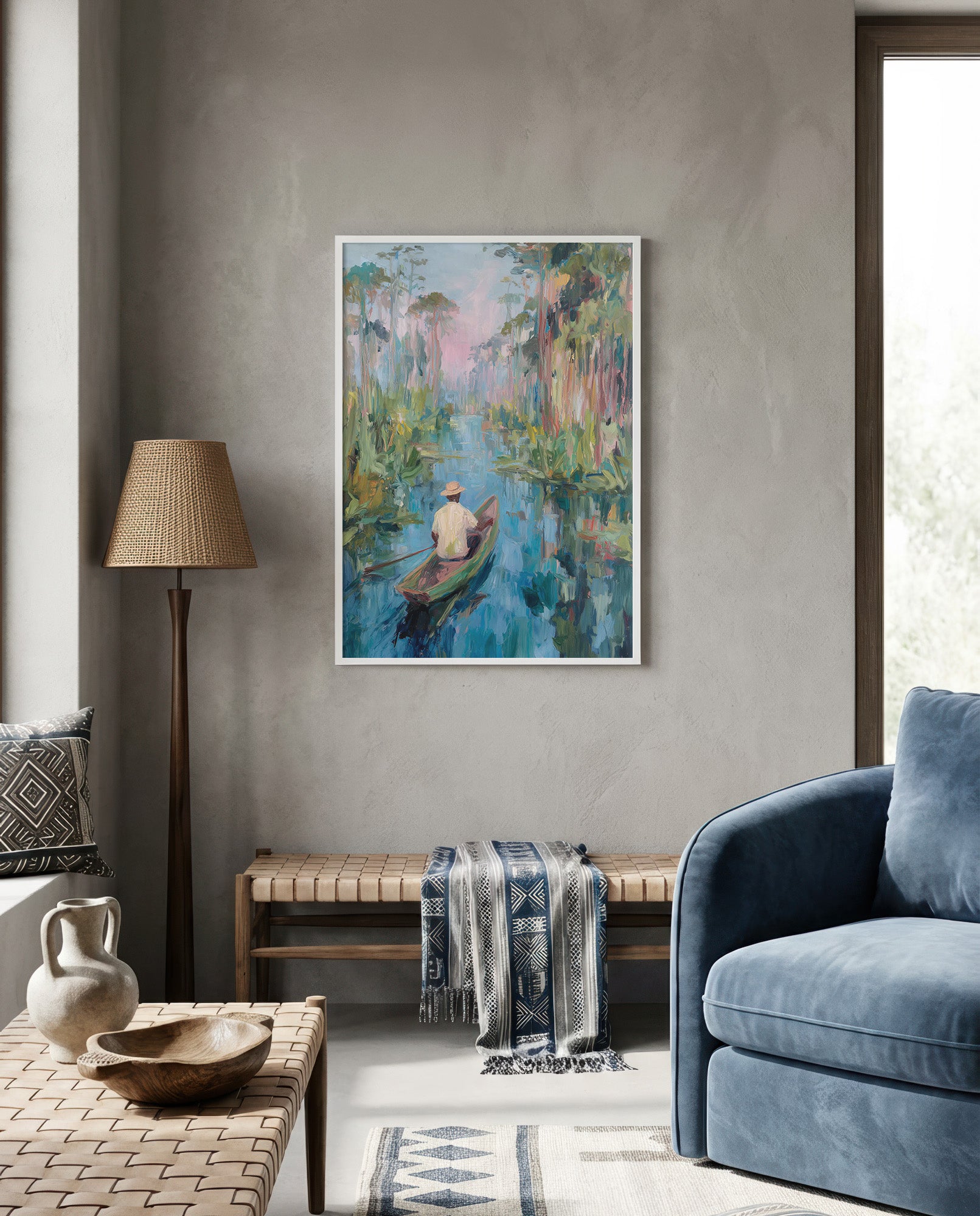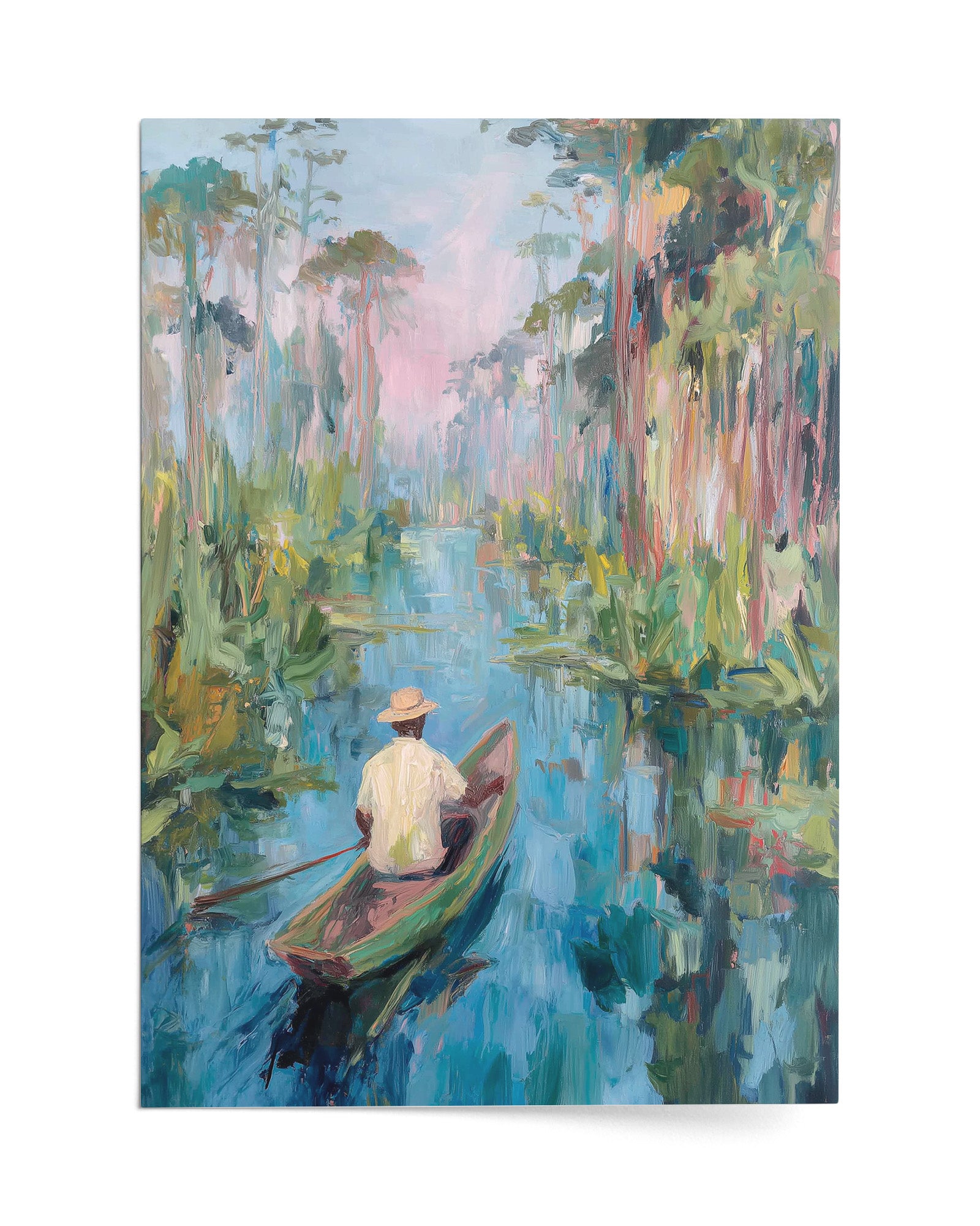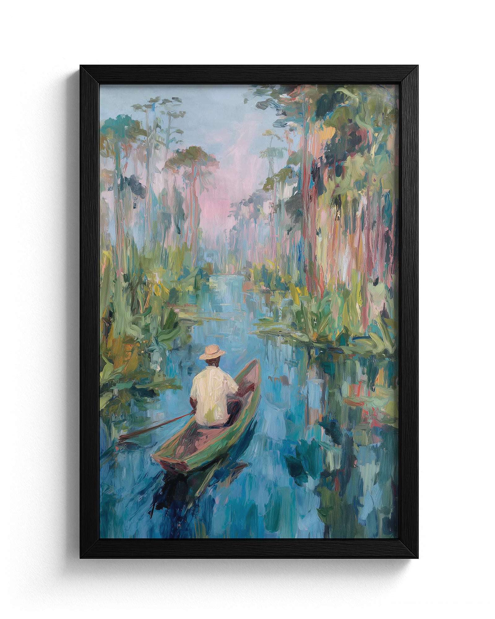 Congo Drift: Art on Congo Navigation, Embodied Waterway Knowledge, and the Luminous Beauty of Congo's Sacred Passage. This striking composition captures a boatman navigating the narrow, verdant channels of the Congo River, revealing how the Congo becomes landscape of infinite possibility and ancestral knowledge.