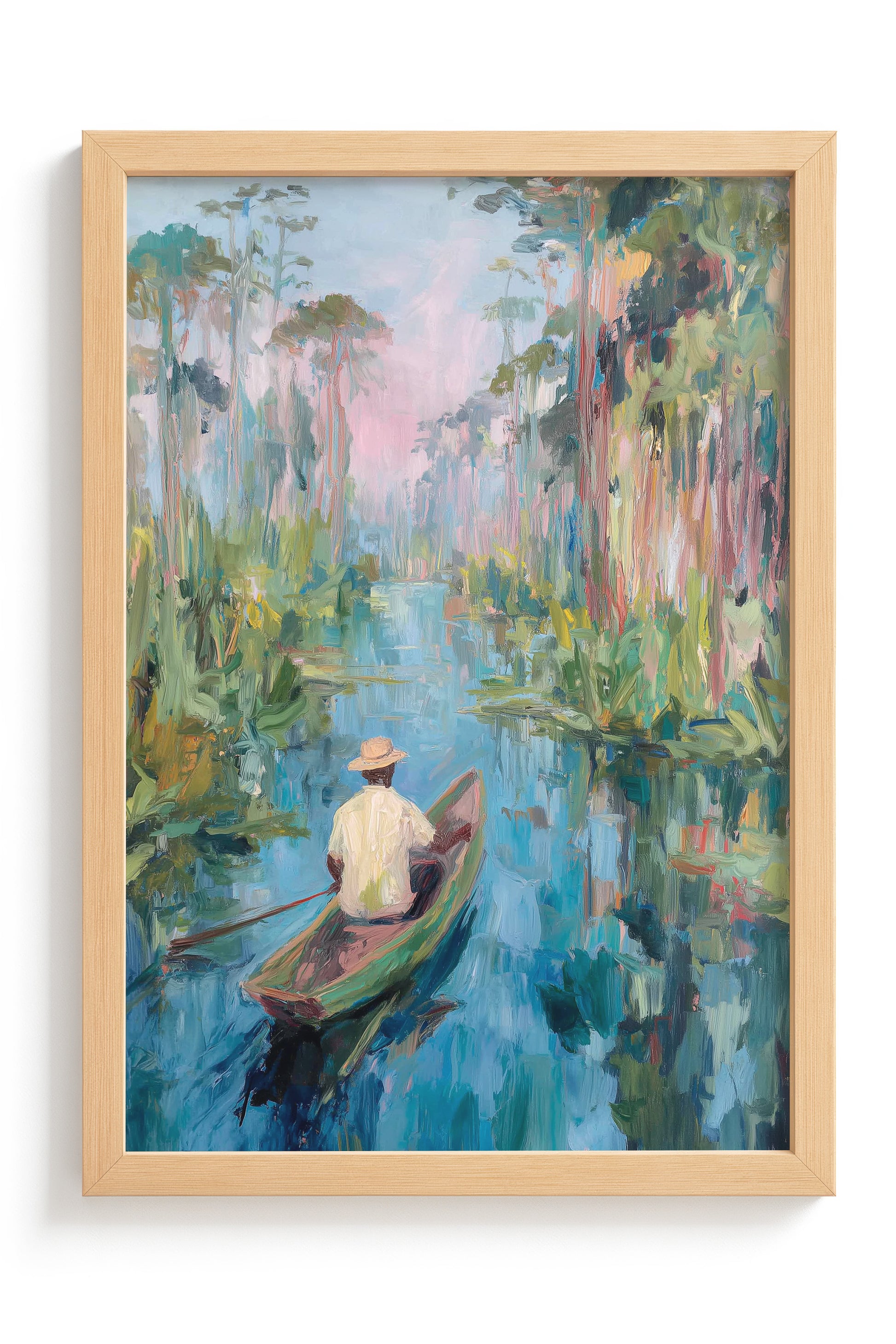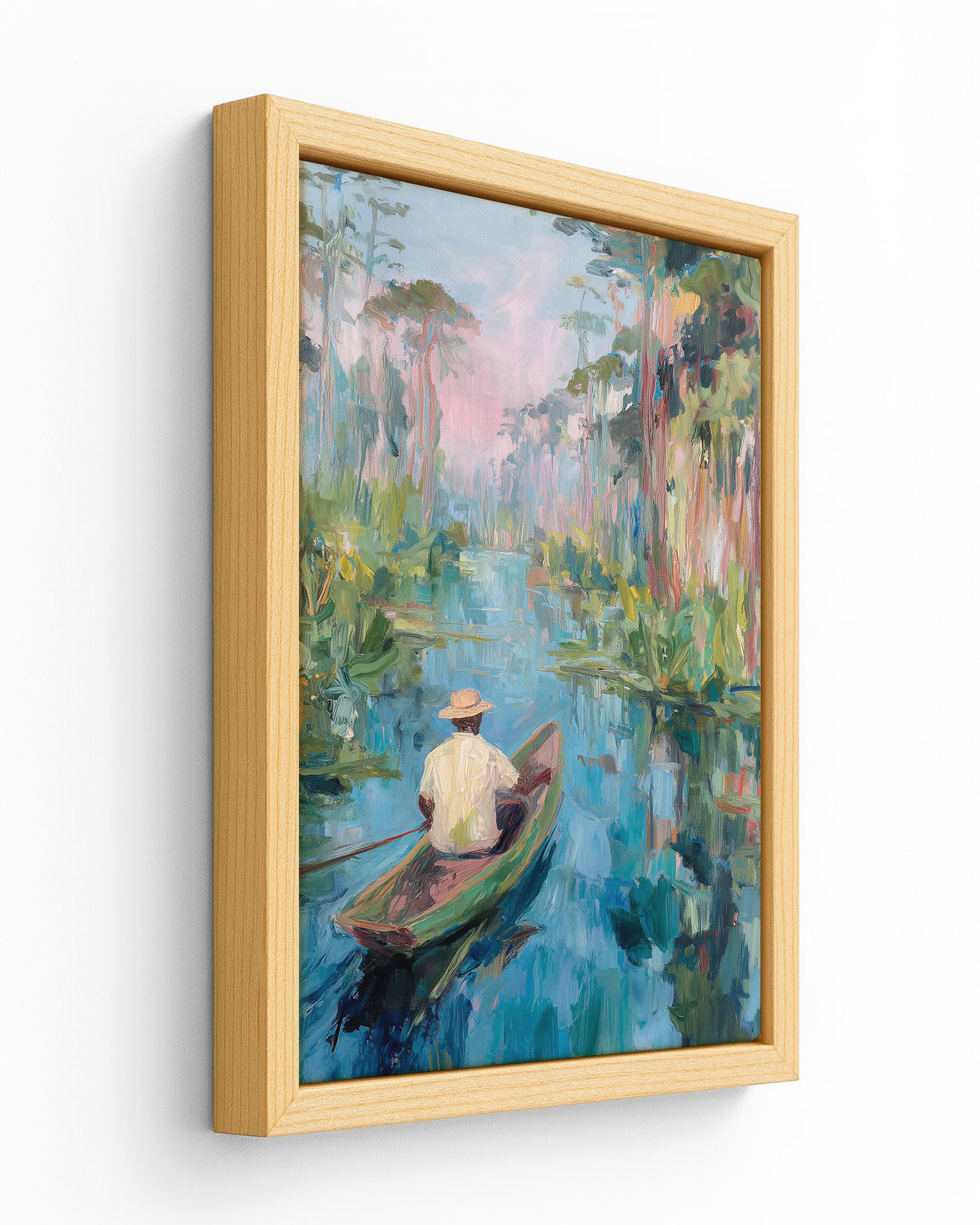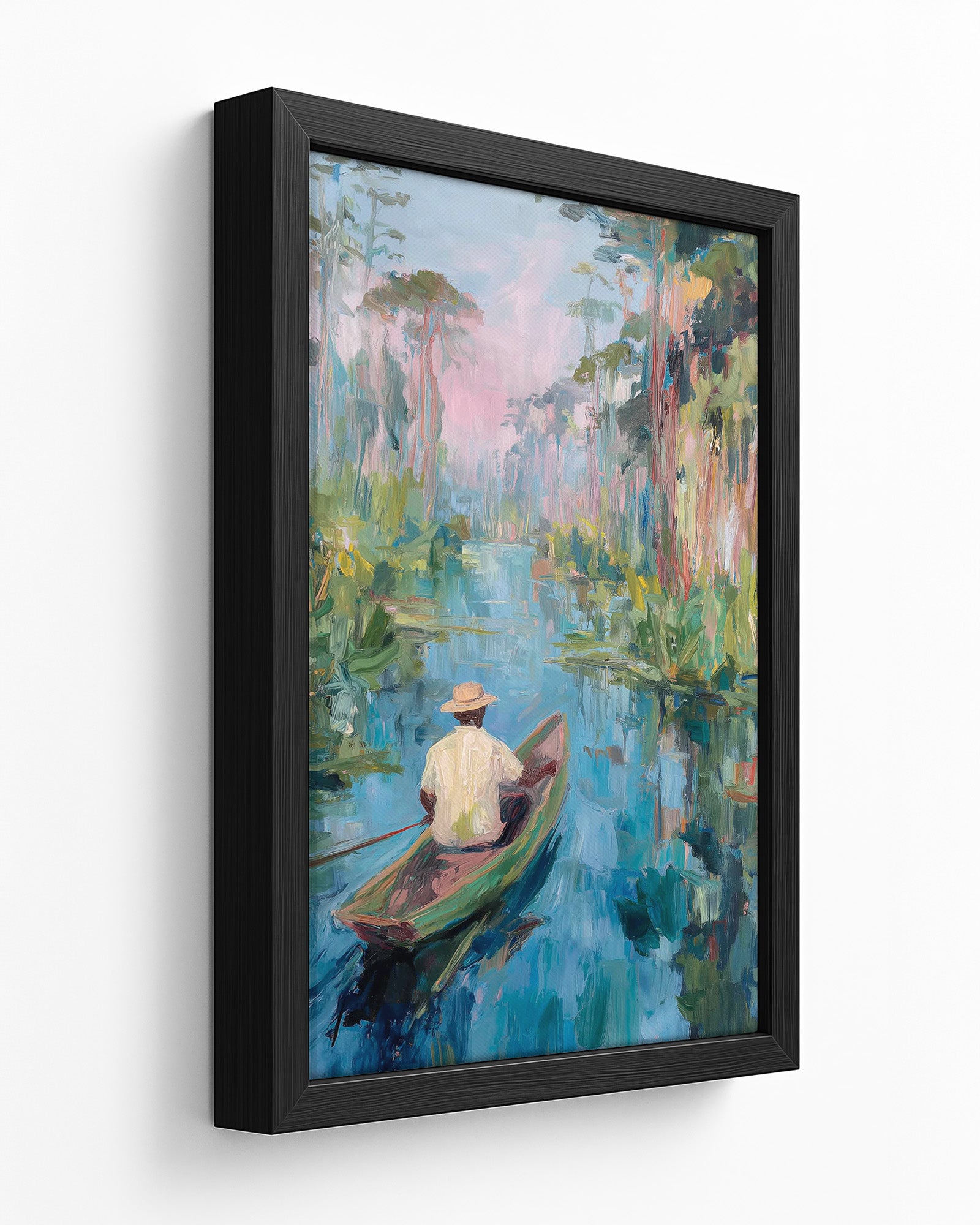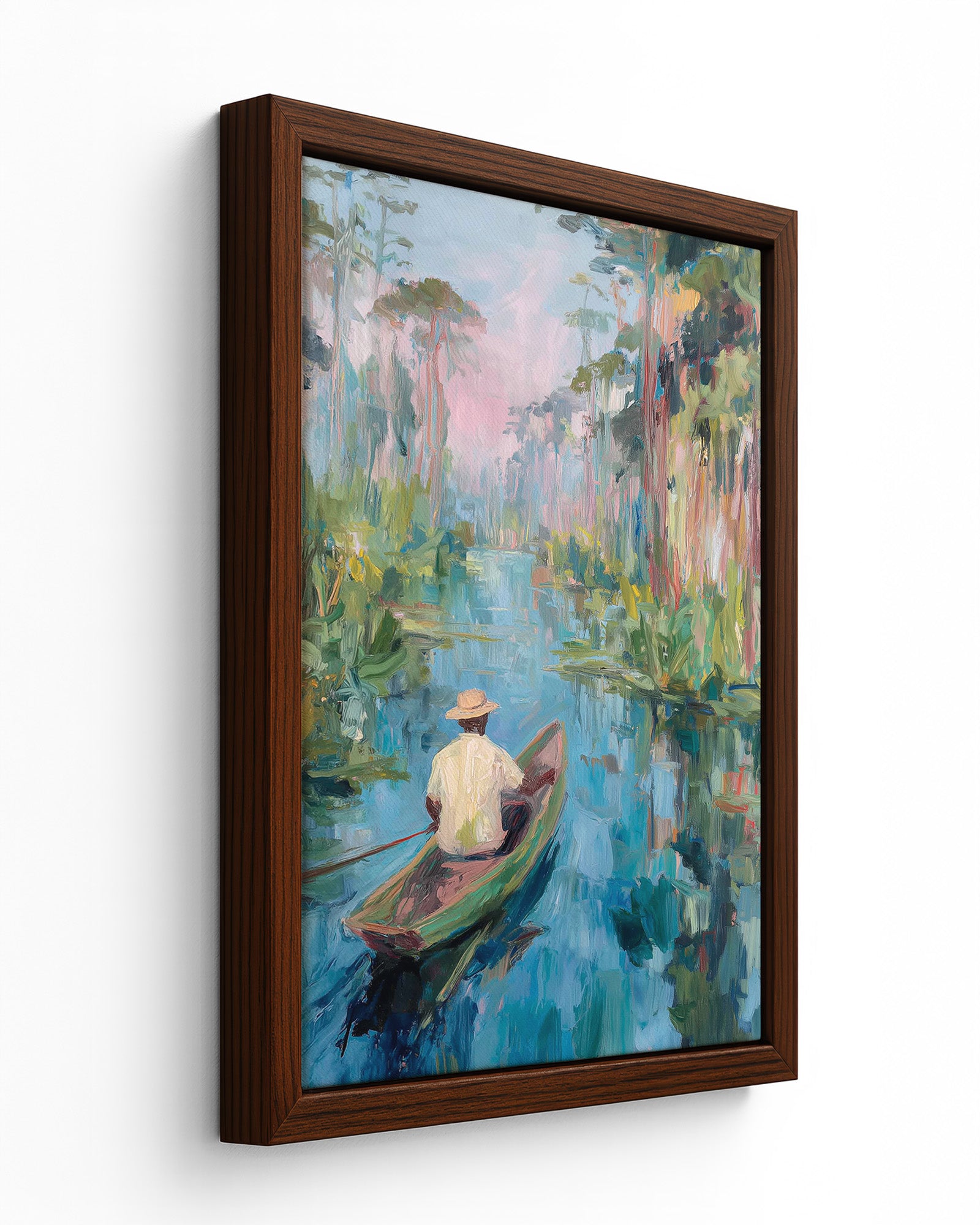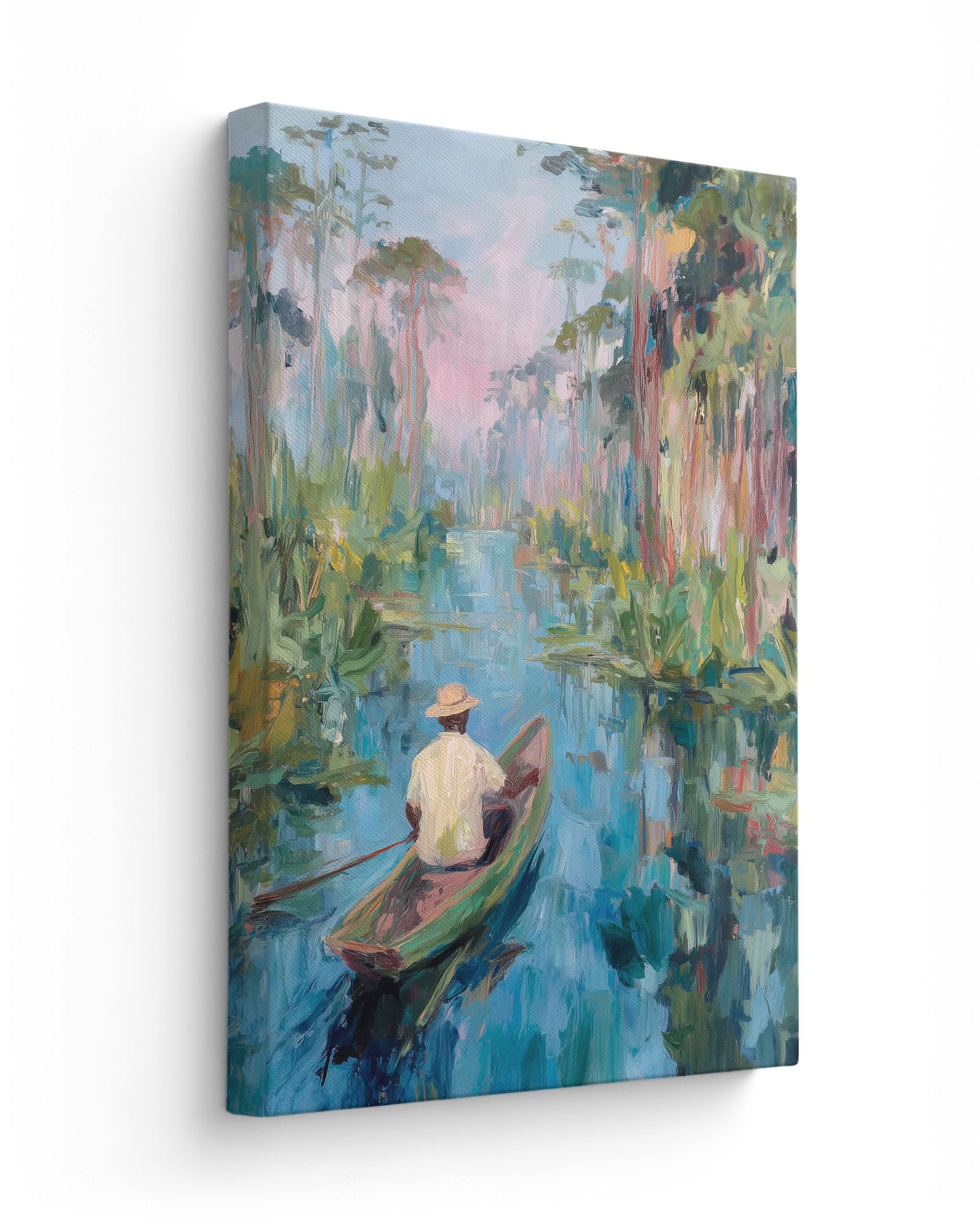 Congo Drift: Art on Congo Navigation, Embodied Waterway Knowledge, and the Luminous Beauty of Congo's Sacred Passage. This striking composition captures a boatman navigating the narrow, verdant channels of the Congo River, revealing how the Congo becomes landscape of infinite possibility and ancestral knowledge.