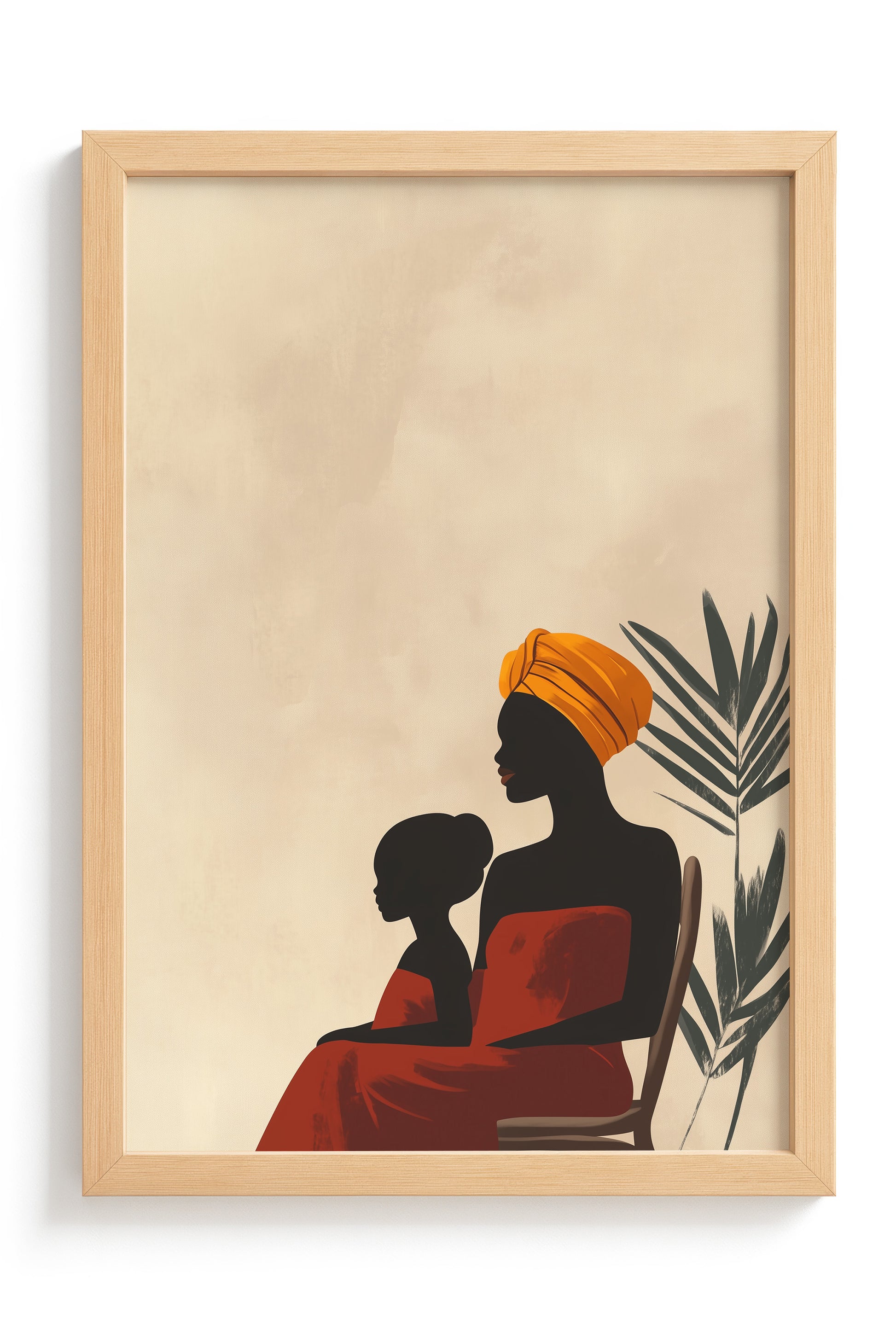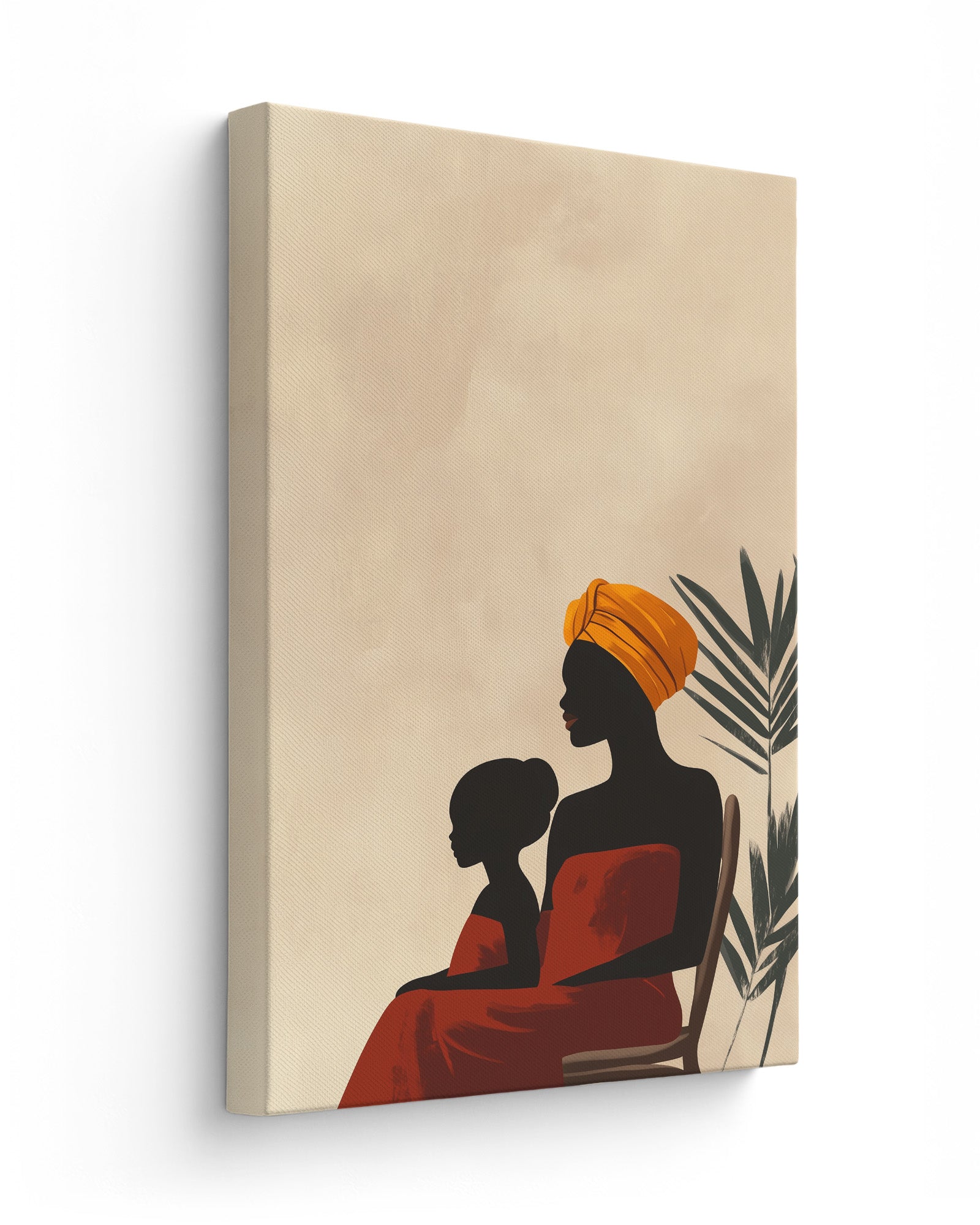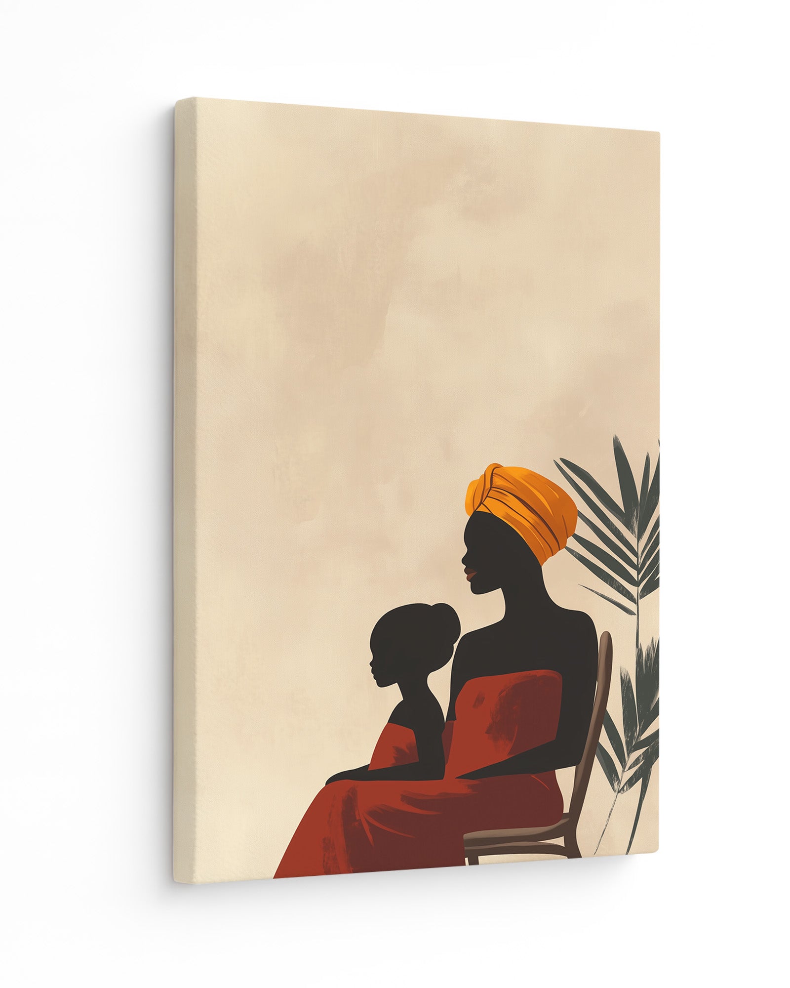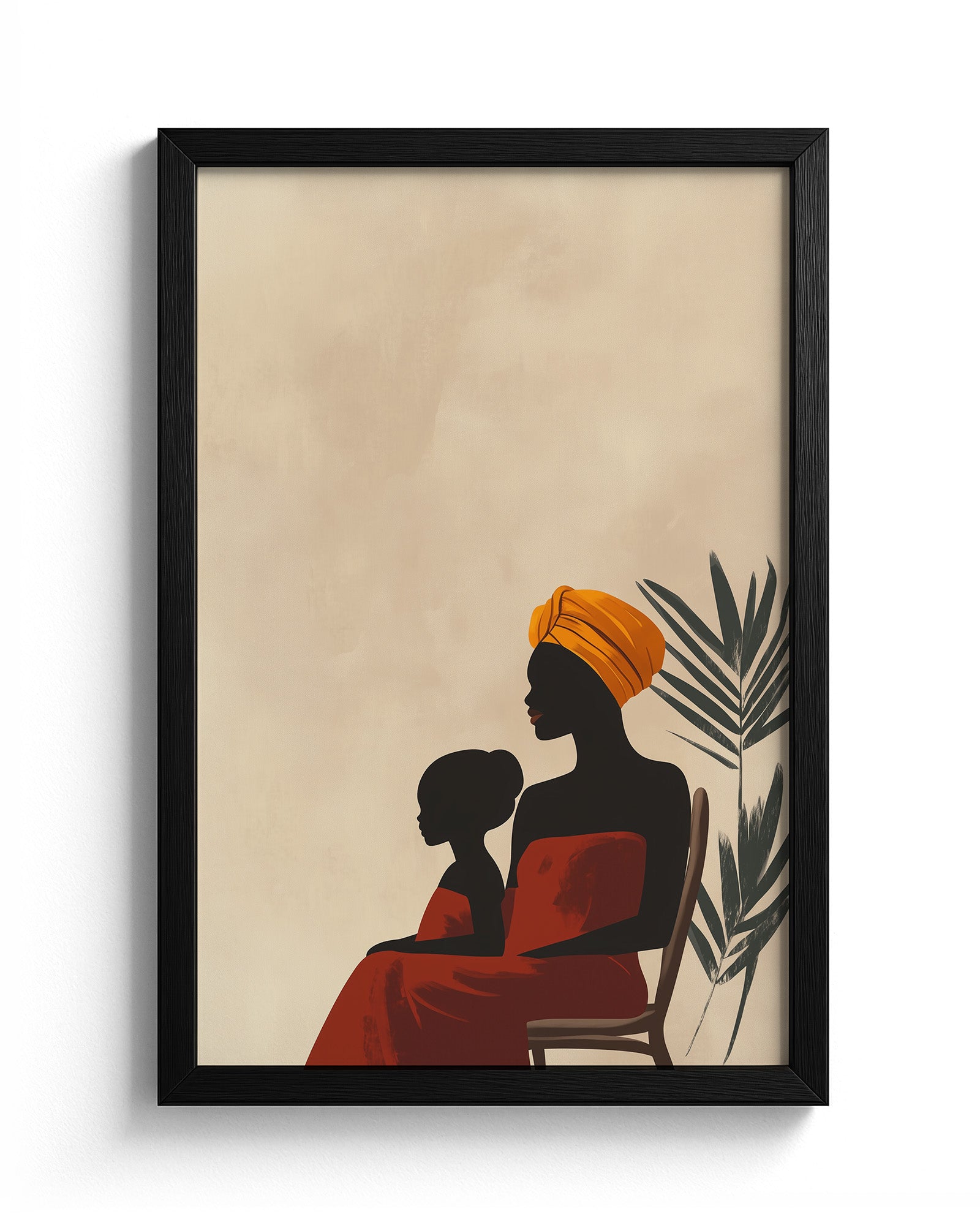 This captivating oil painting portrays an intimate moment between an African mother and daughter, rendered with rich emotional depth and cultural significance. The mother, adorned in a striking orange headdress and vibrant red dress, sits regally on a brown chair against a subdued grey wall, creating a powerful contrast that draws the viewer's eye to the subjects. Lush green plants frame the composition, adding life and symbolism to this cross-generational portrait.