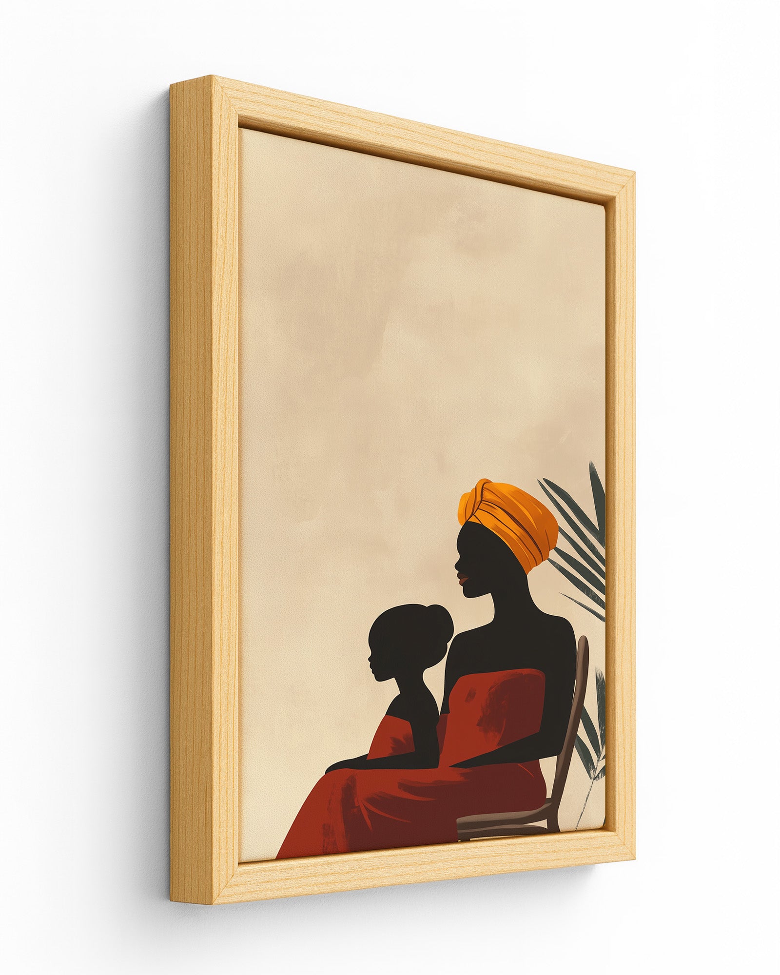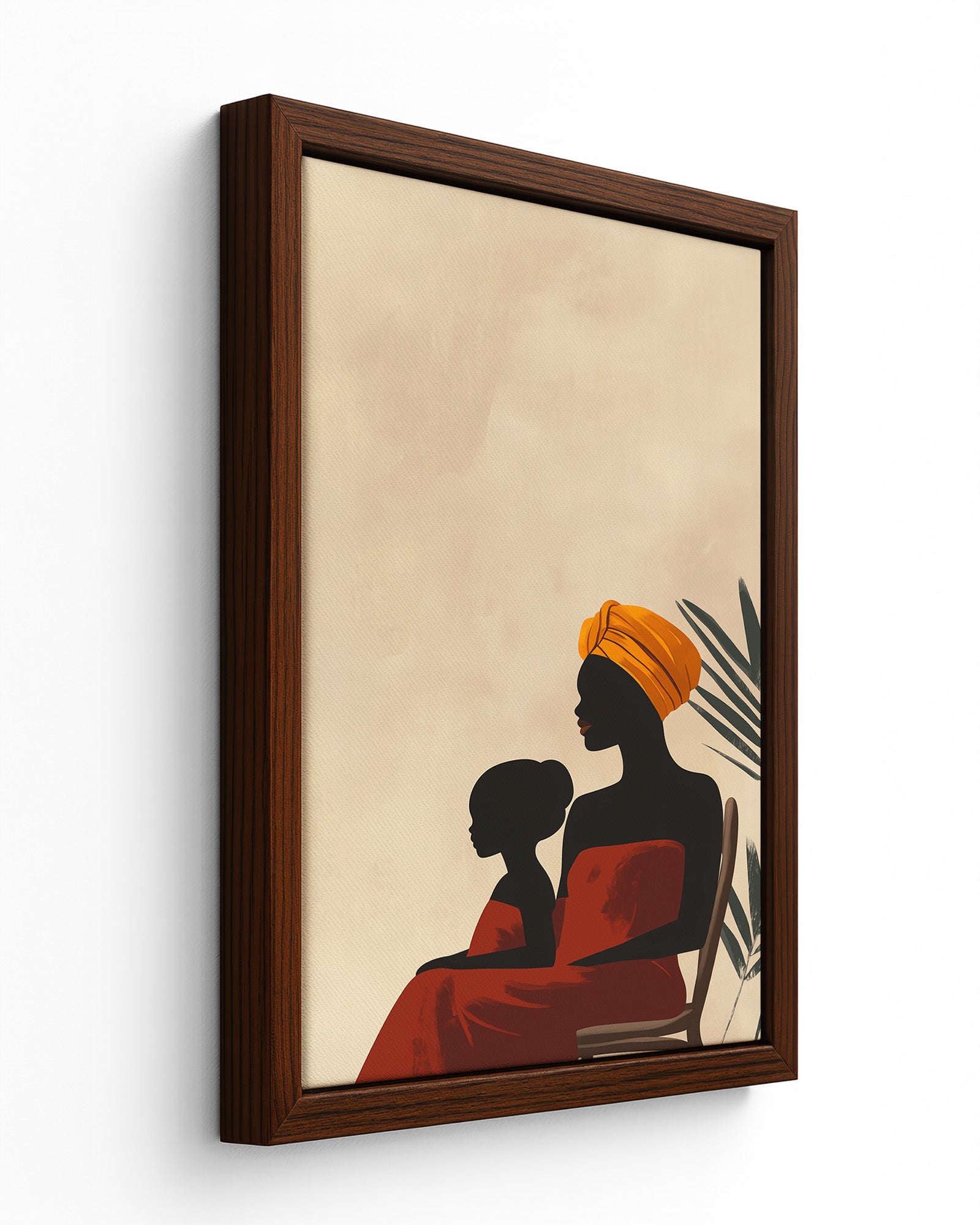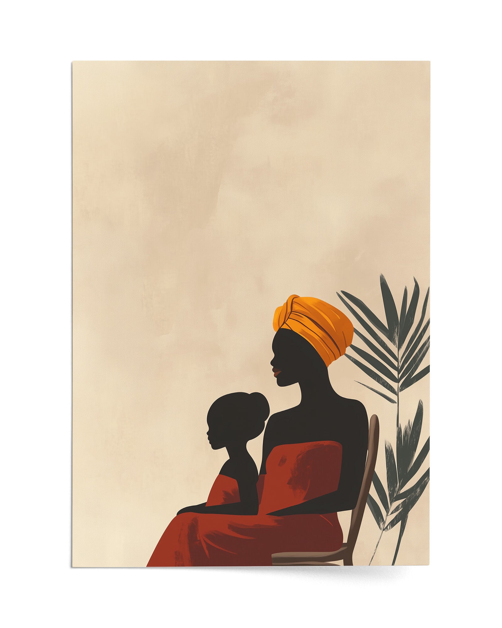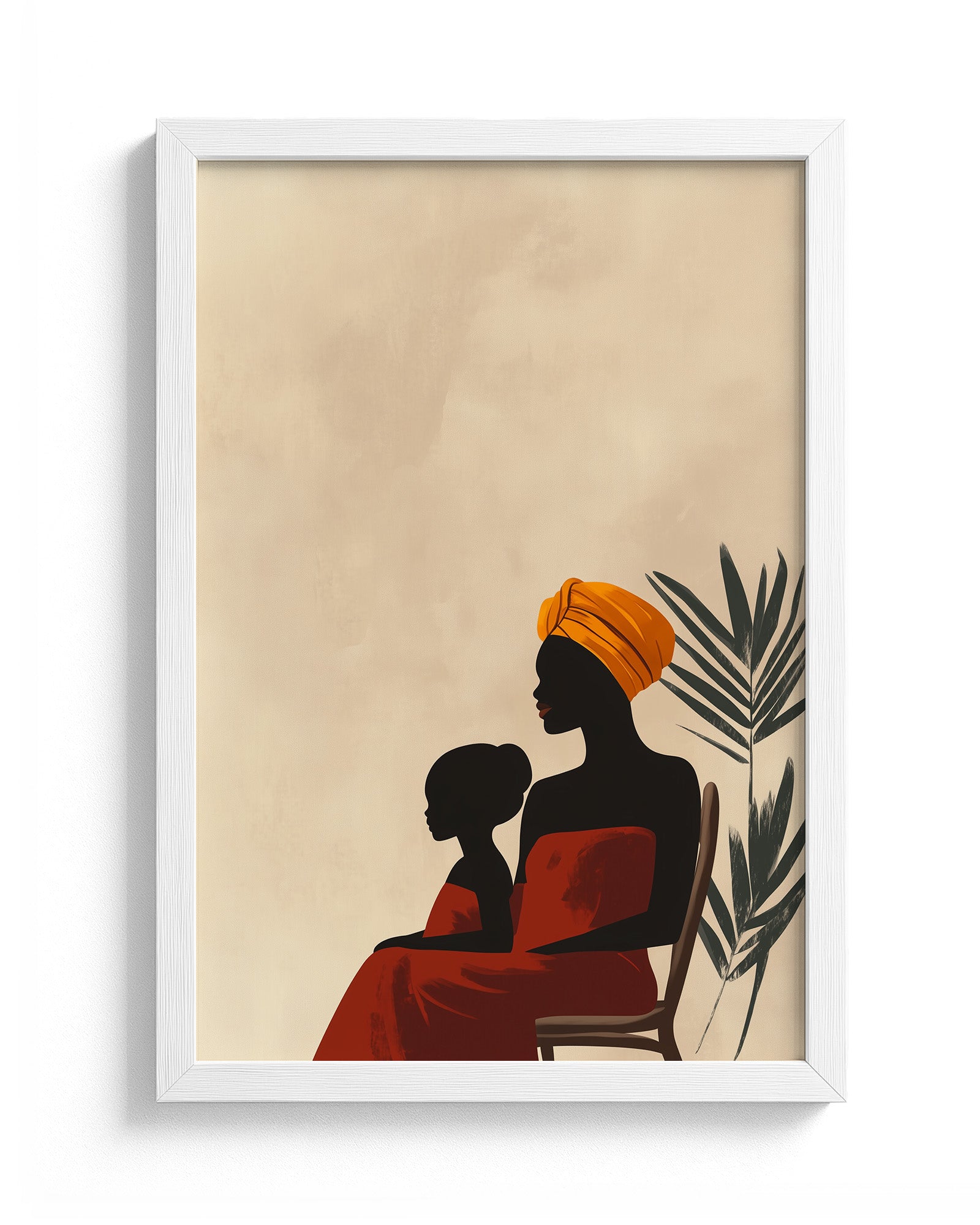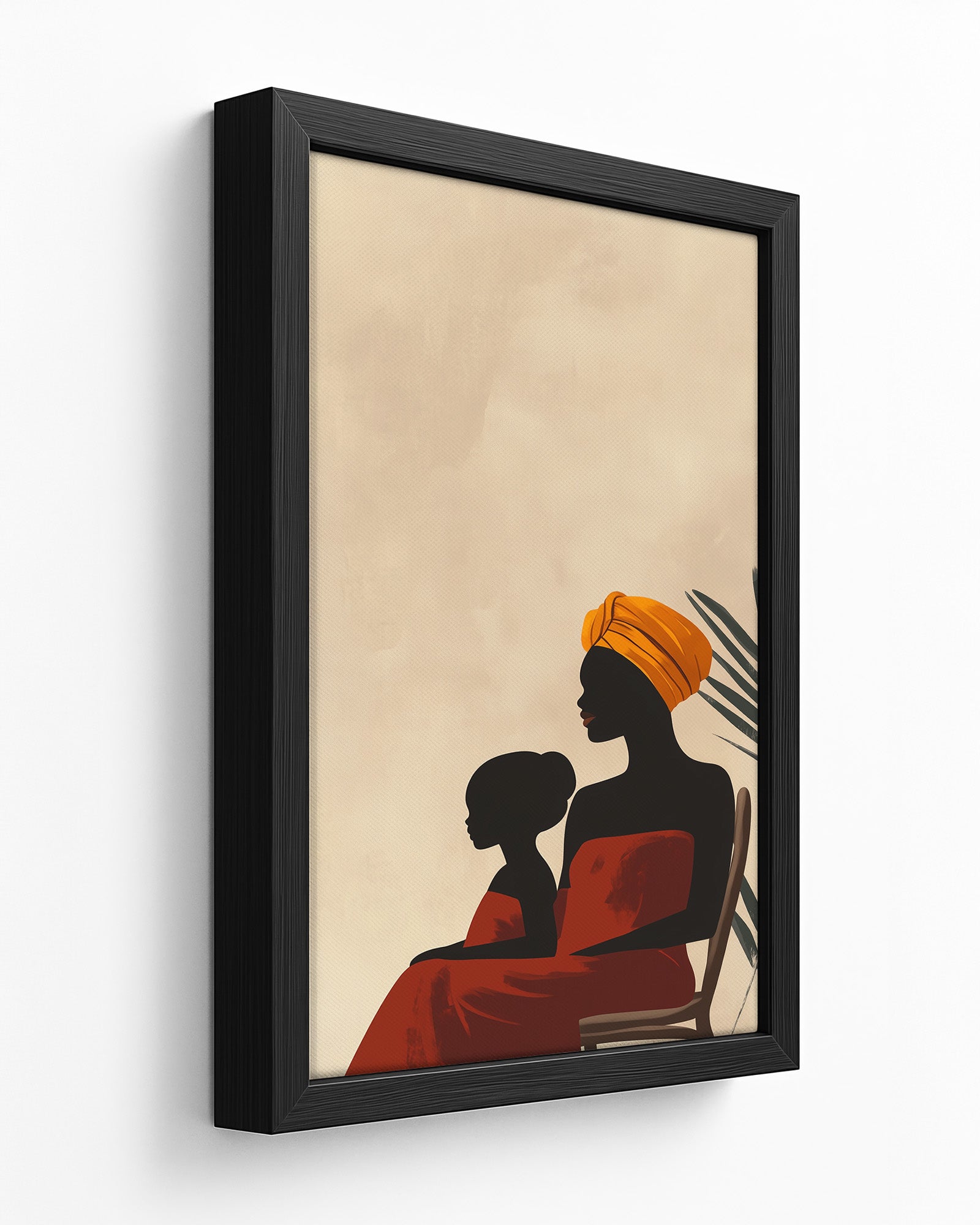 This captivating oil painting portrays an intimate moment between an African mother and daughter, rendered with rich emotional depth and cultural significance. The mother, adorned in a striking orange headdress and vibrant red dress, sits regally on a brown chair against a subdued grey wall, creating a powerful contrast that draws the viewer's eye to the subjects. Lush green plants frame the composition, adding life and symbolism to this cross-generational portrait.