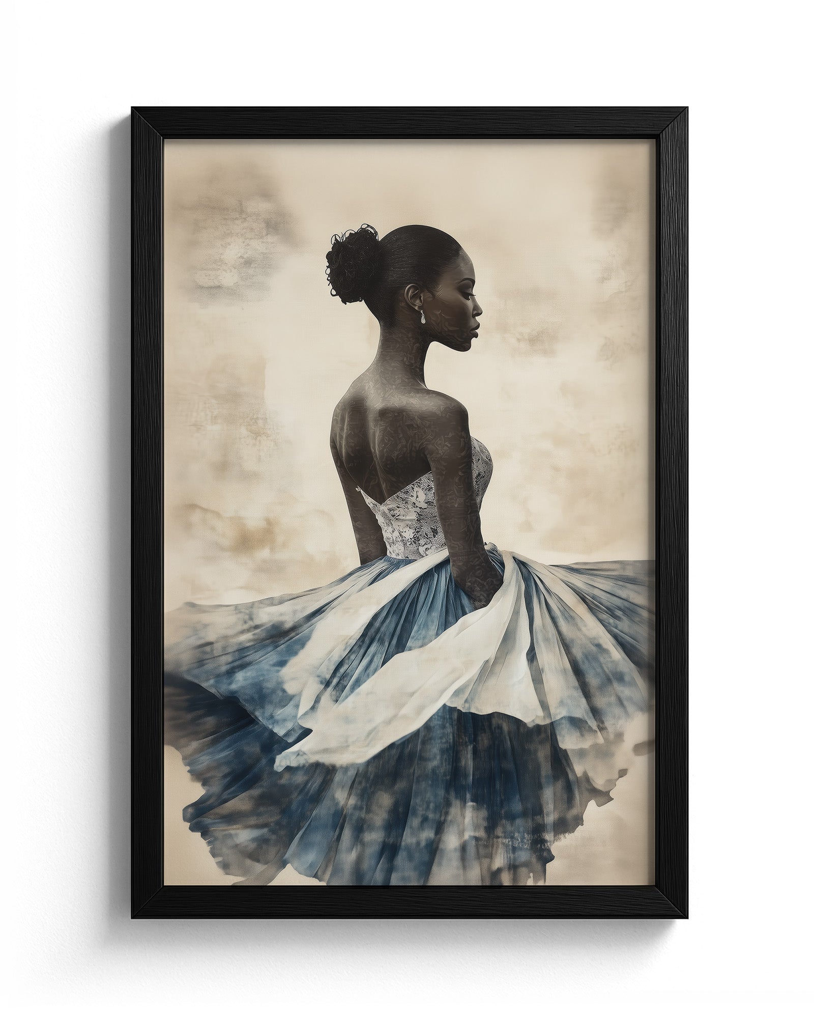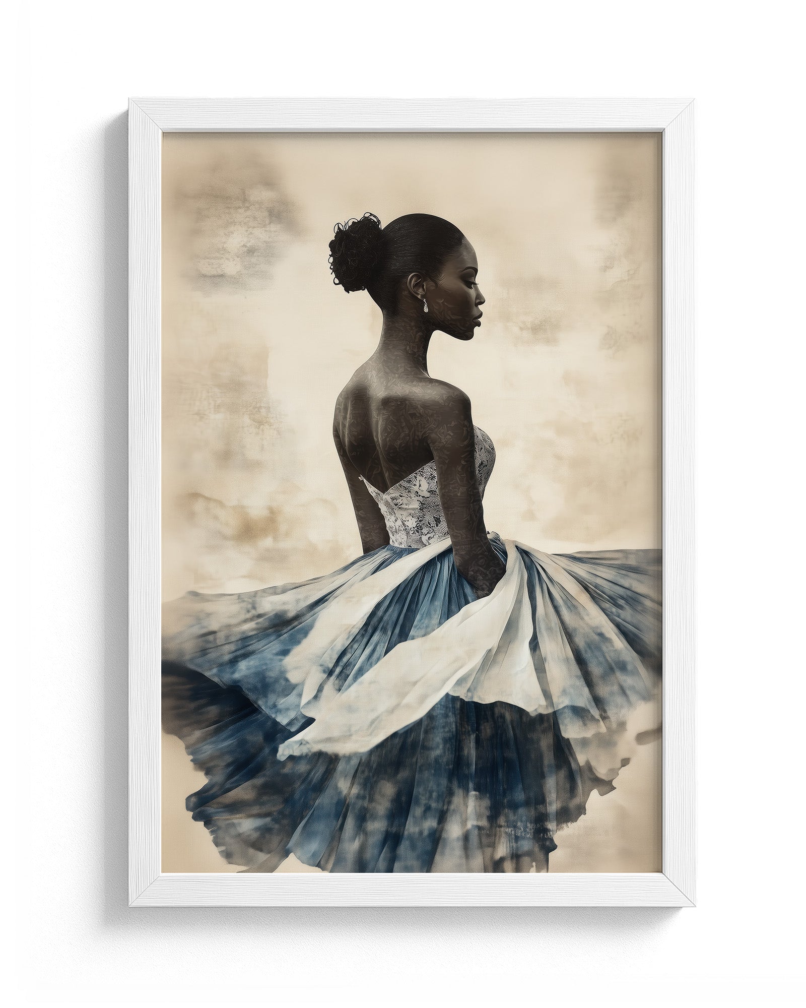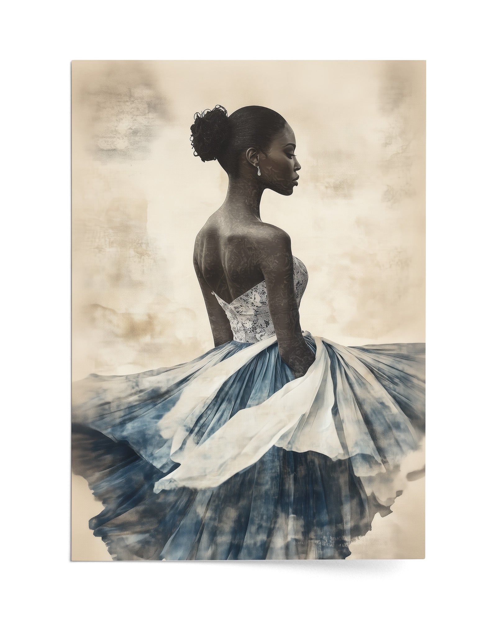A graceful African woman in a flowing dress, her attire layered with soft indigo and white papers. Her dark skin and elegant bun stand out against a textured beige background, creating a stunning minimalist collage.