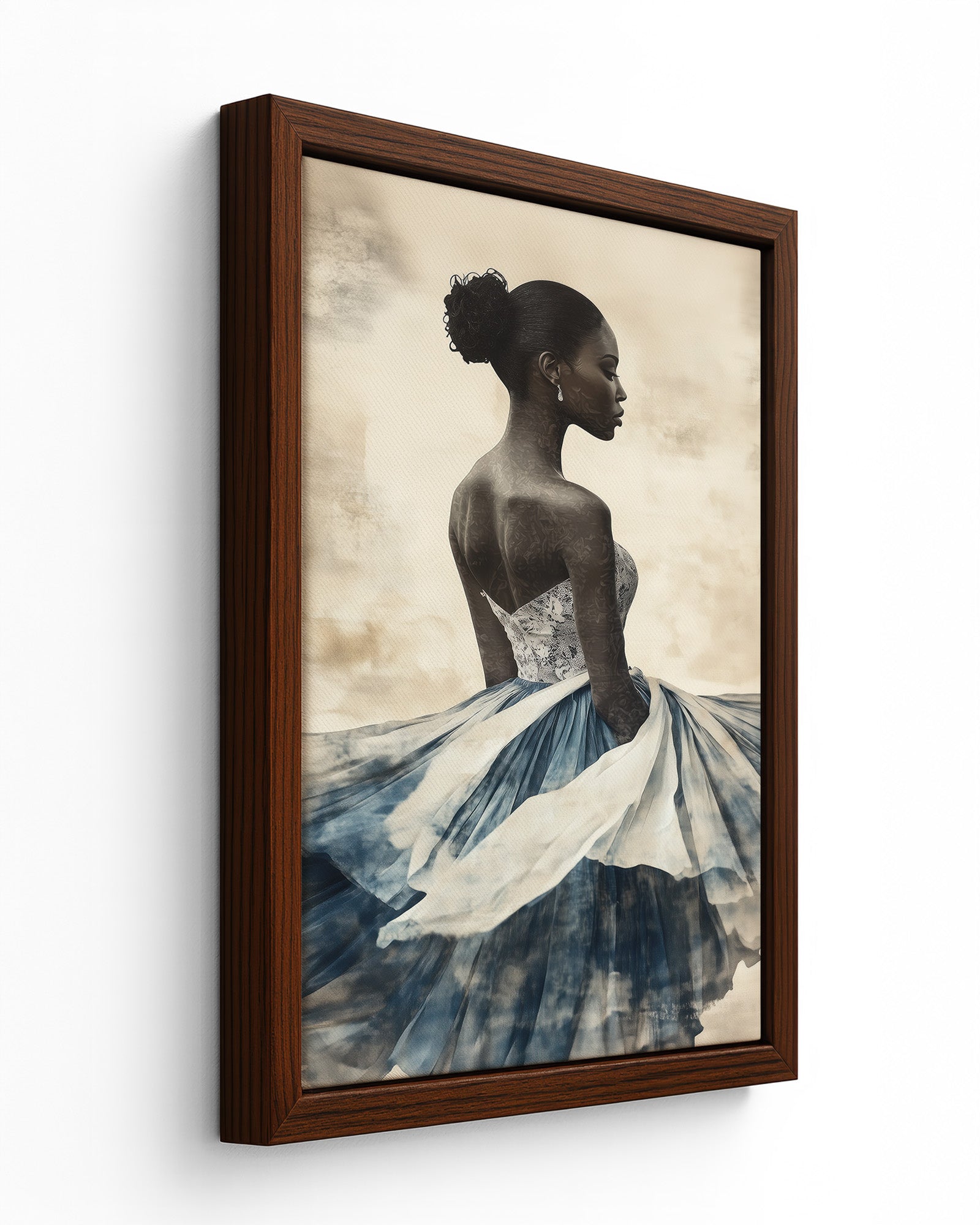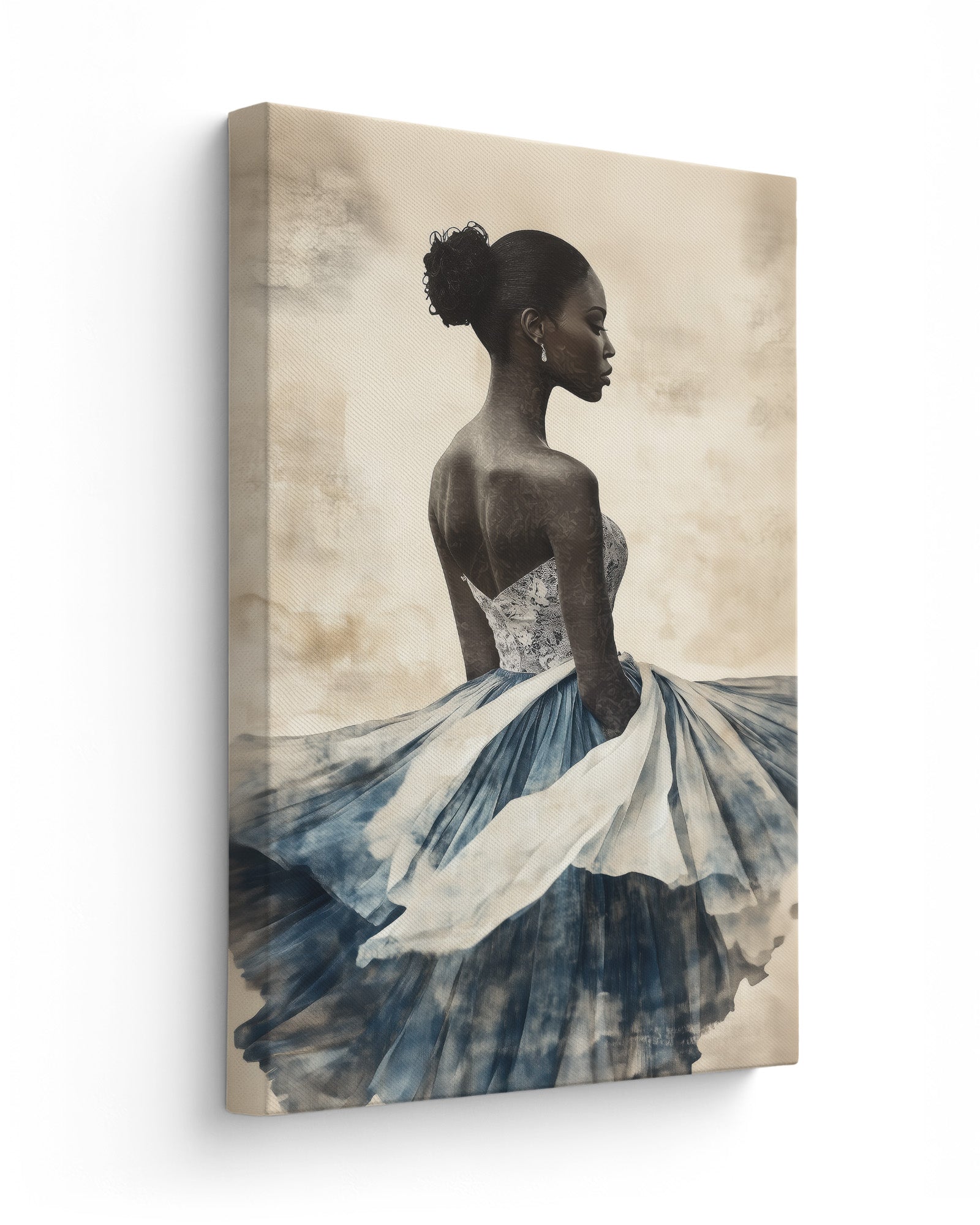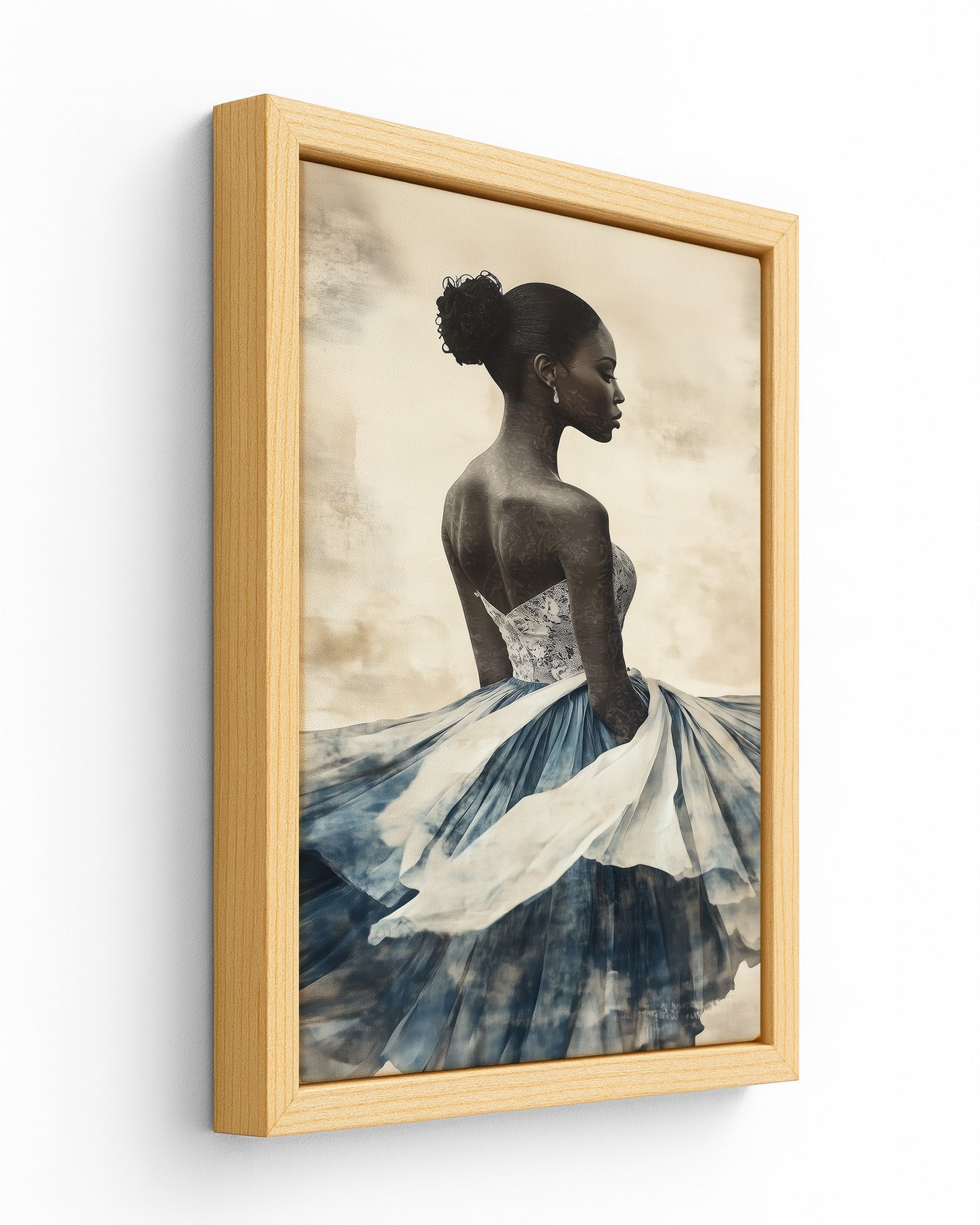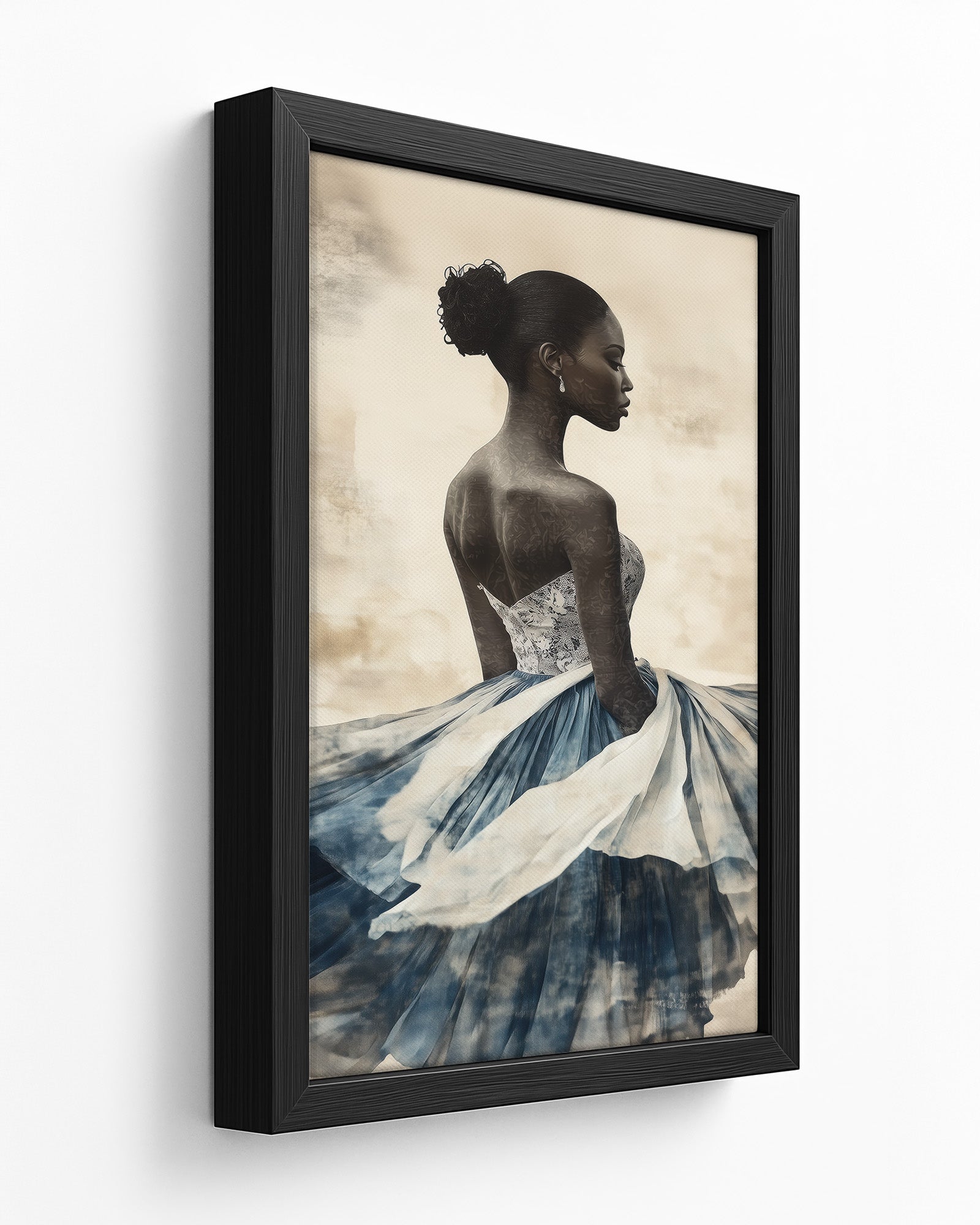 A graceful African woman in a flowing dress, her attire layered with soft indigo and white papers. Her dark skin and elegant bun stand out against a textured beige background, creating a stunning minimalist collage.