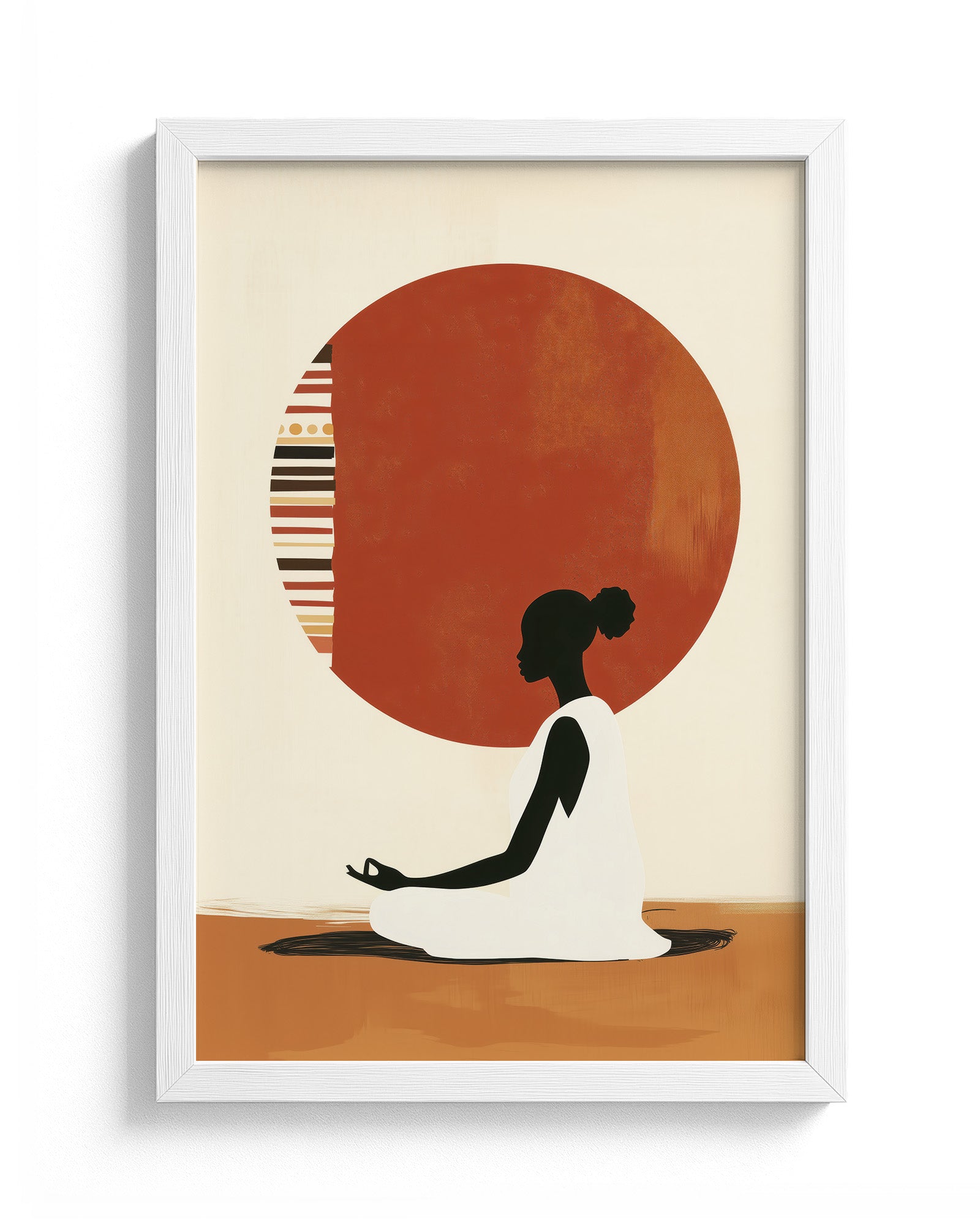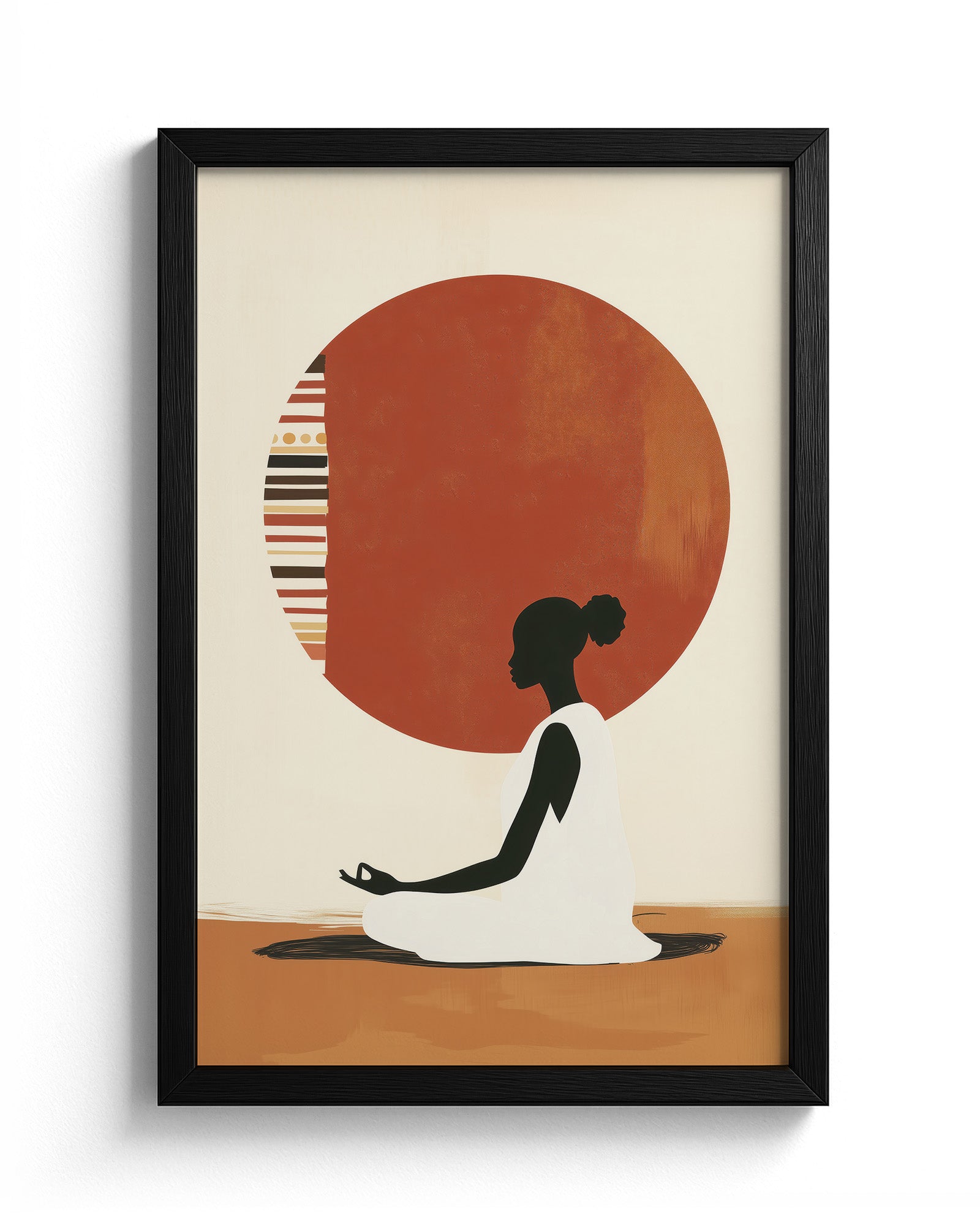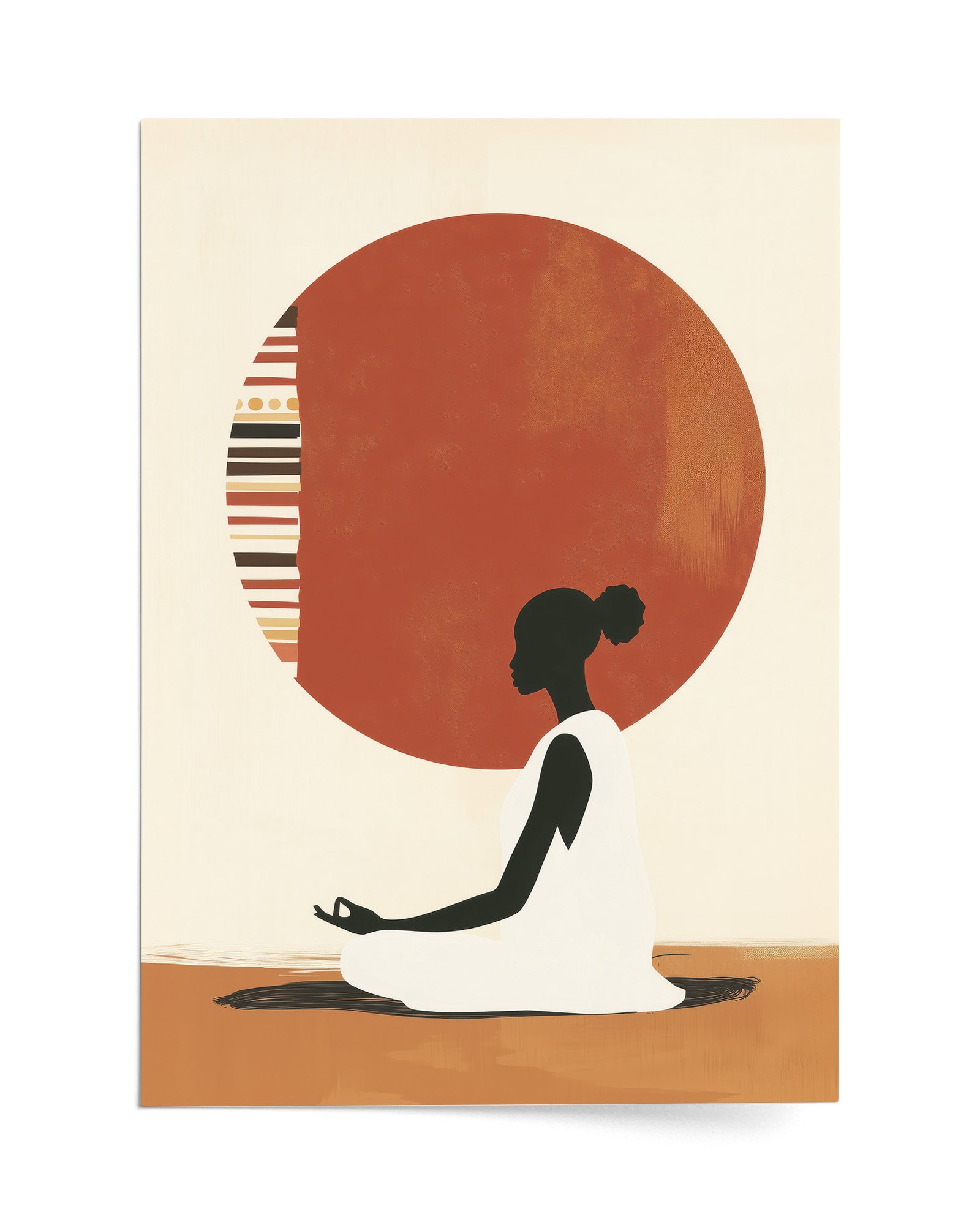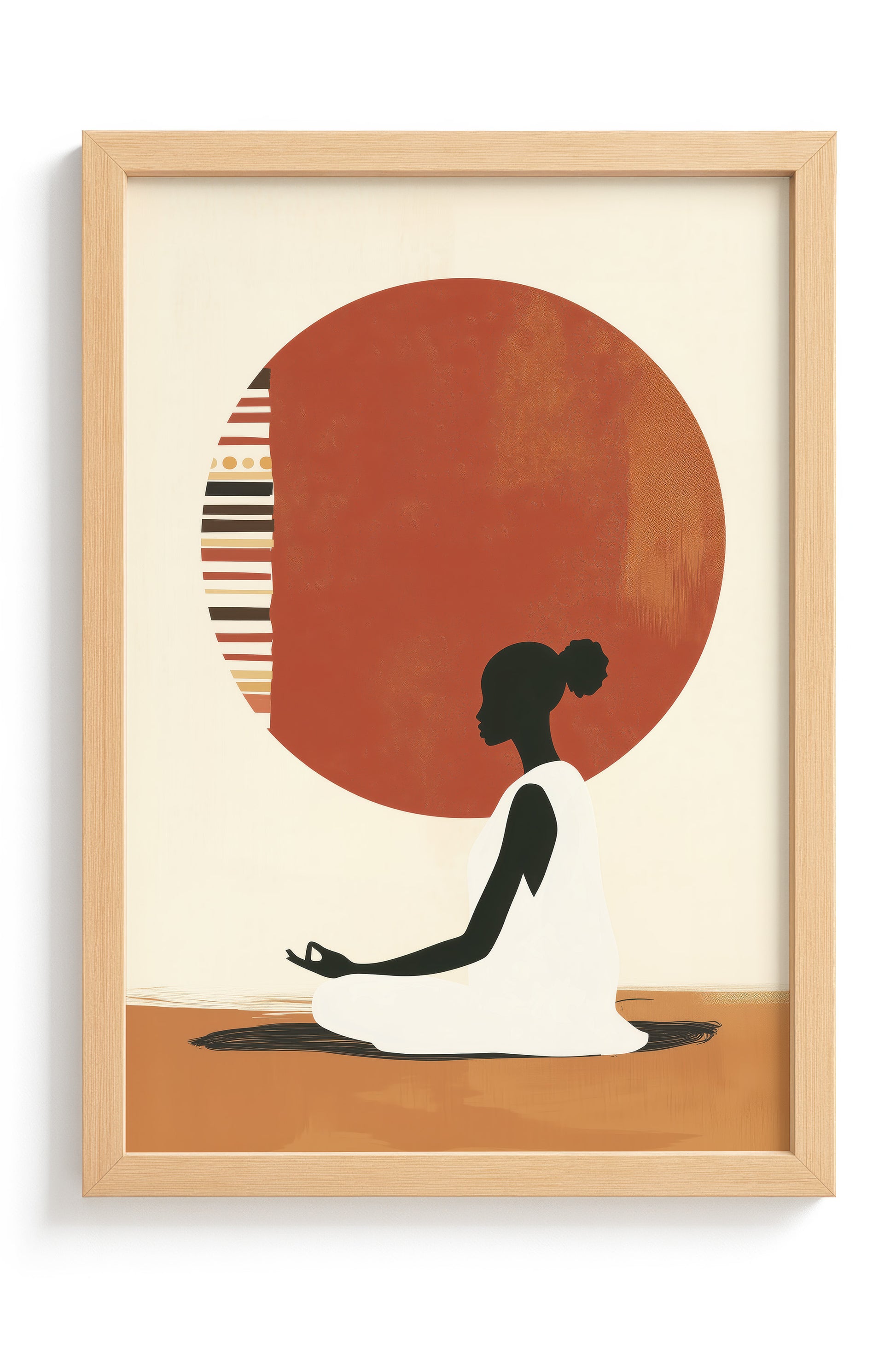 A serene artwork of a woman in meditation, centred before a patterned sun inspired by tribal motifs. This piece blends cultural expression with minimalism, evoking themes of inner peace, balance, and ancestral wisdom.