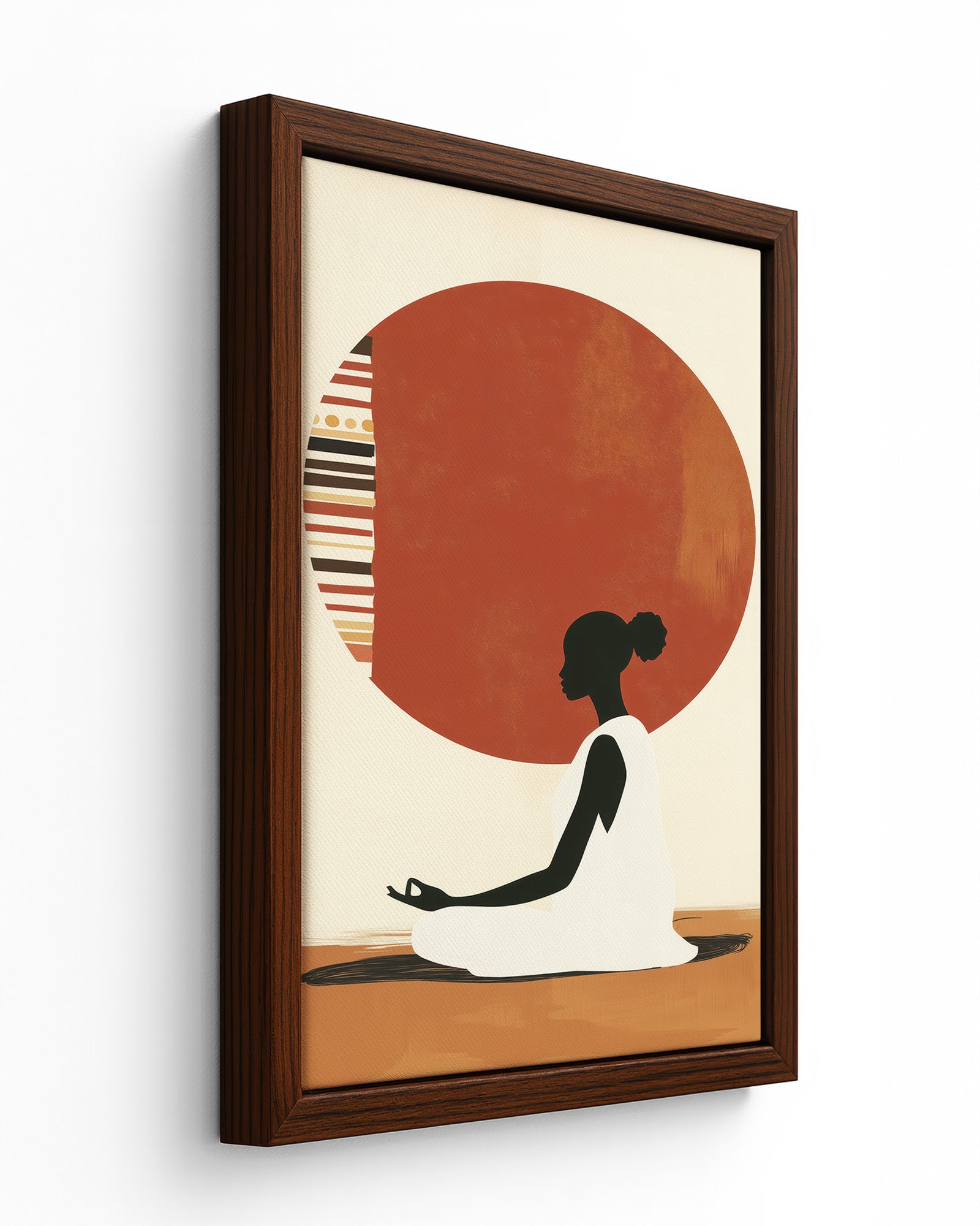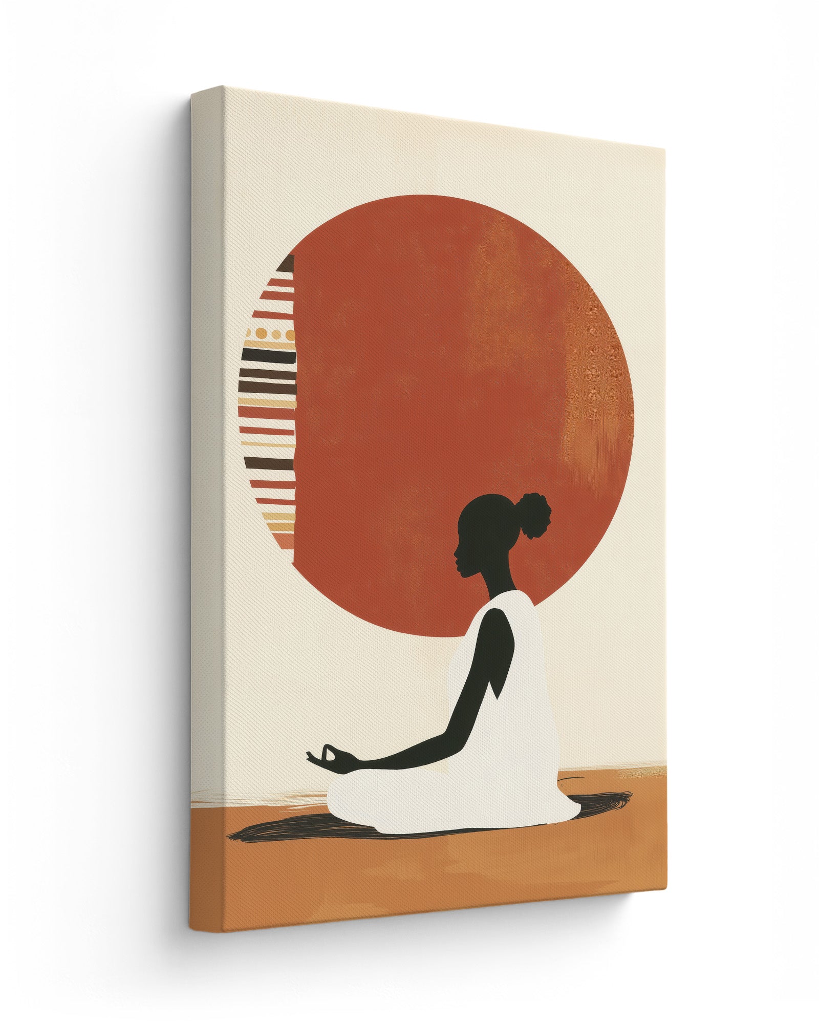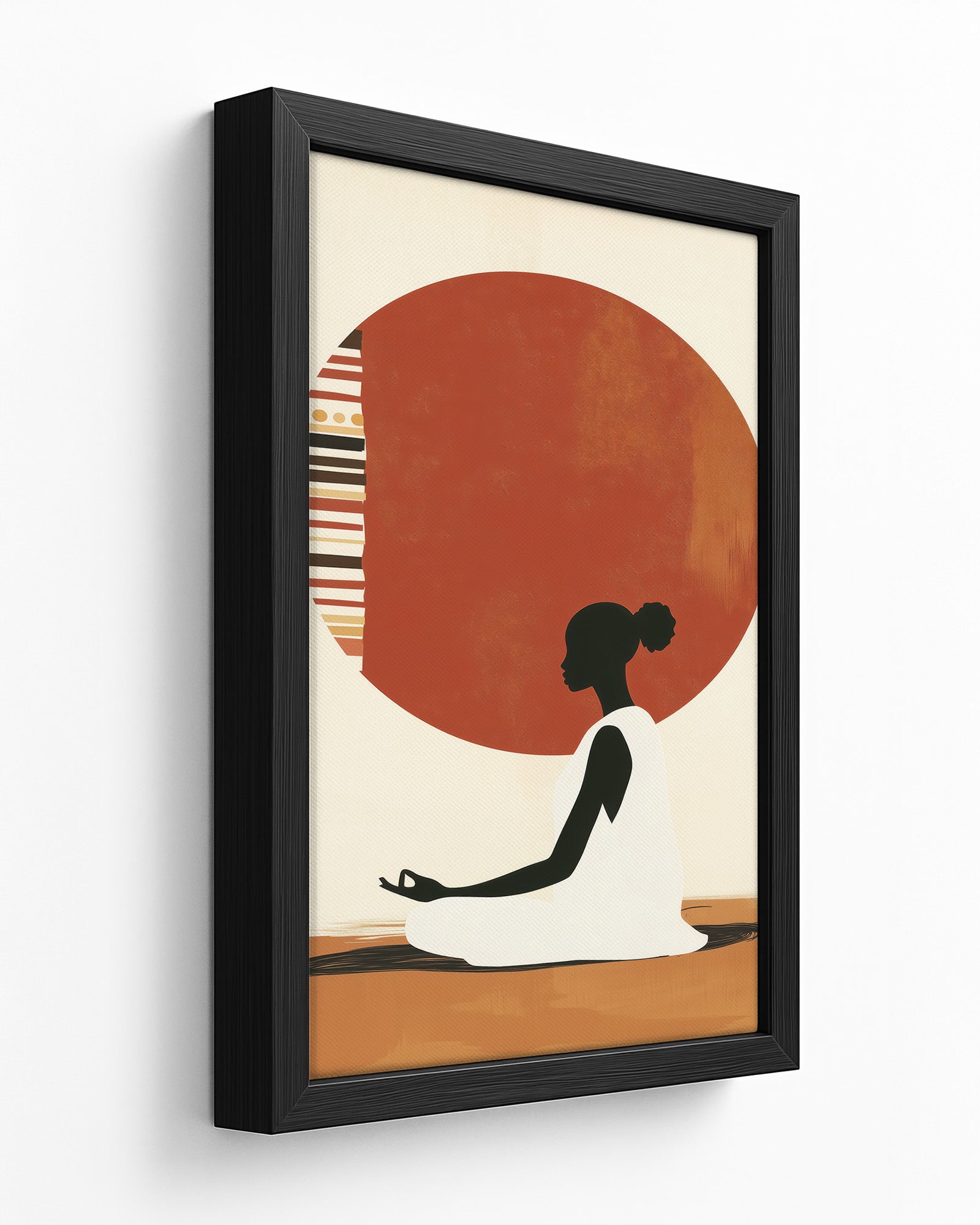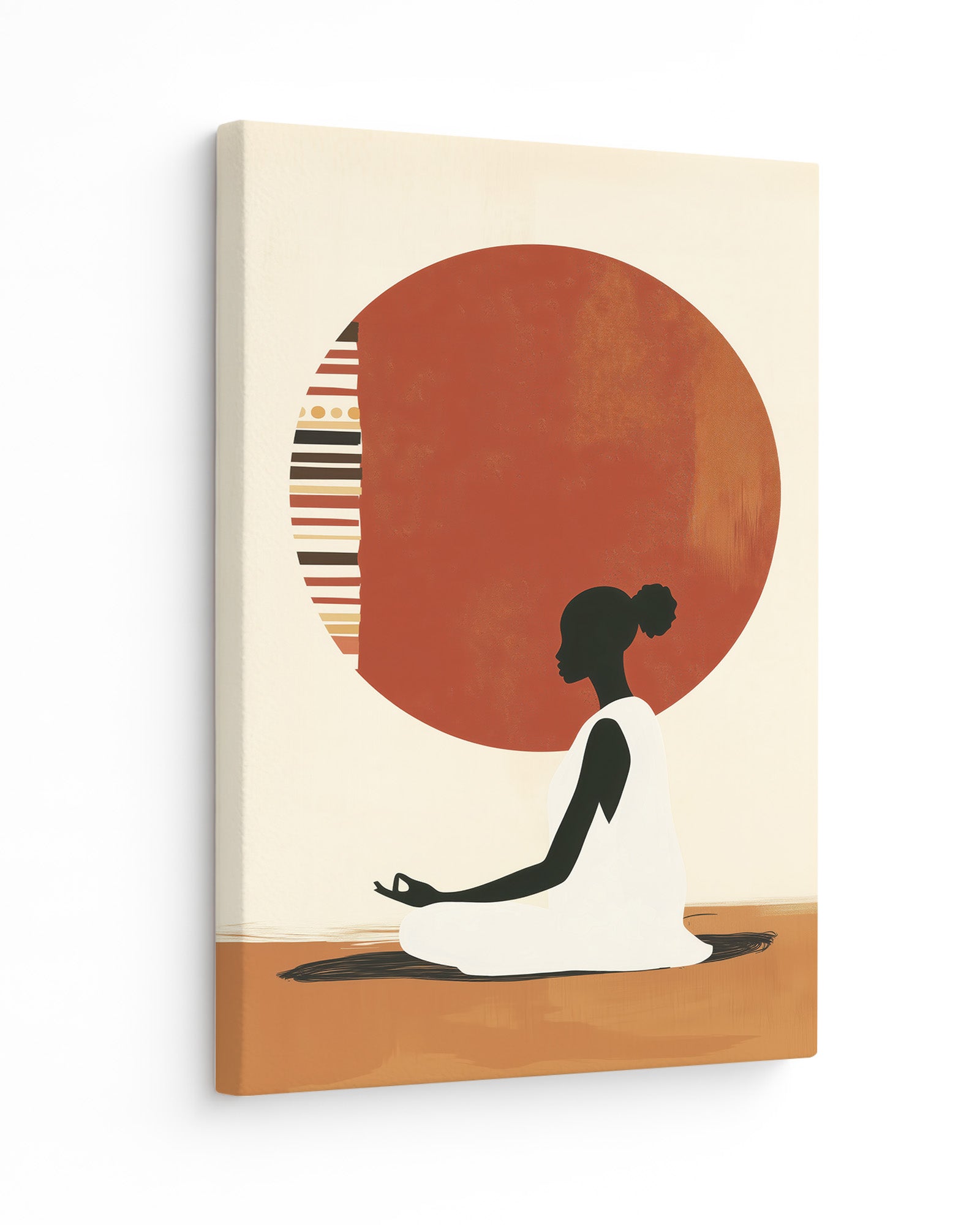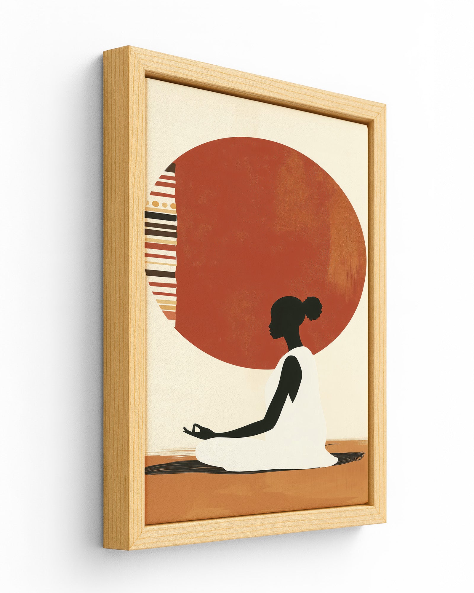 A serene artwork of a woman in meditation, centred before a patterned sun inspired by tribal motifs. This piece blends cultural expression with minimalism, evoking themes of inner peace, balance, and ancestral wisdom.