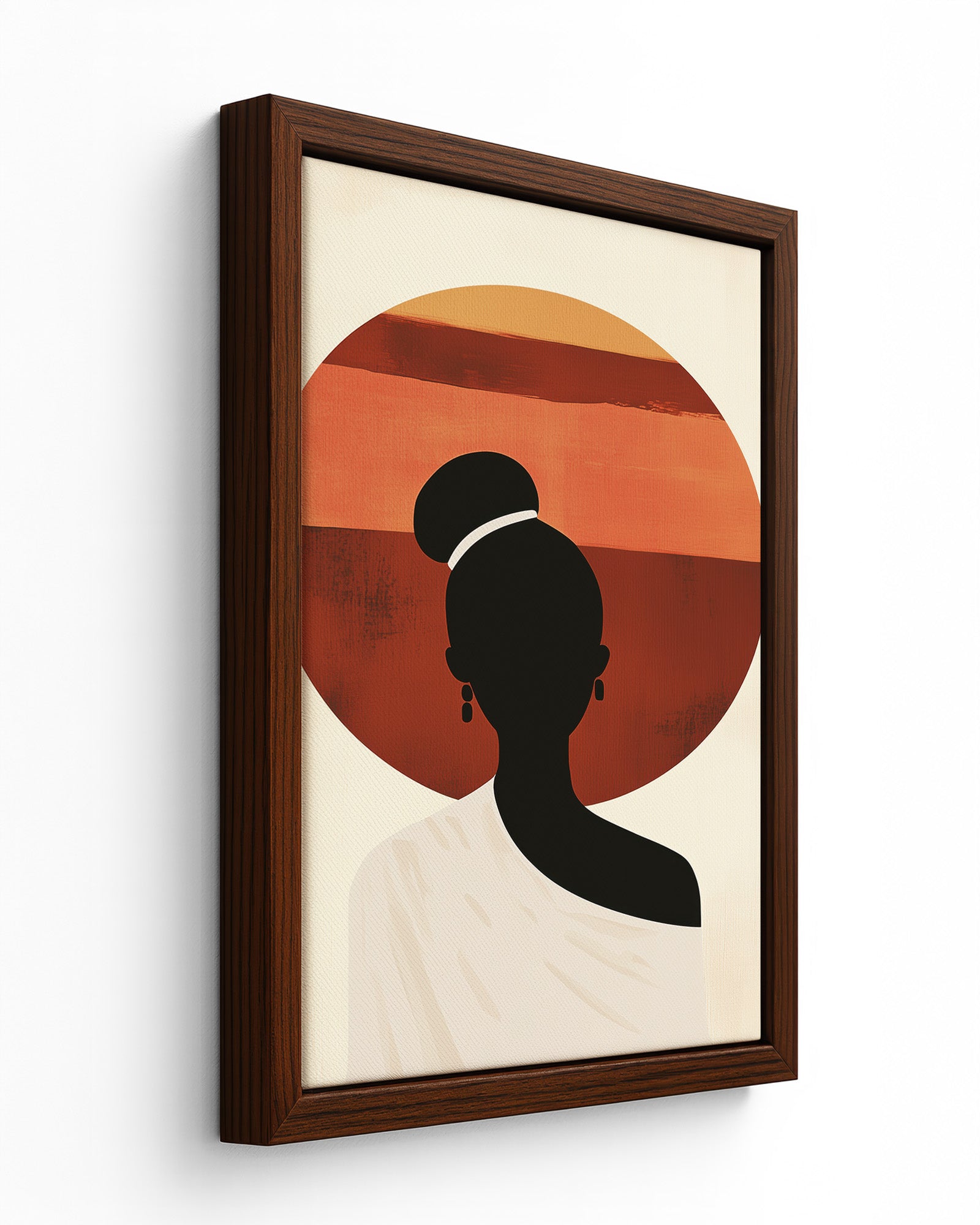 A minimalist Afrocentric portrait of a woman standing before a radiant sun. Blending earthy orange tones and clean silhouettes, this artwork celebrates grace, cultural depth, and feminine strength — a modern ode to ancestry and identity.