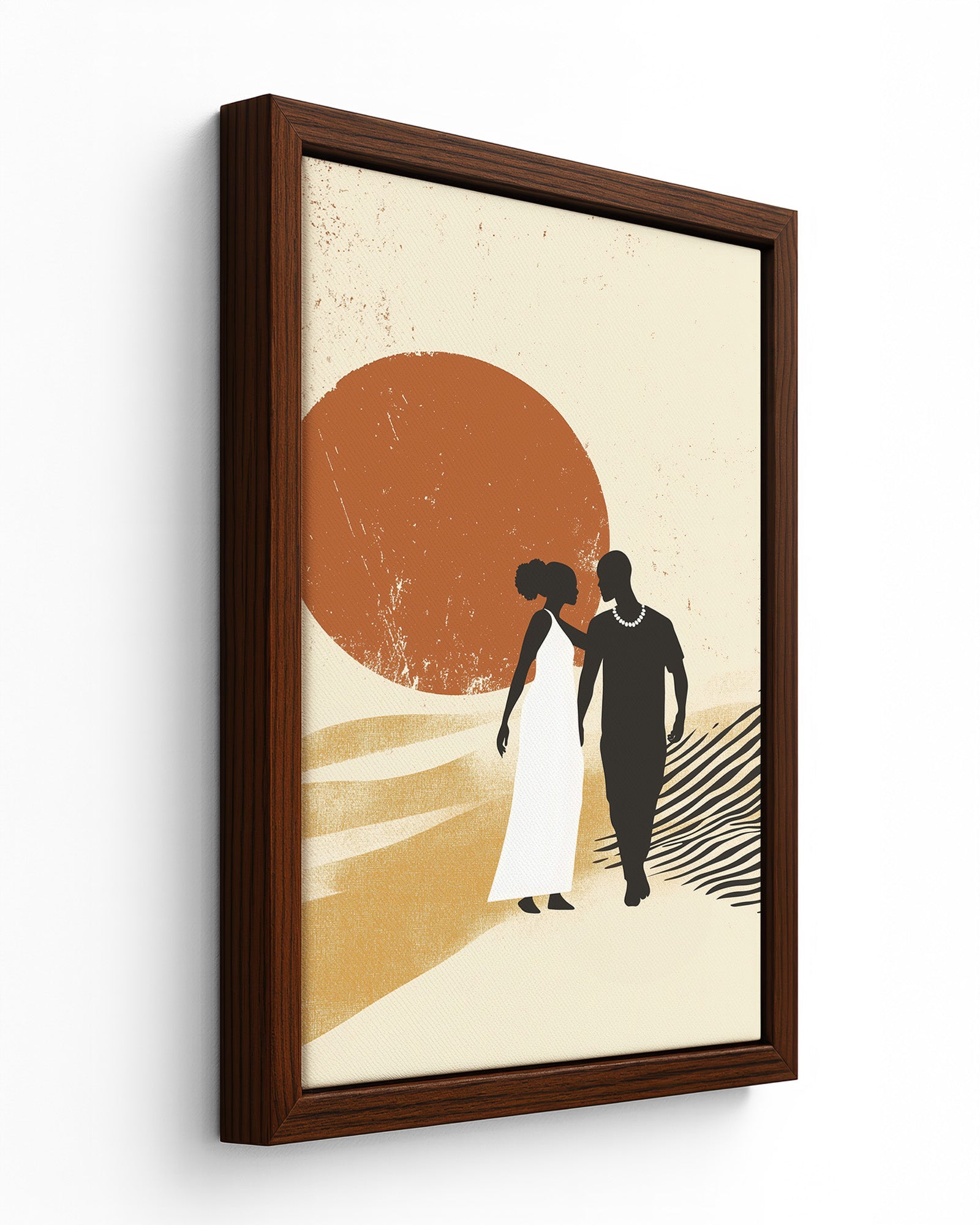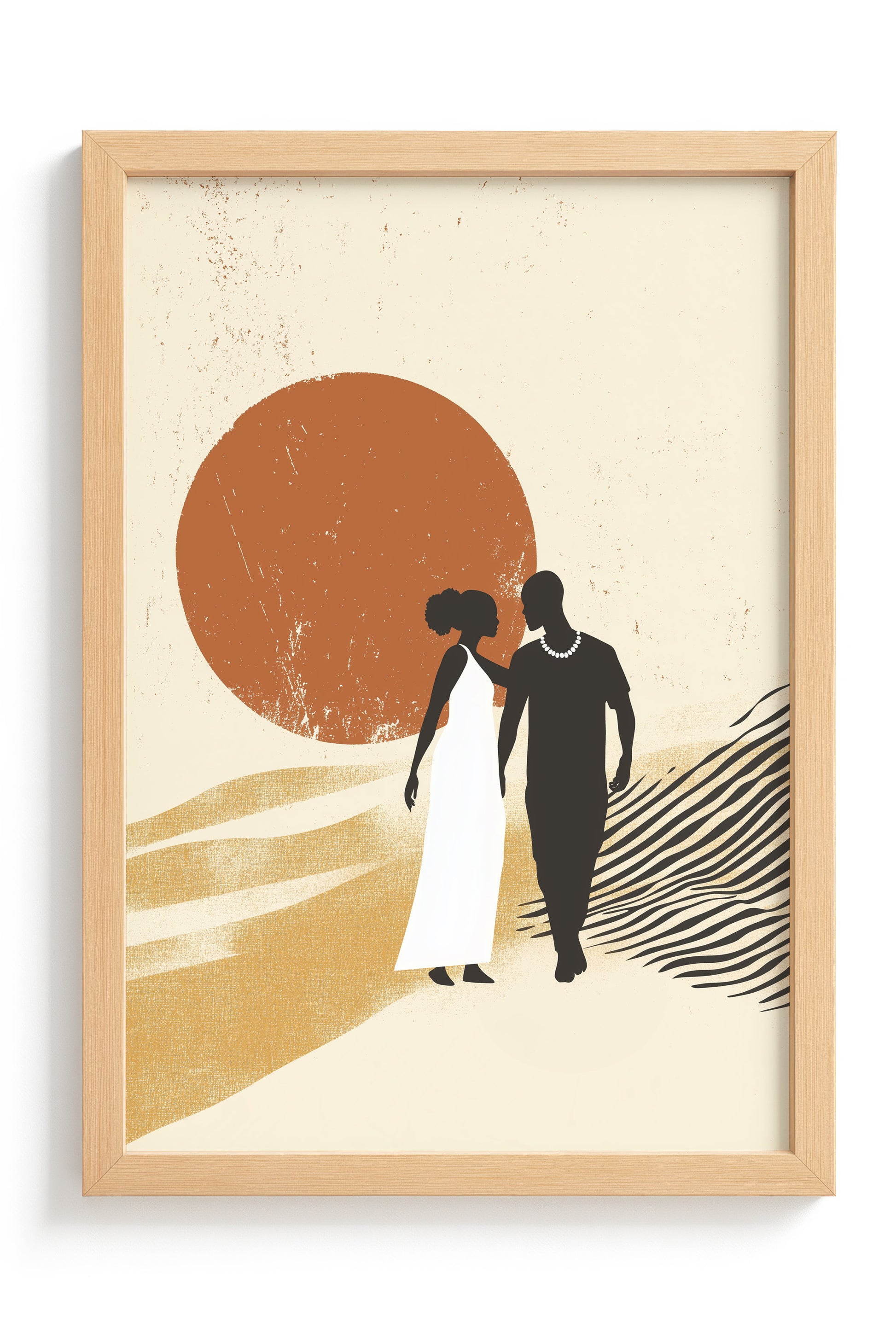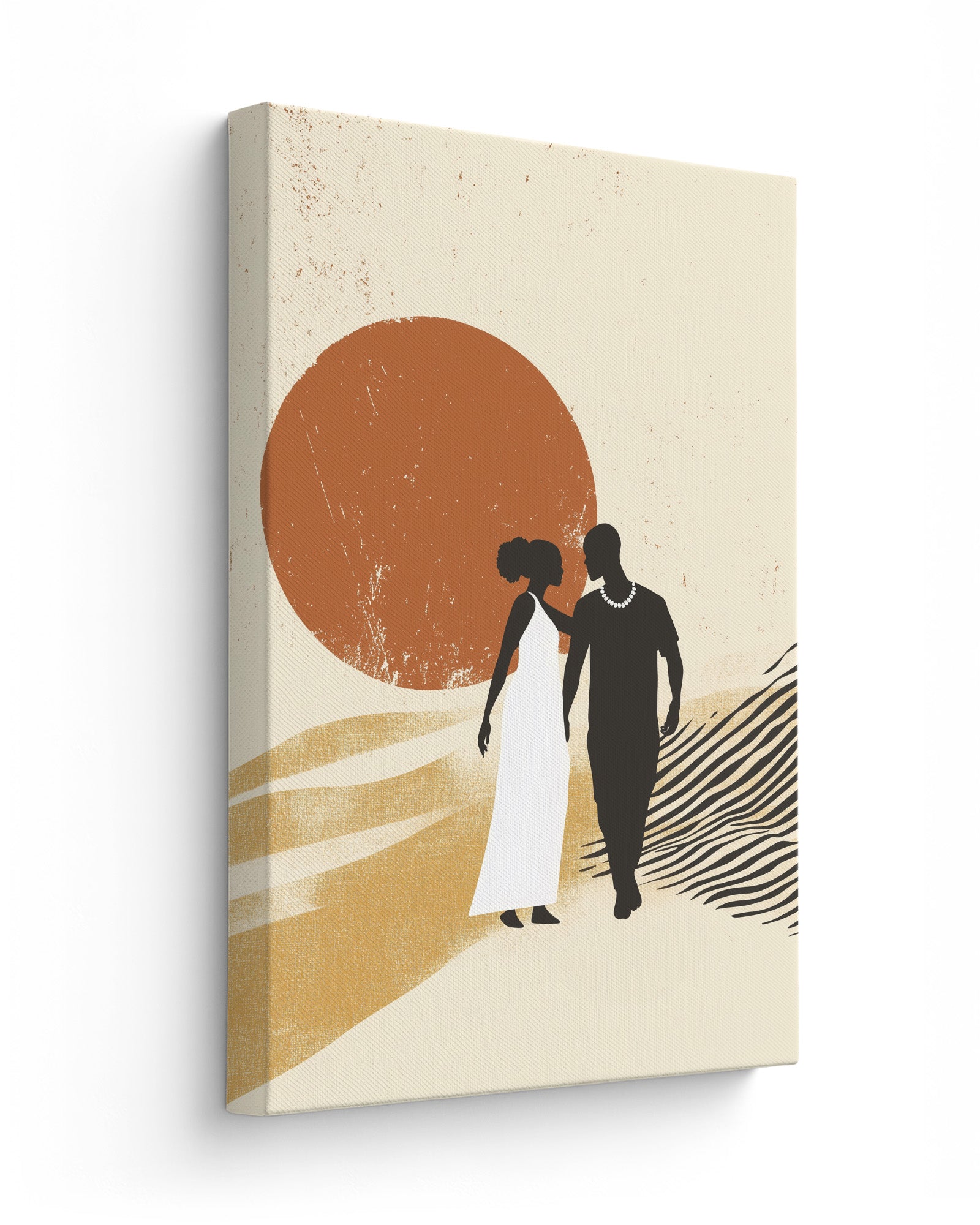 This captivating artwork portrays an intimate moment between an African couple in a tender embrace, set against a warm beige and sandy backdrop that evokes the serene beauty of the savanna landscape. Distinctive black and white zebra patterns weave throughout the composition, creating visual rhythm and cultural connection, while an orange sun radiates warmth and vitality across the scene.