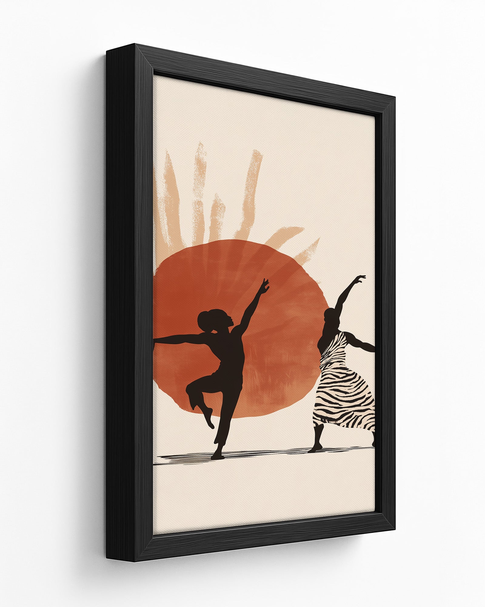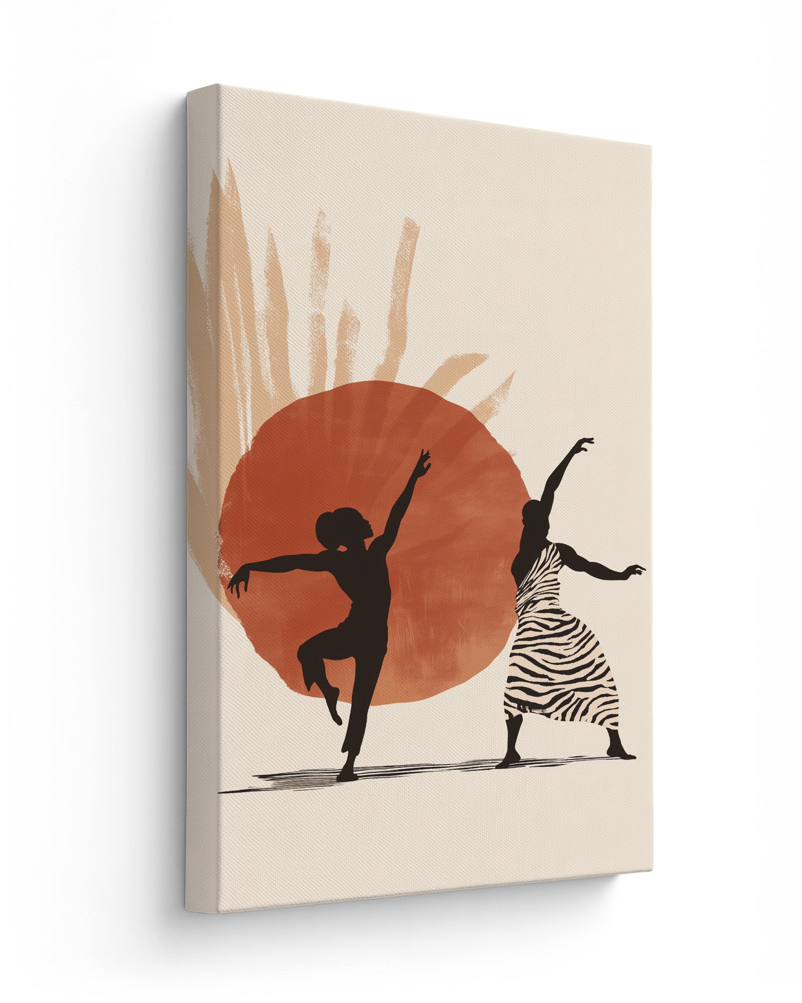 This striking contemporary artwork captures the powerful silhouettes of a male and female dancer against a vibrant orange and beige background. The stark contrast between the fluid forms and the warm, textured backdrop creates a dramatic visual statement celebrating movement, relationship, and artistic expression.