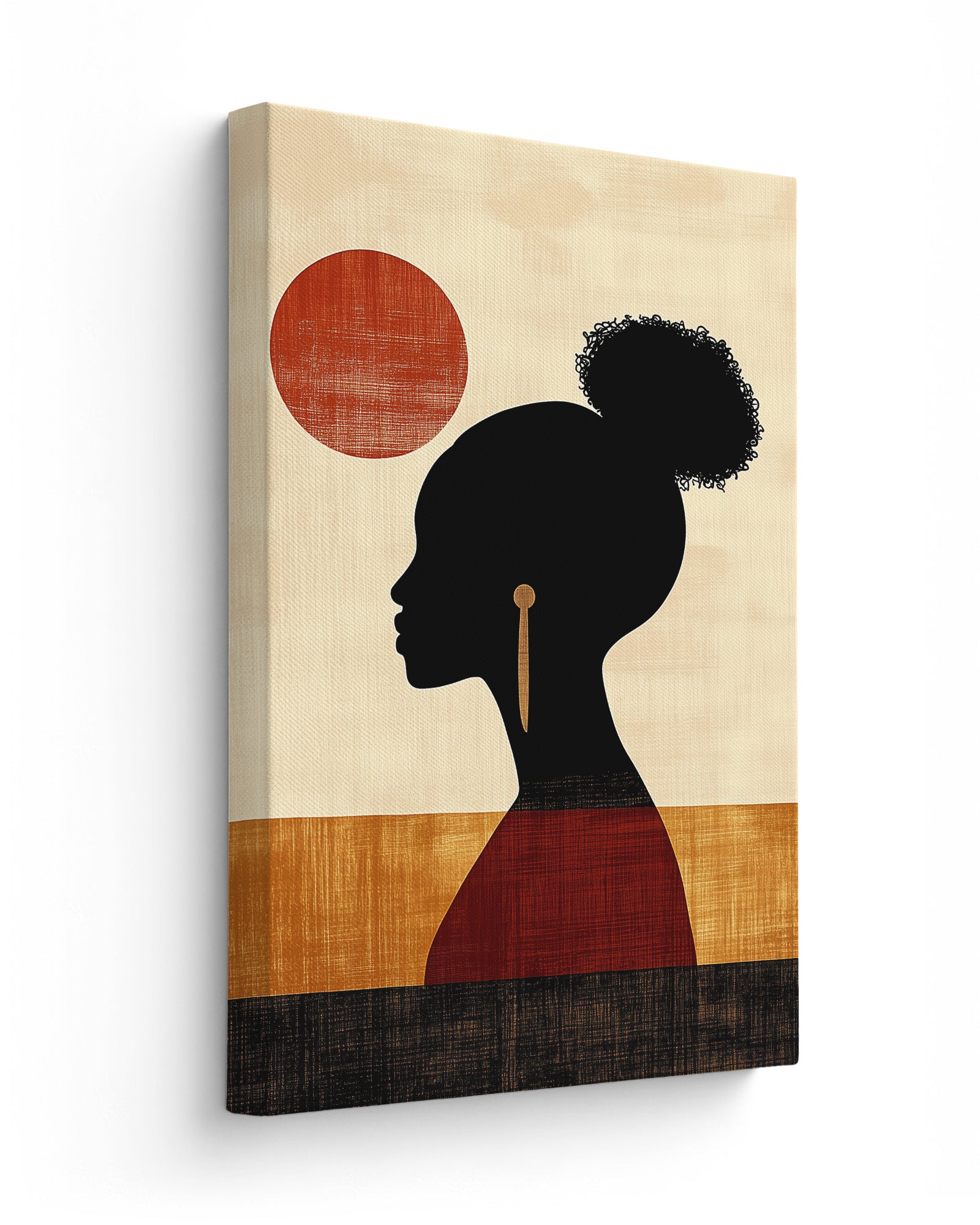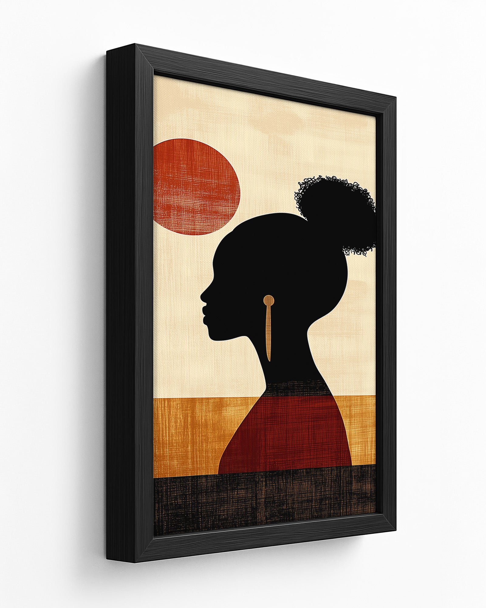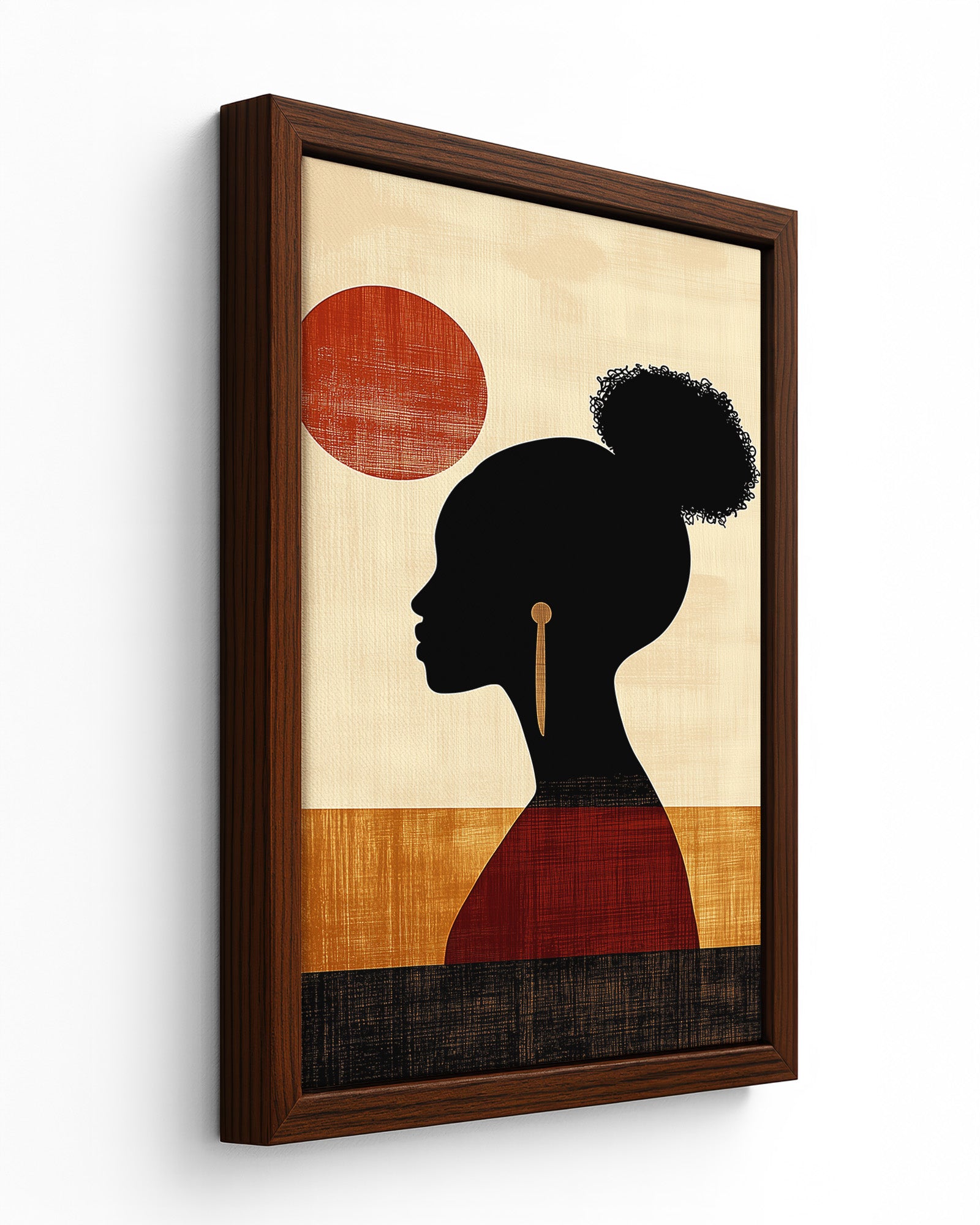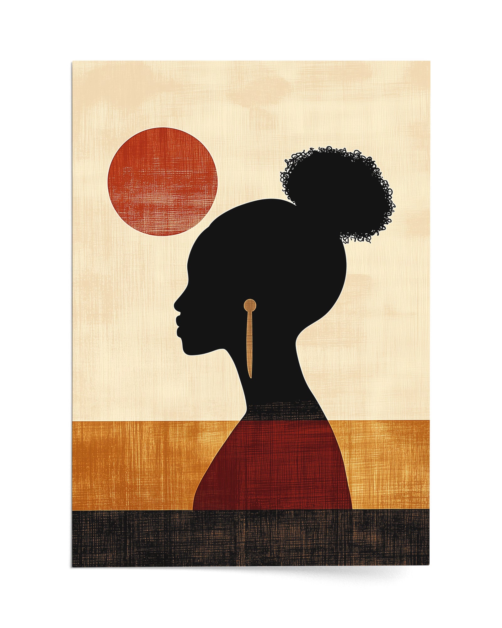 A striking minimalist silhouette emerges against an authentic African backdrop, created in warm earthy tones of brown, beige and black. This contemporary vector illustration masterfully blends traditional textile patterns with mid-century modern aesthetics, featuring clean geometric lines and woodblock-inspired textures.