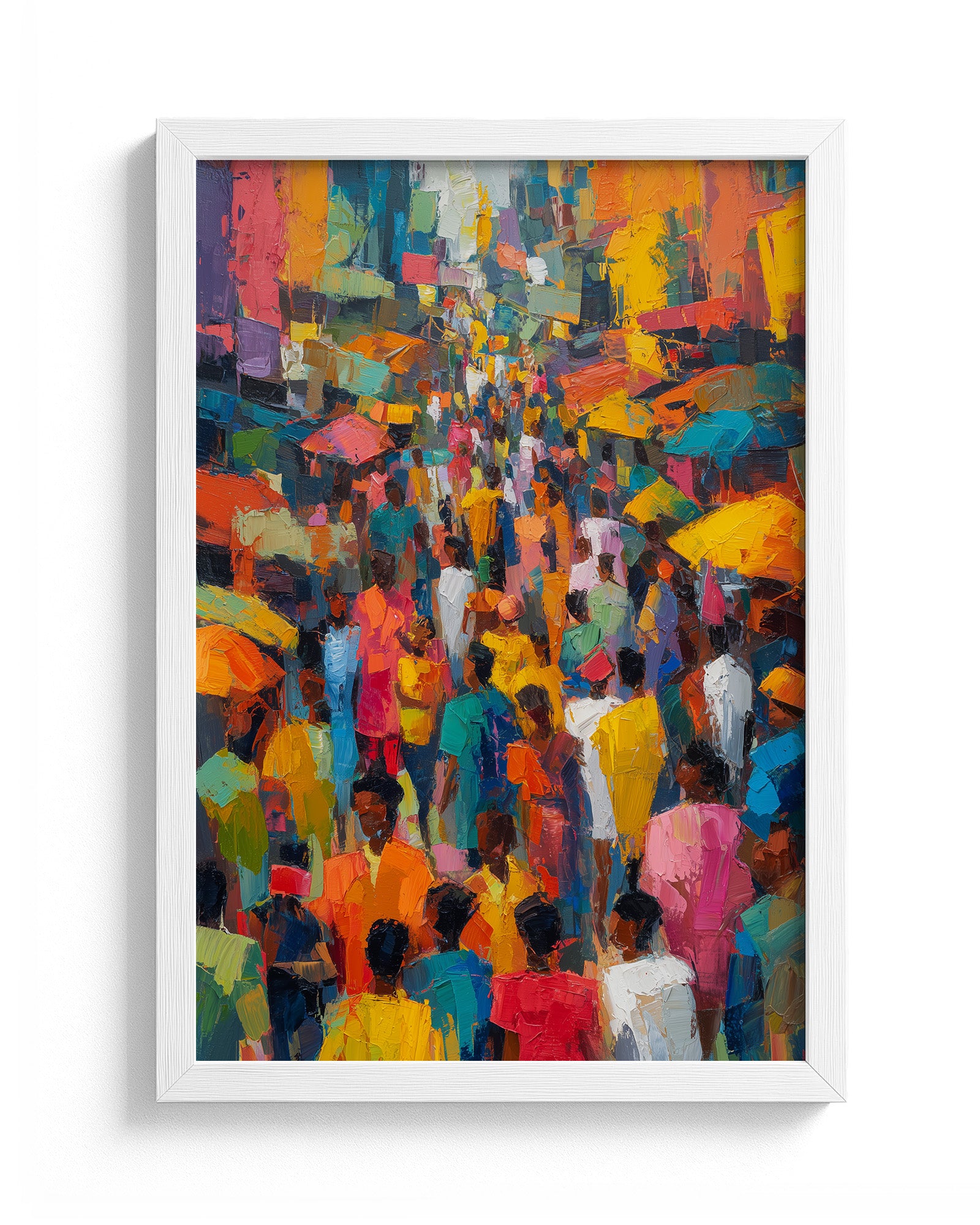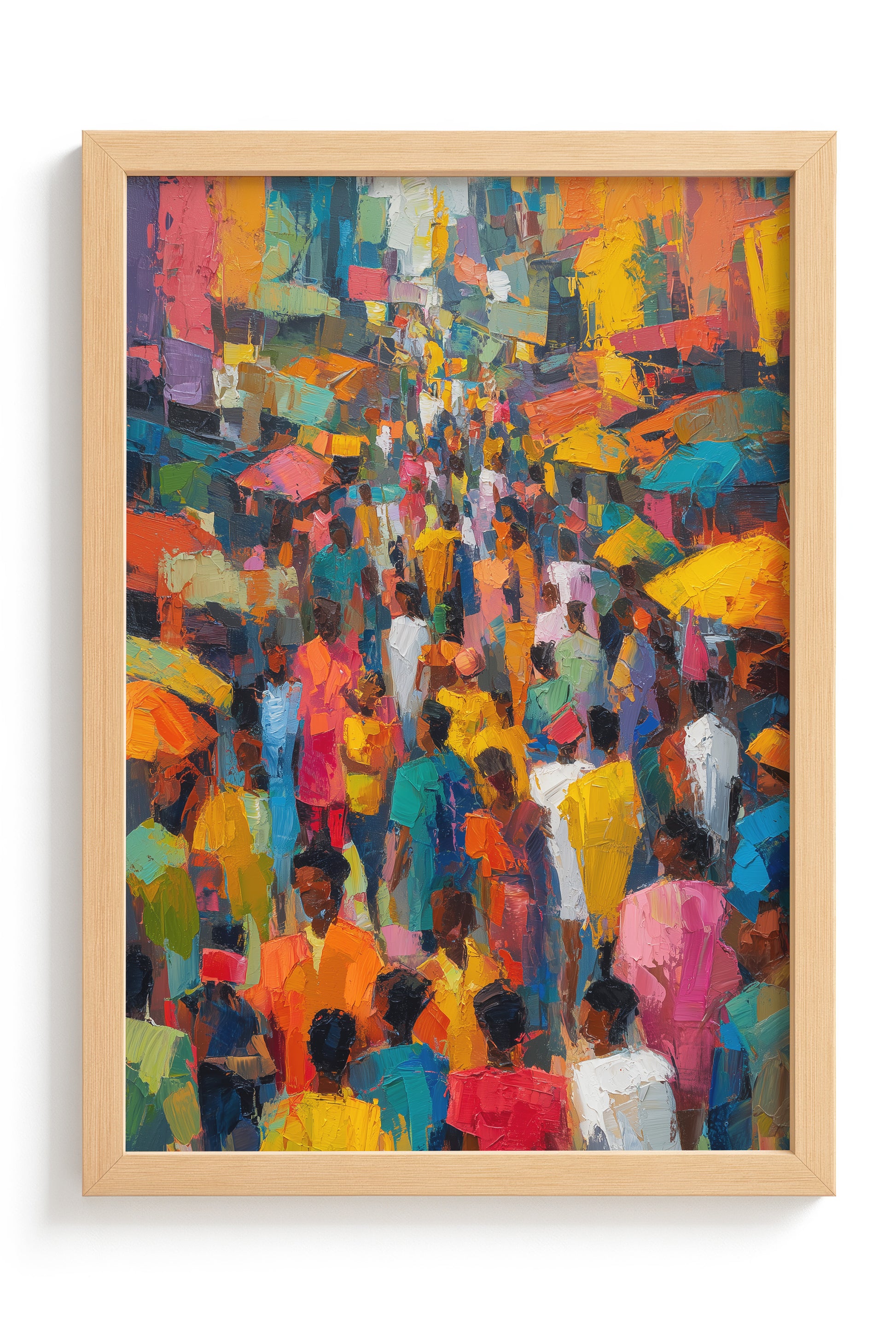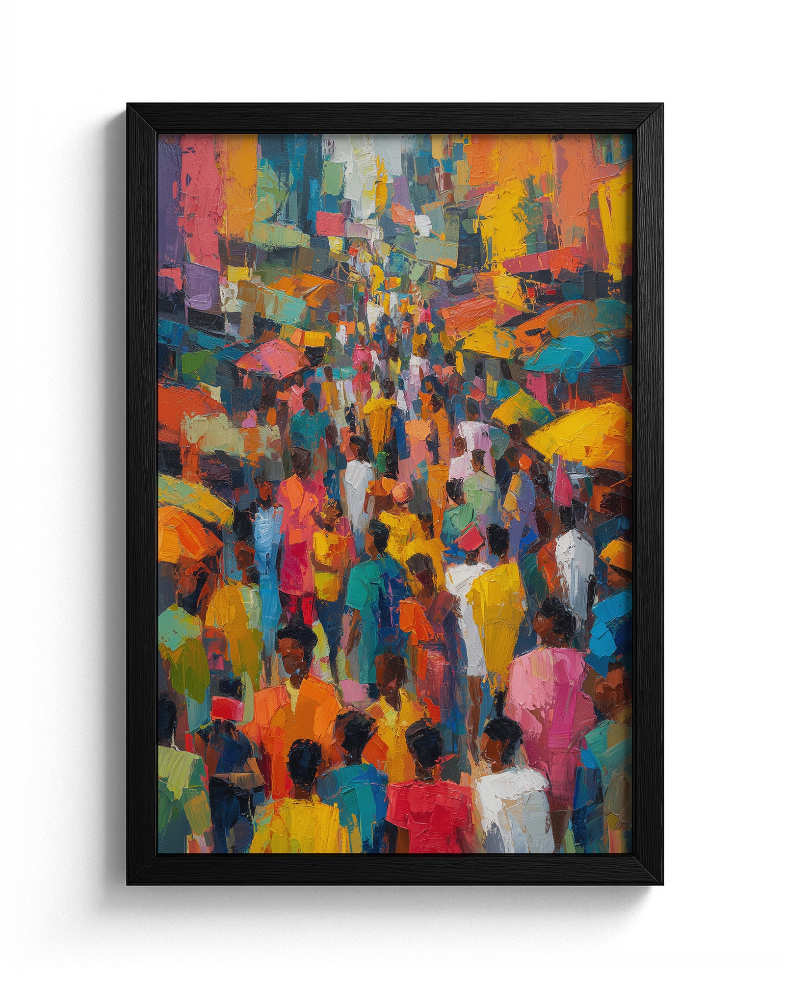 A vibrant oil painting depicting a bustling Yoruba city street filled with people, painted in an abstract expressionist style. Bold brushstrokes and luminous colors capture the energy, movement, and cultural vibrancy of urban life in West Africa.