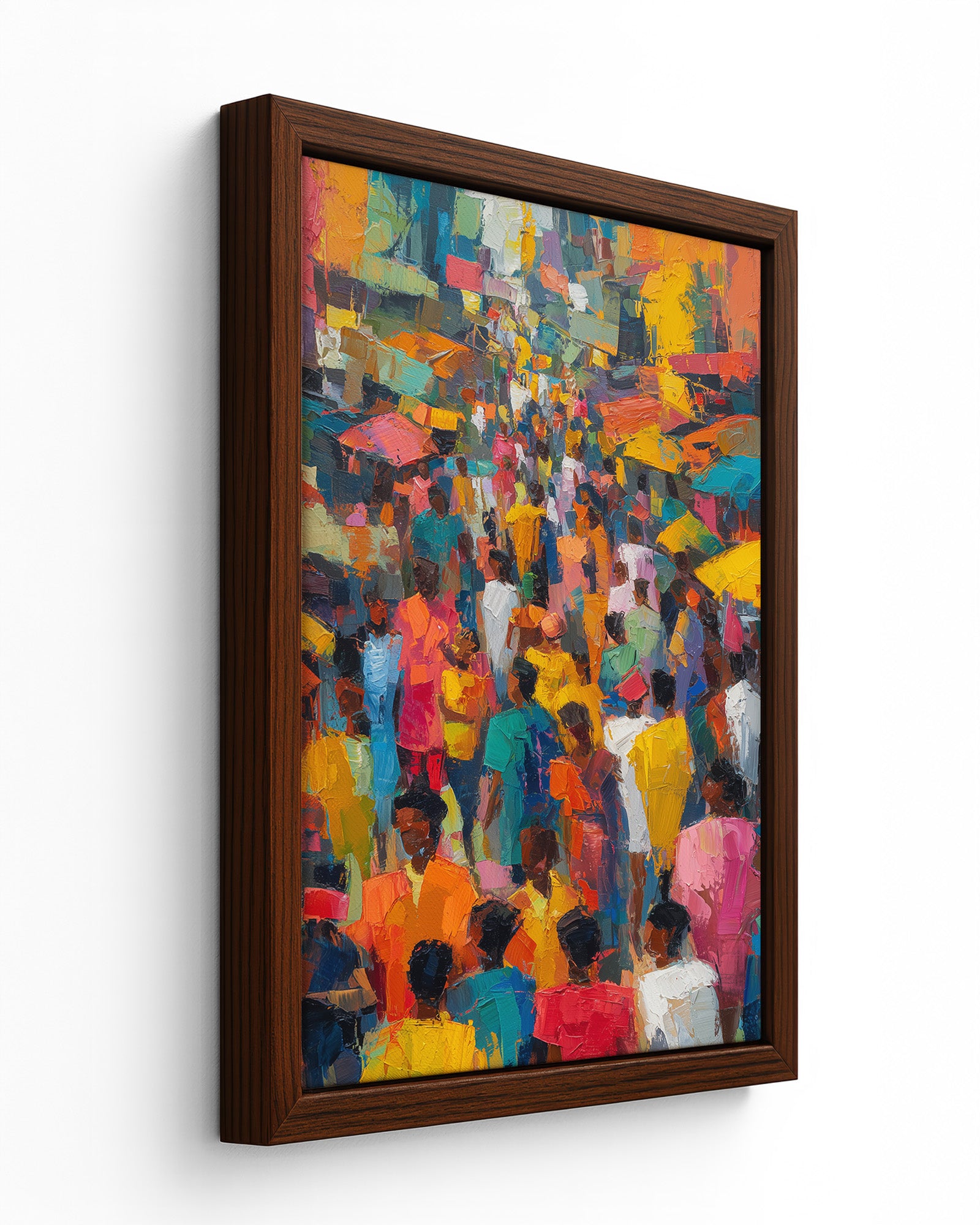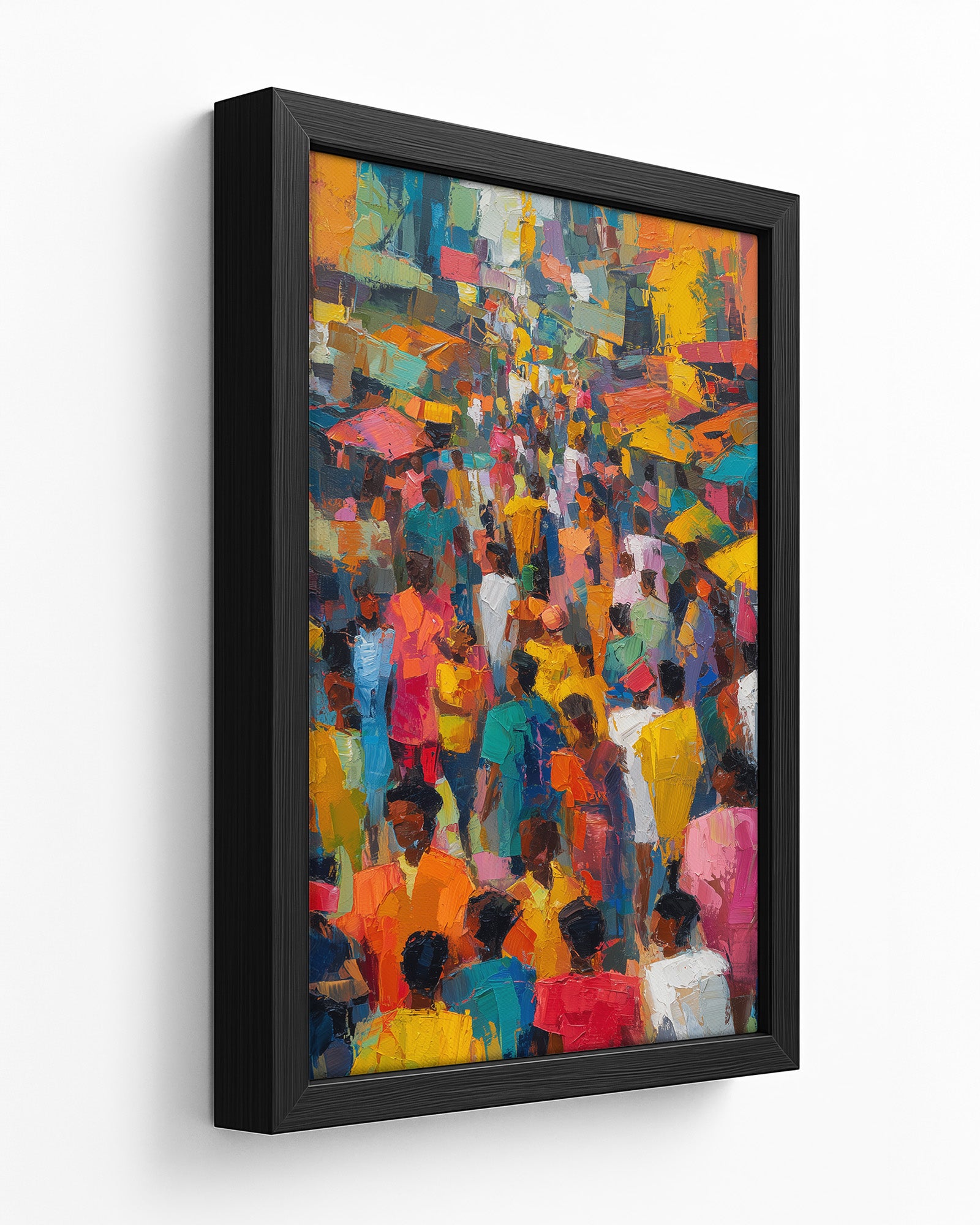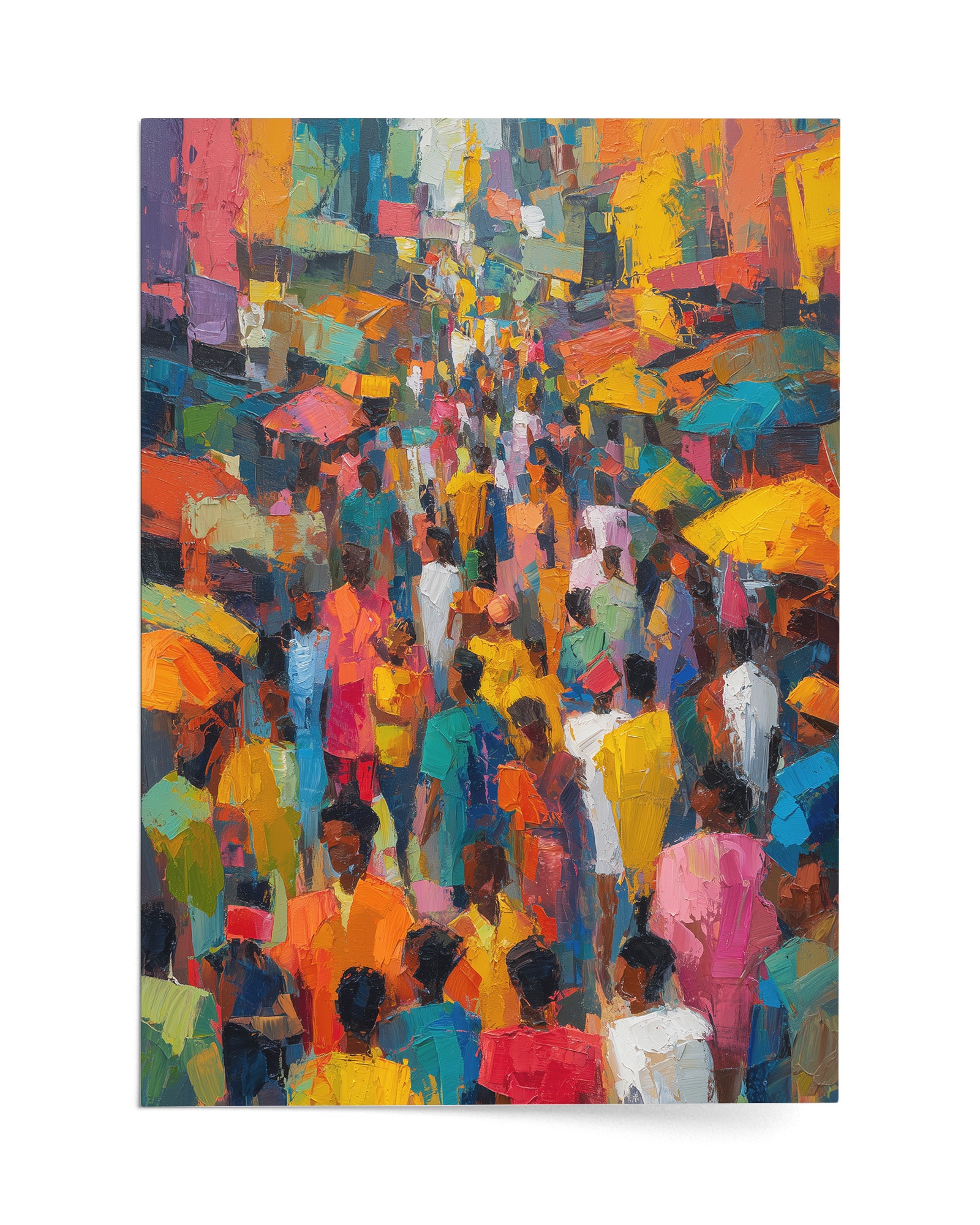 A vibrant oil painting depicting a bustling Yoruba city street filled with people, painted in an abstract expressionist style. Bold brushstrokes and luminous colors capture the energy, movement, and cultural vibrancy of urban life in West Africa.