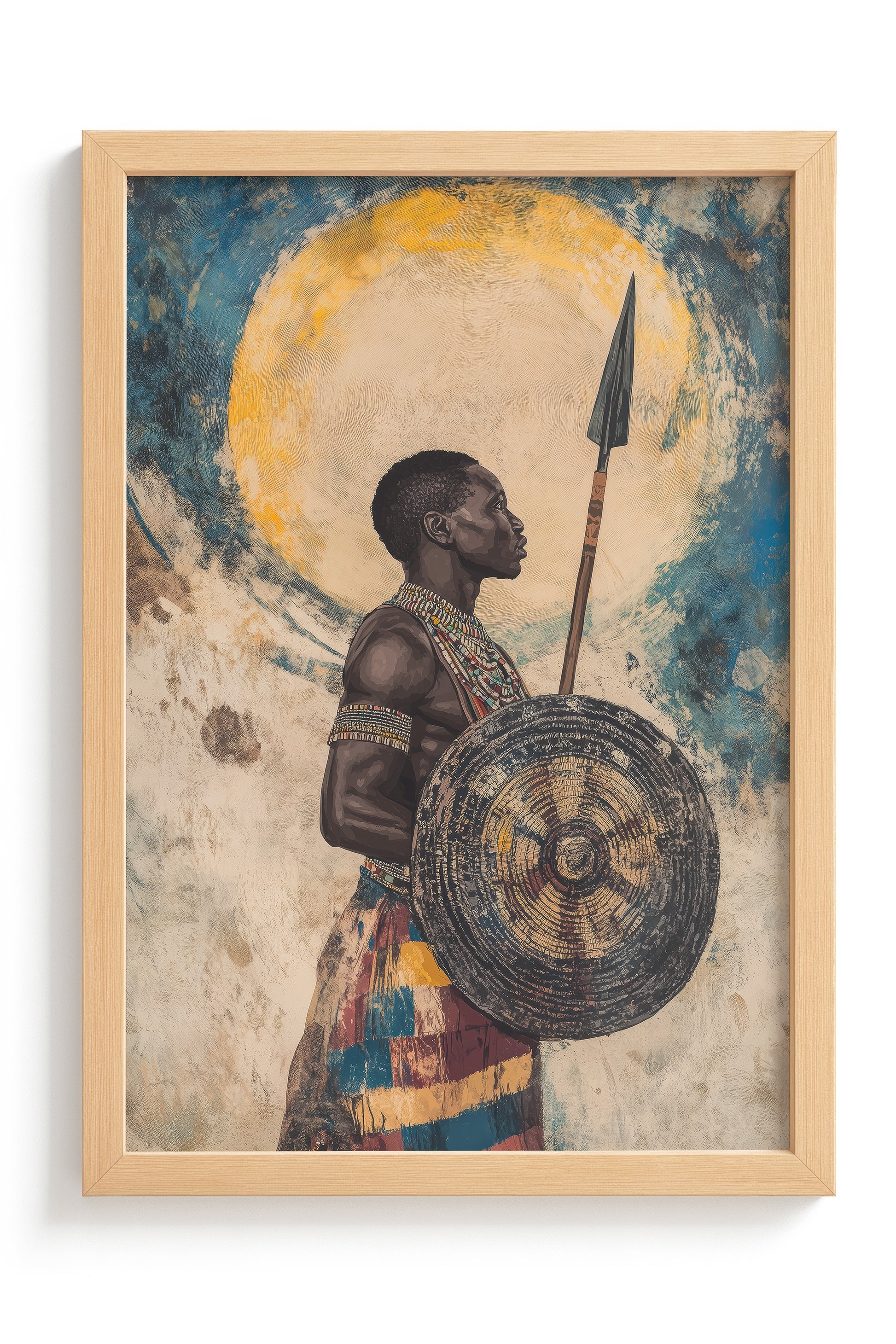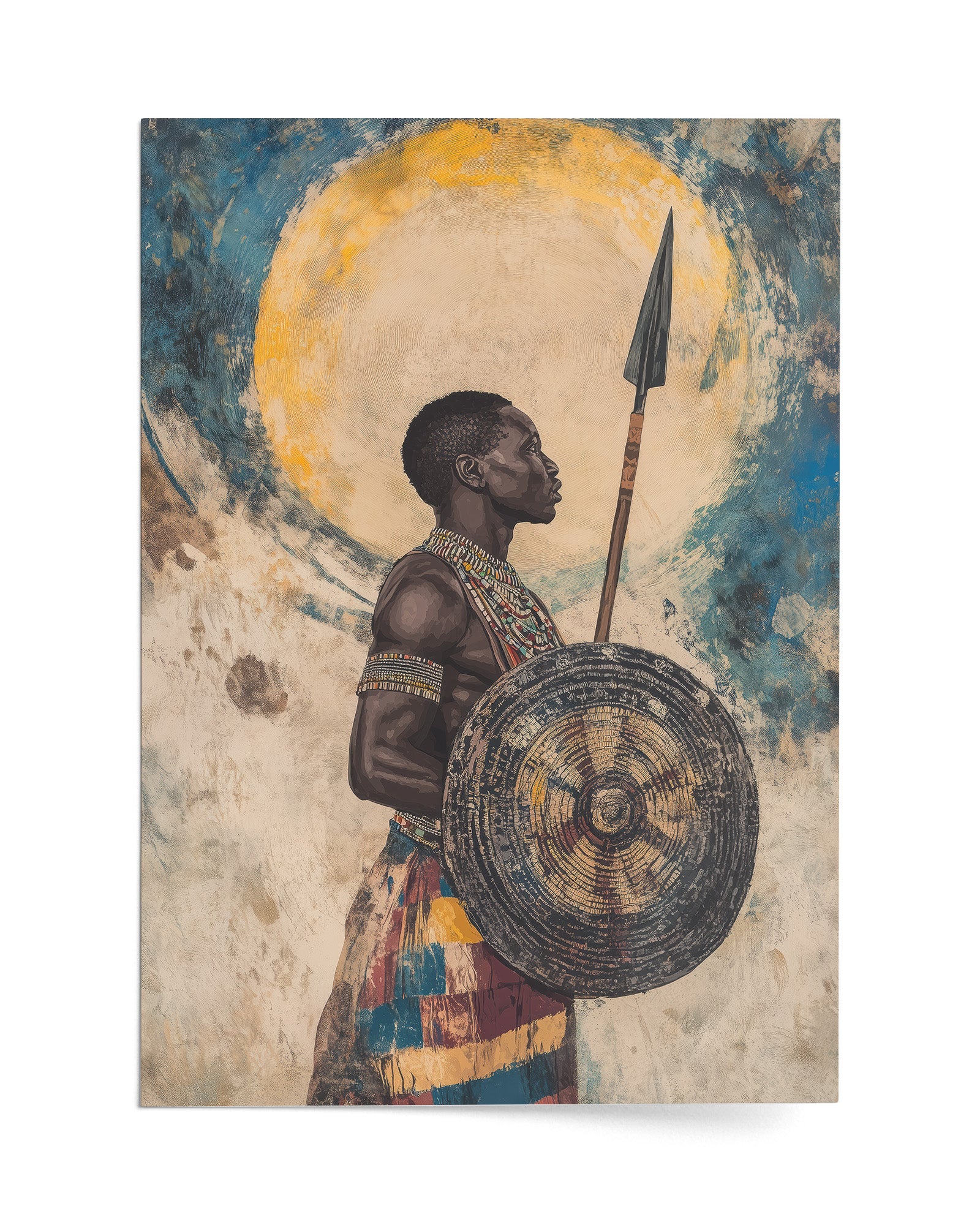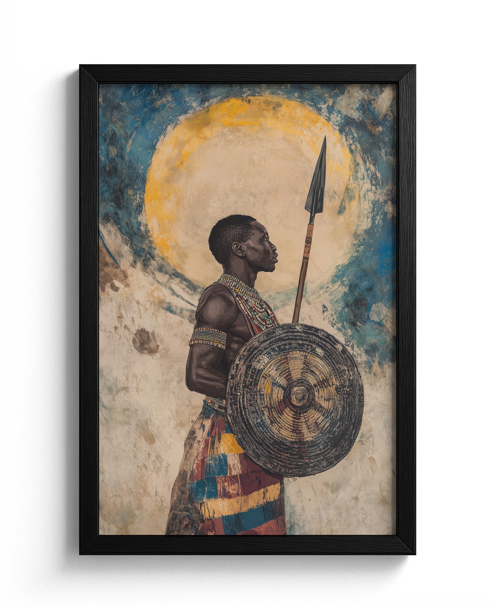 Immerse yourself in the vibrant legacy of the Zulu warrior with this striking artwork. Featuring a powerful figure adorned in traditional tribal attire, holding a spear and shield enriched with intricate tribal patterns, the piece symbolises strength and heritage. Surrounding the warrior are swirling abstract colors that embody the elements of earth, wind, and fire, blending cultural authenticity with dynamic energy.