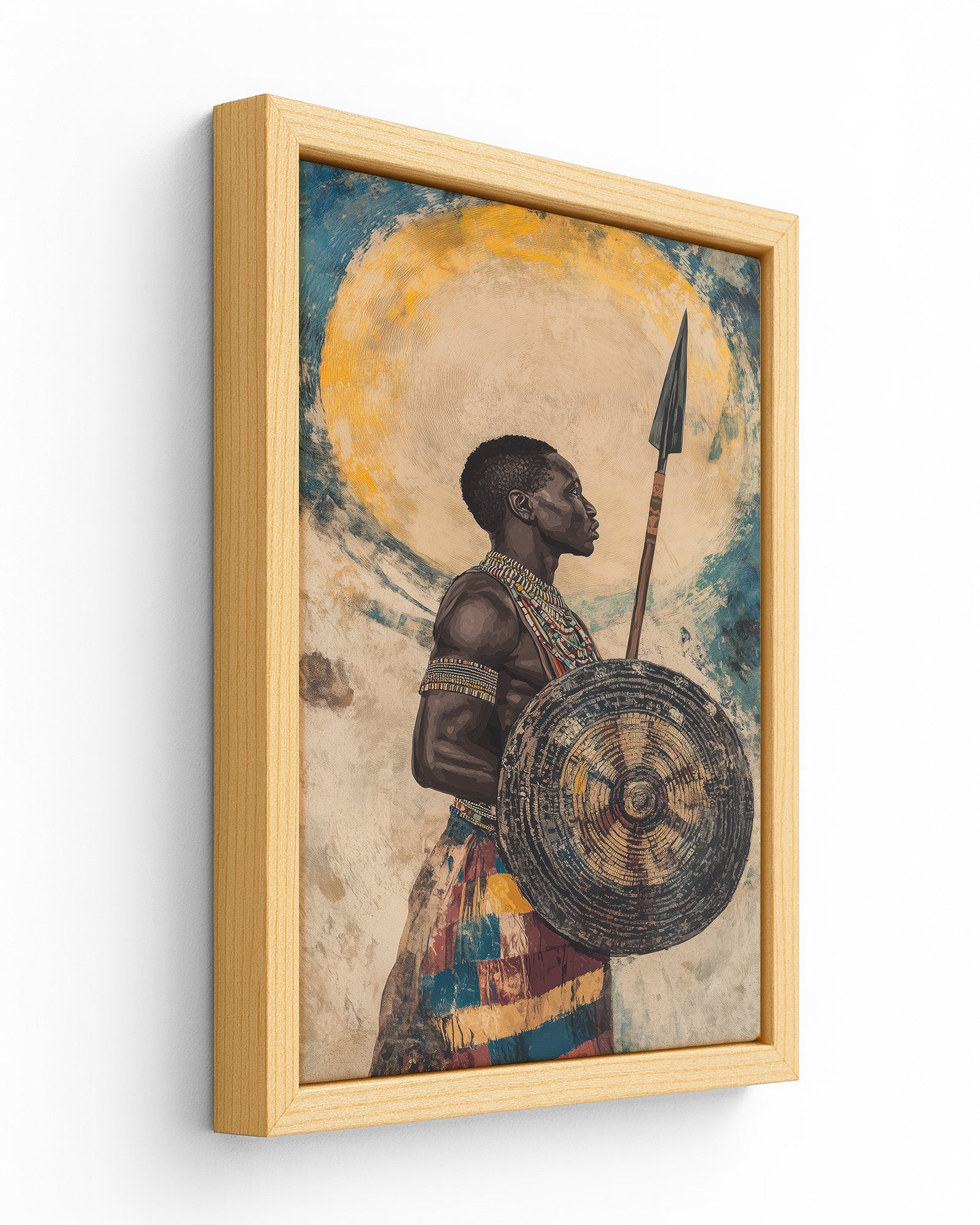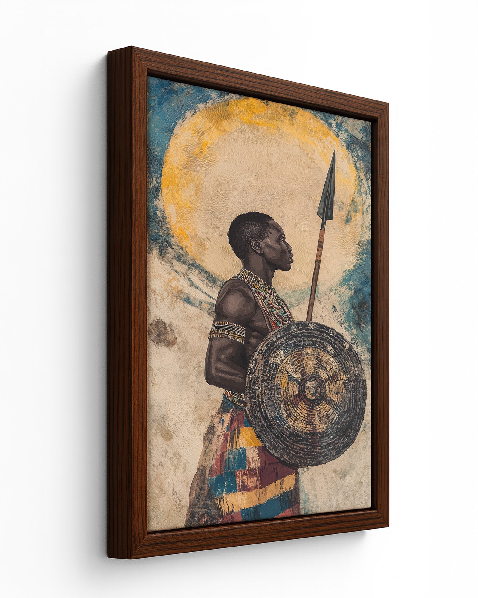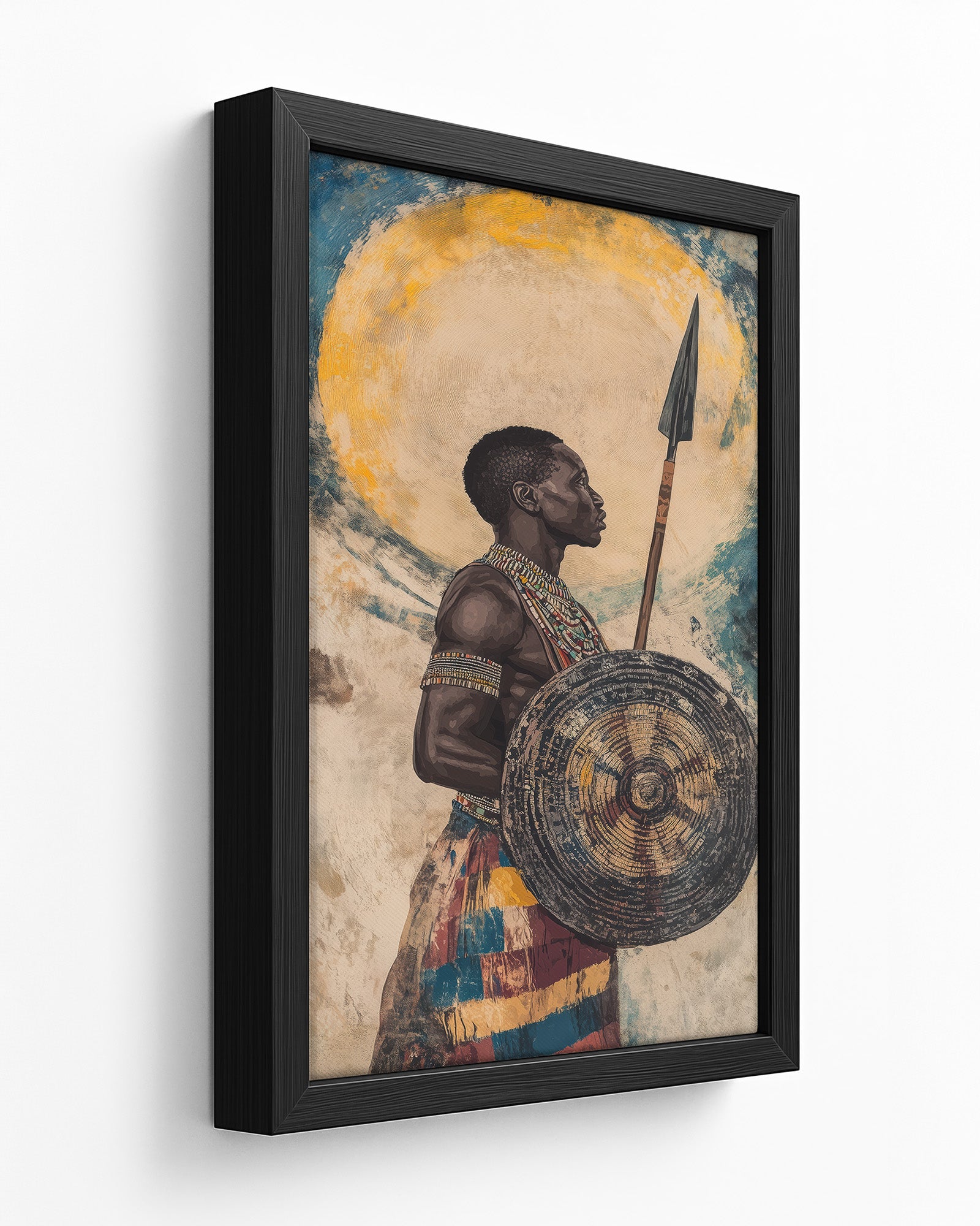Immerse yourself in the vibrant legacy of the Zulu warrior with this striking artwork. Featuring a powerful figure adorned in traditional tribal attire, holding a spear and shield enriched with intricate tribal patterns, the piece symbolises strength and heritage. Surrounding the warrior are swirling abstract colors that embody the elements of earth, wind, and fire, blending cultural authenticity with dynamic energy.